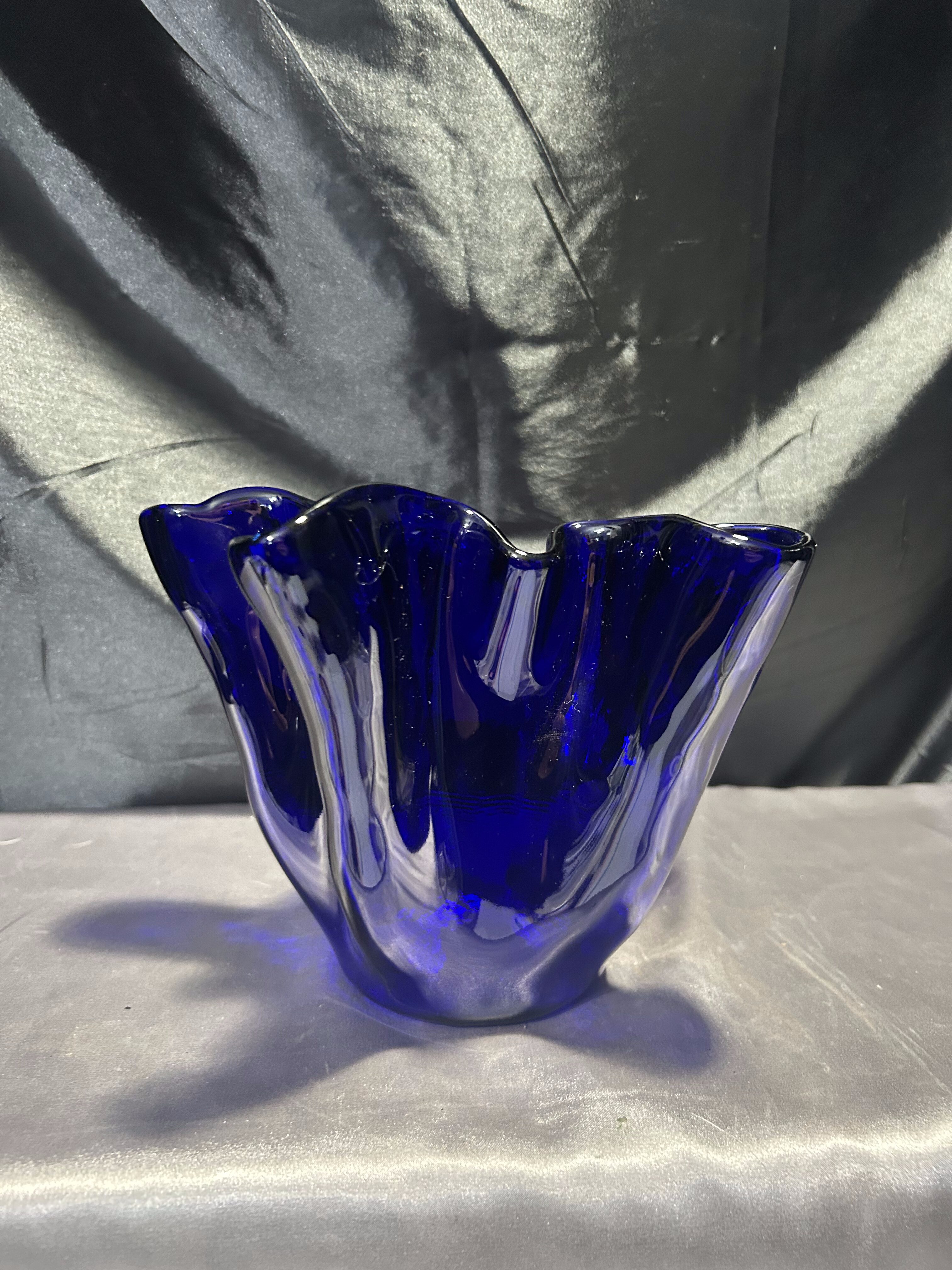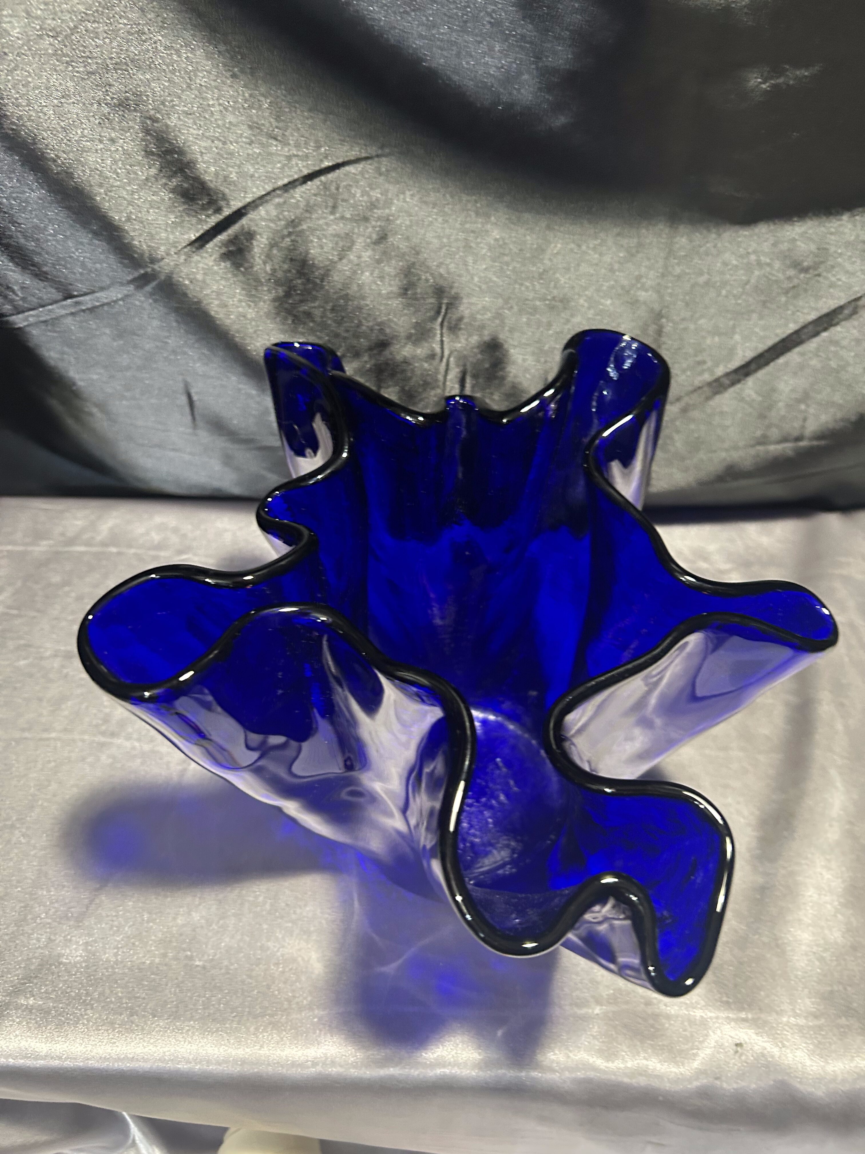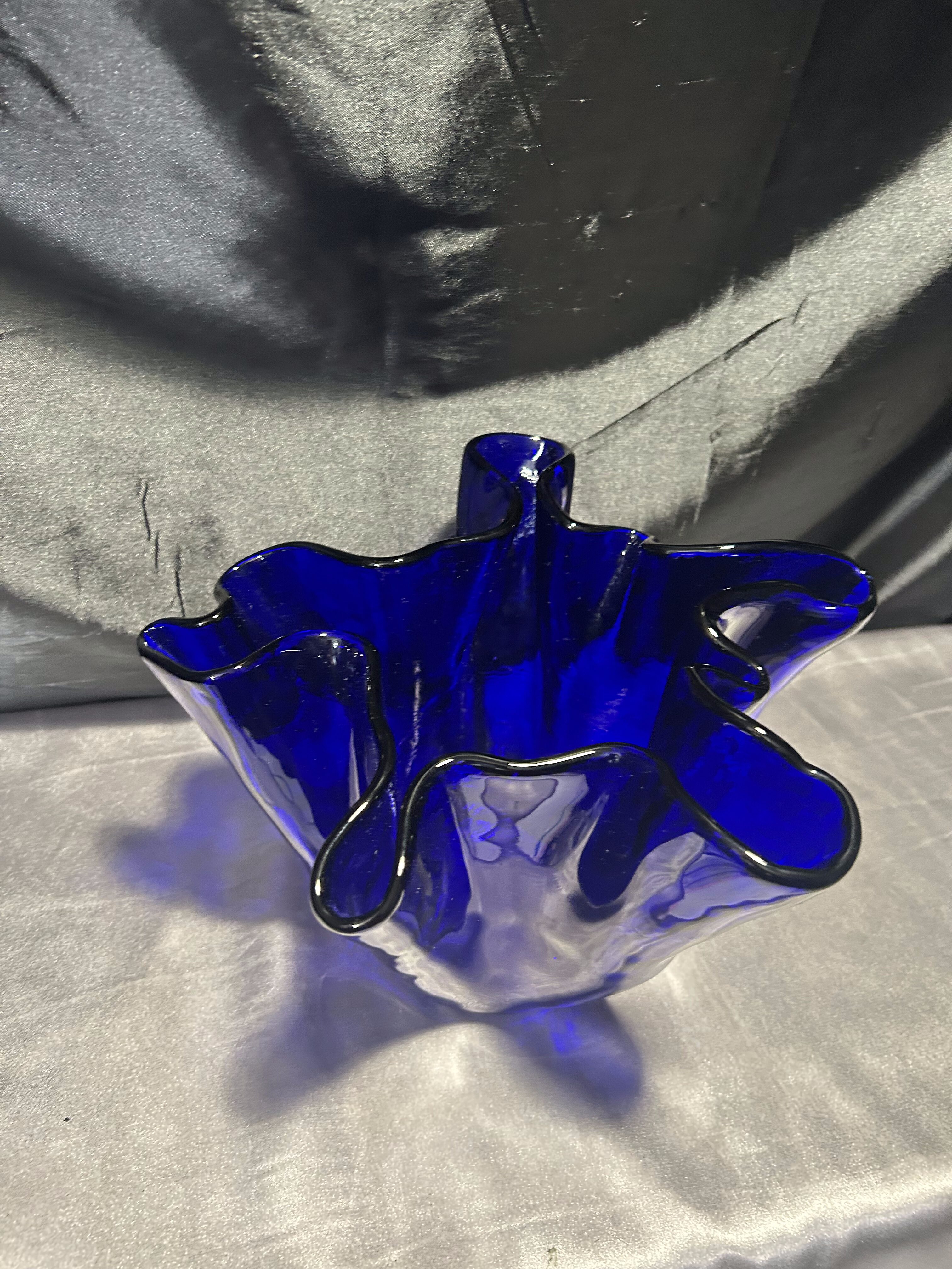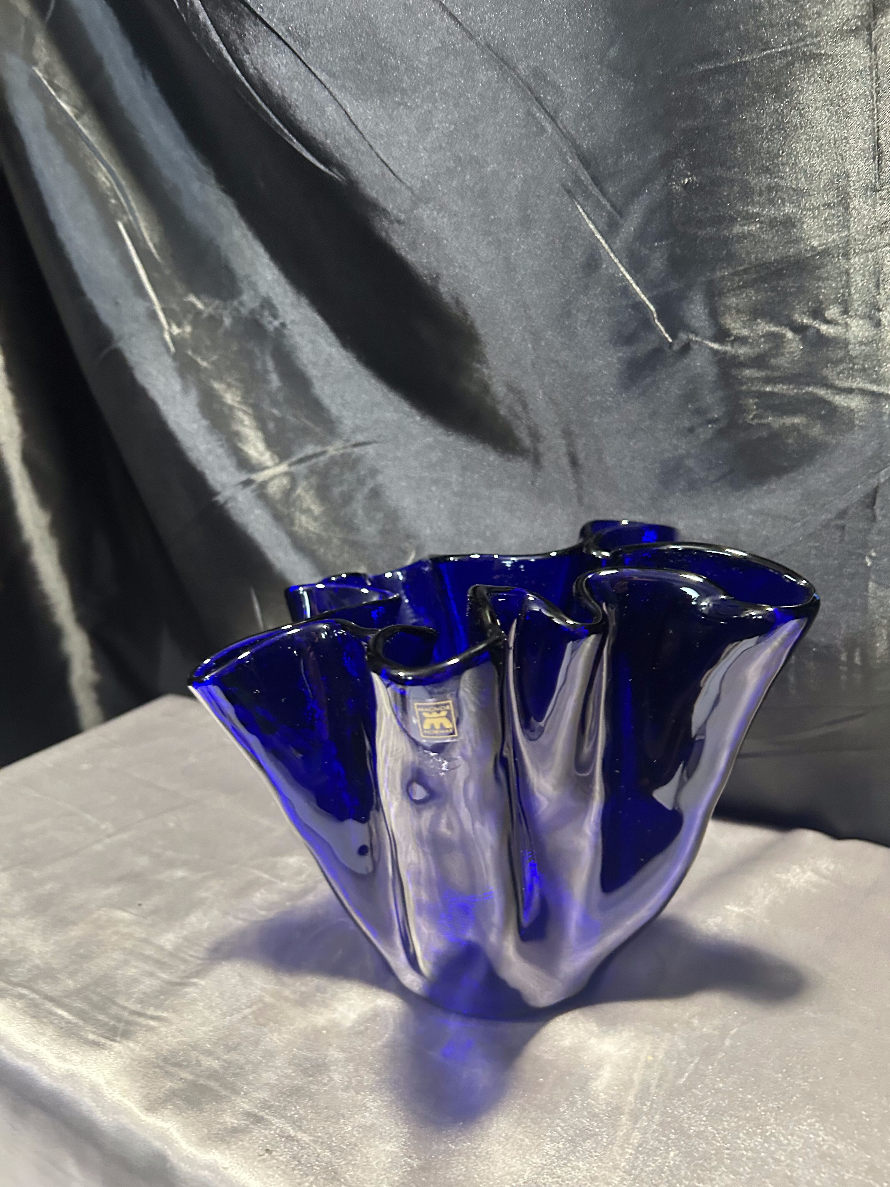 Unikalny flakon lub misa dekoracyjna wykonana z ręcznie formowanego szkła w intensywnym kobaltowym kolorze. Nieregularny, falujący kształt przyciąga wzrok i nadaje przedmiotowi rzeźbiarski charakter. Sygnowana przez renomowaną norweską hutę szkła MAGNOR NORWAY, co świadczy o wysokiej jakości wykonania i kolekcjonerskiej wartości.