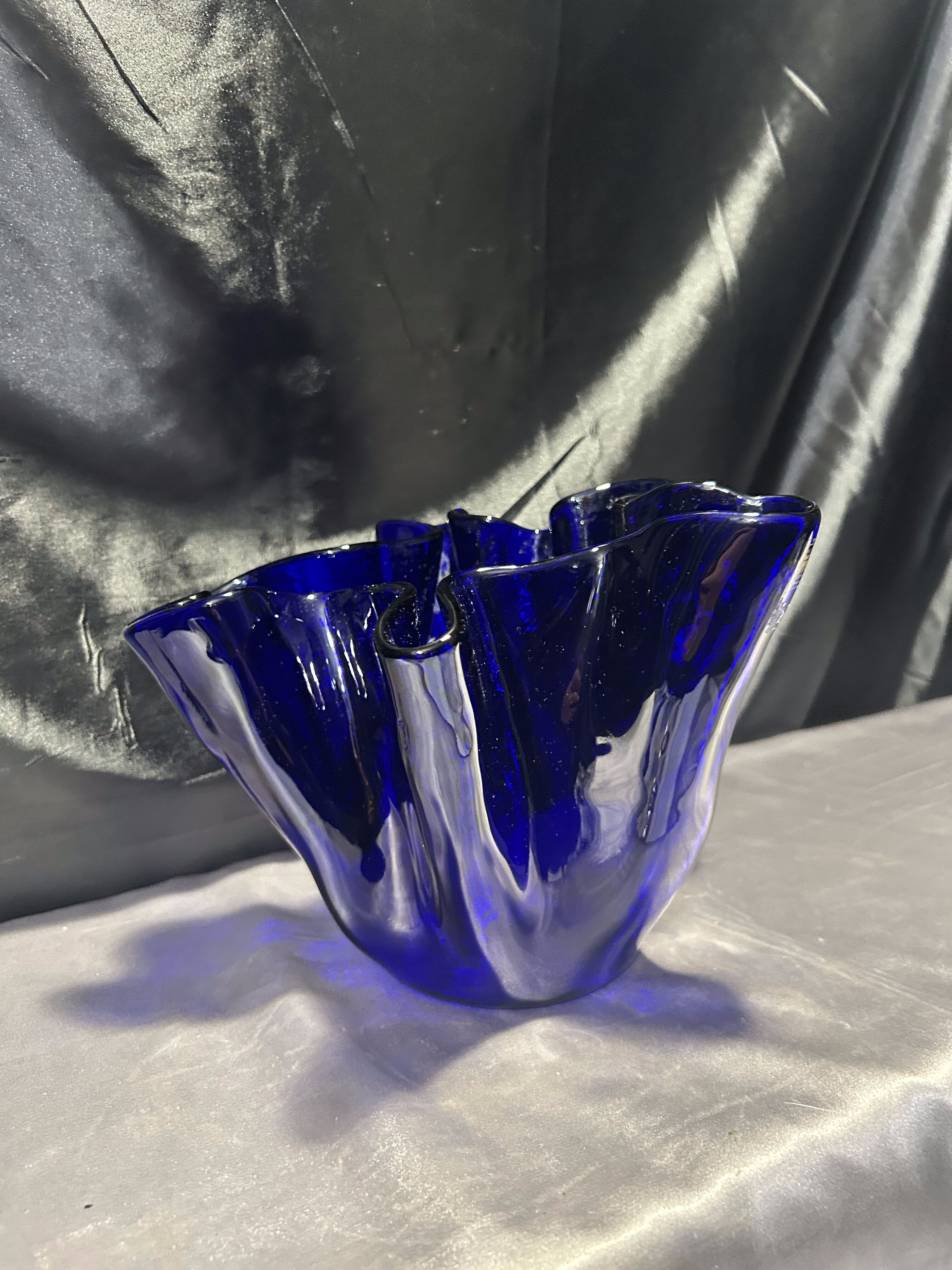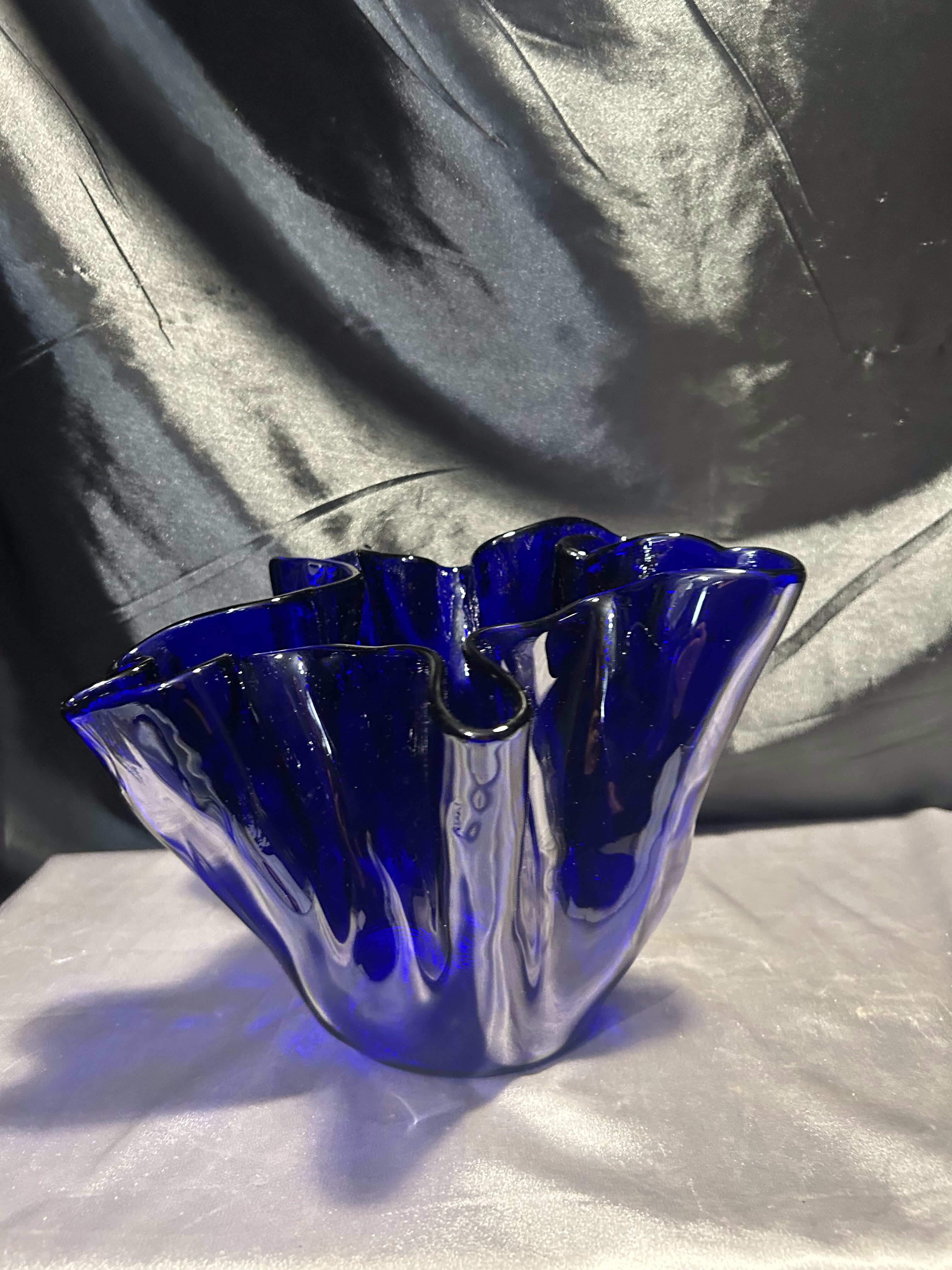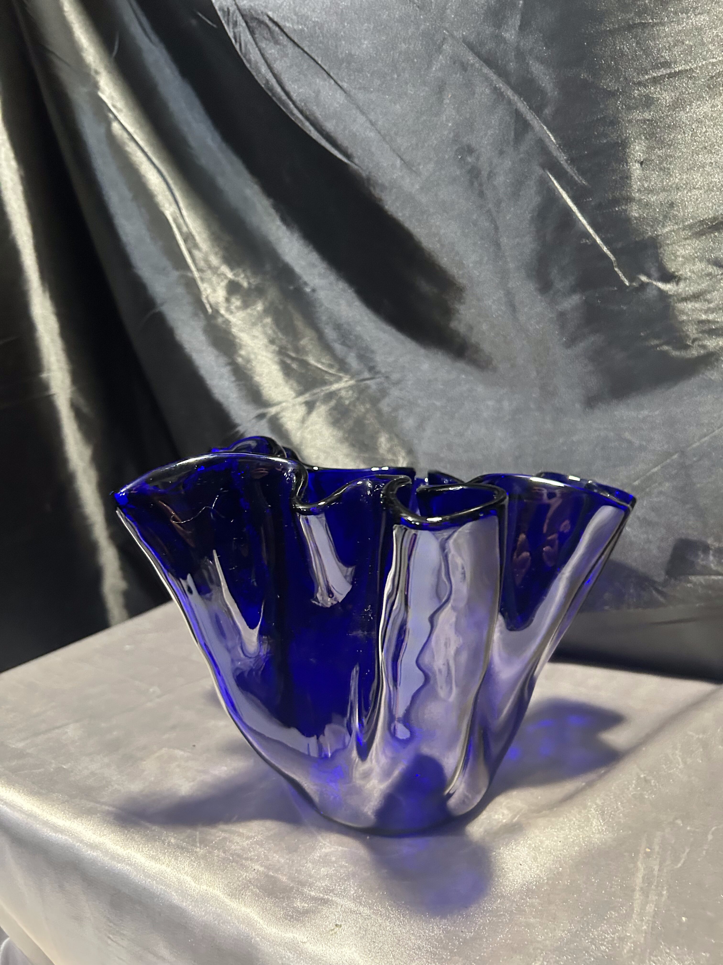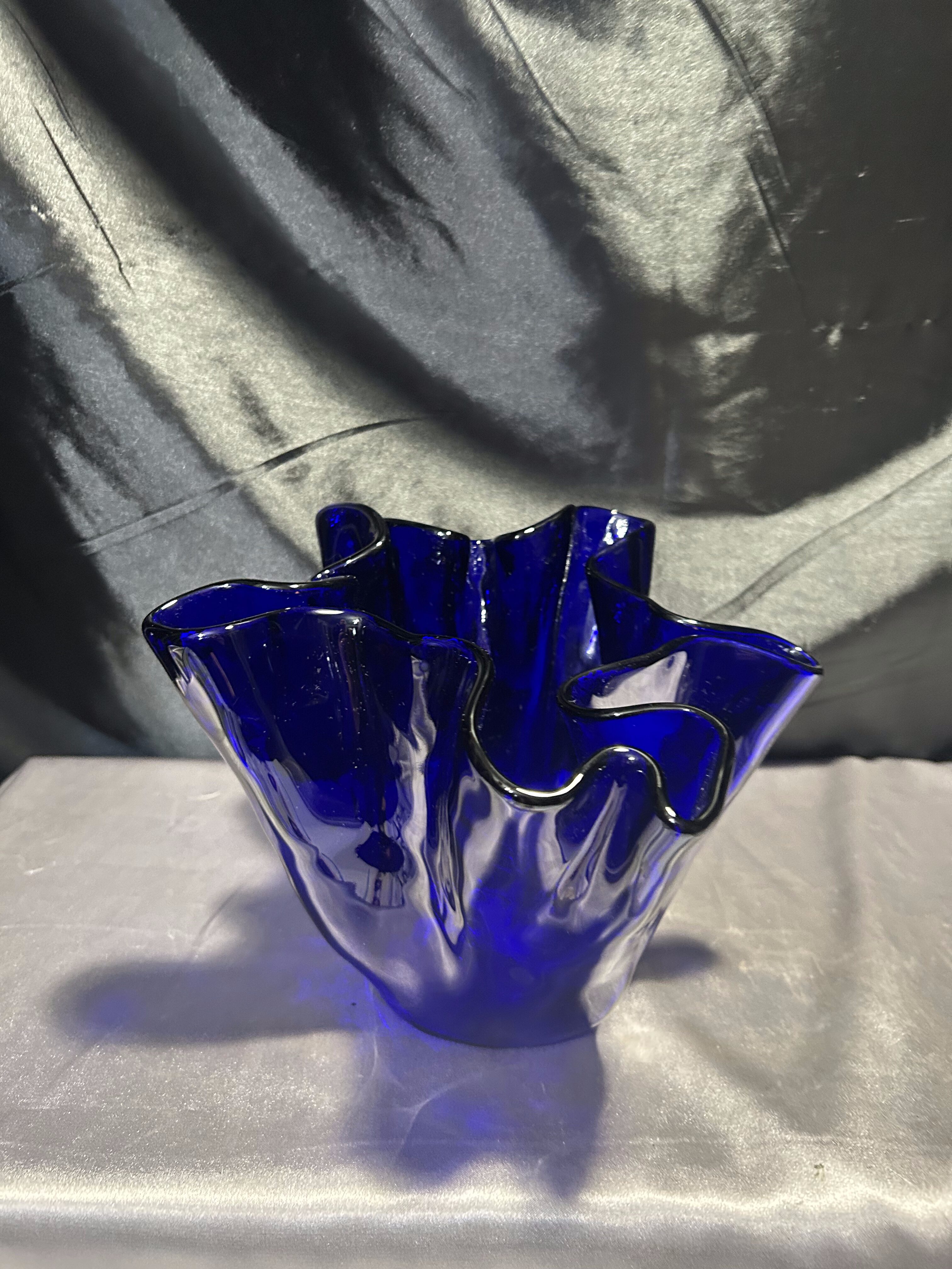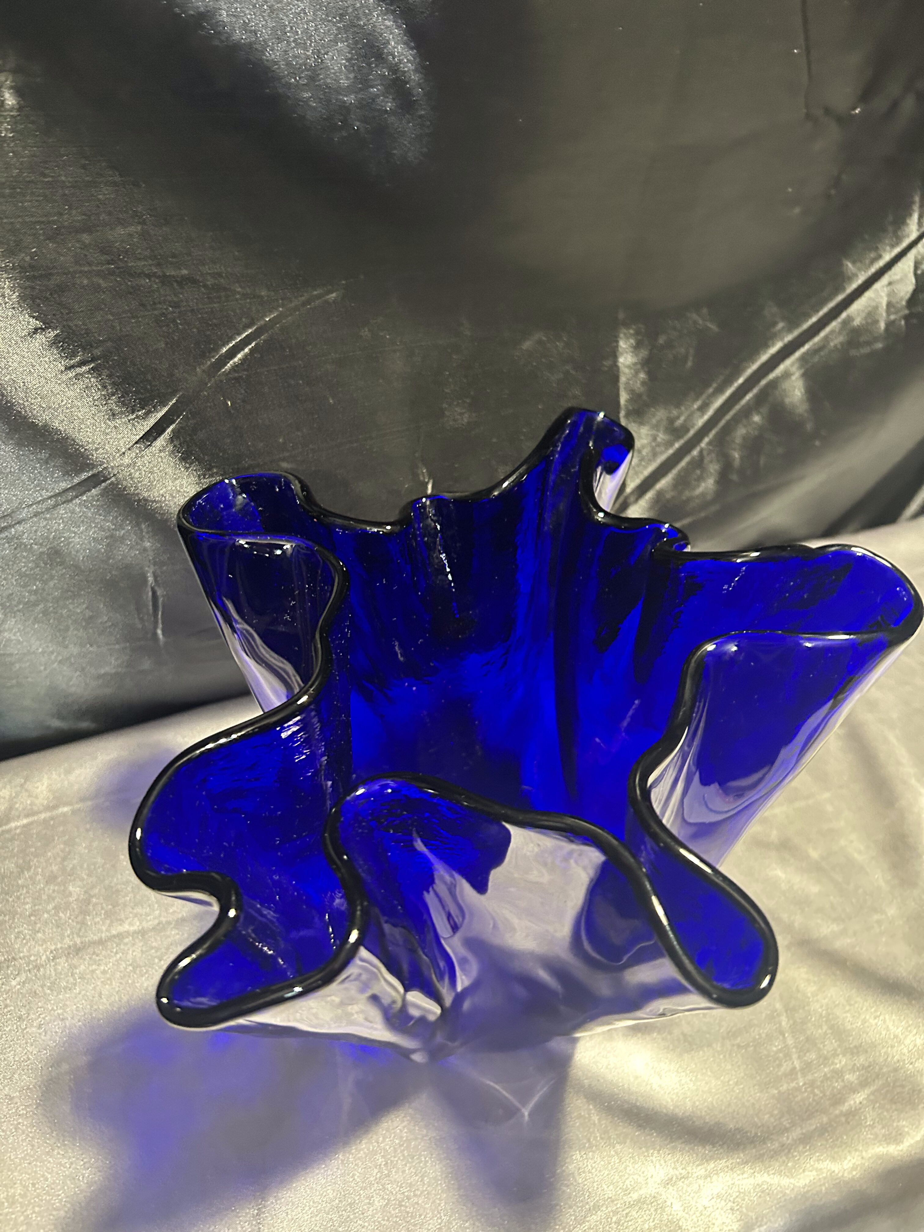 Unikalny flakon lub misa dekoracyjna wykonana z ręcznie formowanego szkła w intensywnym kobaltowym kolorze. Nieregularny, falujący kształt przyciąga wzrok i nadaje przedmiotowi rzeźbiarski charakter. Sygnowana przez renomowaną norweską hutę szkła MAGNOR NORWAY, co świadczy o wysokiej jakości wykonania i kolekcjonerskiej wartości.