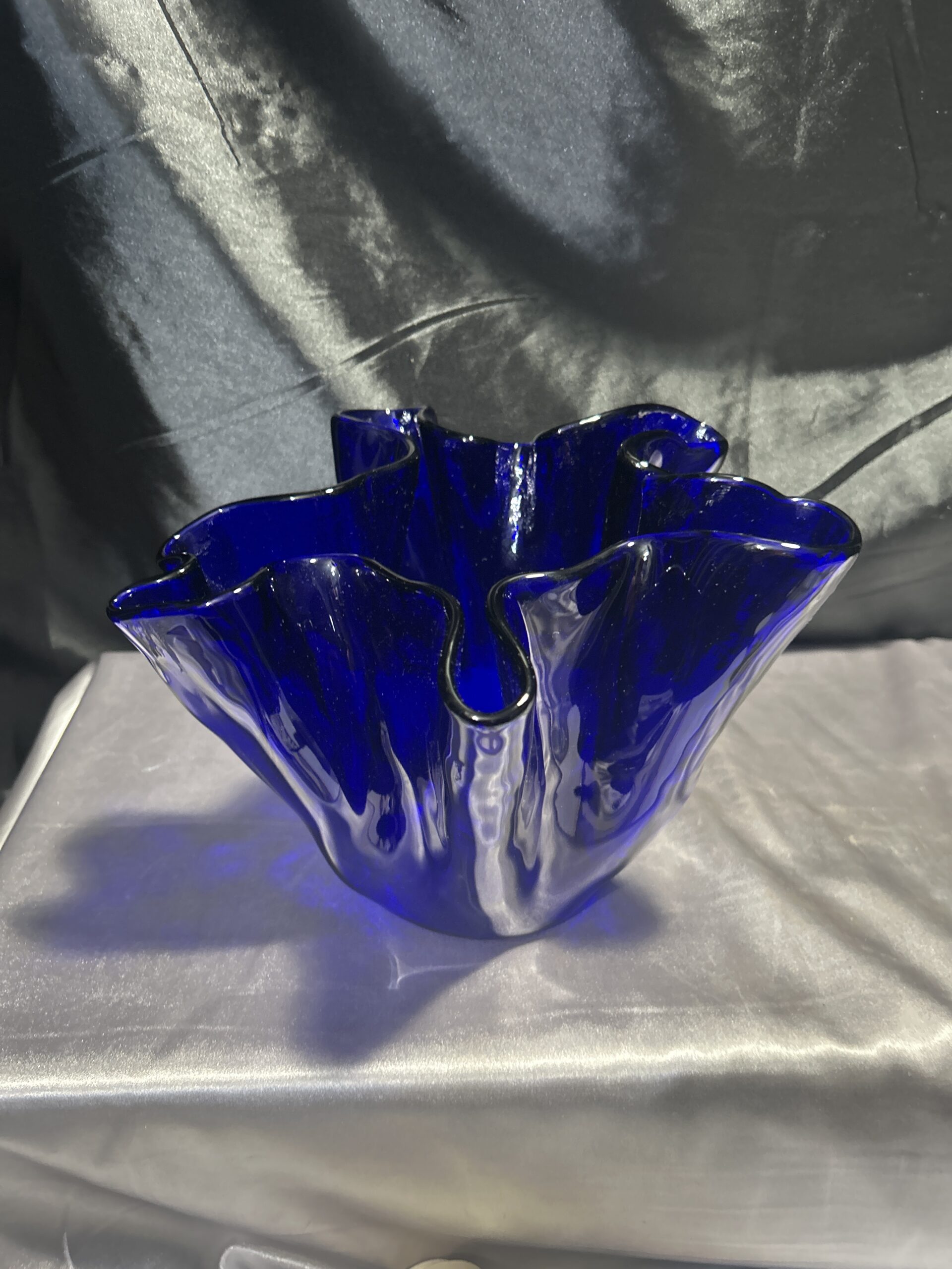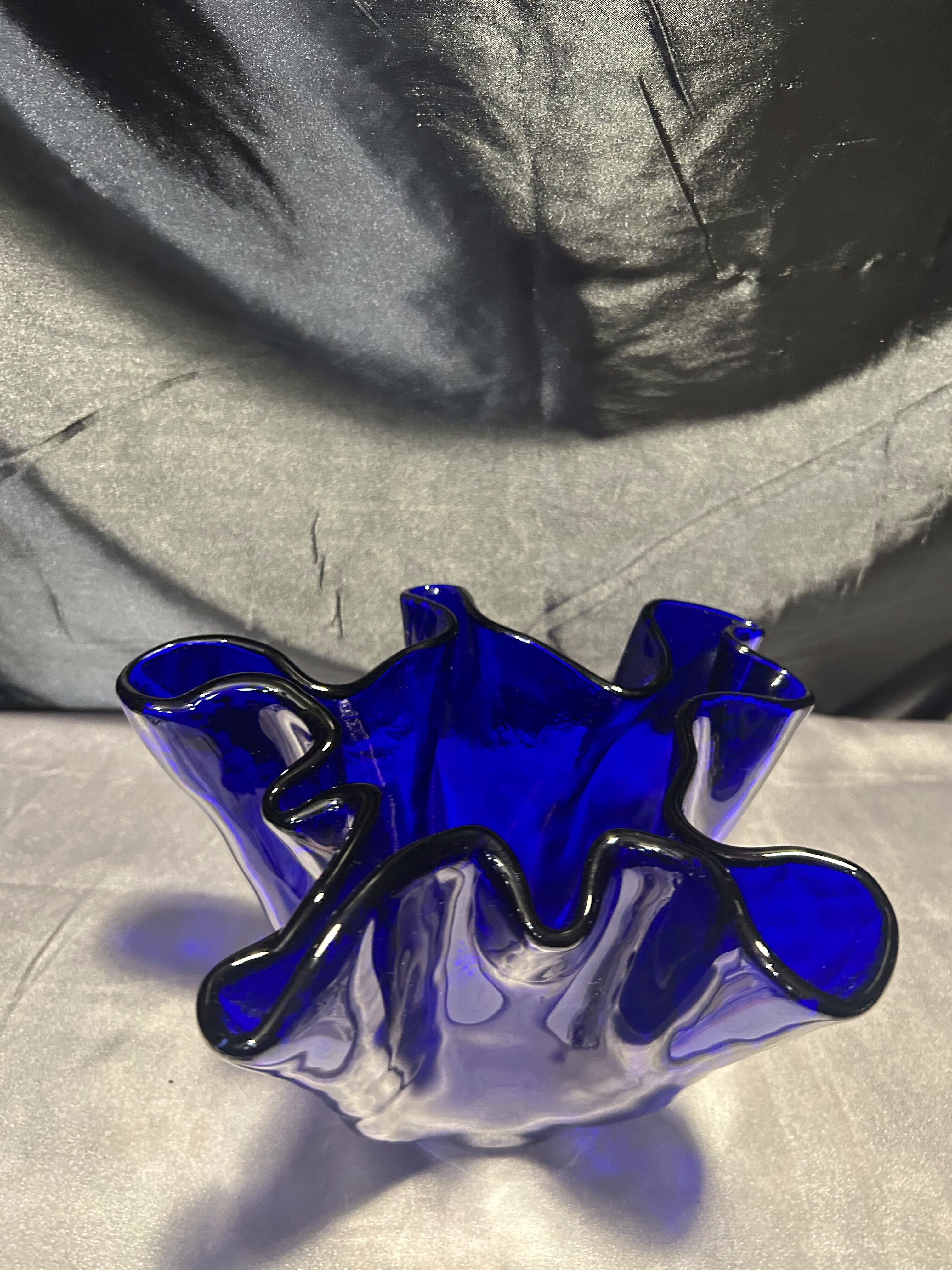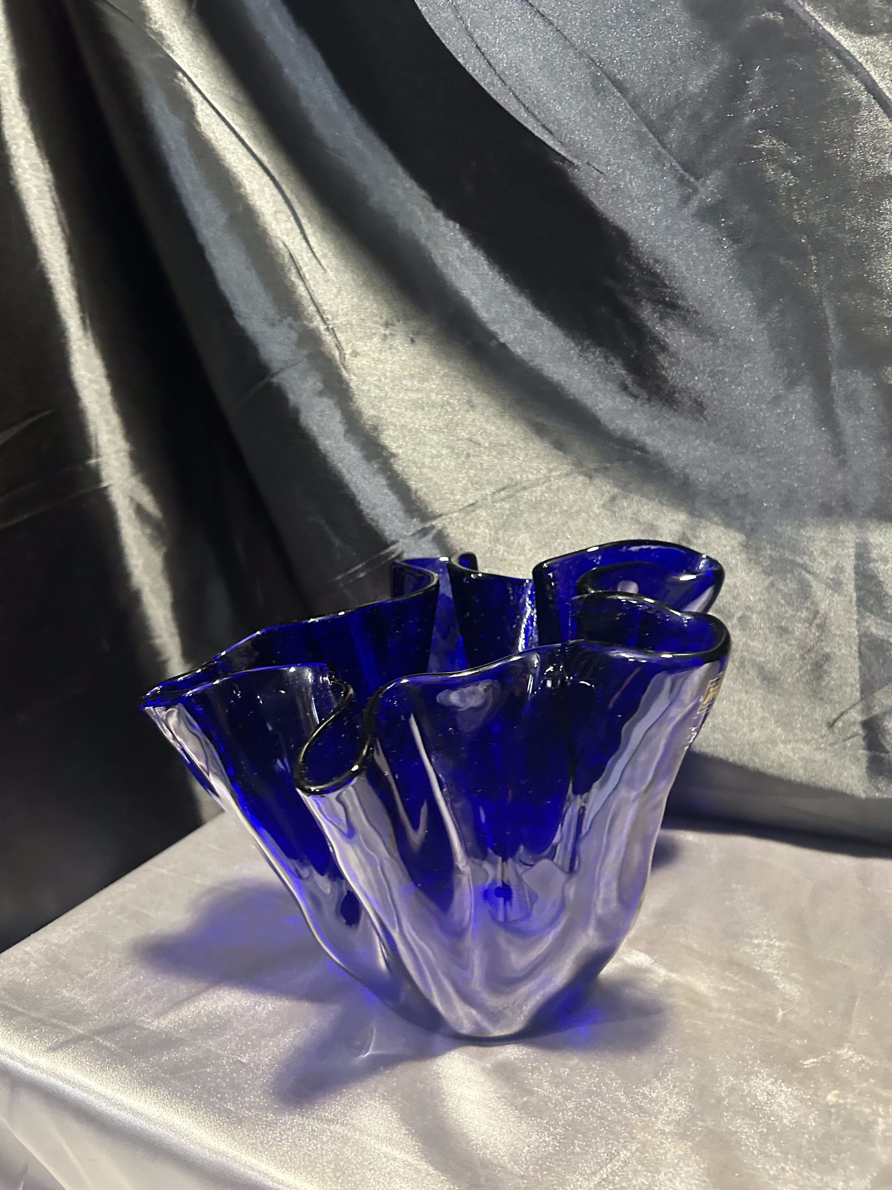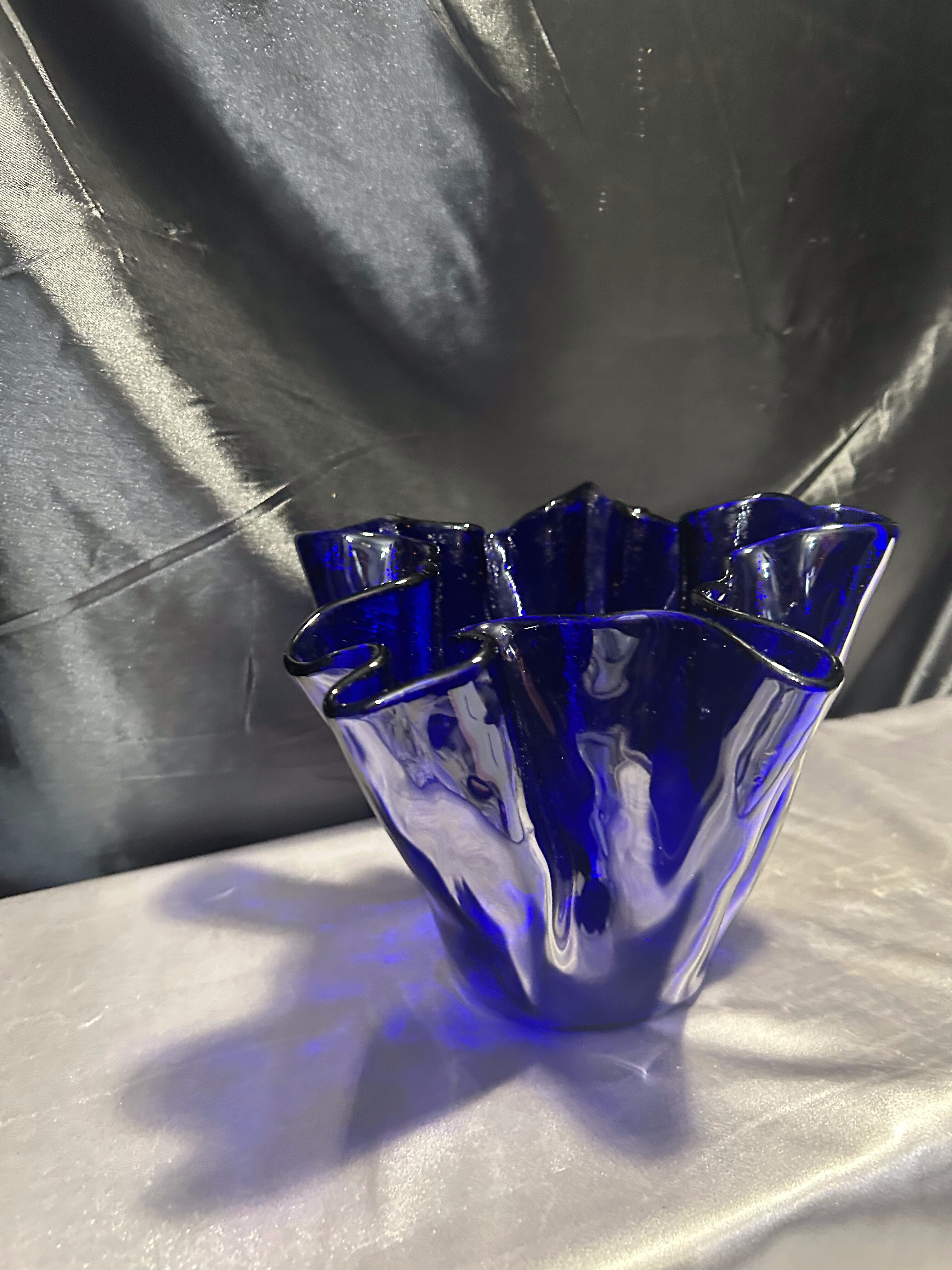 Unikalny flakon lub misa dekoracyjna wykonana z ręcznie formowanego szkła w intensywnym kobaltowym kolorze. Nieregularny, falujący kształt przyciąga wzrok i nadaje przedmiotowi rzeźbiarski charakter. Sygnowana przez renomowaną norweską hutę szkła MAGNOR NORWAY, co świadczy o wysokiej jakości wykonania i kolekcjonerskiej wartości.
