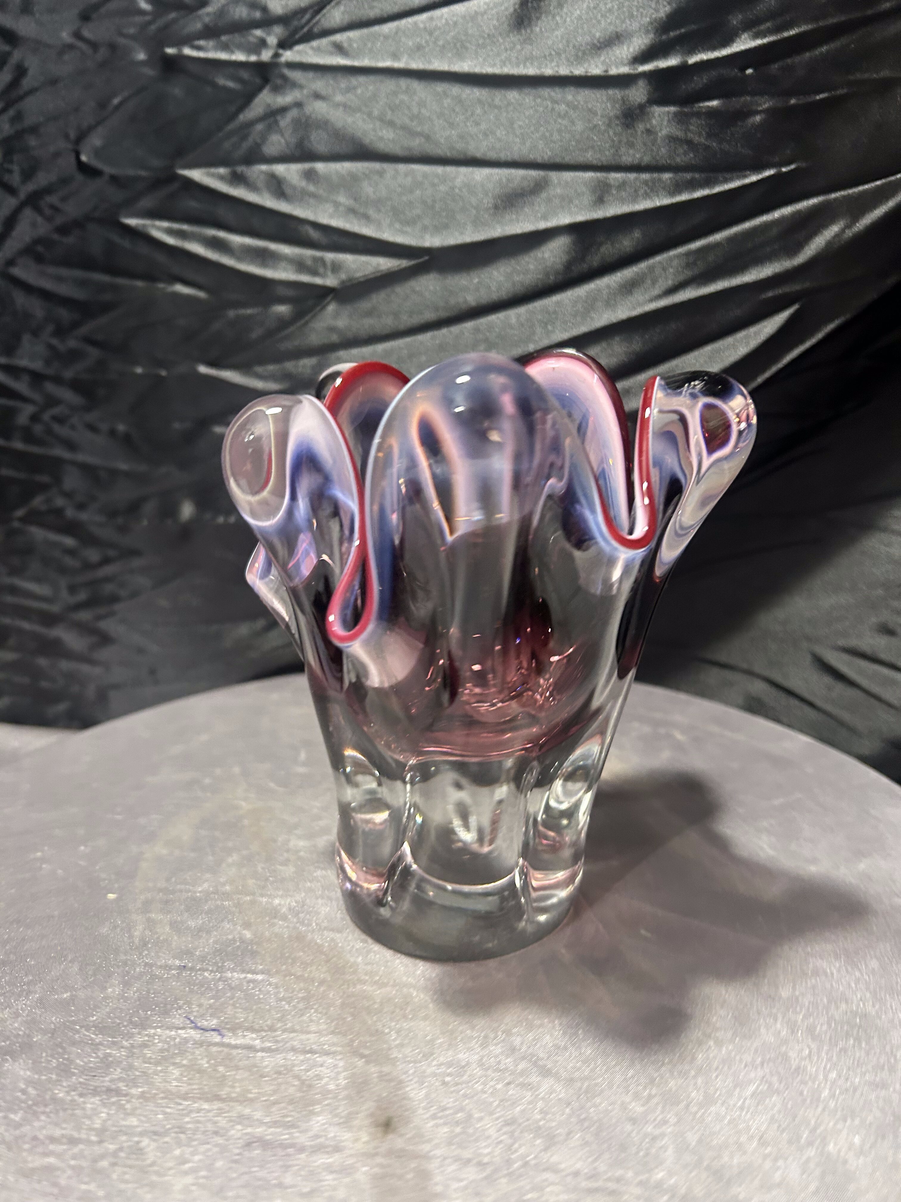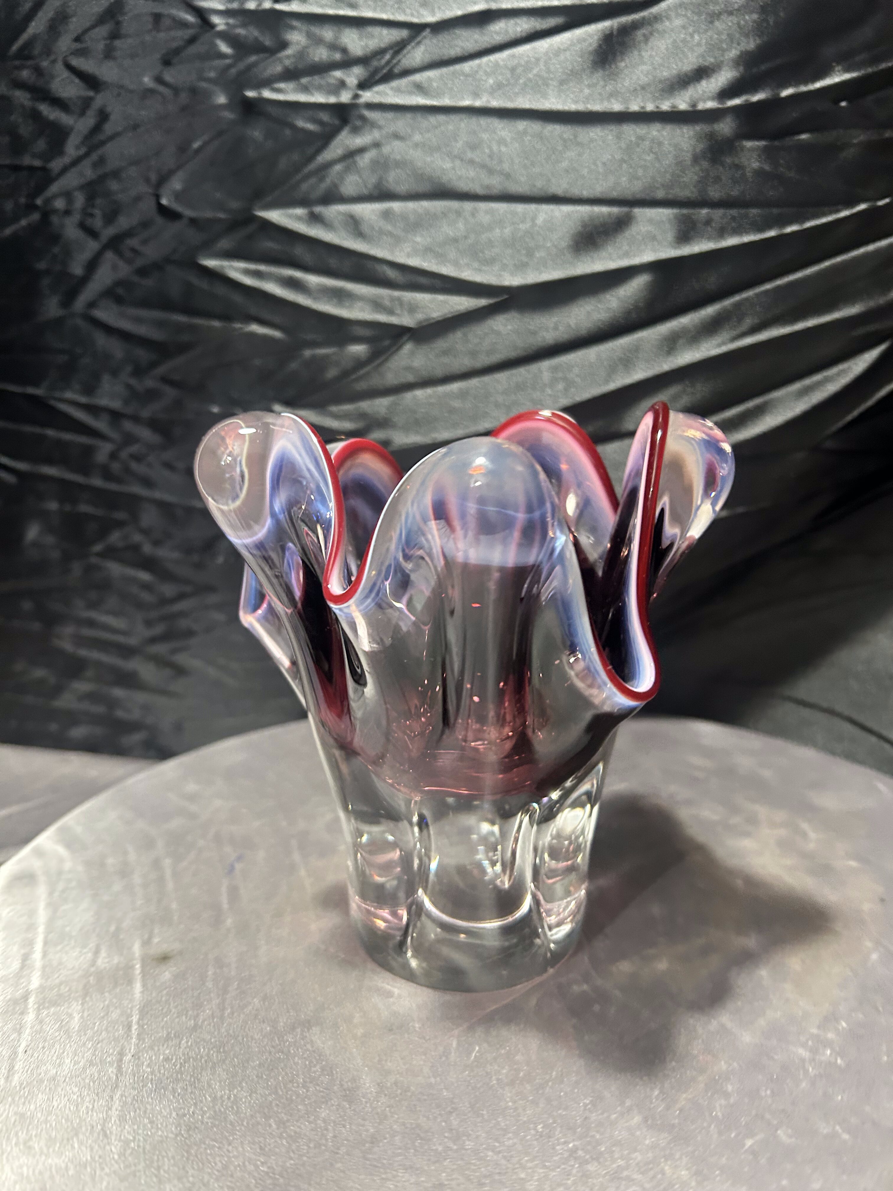 Wyjątkowy flakon ze szkła artystycznego w stylu Murano, o dynamicznej, falującej linii i wyraźnie modelowanych rantach. Transparentne szkło zostało subtelnie podbarwione odcieniem różu i fioletu, a całość wykończona intensywną, rubinową krawędzią, która pięknie podkreśla rzeźbiarską formę naczynia.