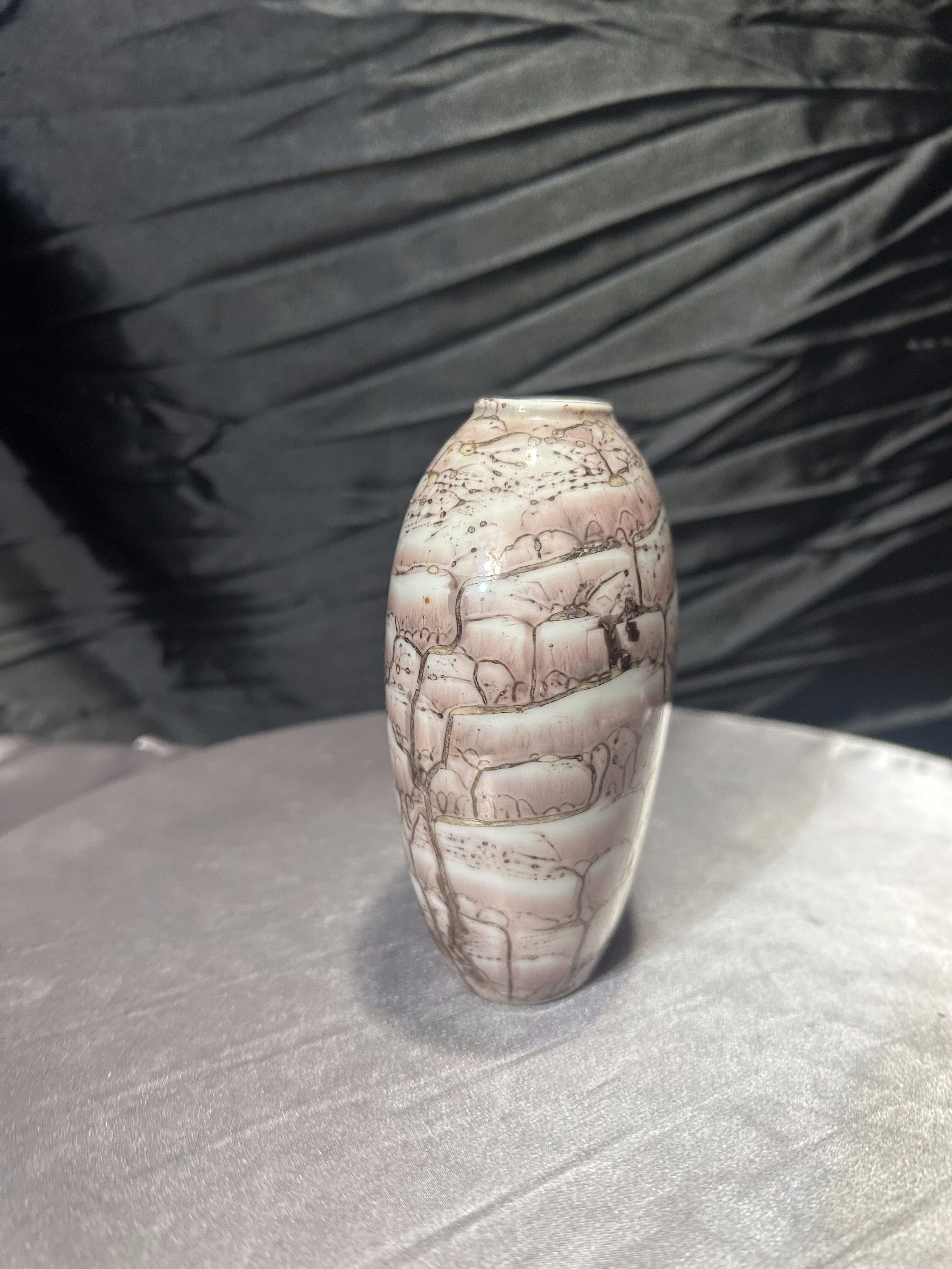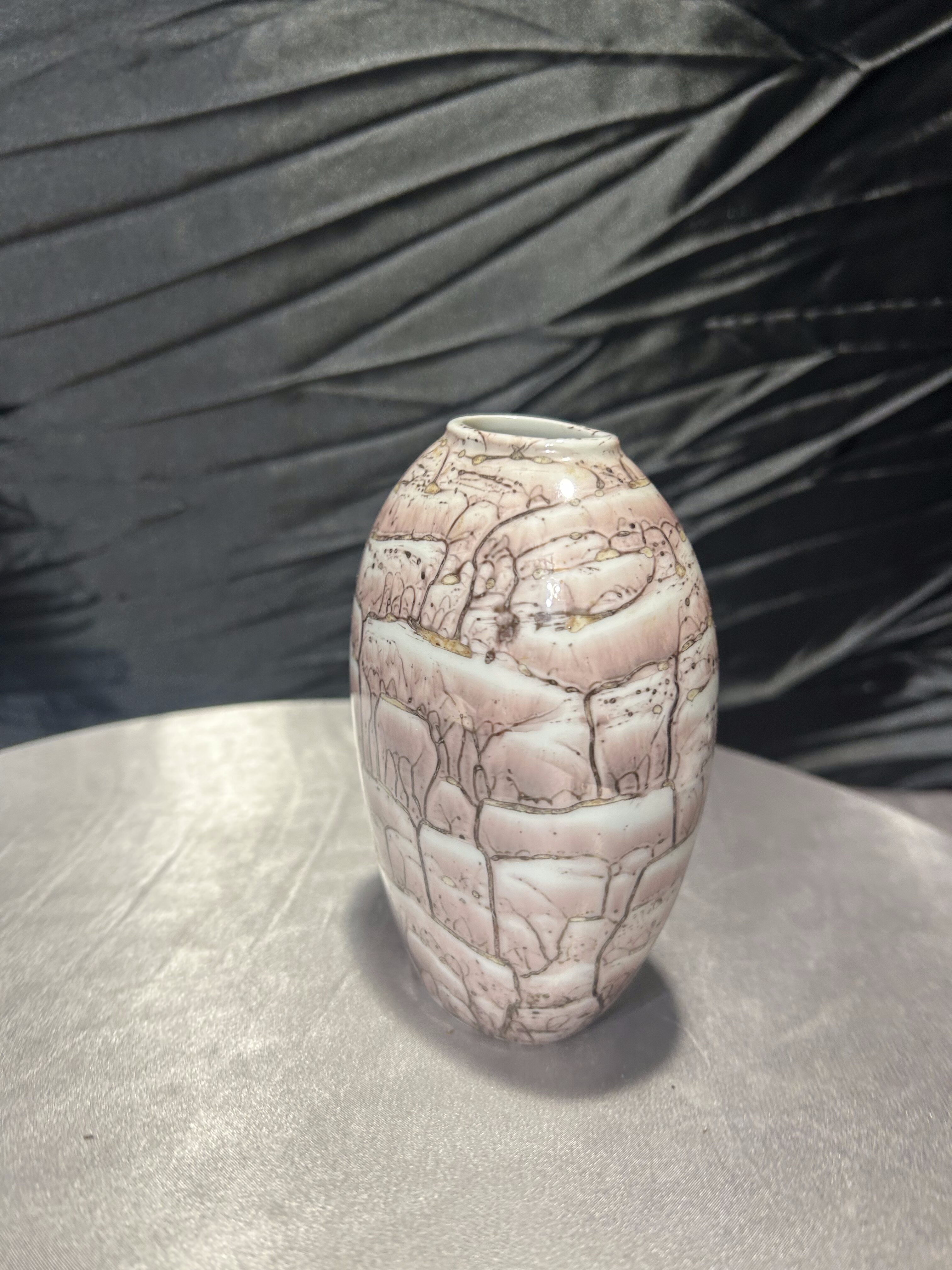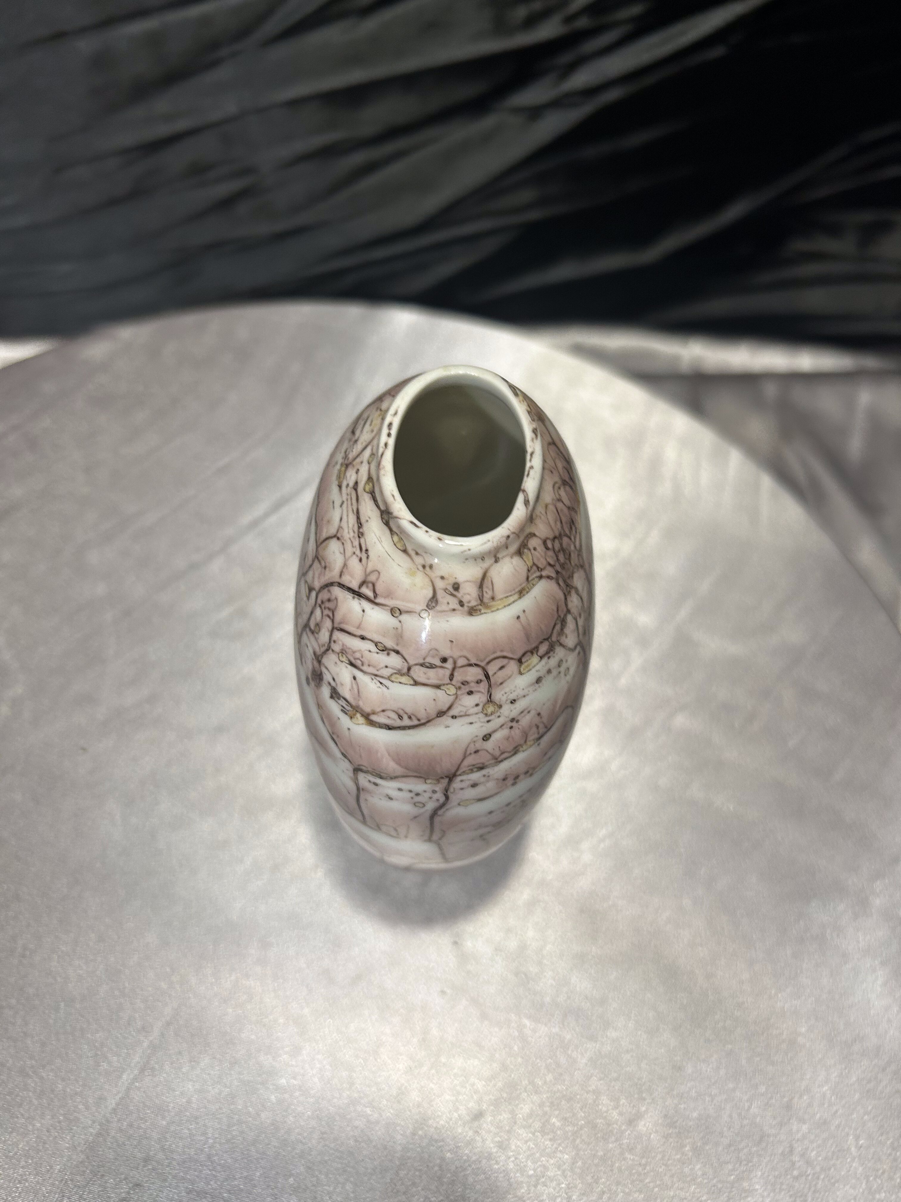 Powierzchnię flakonu zdobi wyjątkowy, szkliwiony wzór przypominający spękaną glazurę lub organiczną strukturę kamienia. Odcienie beżu, różu i delikatnego złota tworzą kompozycję o subtelnym połysku i głębi, typową dla eksperymentalnych dekoracji okresu powojennego. Na spodzie widoczna jest sygnatura „Bavaria Greidlitz – Made in Germany” z charakterystyczną koroną oraz ręczny podpis artysty.