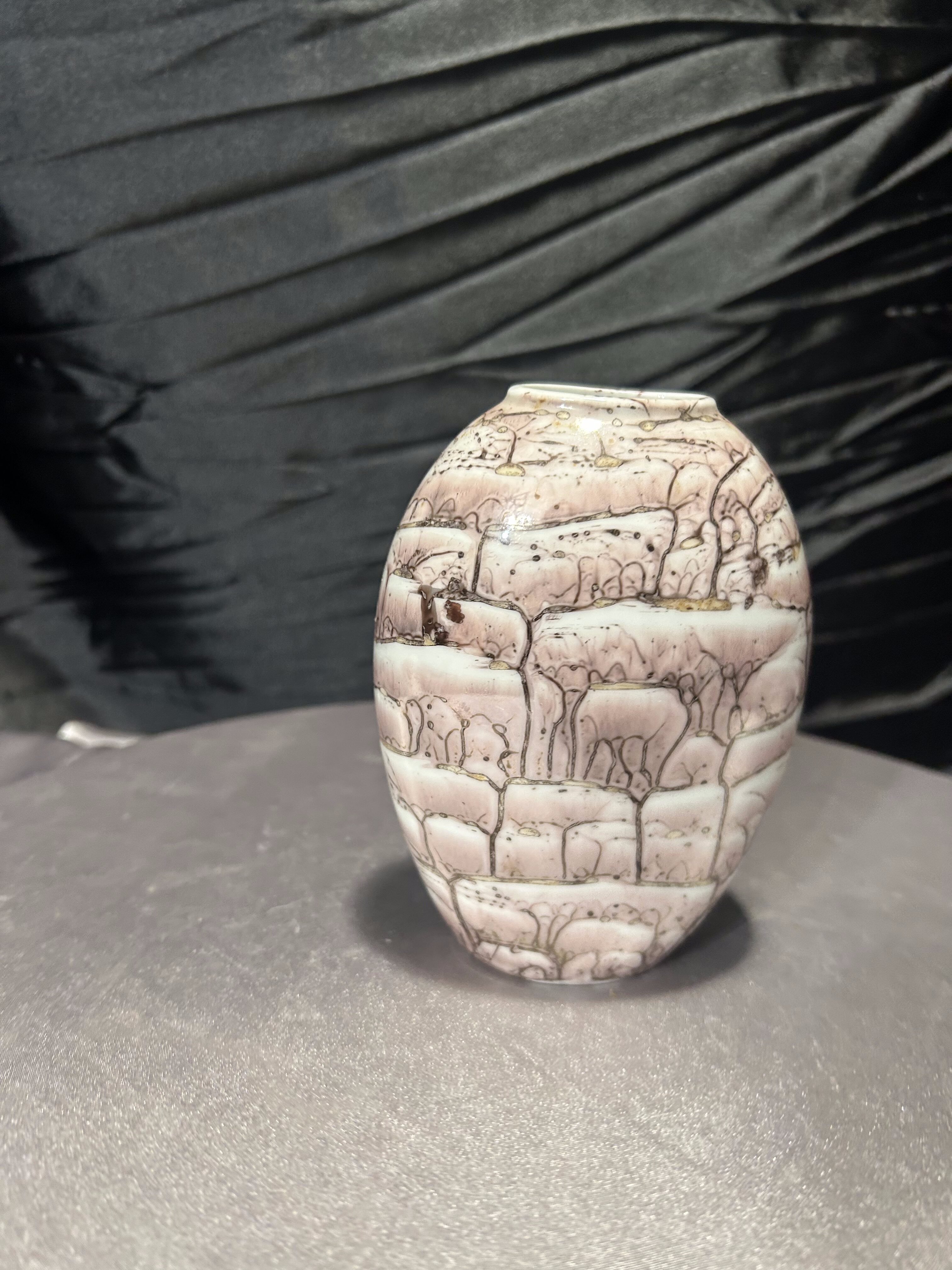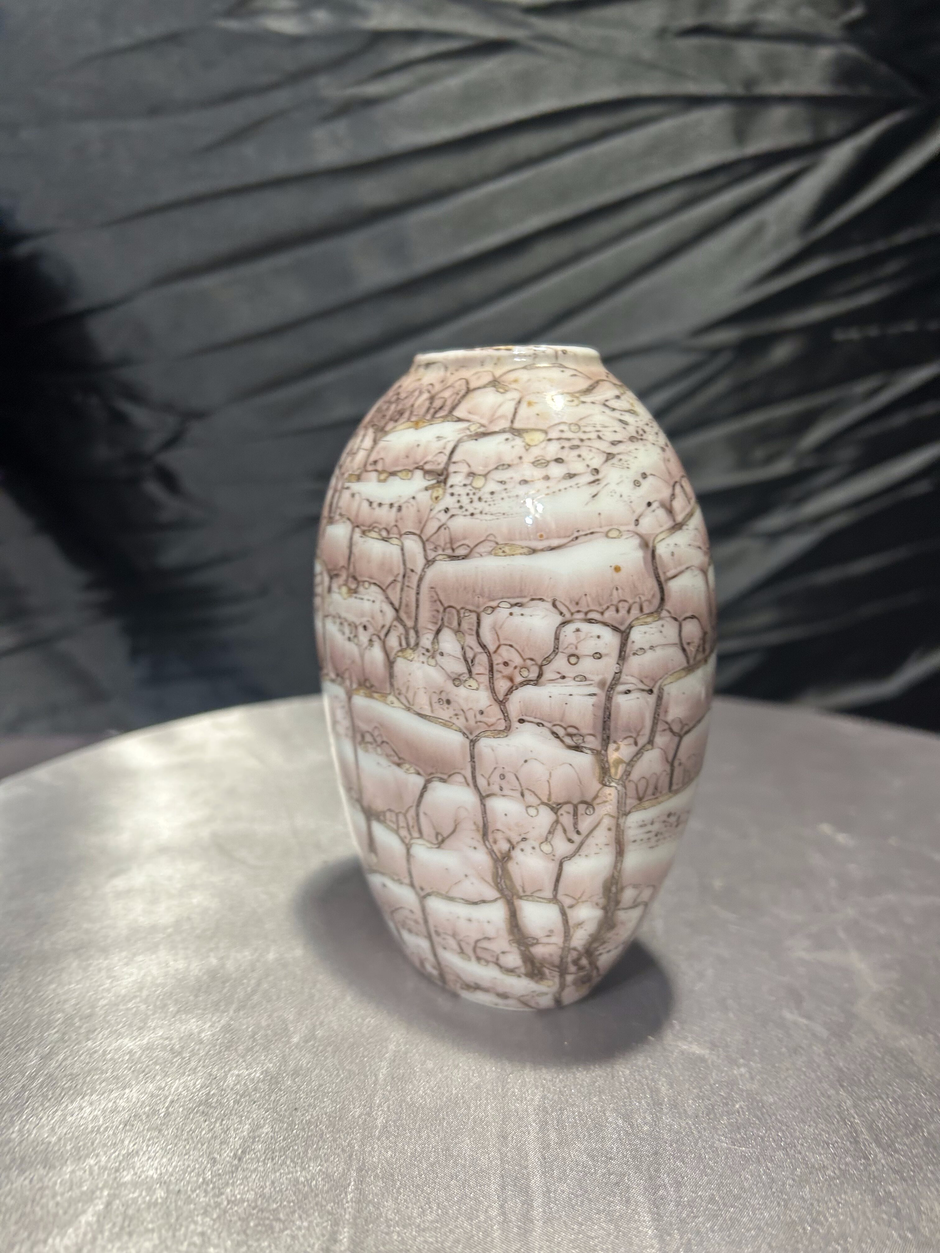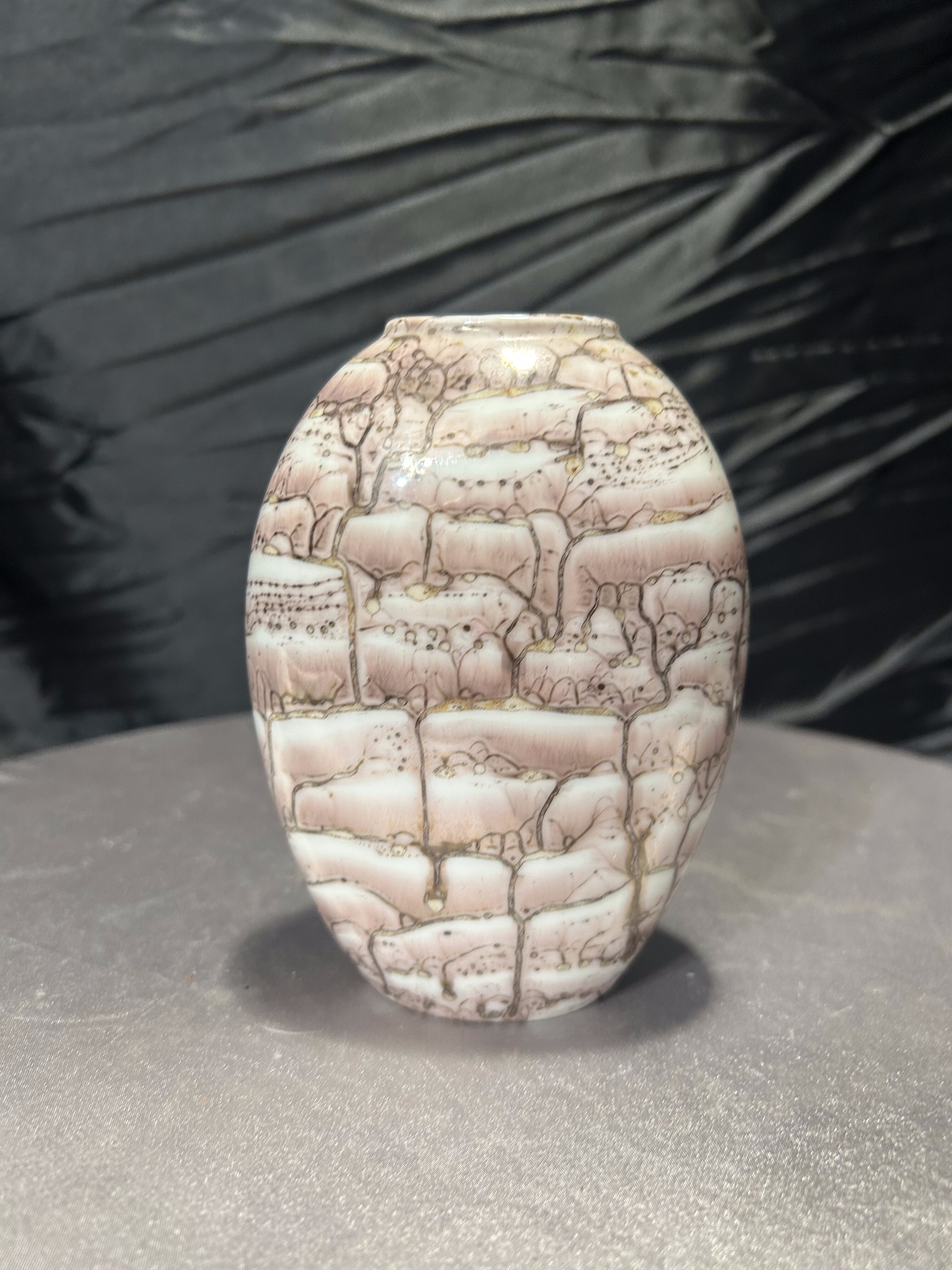 Powierzchnię flakonu zdobi wyjątkowy, szkliwiony wzór przypominający spękaną glazurę lub organiczną strukturę kamienia. Odcienie beżu, różu i delikatnego złota tworzą kompozycję o subtelnym połysku i głębi, typową dla eksperymentalnych dekoracji okresu powojennego. Na spodzie widoczna jest sygnatura „Bavaria Greidlitz – Made in Germany” z charakterystyczną koroną oraz ręczny podpis artysty.