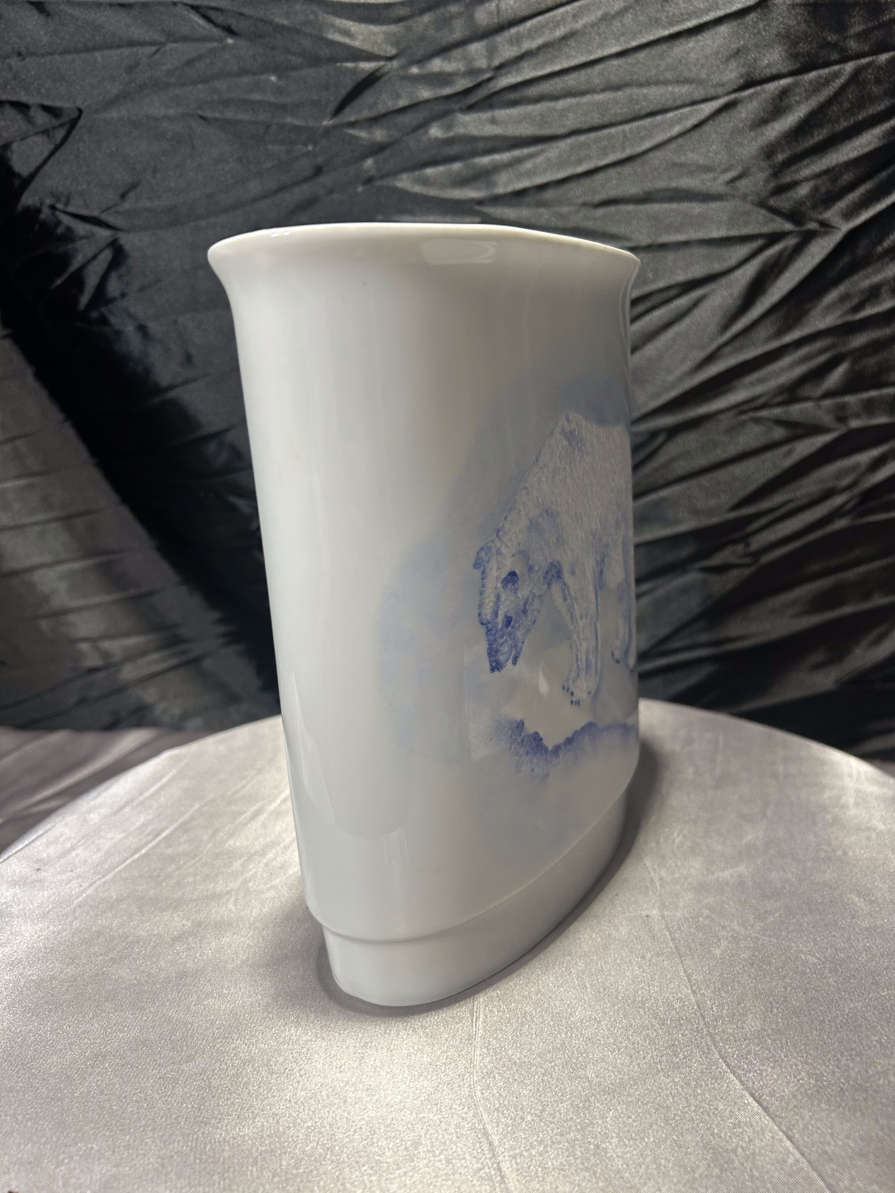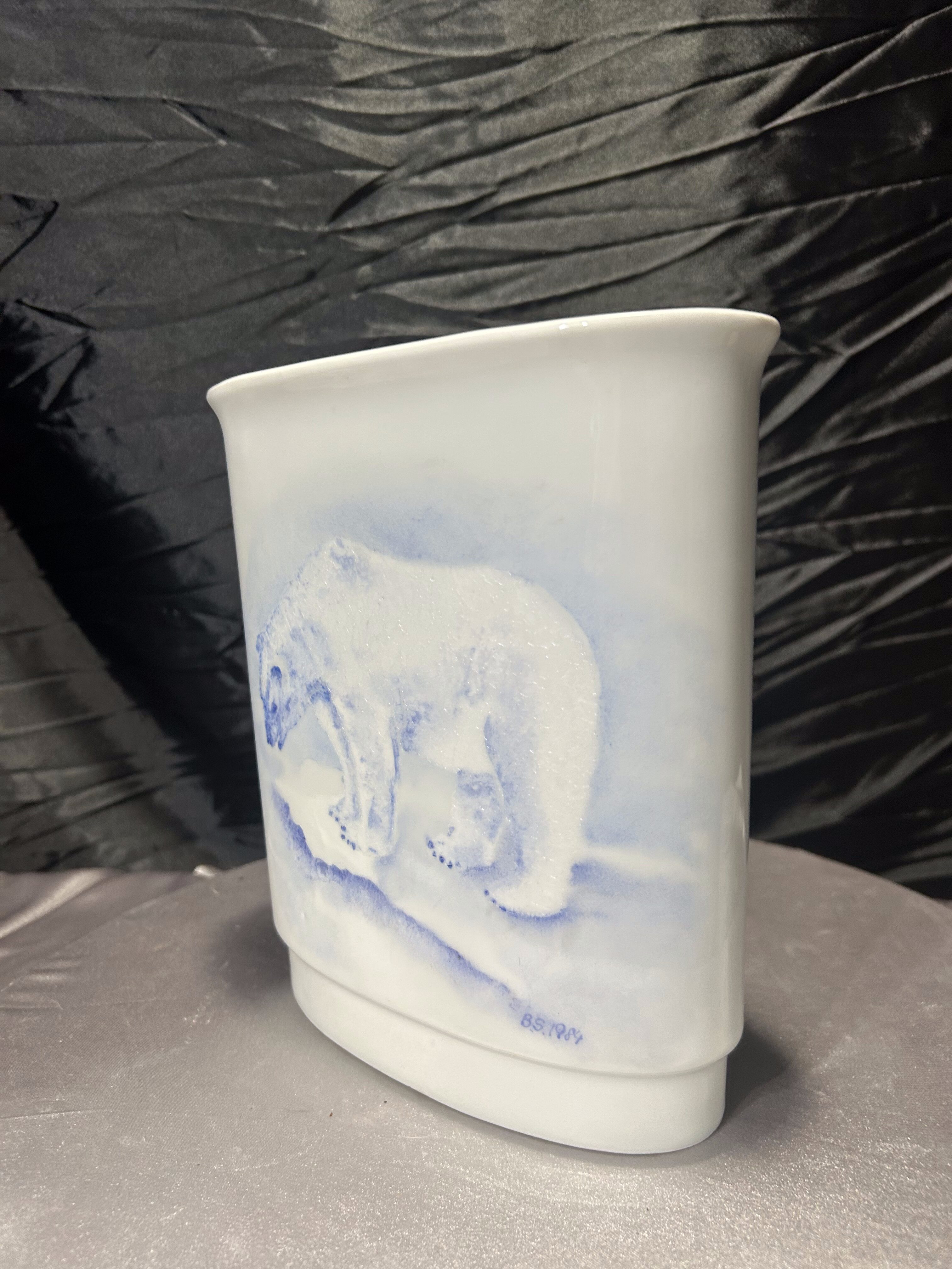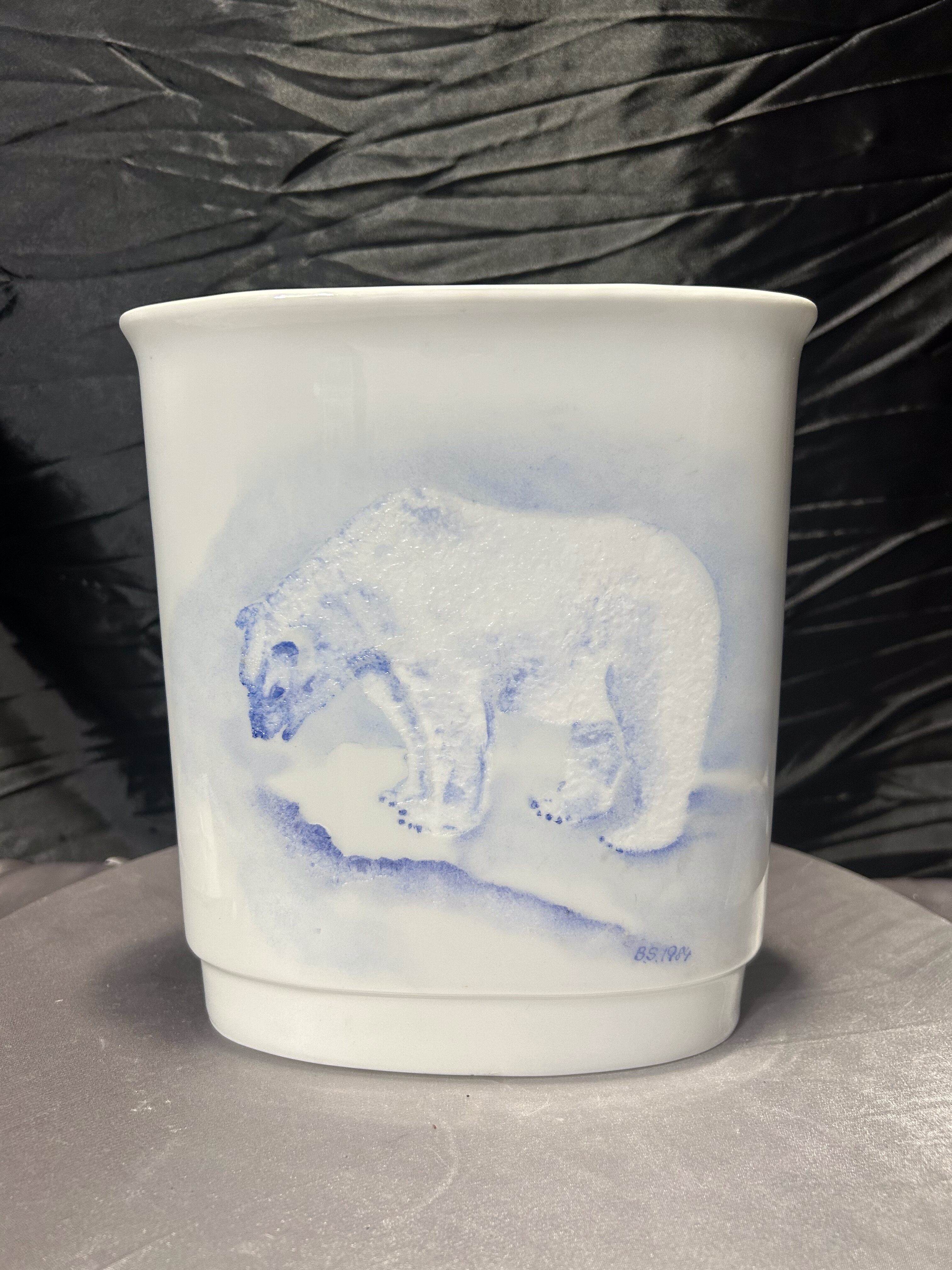 Wyjątkowy flakon z porcelany bawarskiej marki Wunsiedel Bavaria, sygnowany i ręcznie malowany w 1964 roku przez Brodil Strand. Na powierzchni widnieje subtelny, reliefowy wizerunek niedźwiedzia polarnego, utrzymany w chłodnej, niebieskiej tonacji. Motyw zwierzęcia, połączony z delikatną formą porcelany, nadaje przedmiotowi aurę spokoju i północnej elegancji.