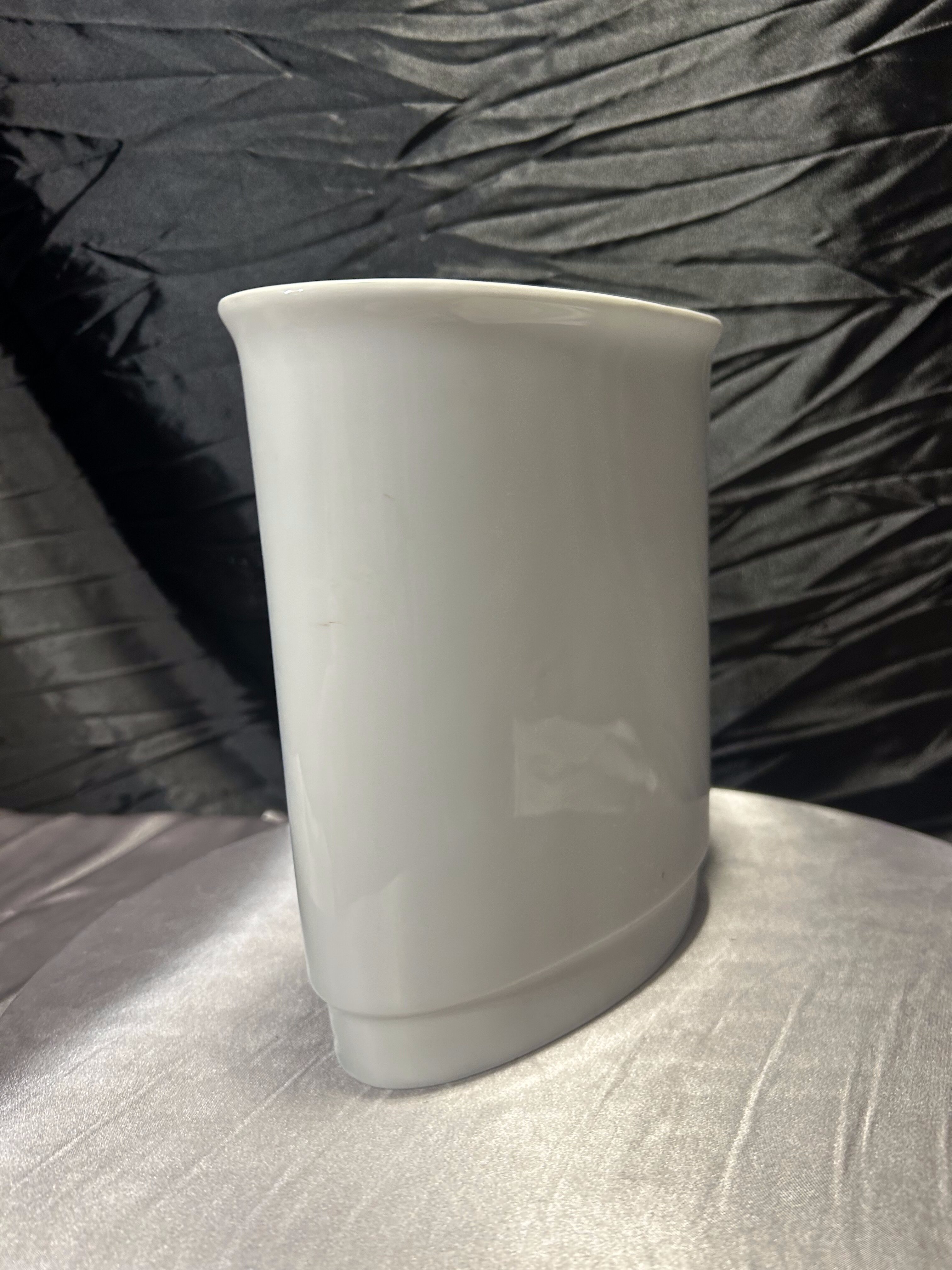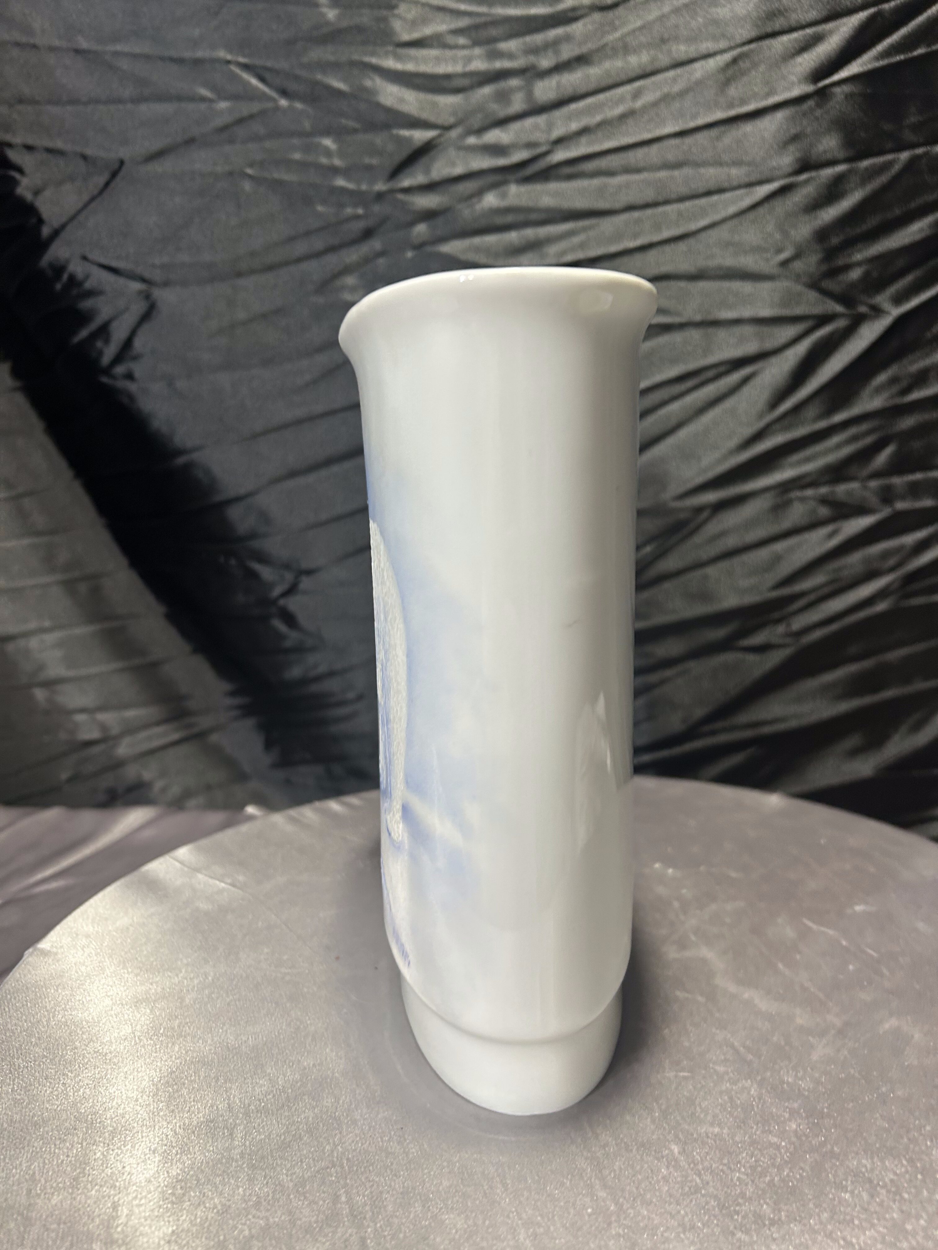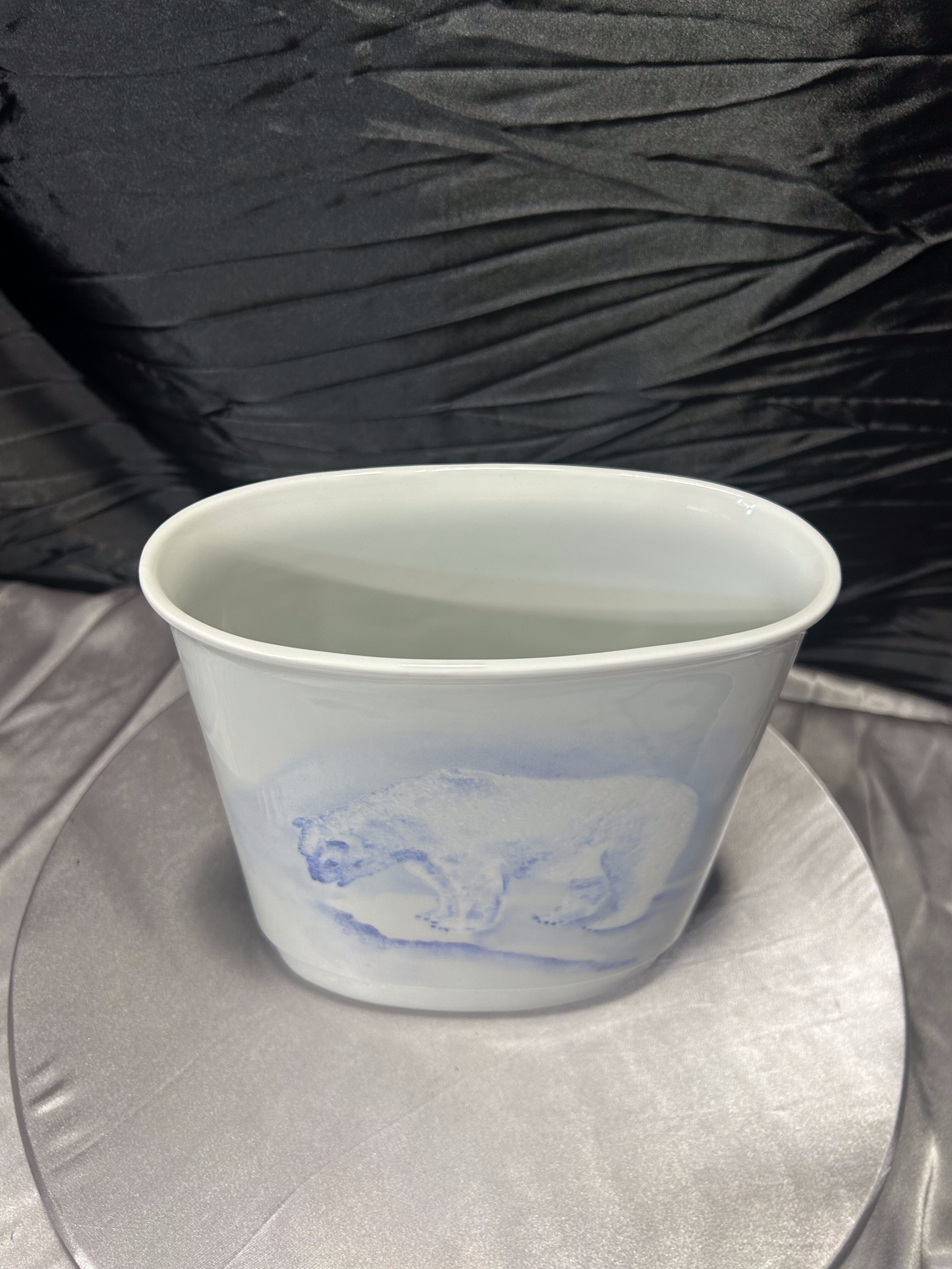 Wyjątkowy flakon z porcelany bawarskiej marki Wunsiedel Bavaria, sygnowany i ręcznie malowany w 1964 roku przez Brodil Strand. Na powierzchni widnieje subtelny, reliefowy wizerunek niedźwiedzia polarnego, utrzymany w chłodnej, niebieskiej tonacji. Motyw zwierzęcia, połączony z delikatną formą porcelany, nadaje przedmiotowi aurę spokoju i północnej elegancji.