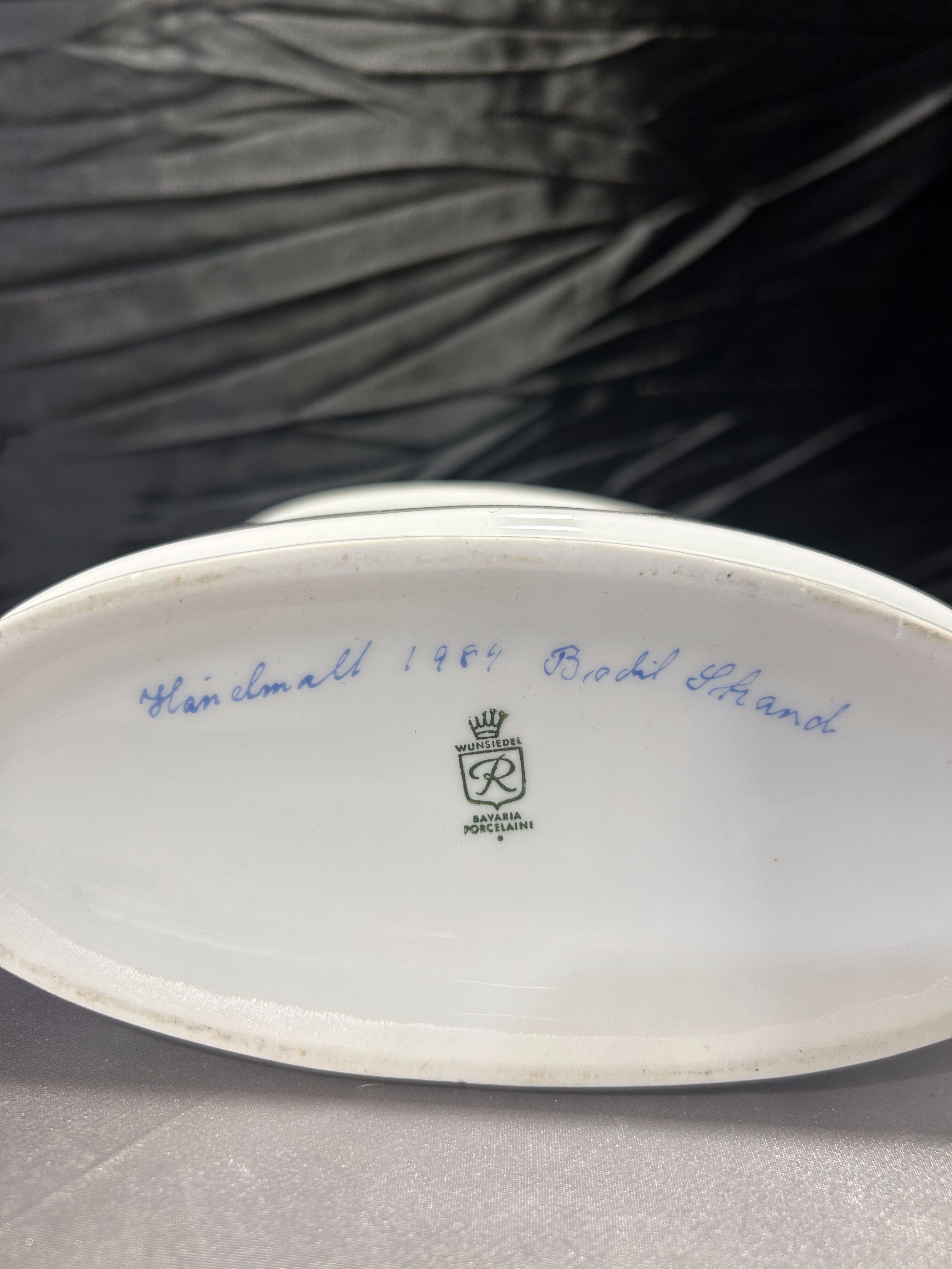 Fabryka Wunsiedel Porzellanfabrik została założona w bawarskim miasteczku Wunsiedel w 1881 roku i przez dziesięciolecia zasłynęła z produkcji wysokogatunkowej porcelany stołowej oraz artystycznej. Charakterystyczne dla niej były klasyczne formy, precyzyjne zdobienia i ręczne malatury, które czyniły każdy egzemplarz unikalnym. Sygnatura z koroną i literą „R” (Reindl) to znak fabryki używany od połowy XX wieku.