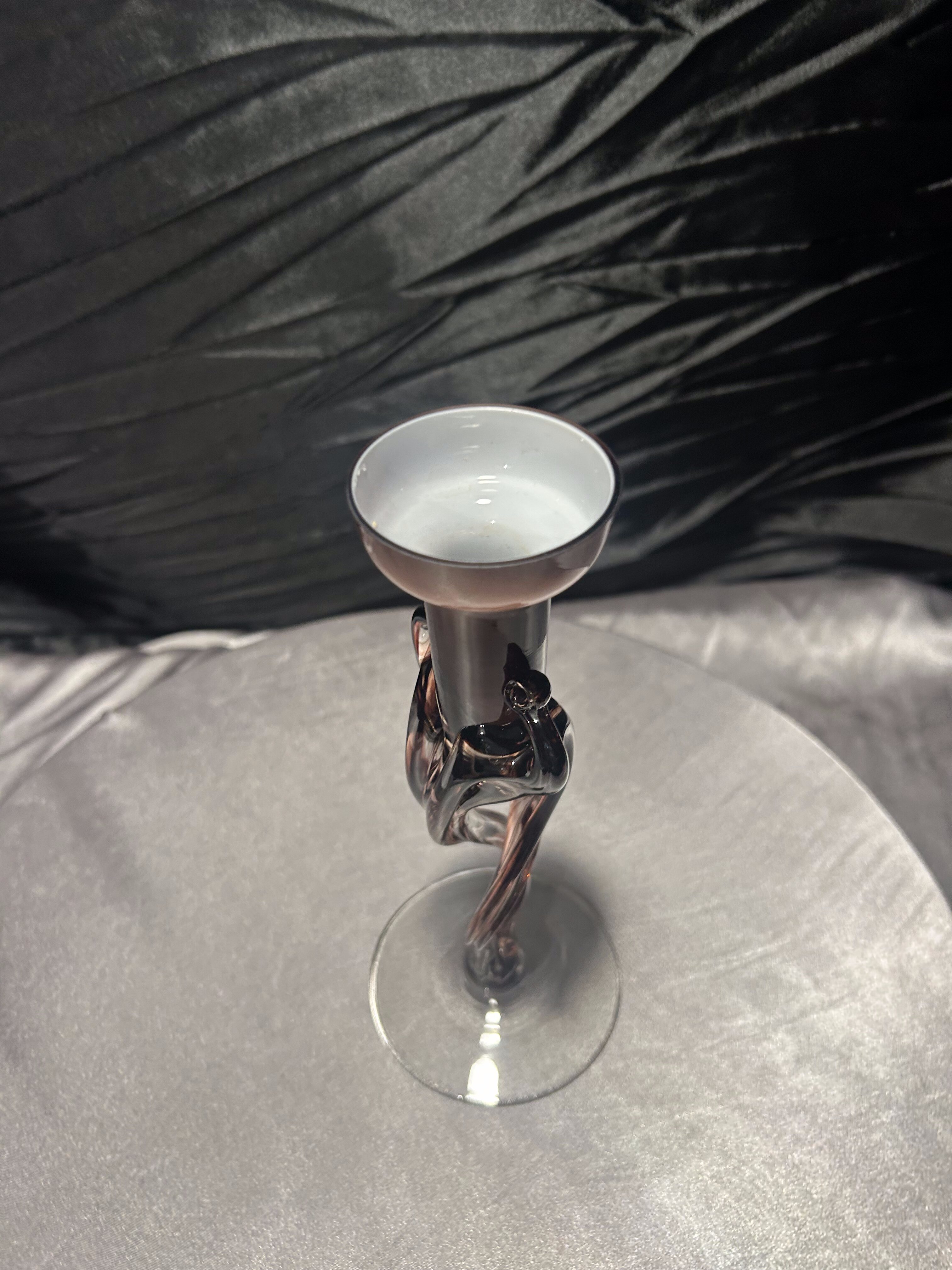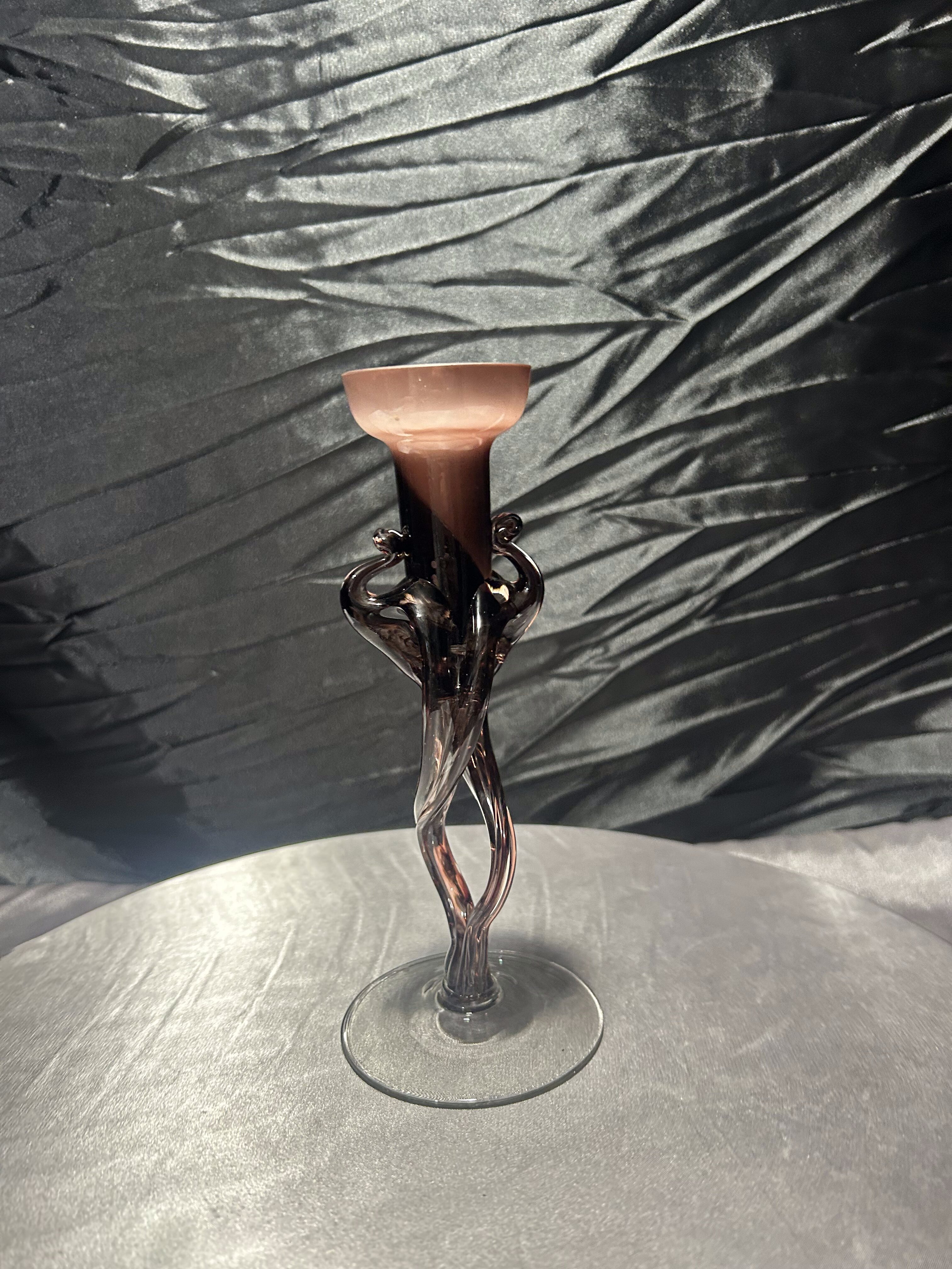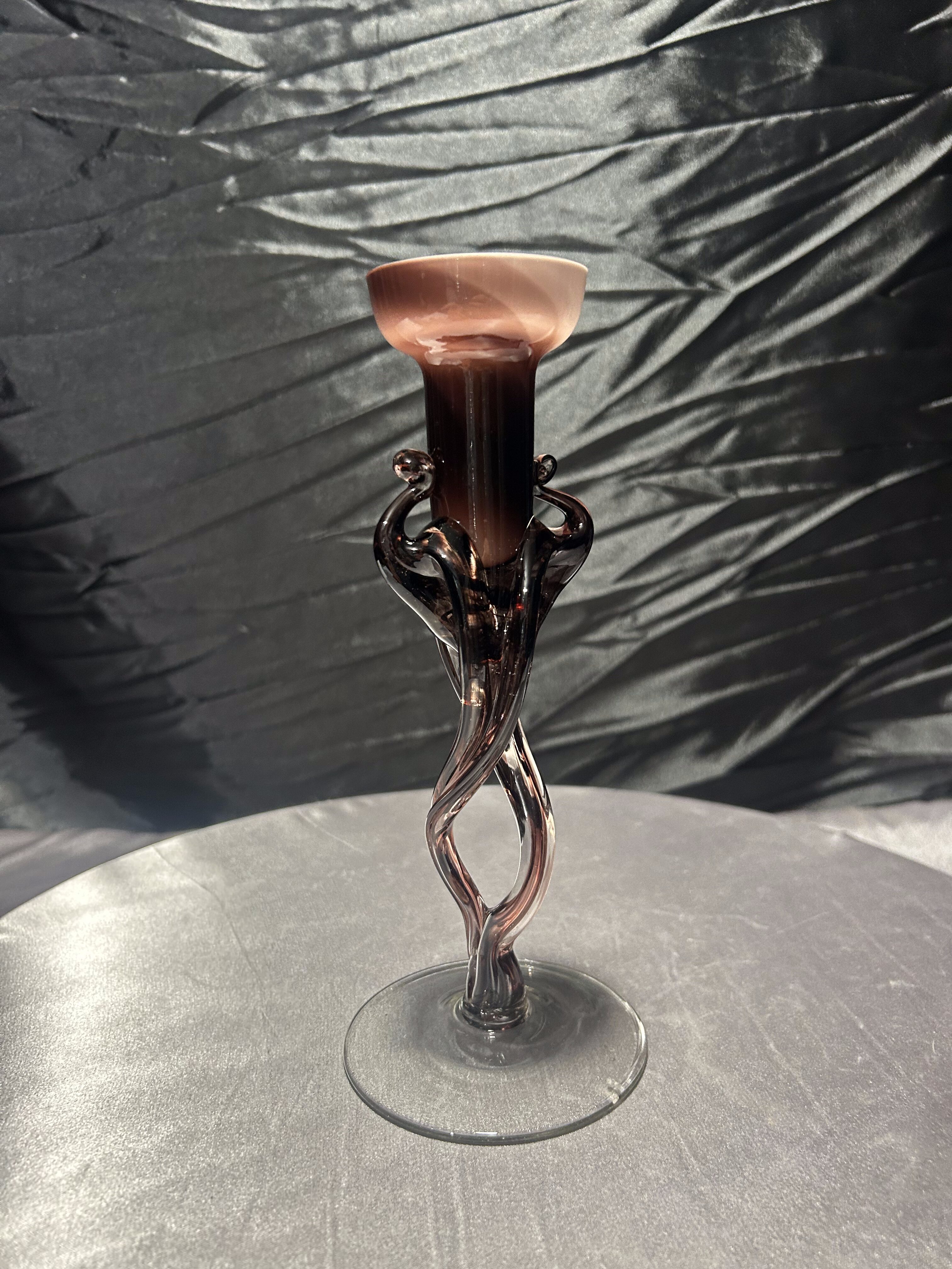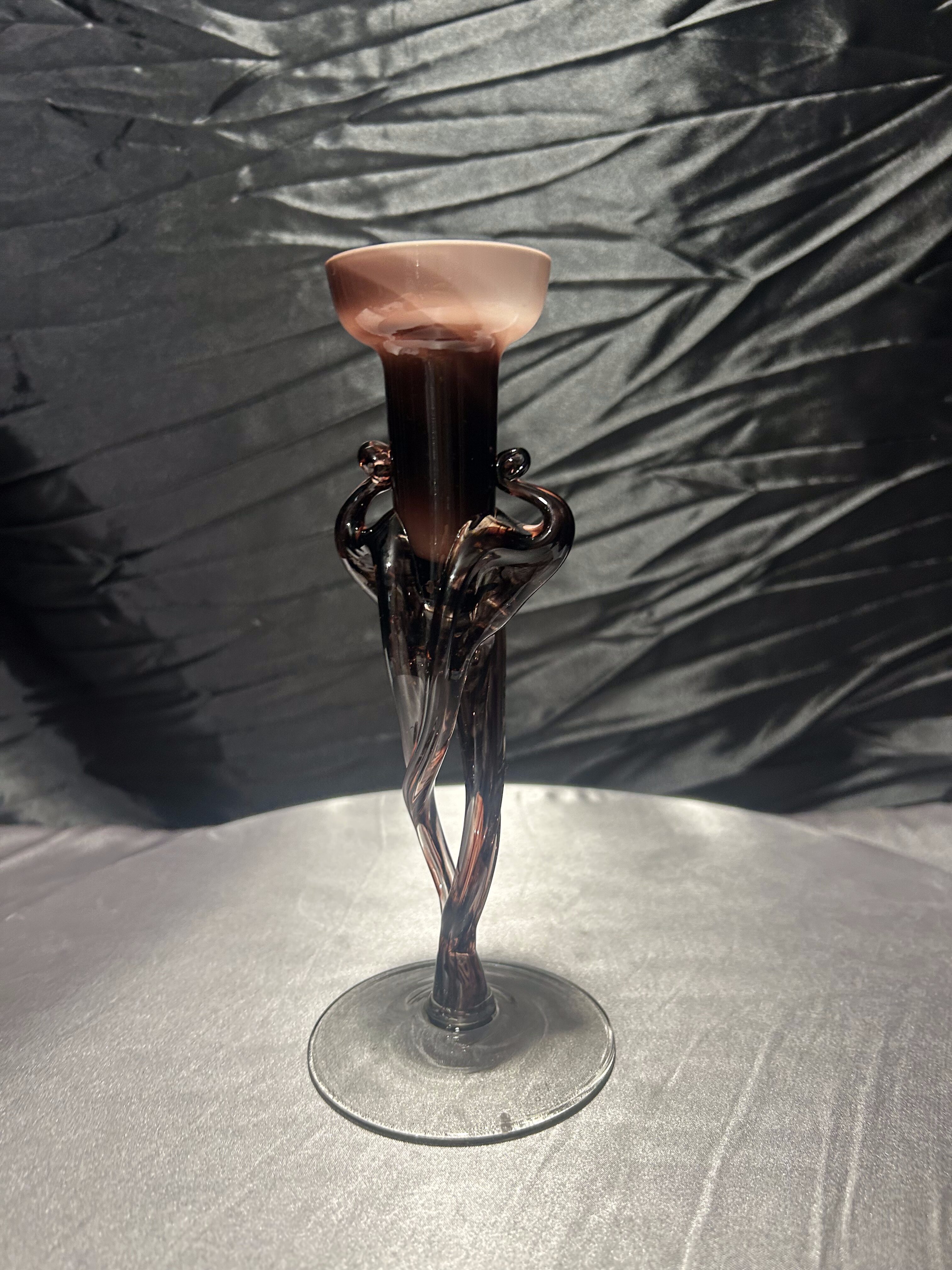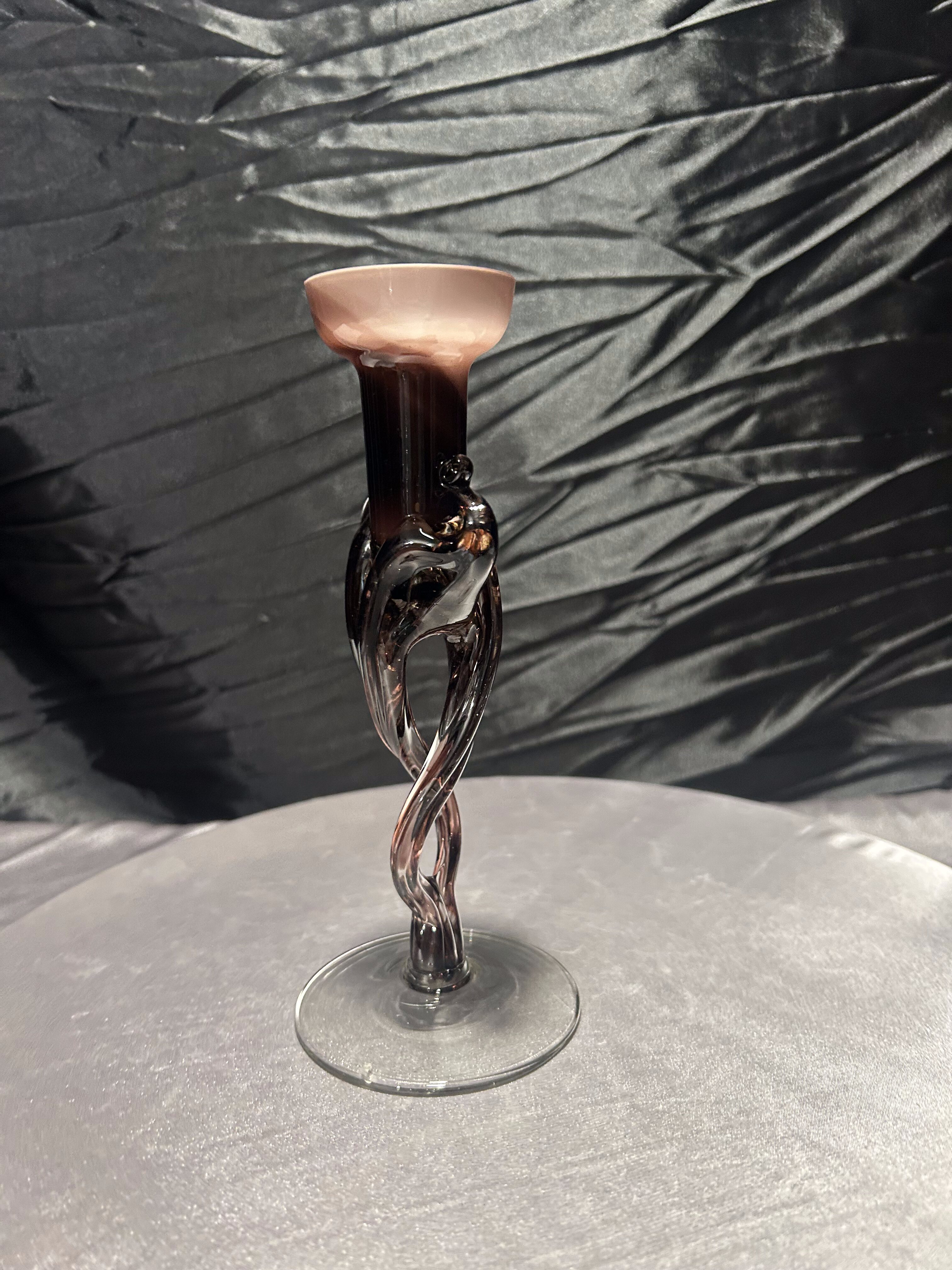 Wyjątkowy flakon ze szkła artystycznego, który z powodzeniem może pełnić również funkcję świecznika. Wykonany ręcznie w technice szkła formowanego, zachwyca smukłą linią, lekko skręconą formą i delikatnym ruchem szkła.
