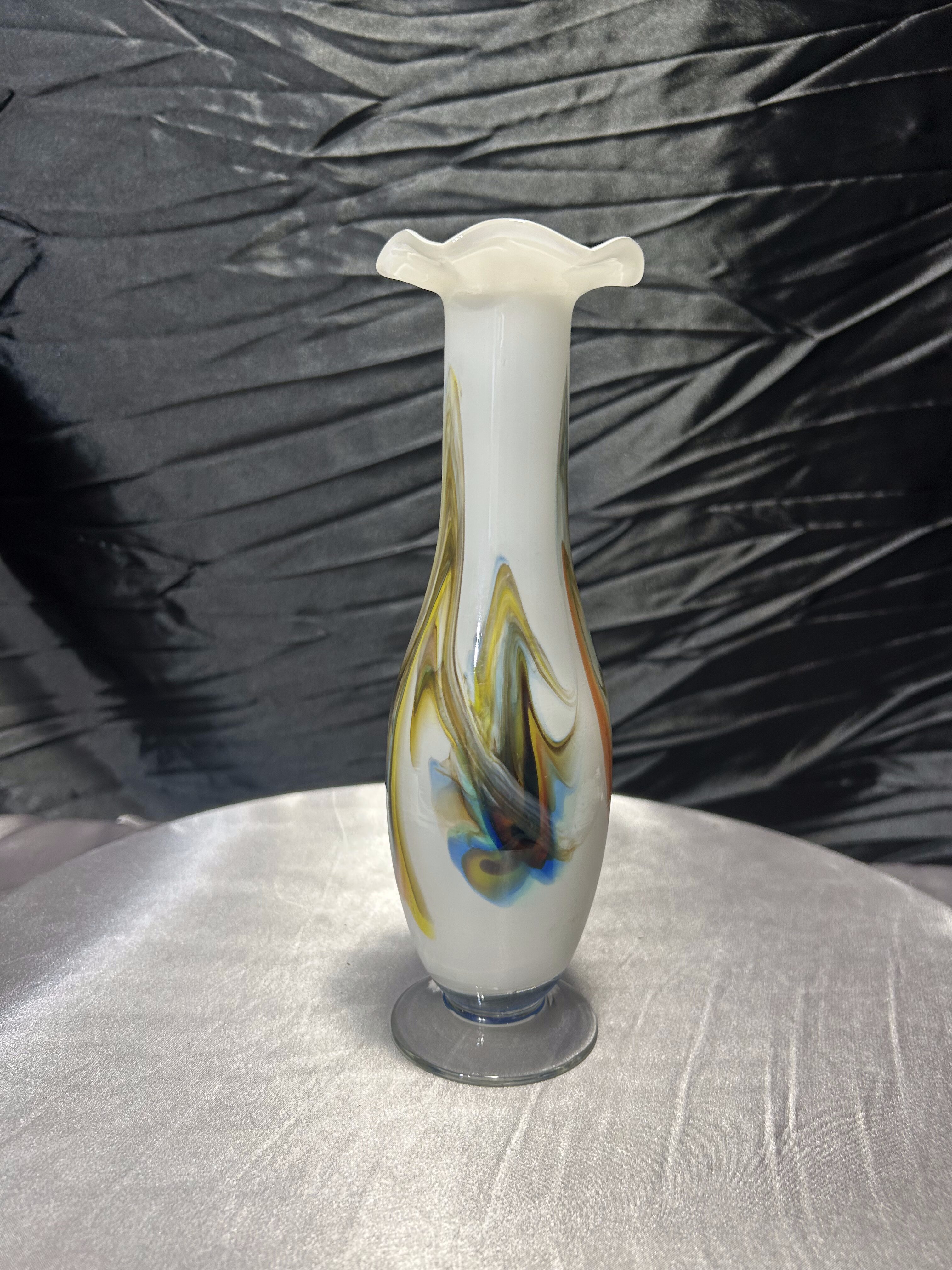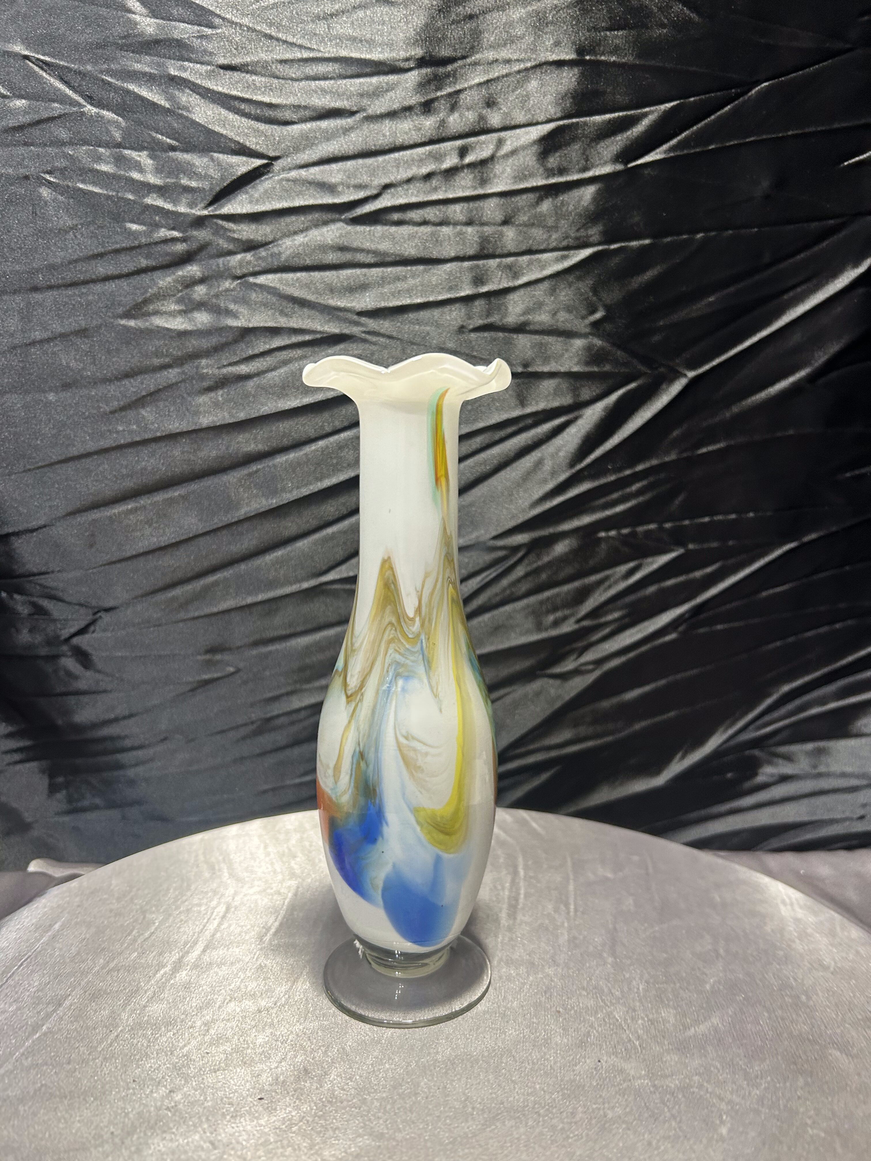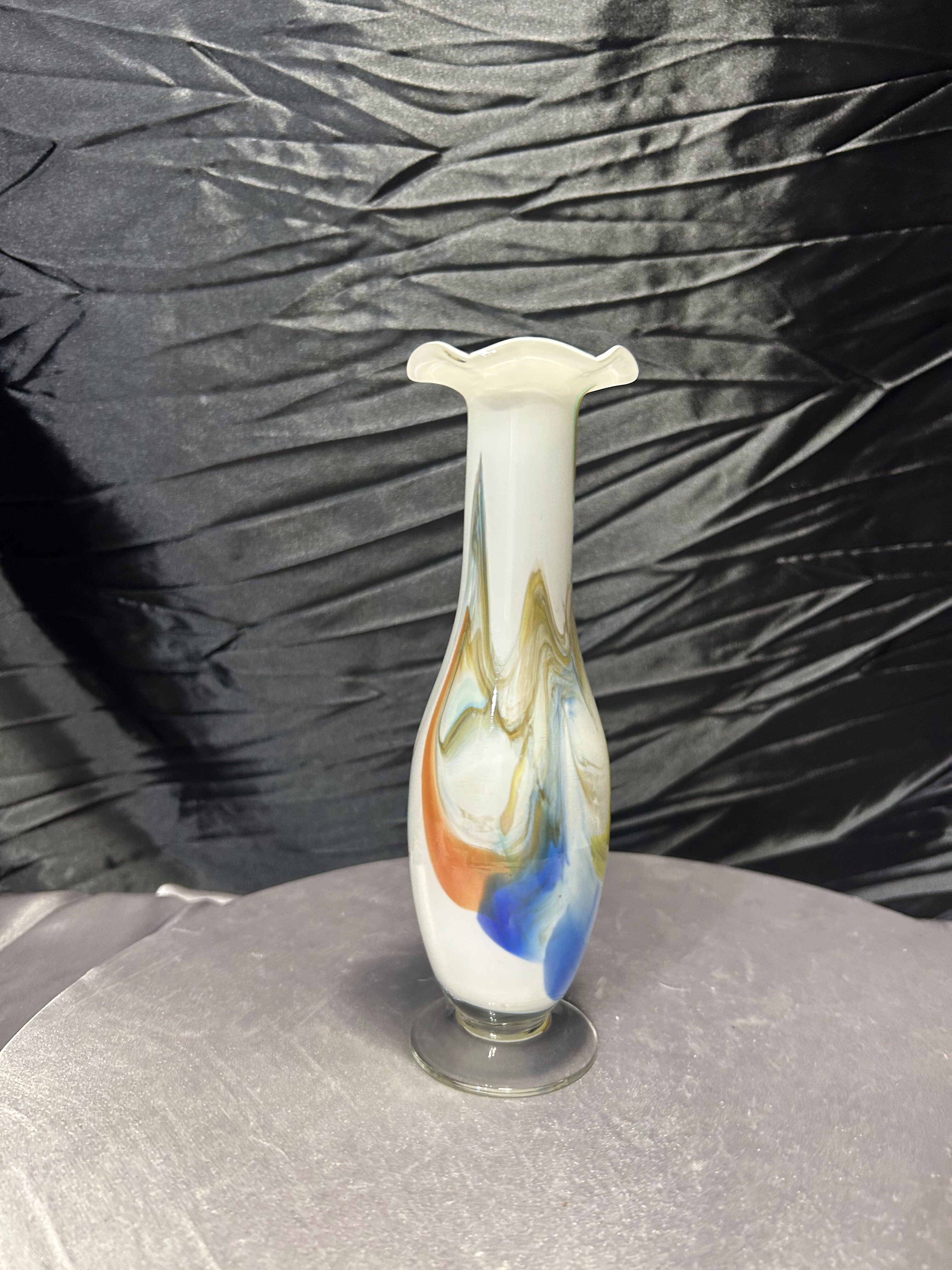 Elegancki flakon wykonany ze szkła artystycznego w stylu Murano. Smukła forma zakończona dekoracyjną falbanką u góry nadaje mu lekkości, a wtopione w mleczne szkło barwy błękitu, bursztynu i brązu tworzą wyjątkową kompozycję kolorystyczną. Flakon zachwyca nie tylko proporcjami, ale i ręcznym wykonaniem – każdy egzemplarz tego typu jest niepowtarzalny. Idealny jako pojedyncza ozdoba lub element większej kolekcji szkła artystycznego.