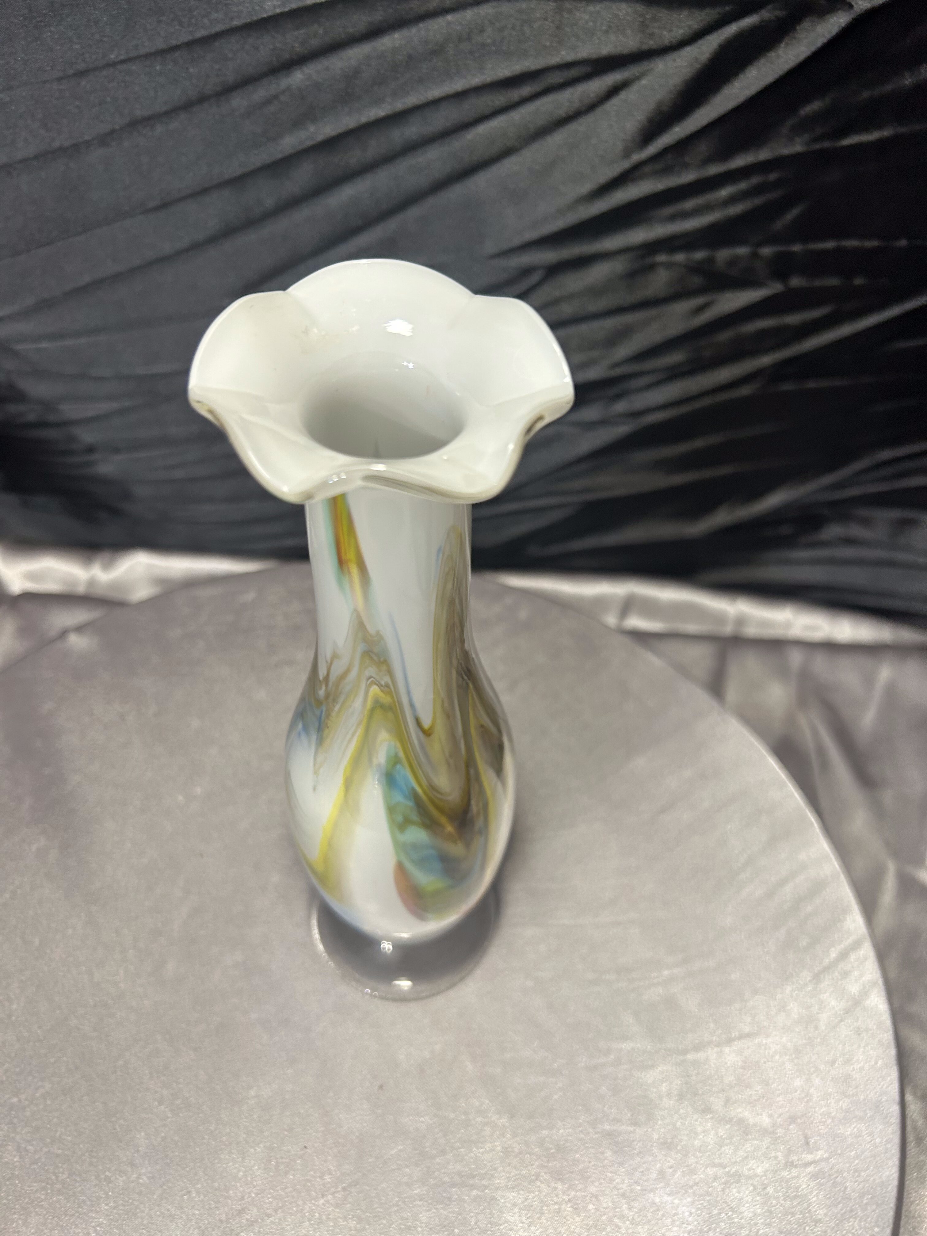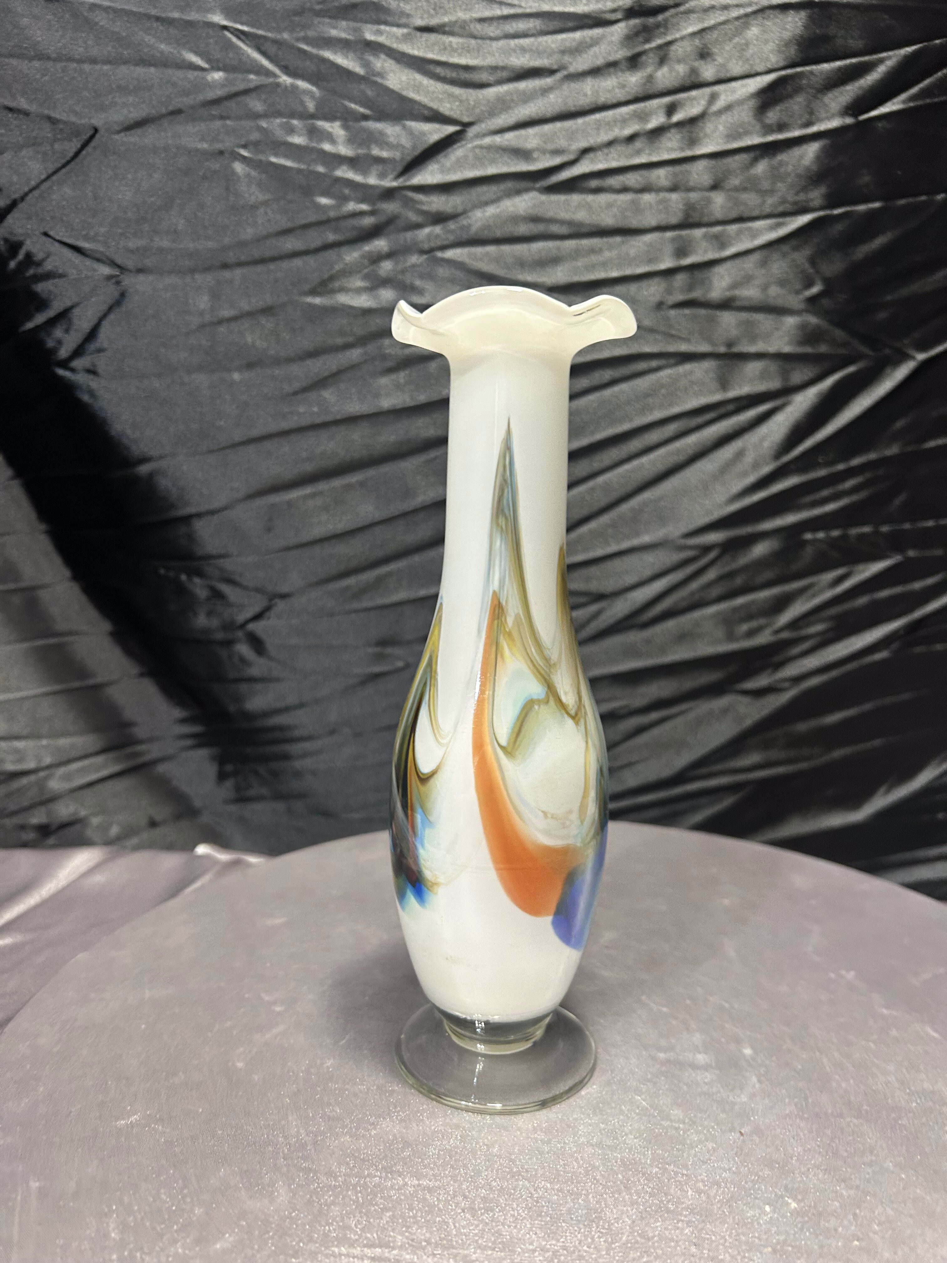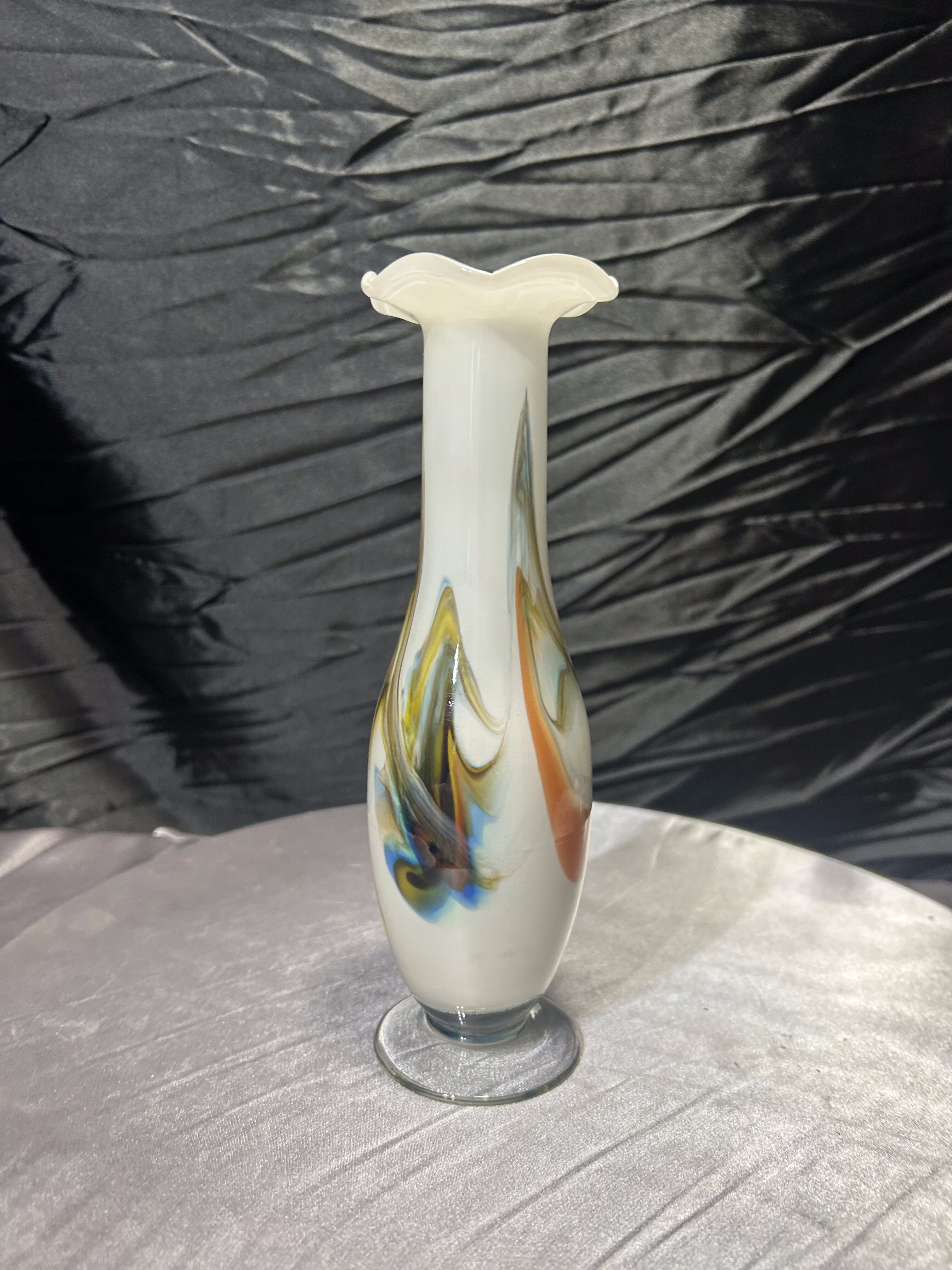 Elegancki flakon wykonany ze szkła artystycznego w stylu Murano. Smukła forma zakończona dekoracyjną falbanką u góry nadaje mu lekkości, a wtopione w mleczne szkło barwy błękitu, bursztynu i brązu tworzą wyjątkową kompozycję kolorystyczną. Flakon zachwyca nie tylko proporcjami, ale i ręcznym wykonaniem – każdy egzemplarz tego typu jest niepowtarzalny. Idealny jako pojedyncza ozdoba lub element większej kolekcji szkła artystycznego.