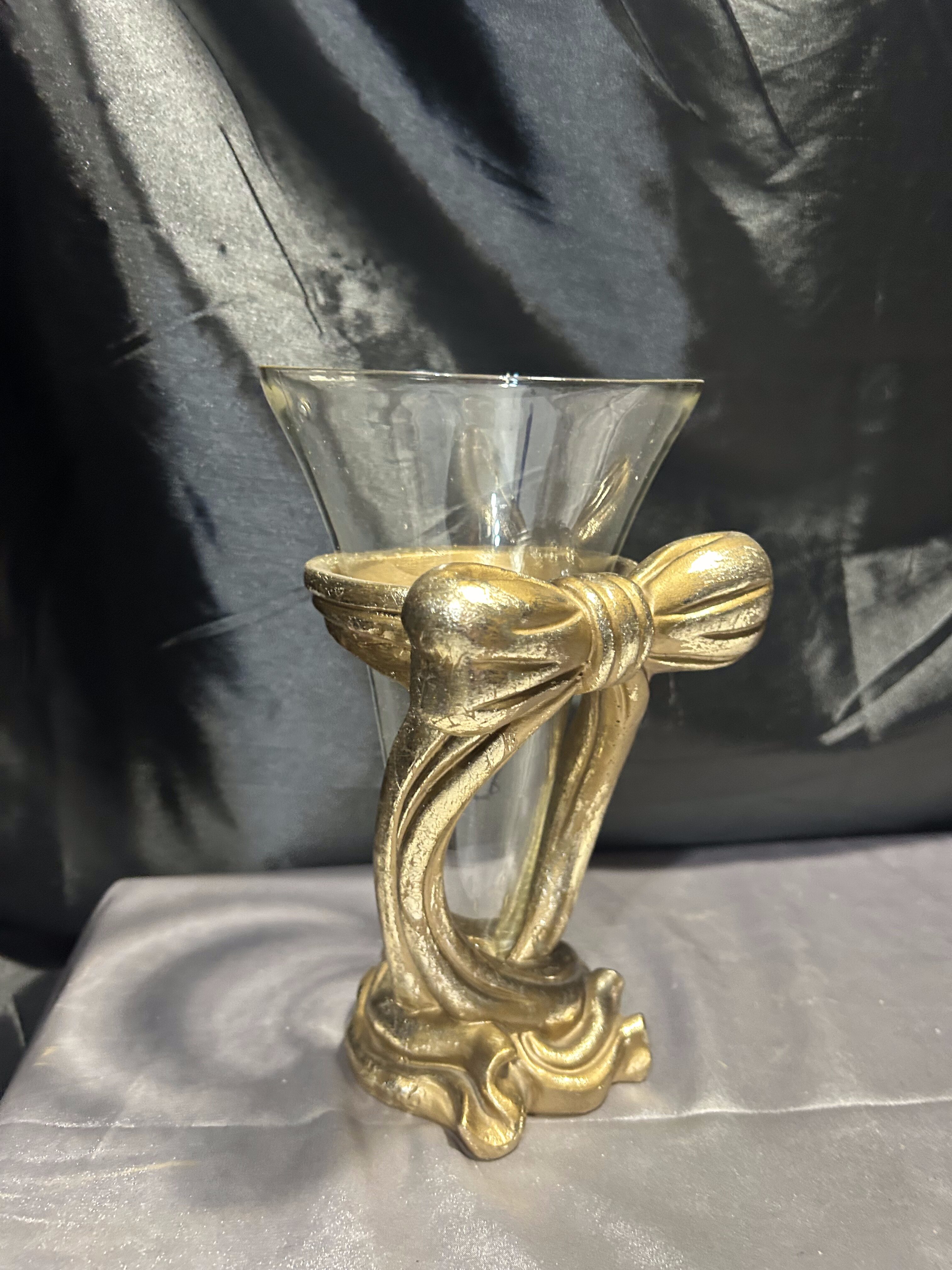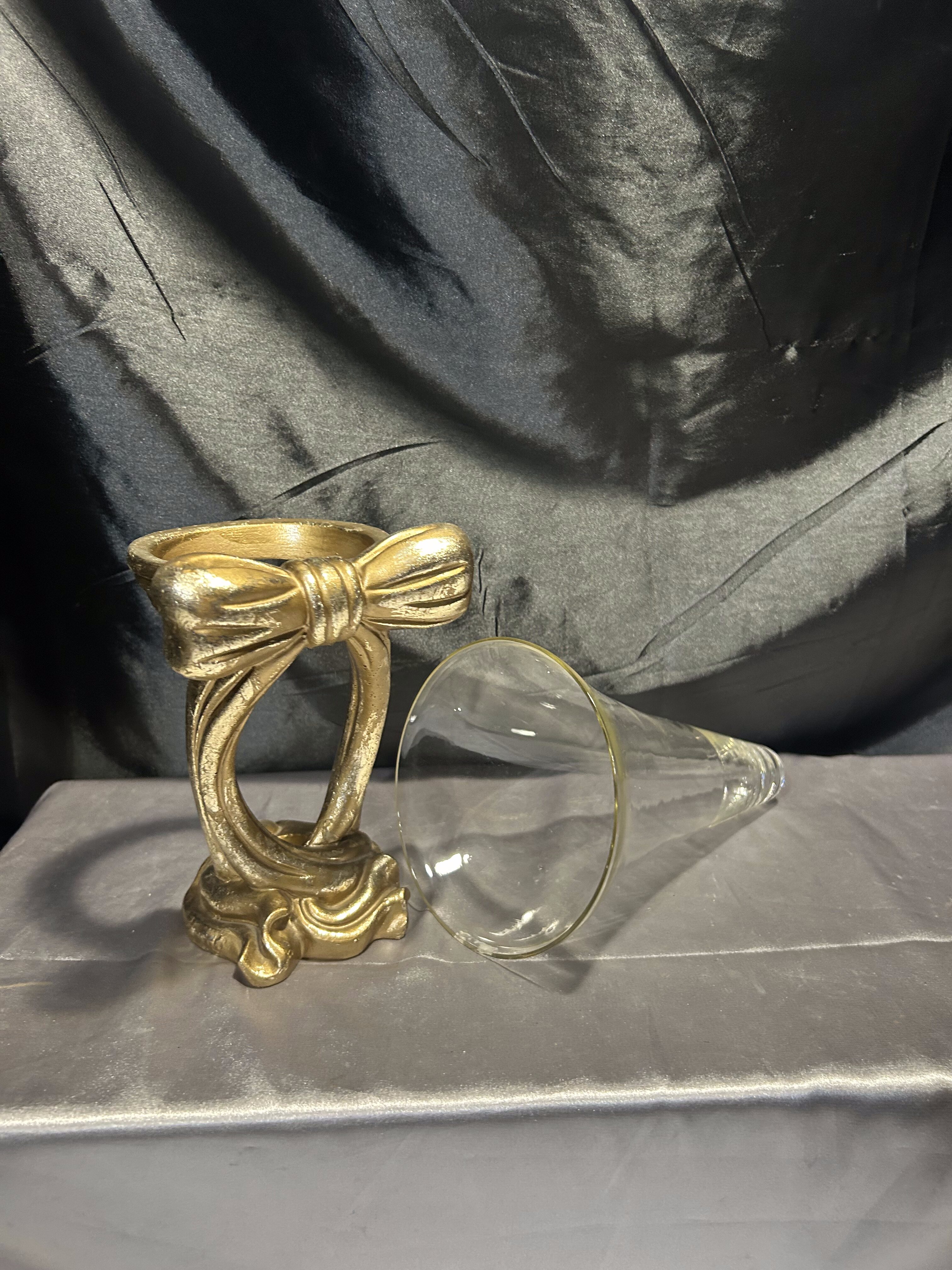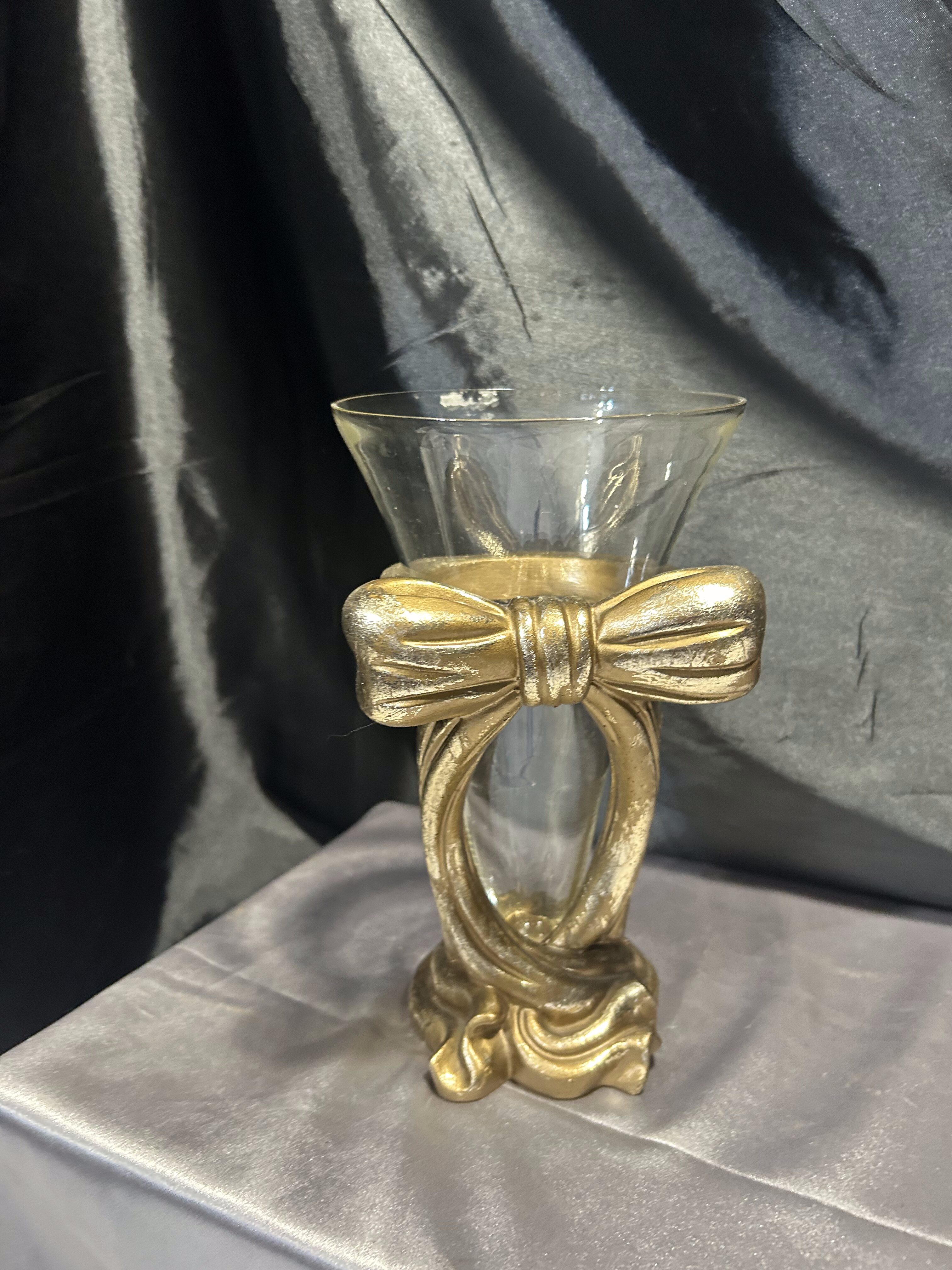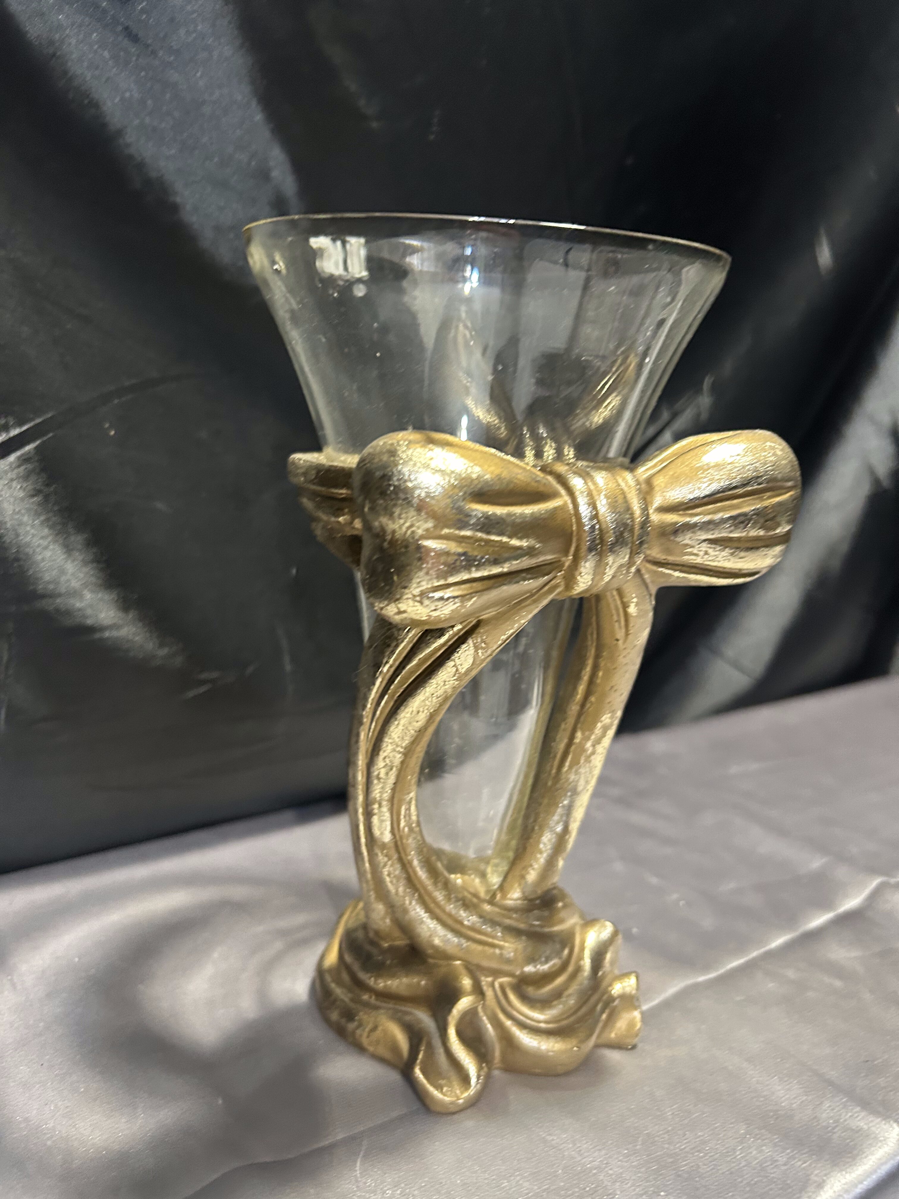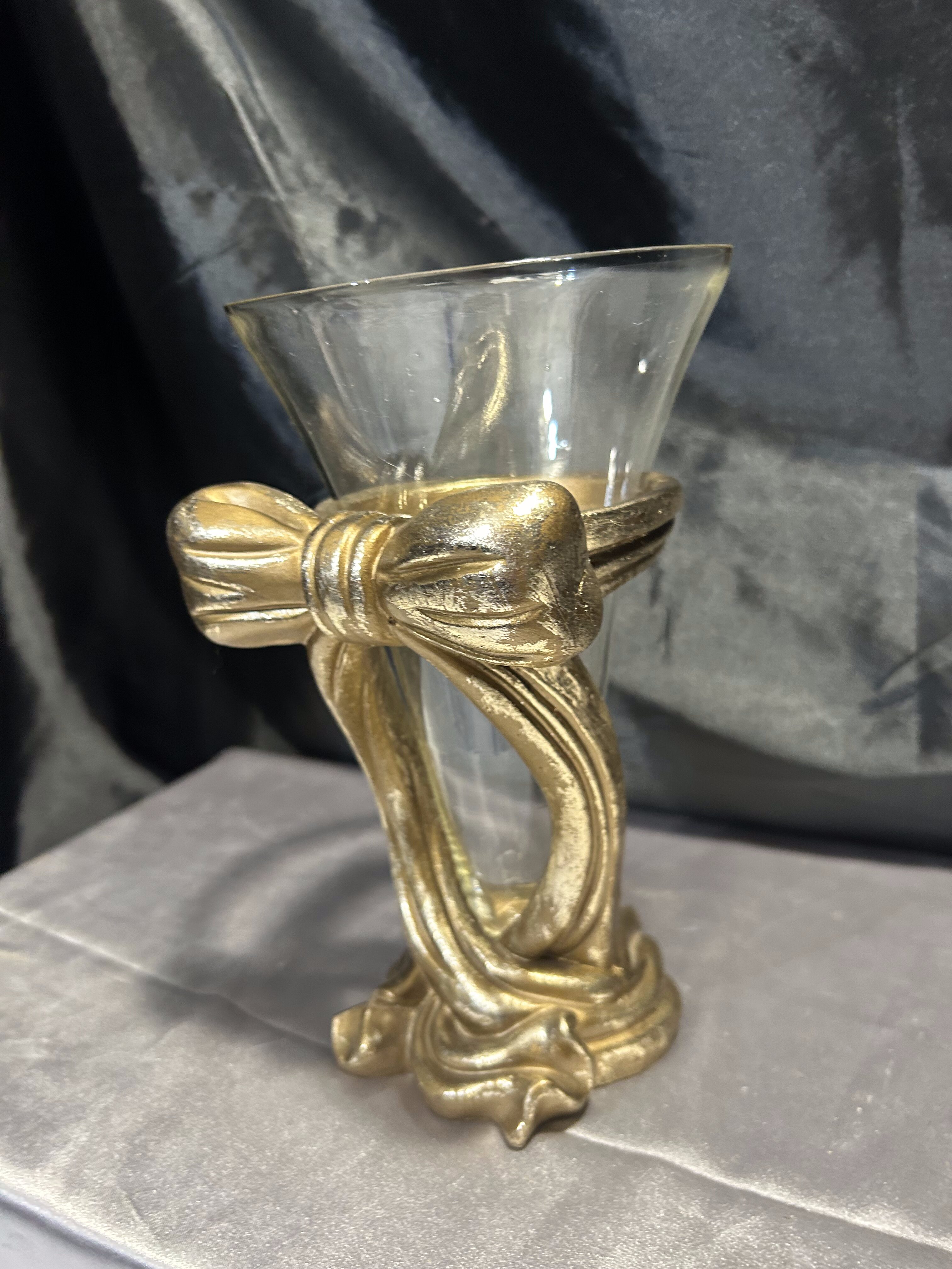 Na sprzedaż elegancki szklany flakon osadzony w dekoracyjnym metalowym stelażu, ozdobiony subtelną kokardką. Delikatny i romantyczny design czyni z niego wyjątkowy element wystroju wnętrza – idealny na świeże kwiaty, gałązki lub jako samodzielna dekoracja.