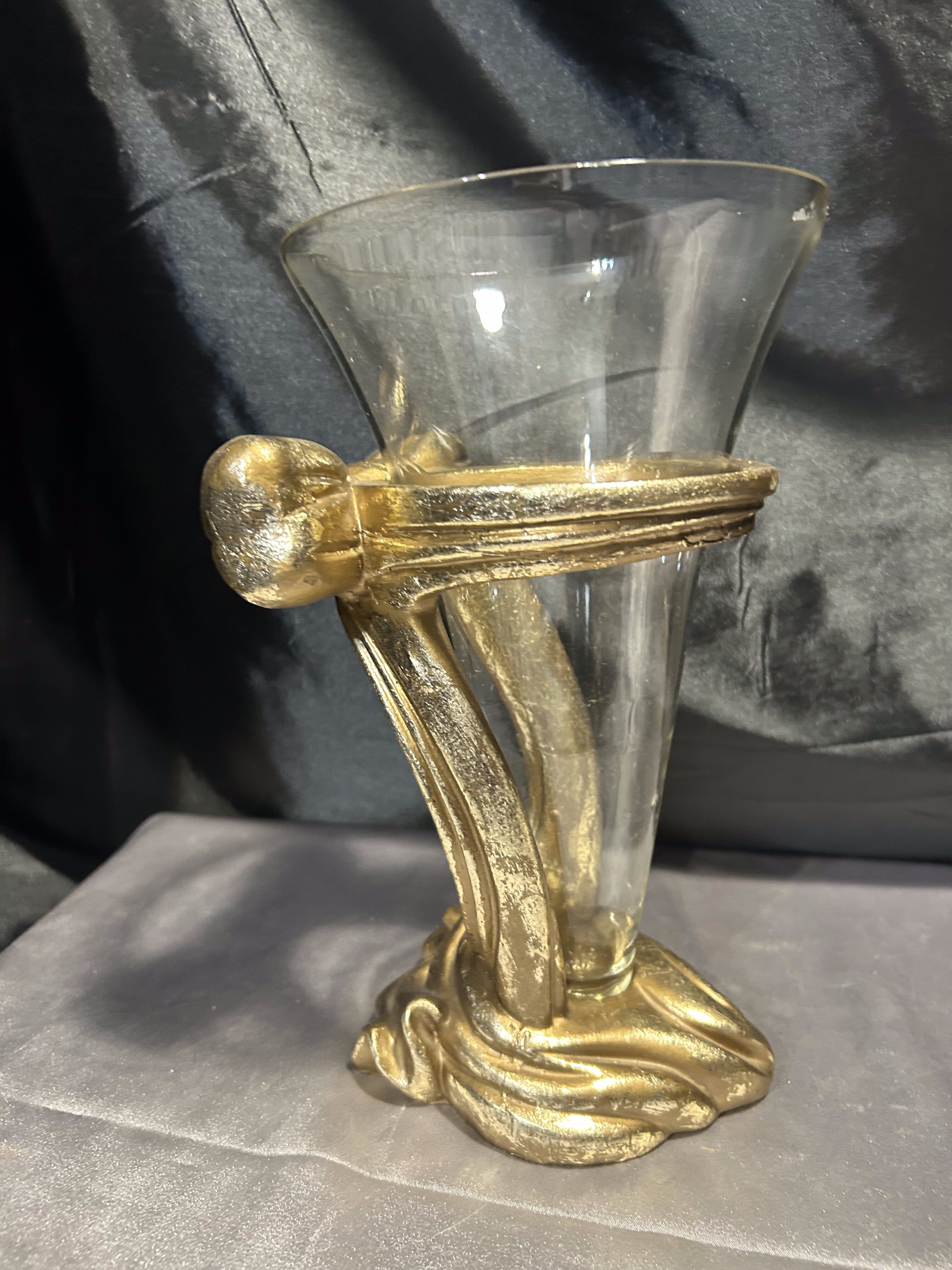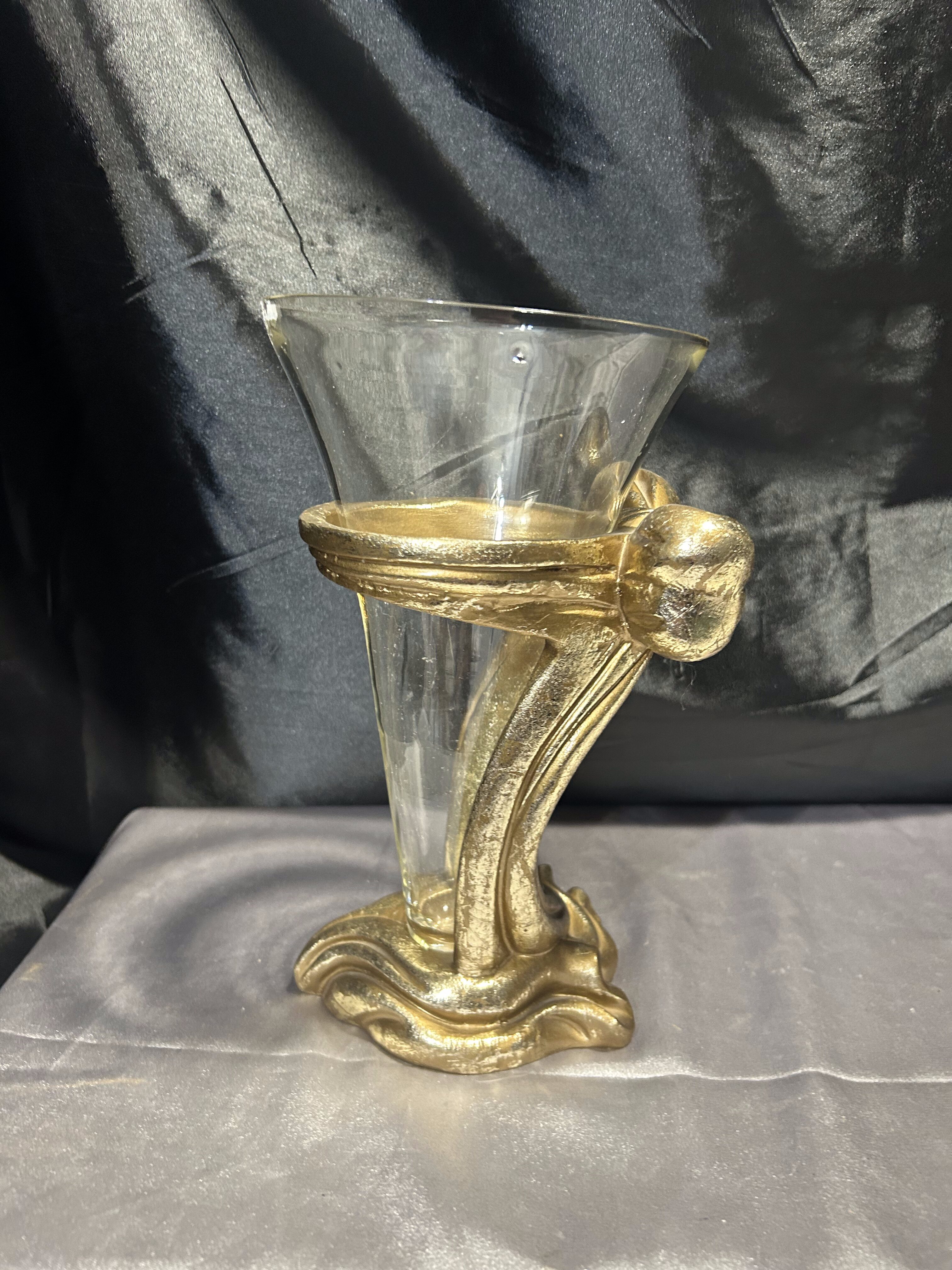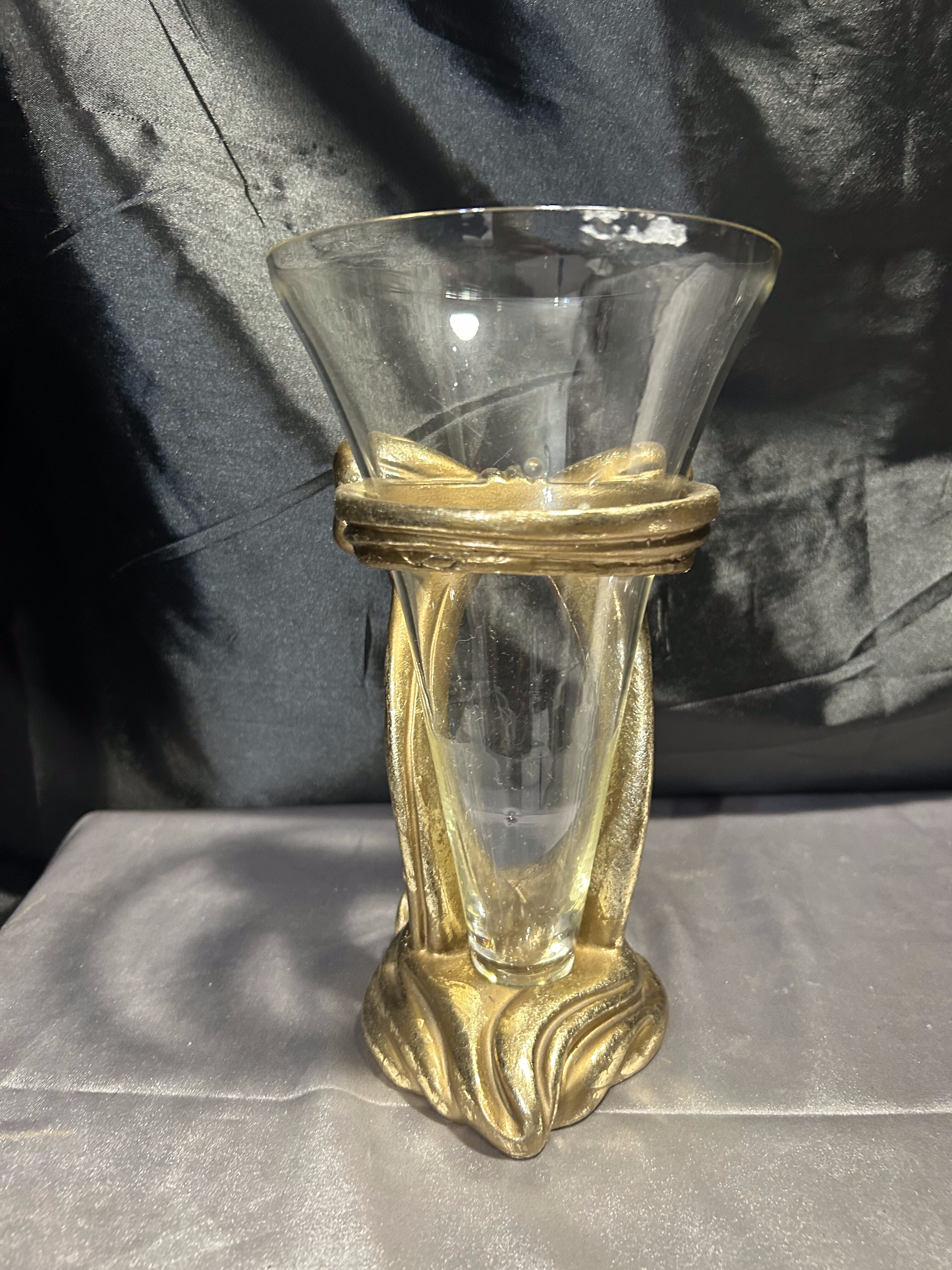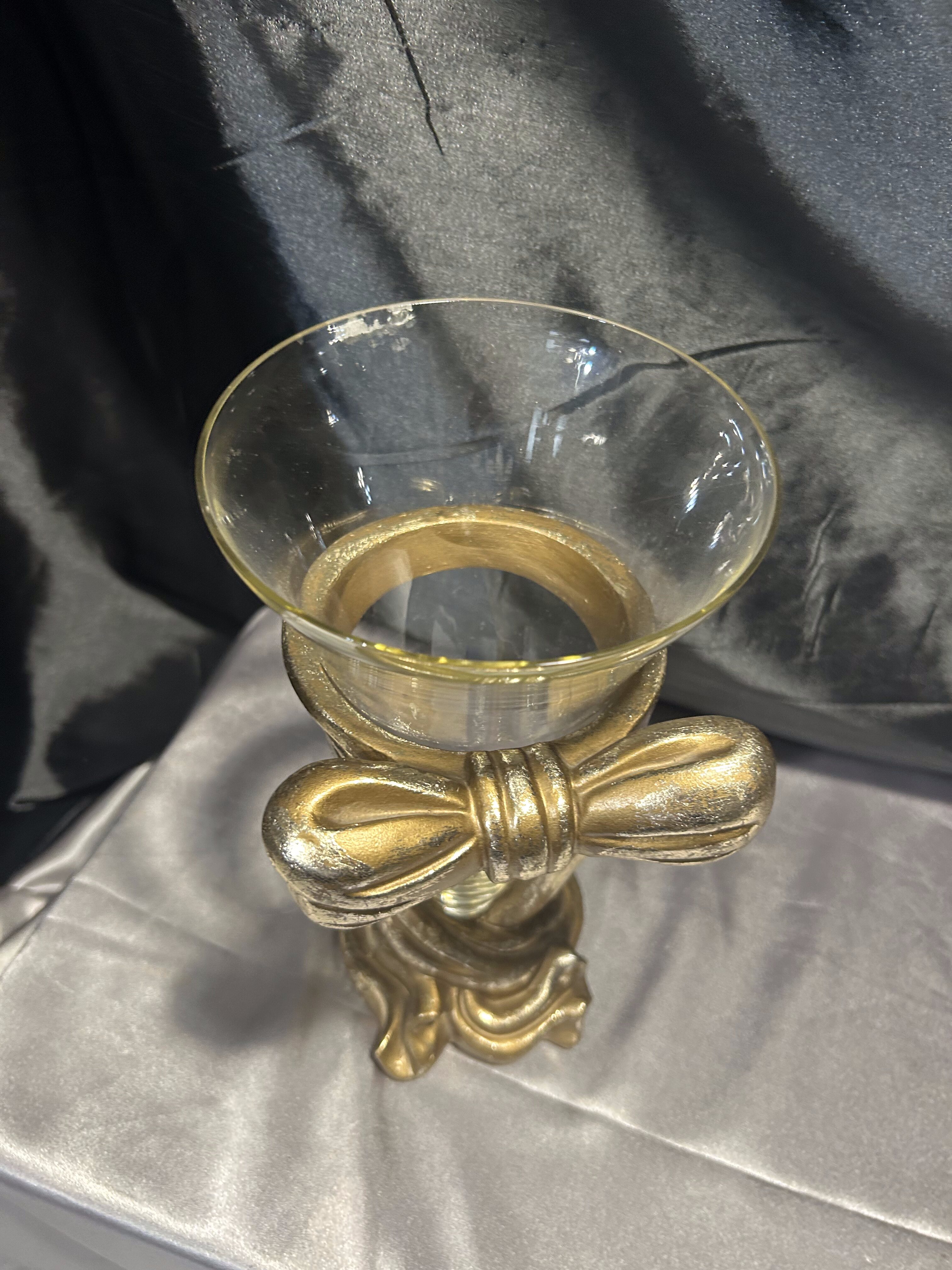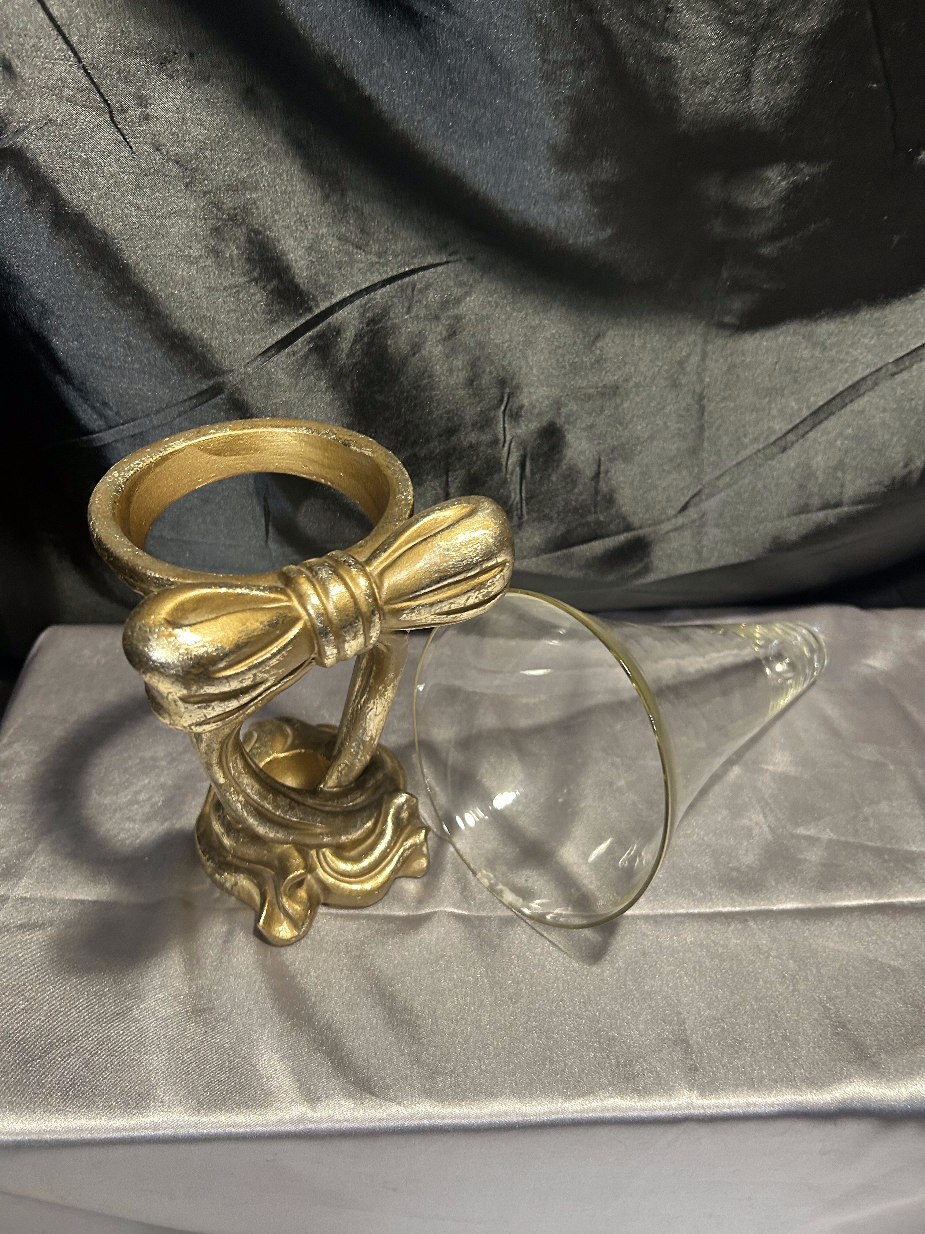 Na sprzedaż elegancki szklany flakon osadzony w dekoracyjnym metalowym stelażu, ozdobiony subtelną kokardką. Delikatny i romantyczny design czyni z niego wyjątkowy element wystroju wnętrza – idealny na świeże kwiaty, gałązki lub jako samodzielna dekoracja.