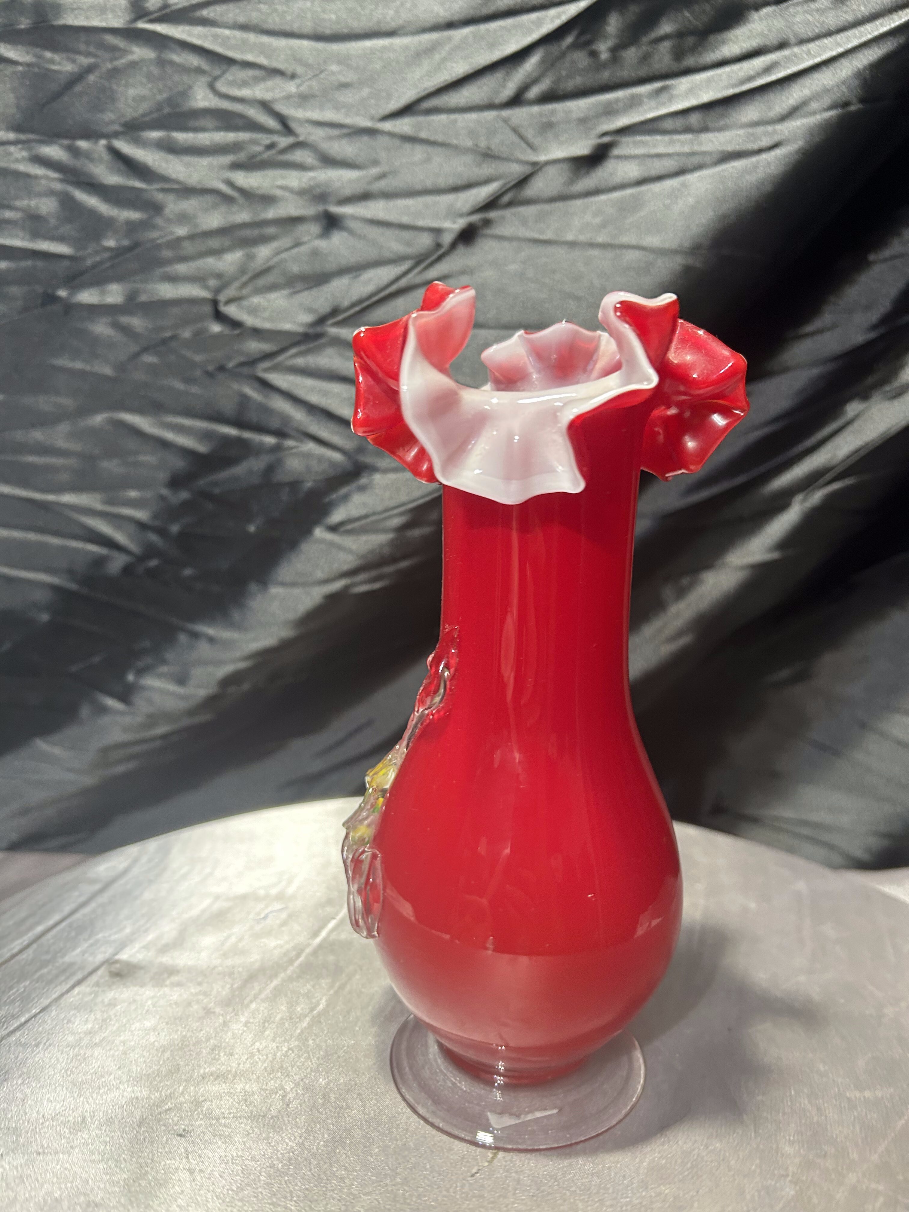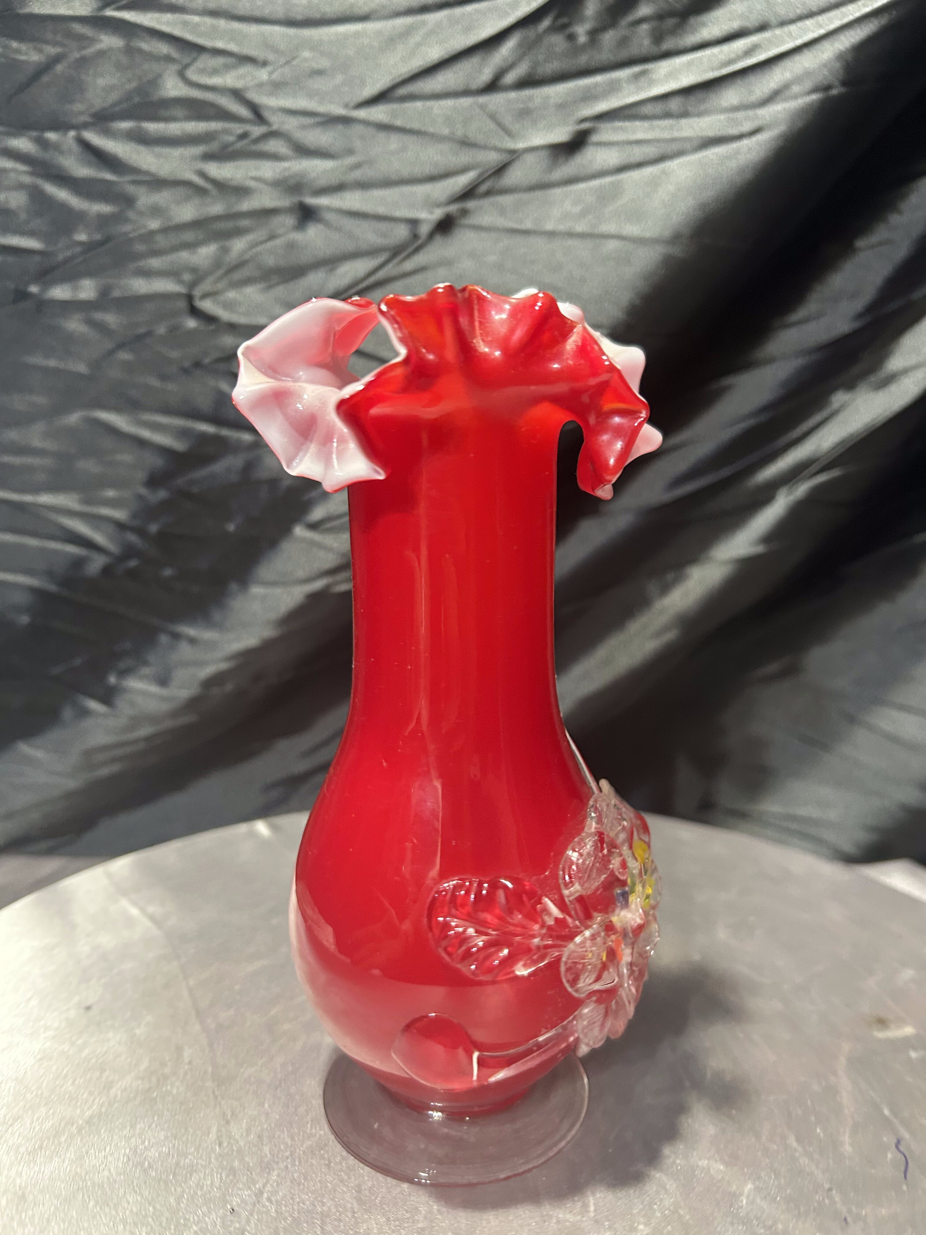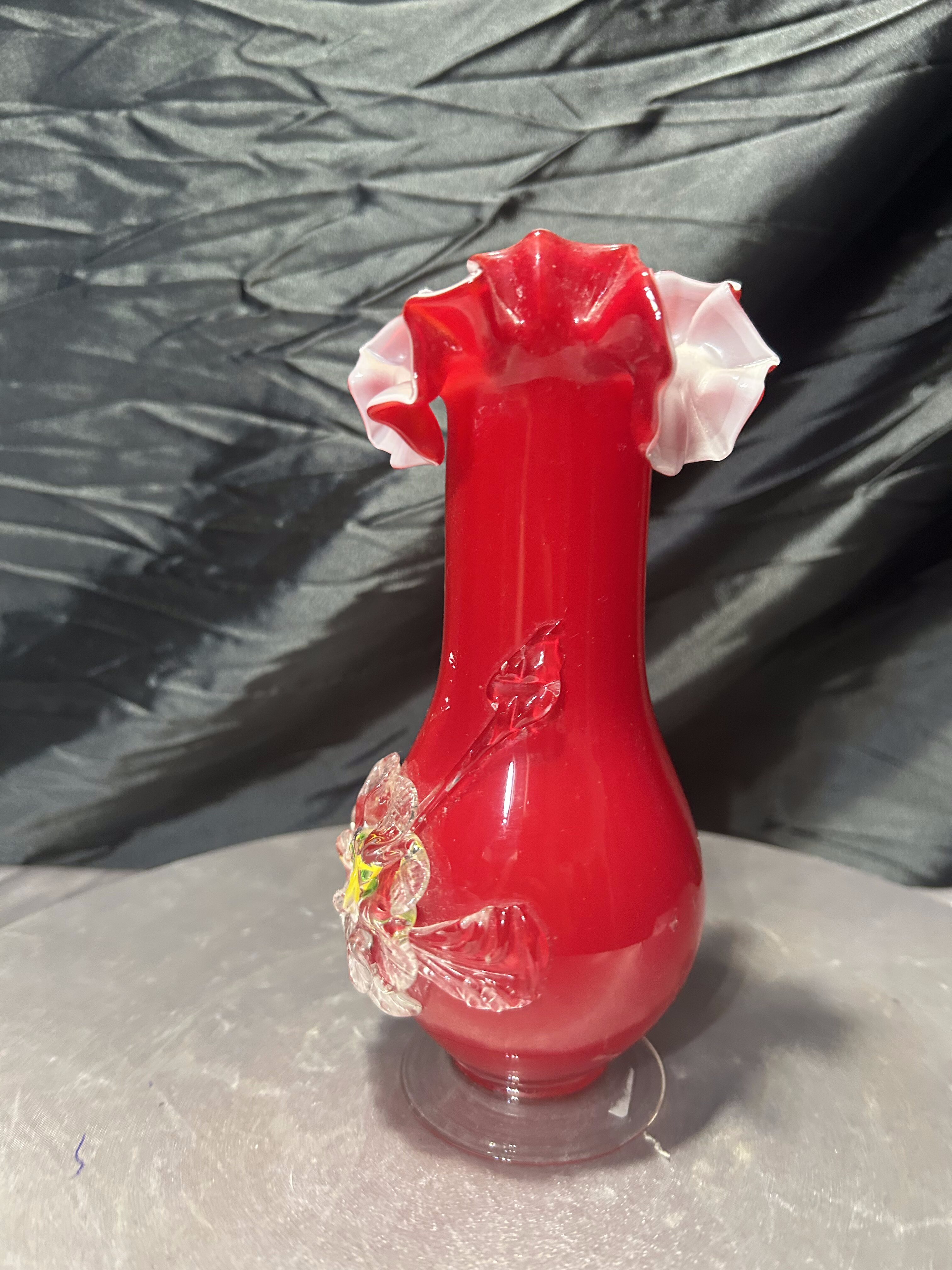 - Flakon wazon szklany – czerwone szkło artystyczne – dekoracyjna falbanka