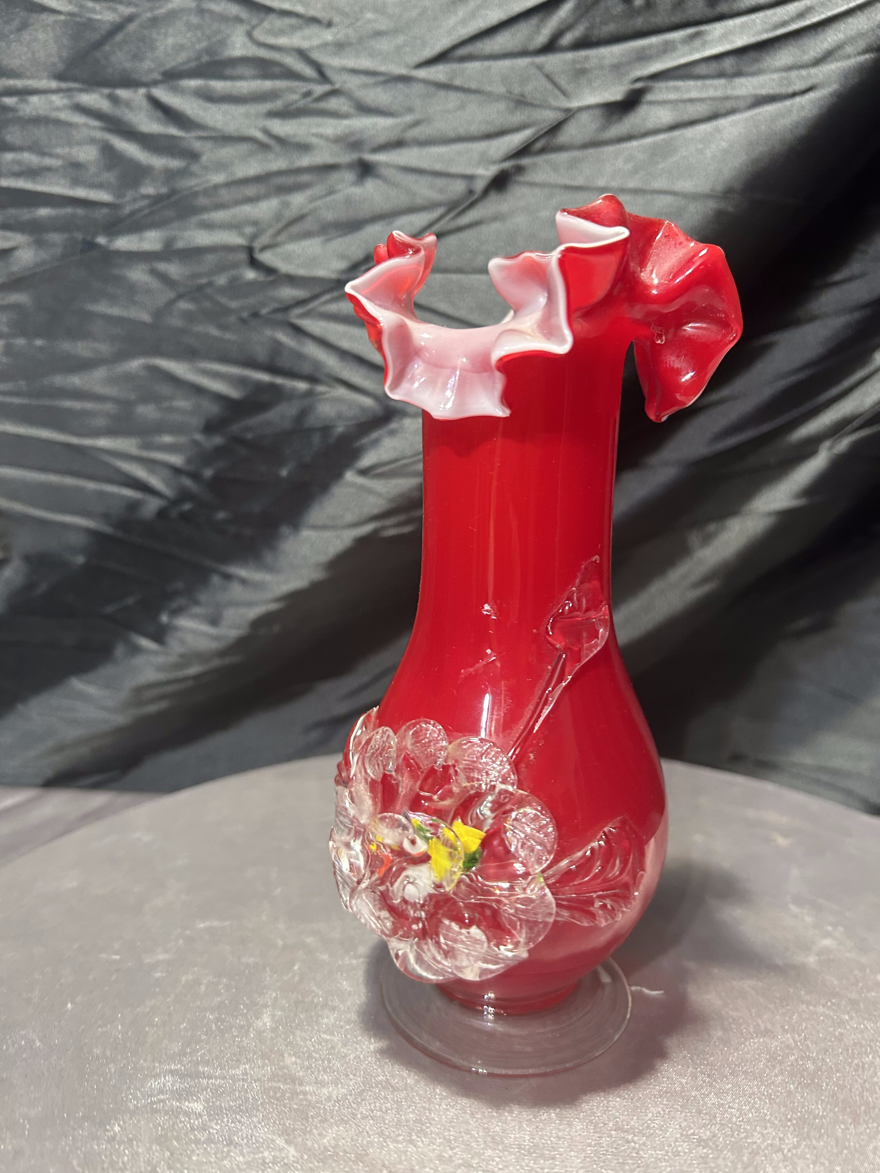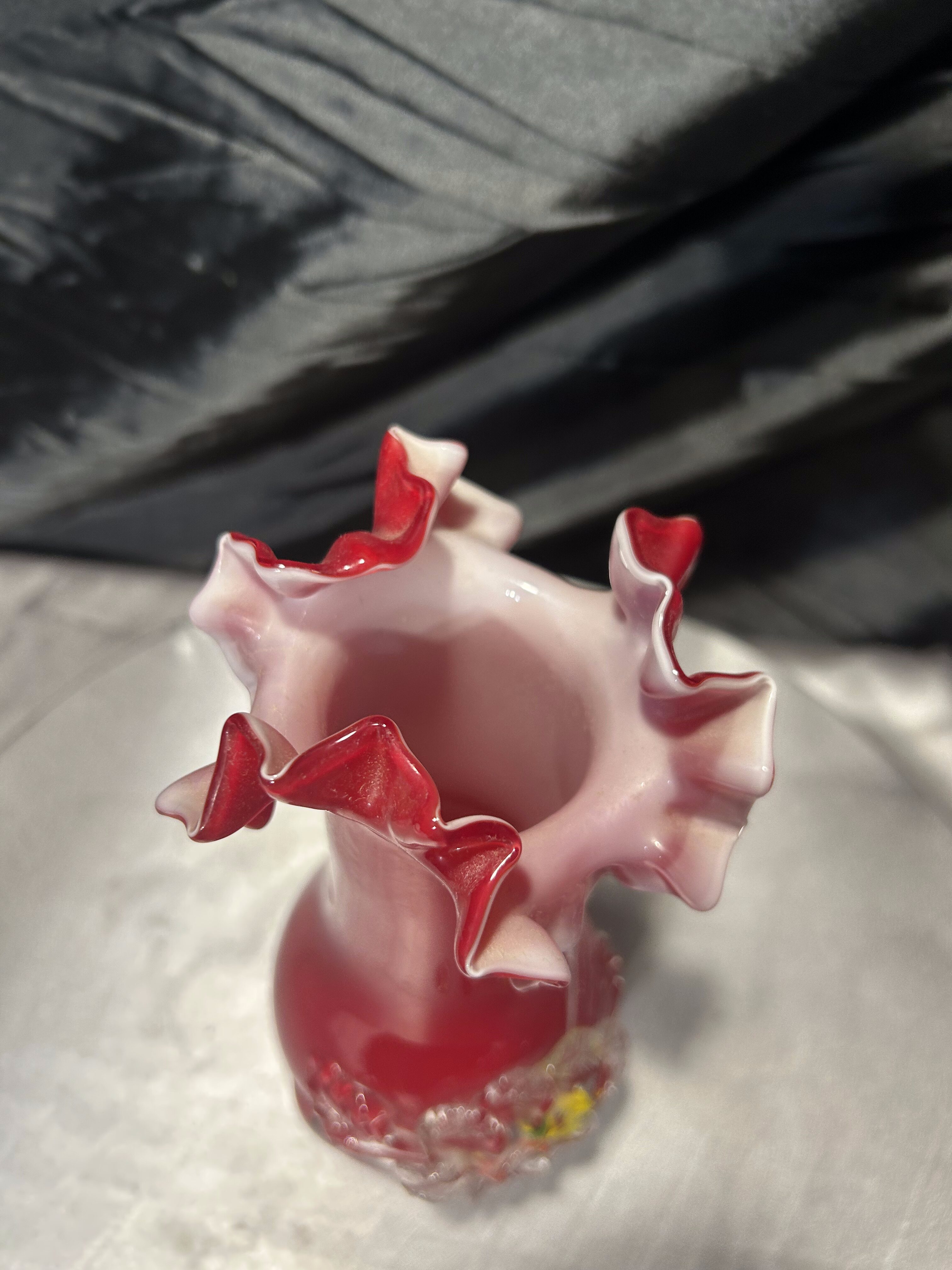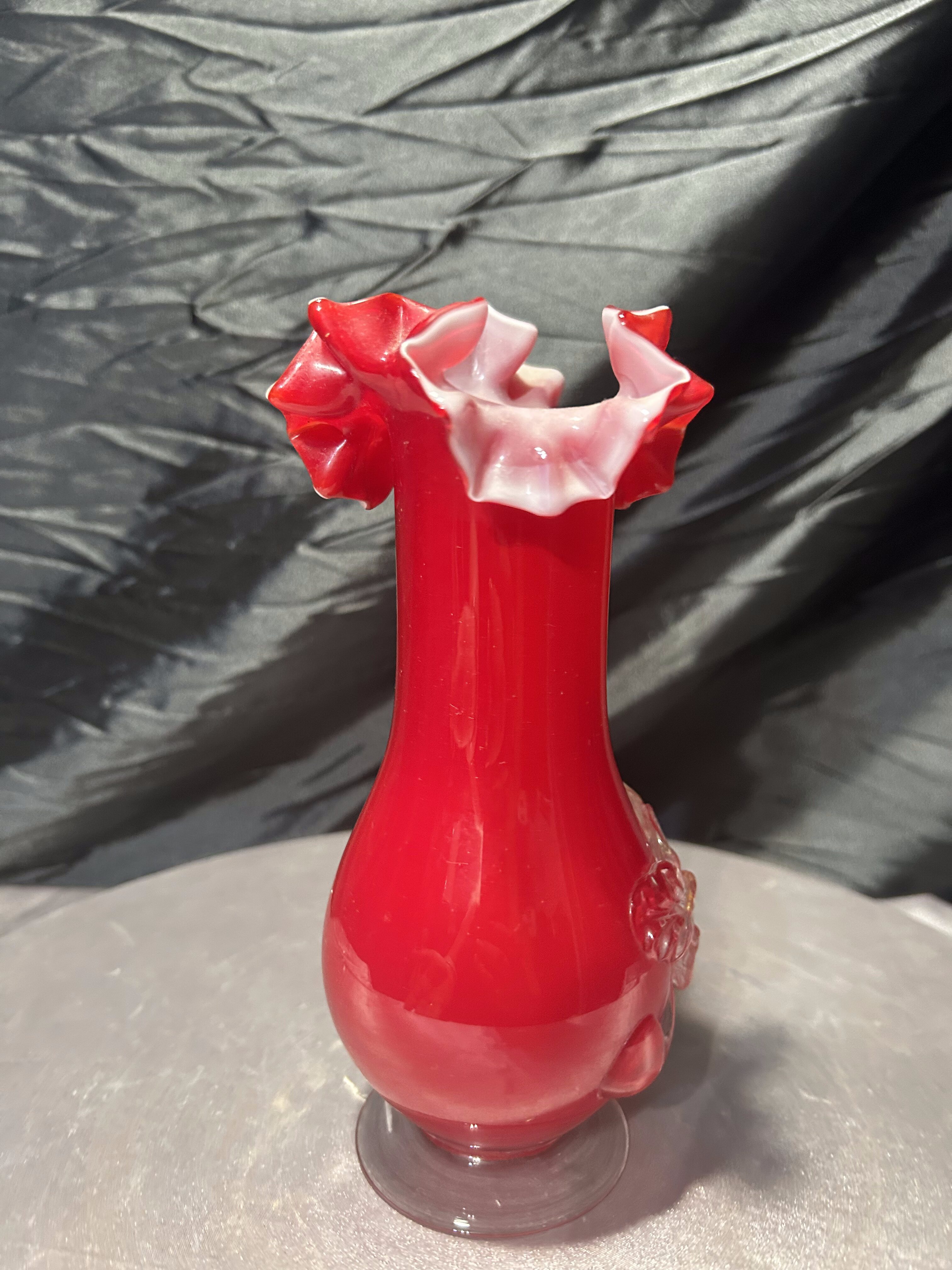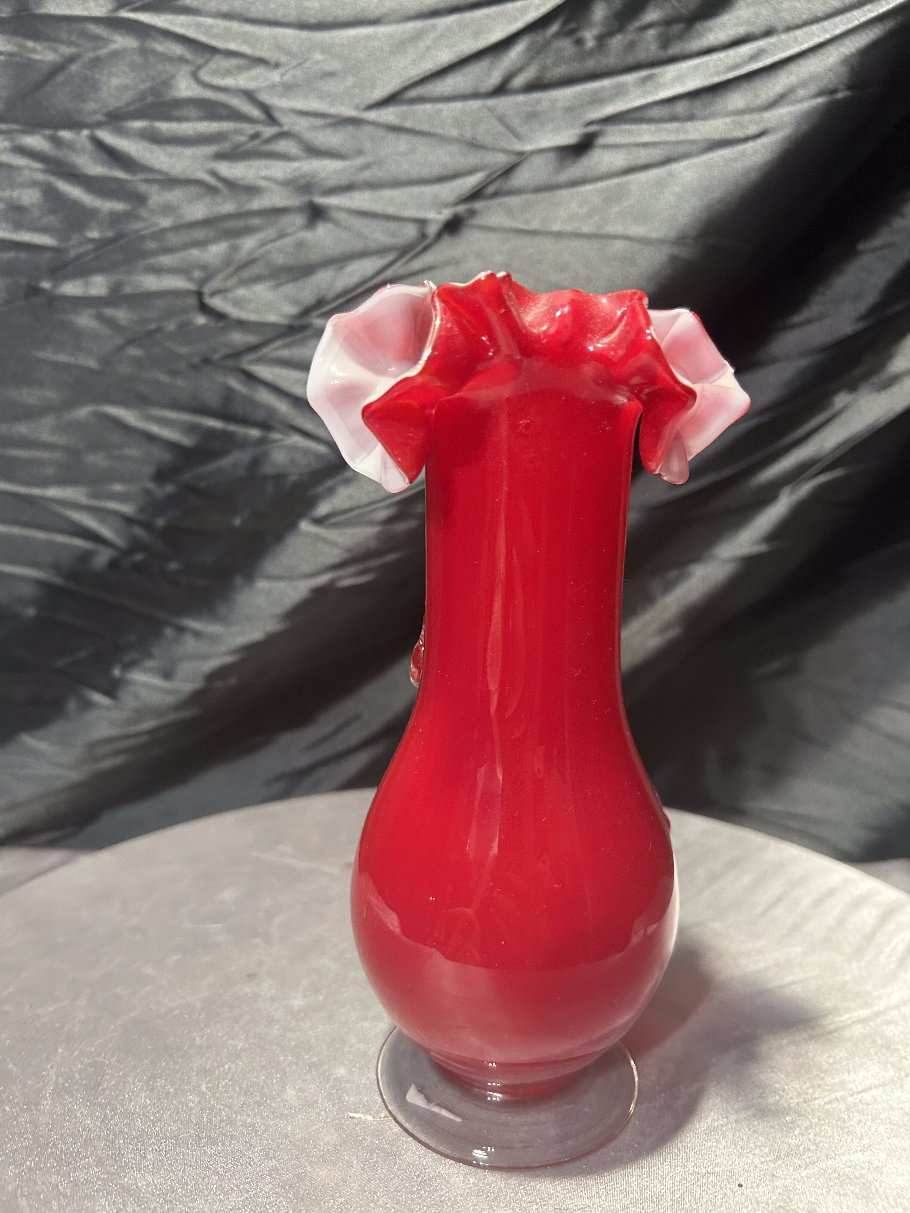- Flakon wazon szklany – czerwone szkło artystyczne – dekoracyjna falbanka