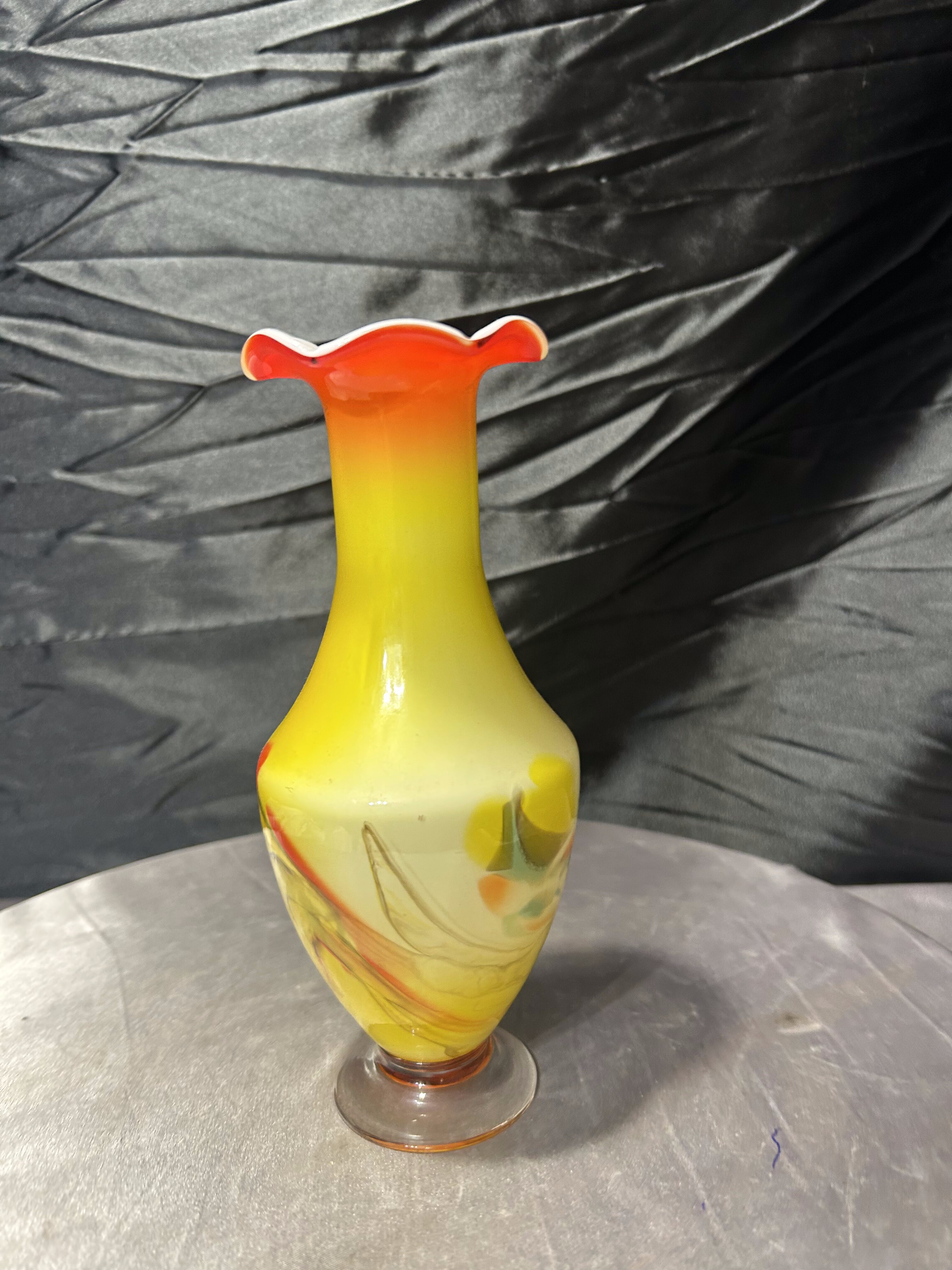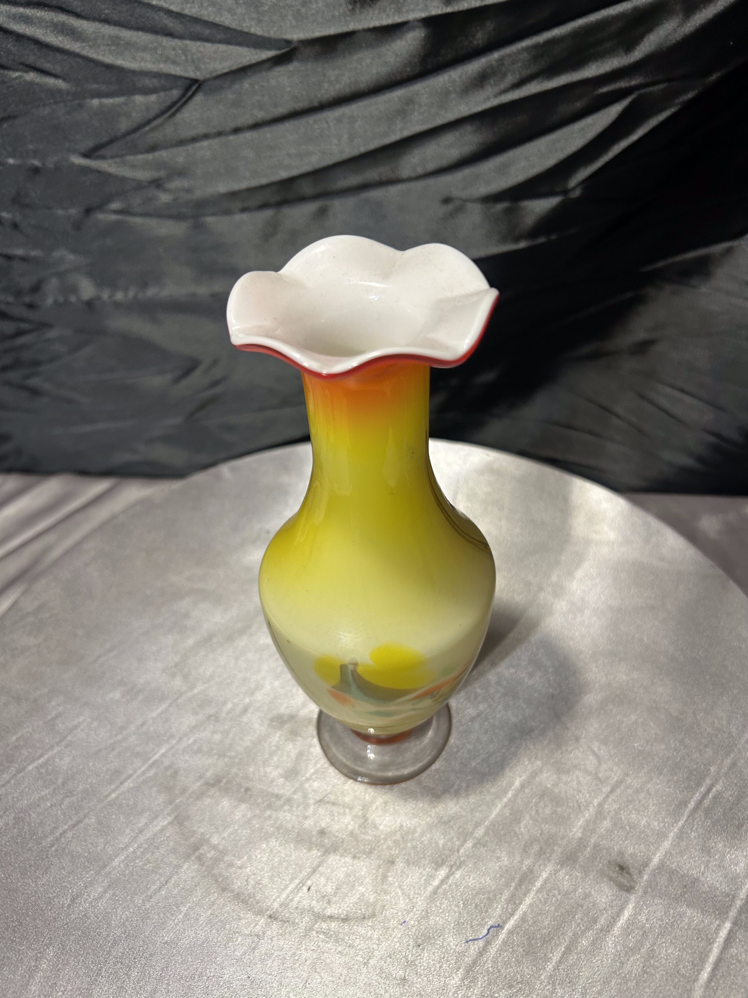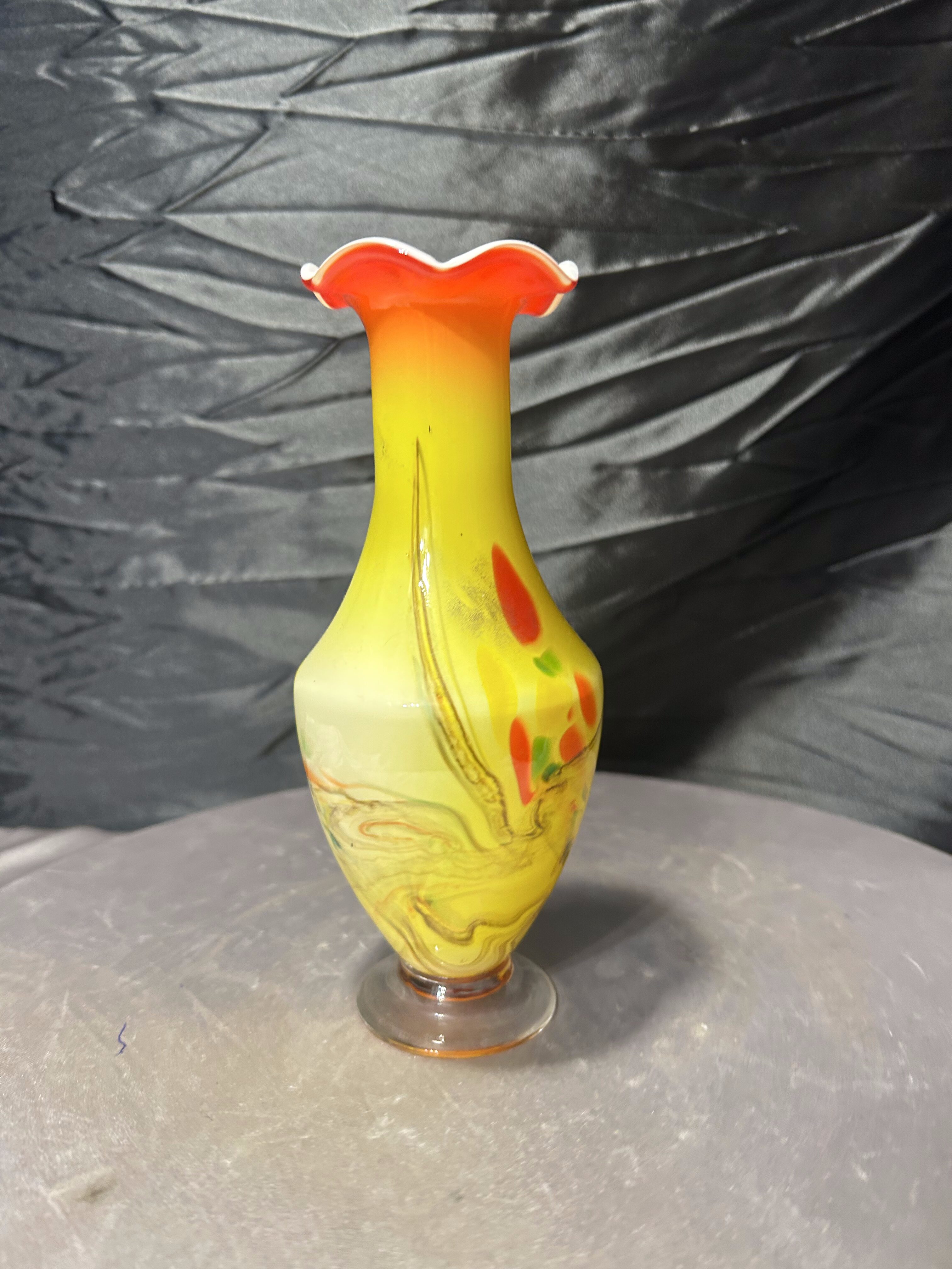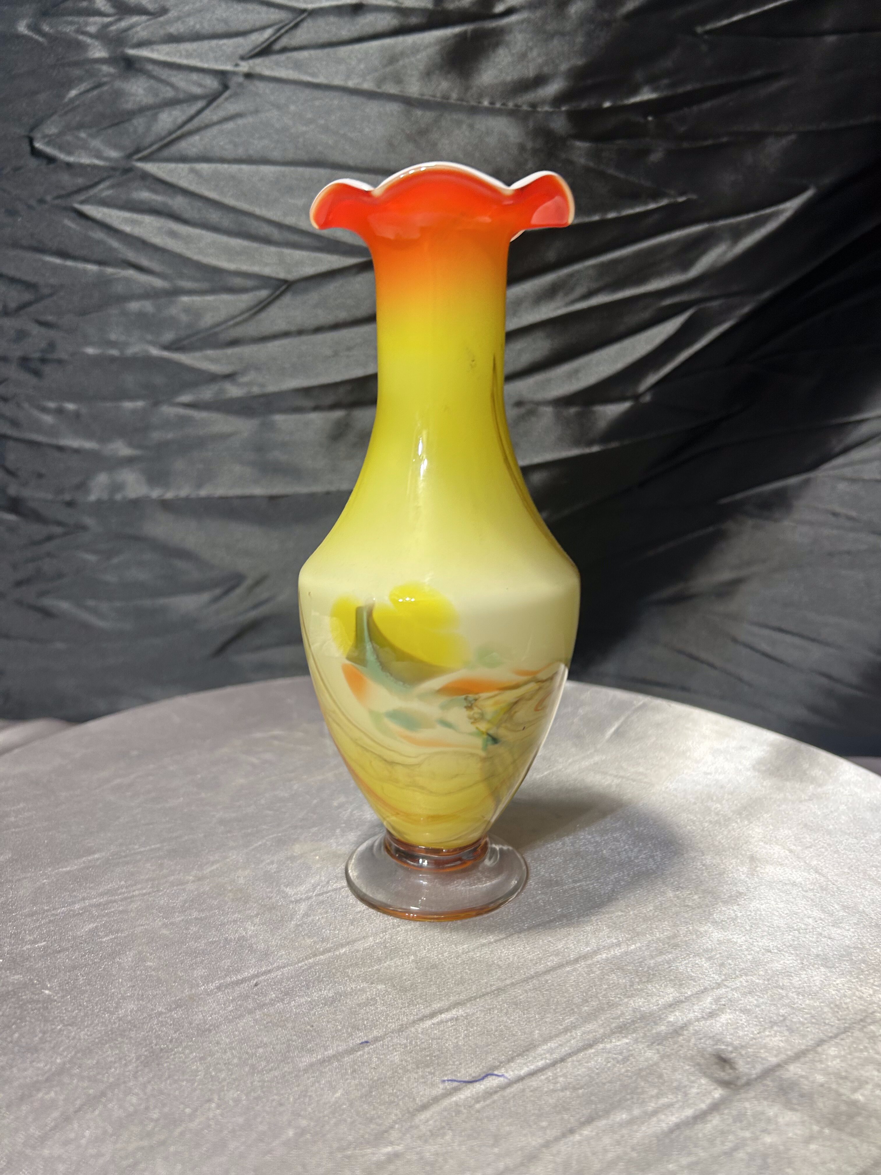 - Flakon / wazon – szkło artystyczne – żółto-pomarańczowy gradient – falbanka