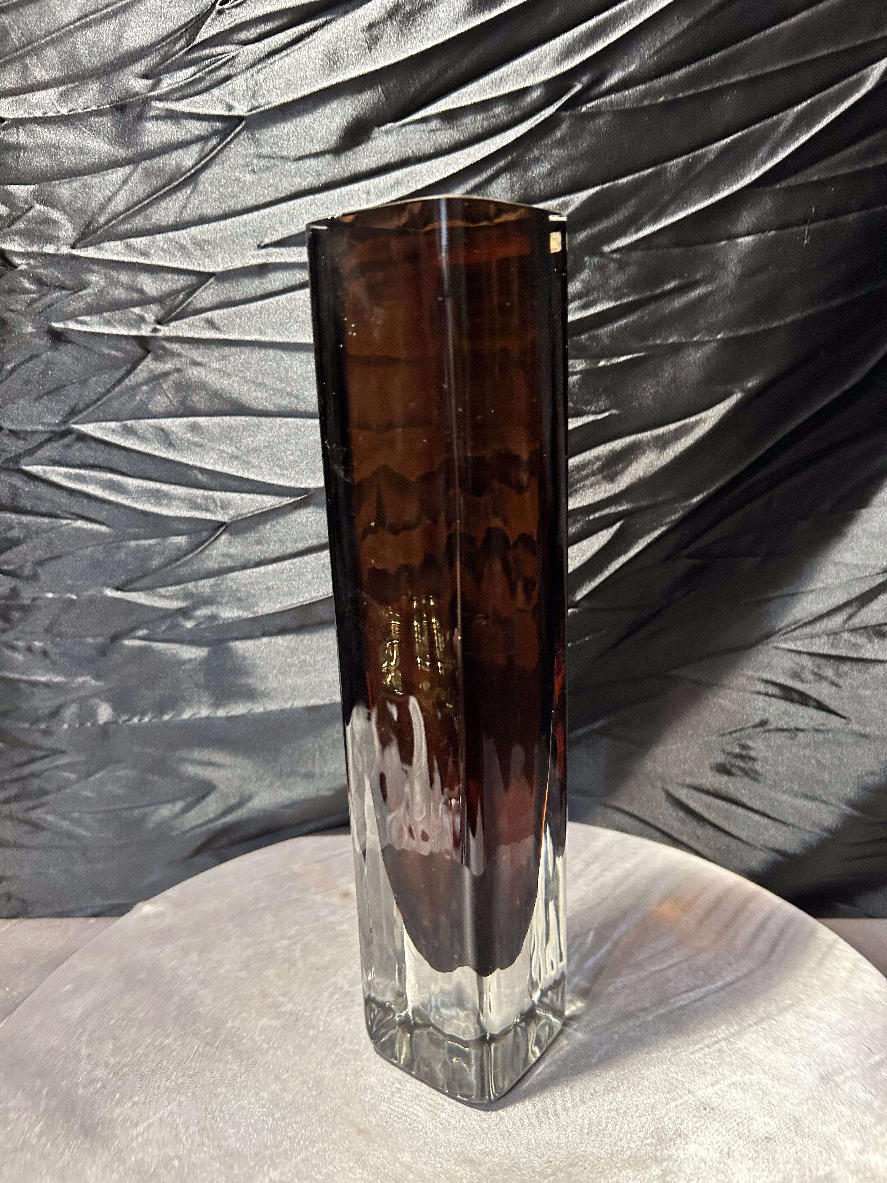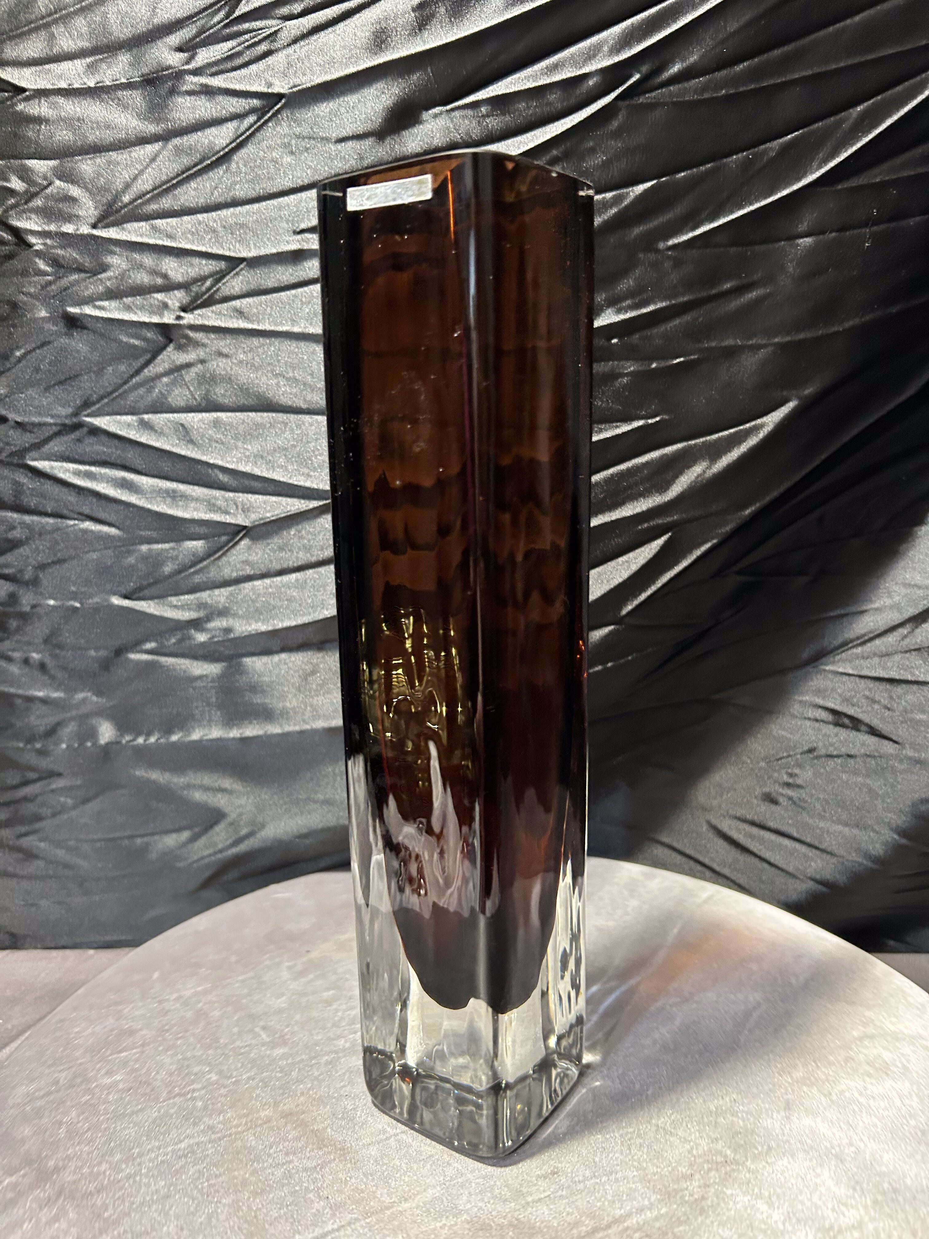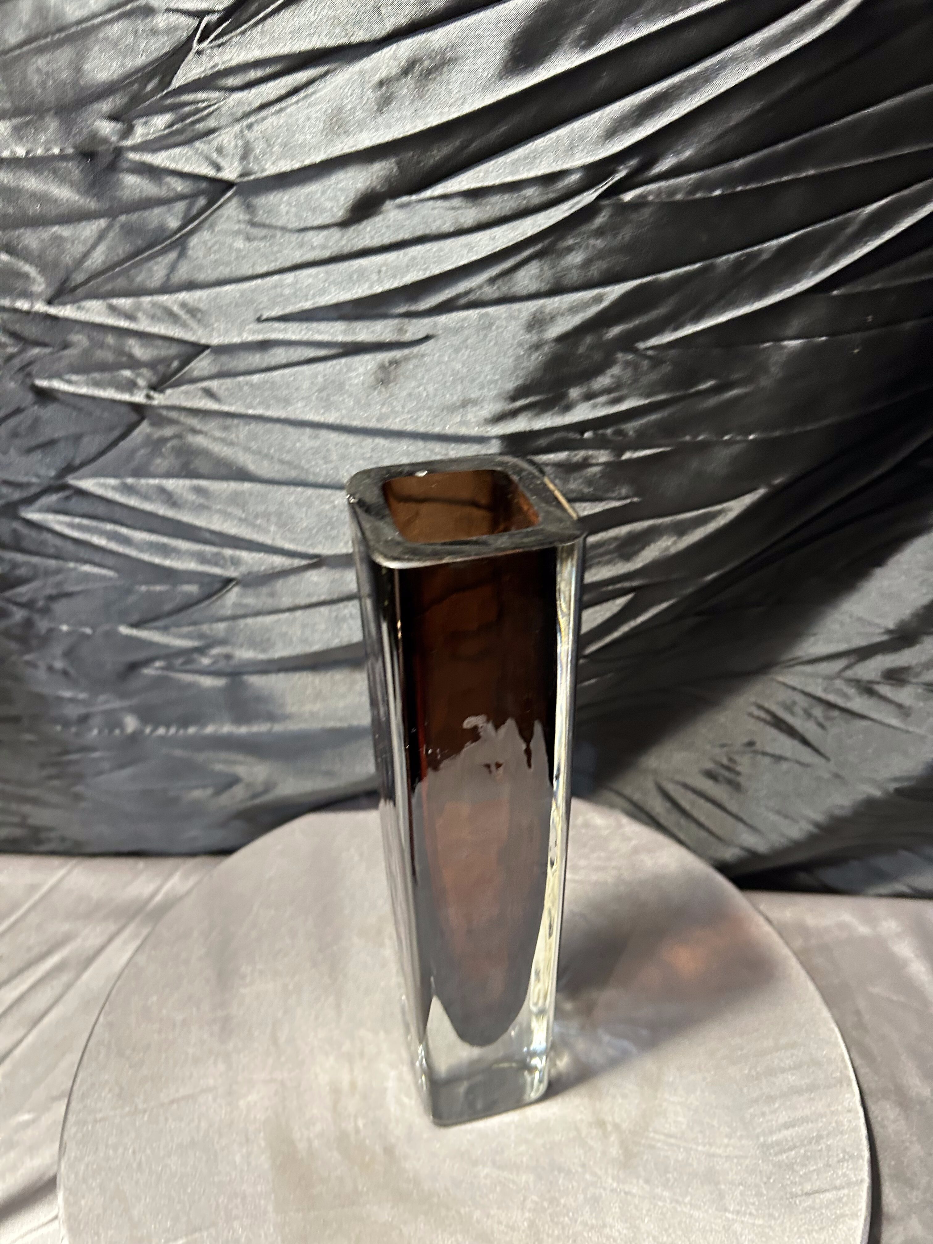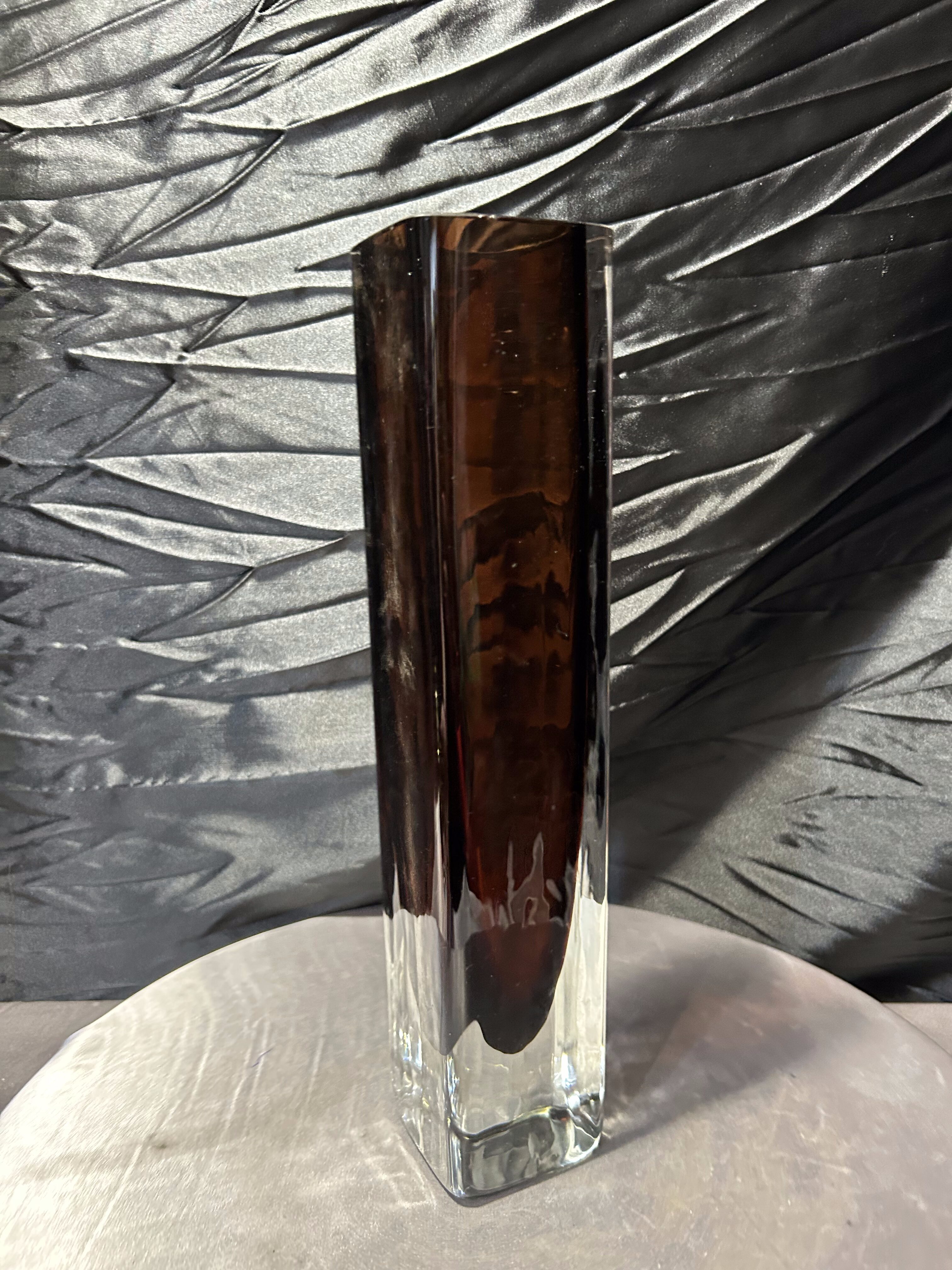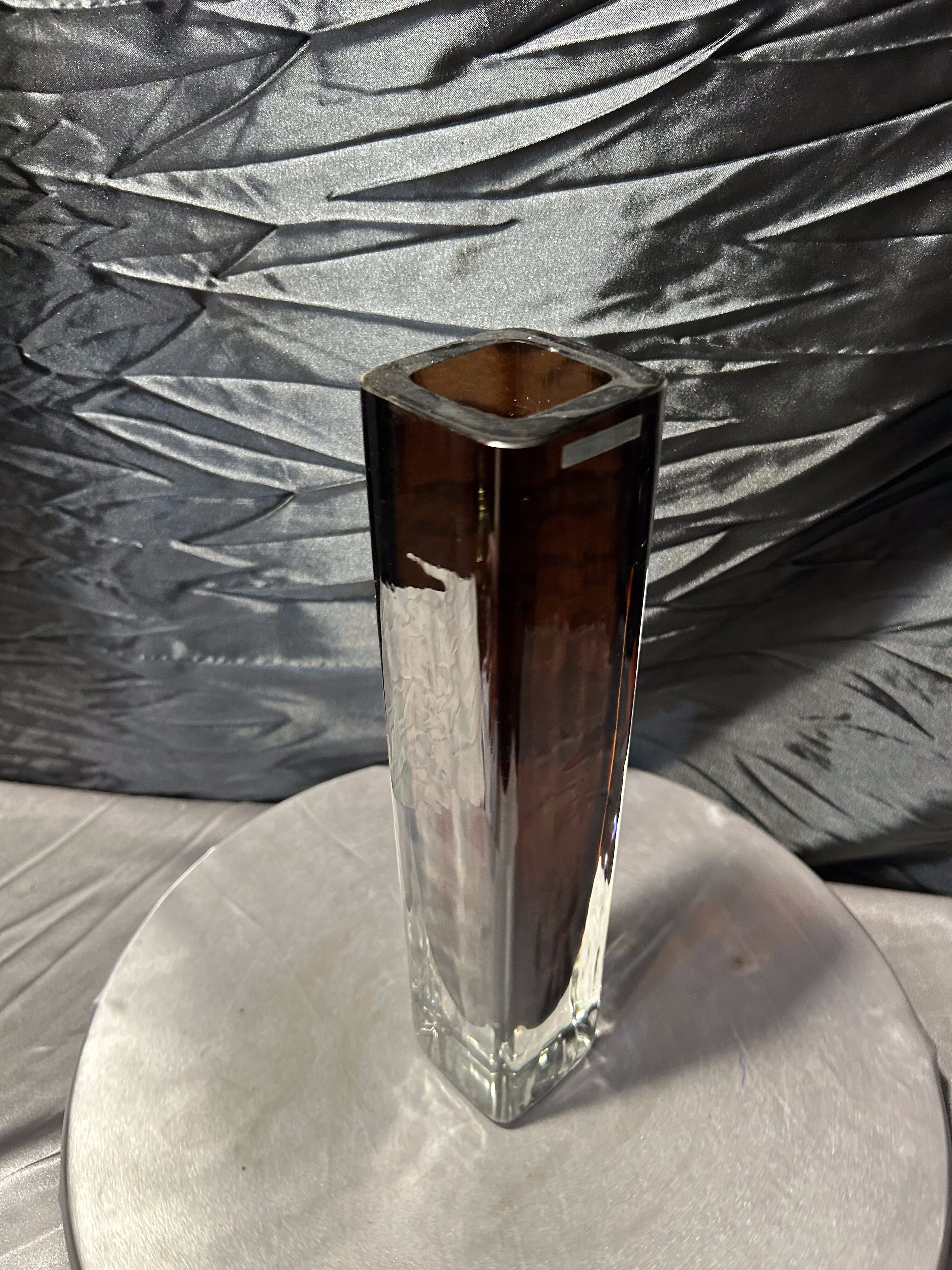 Okazały flakon wykonany z grubego szkła artystycznego o głębokim, eleganckim brązowym odcieniu. Forma wazonu jest smukła i geometryczna – kwadratowy przekrój oraz wysoka sylwetka nadają mu nowoczesnego, a zarazem ponadczasowego charakteru.