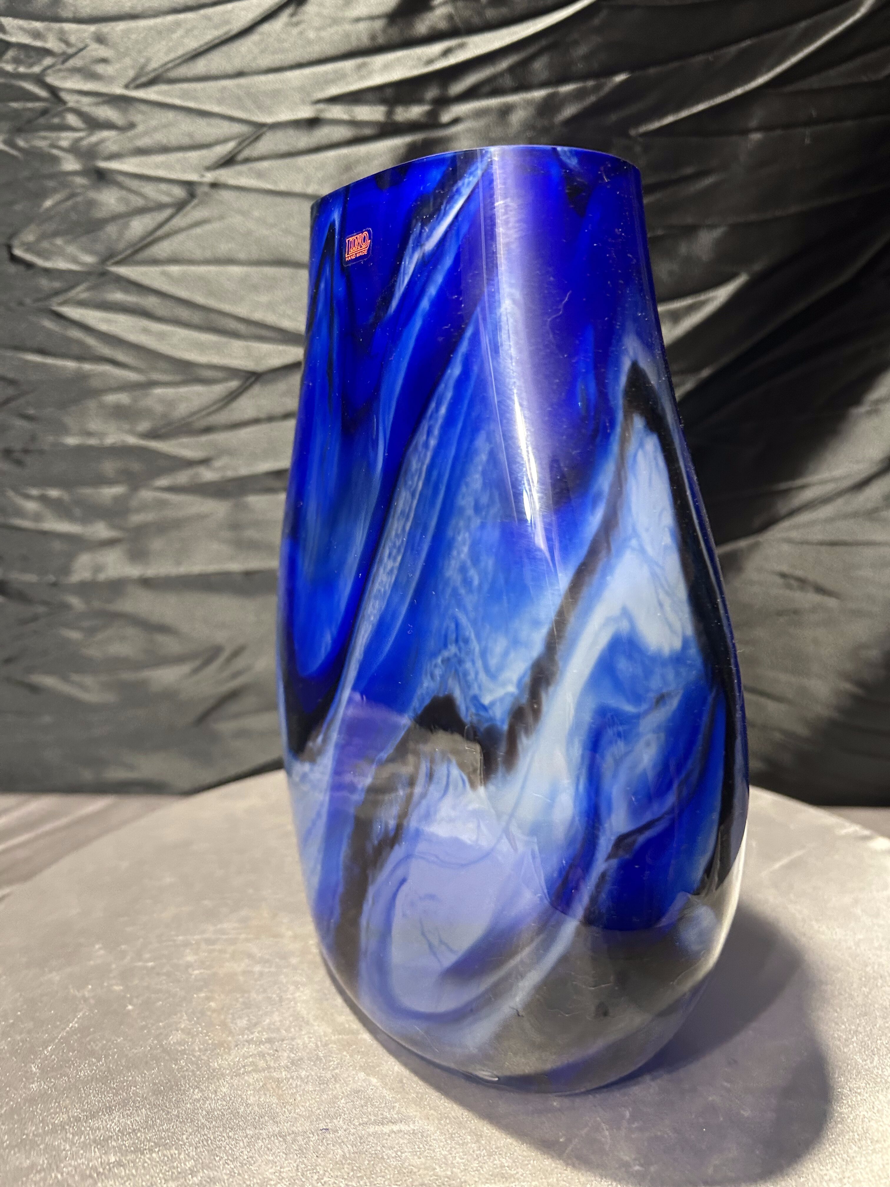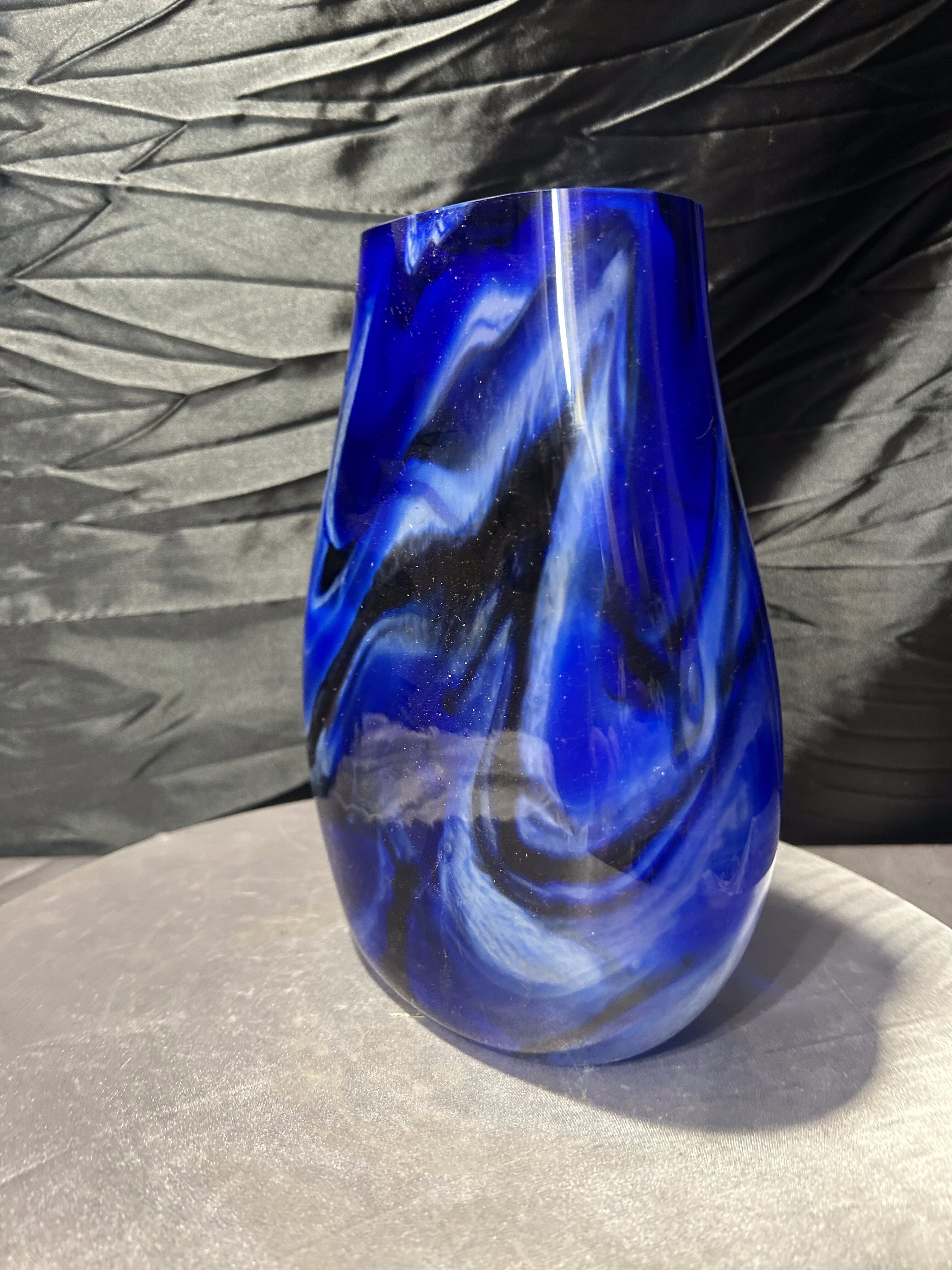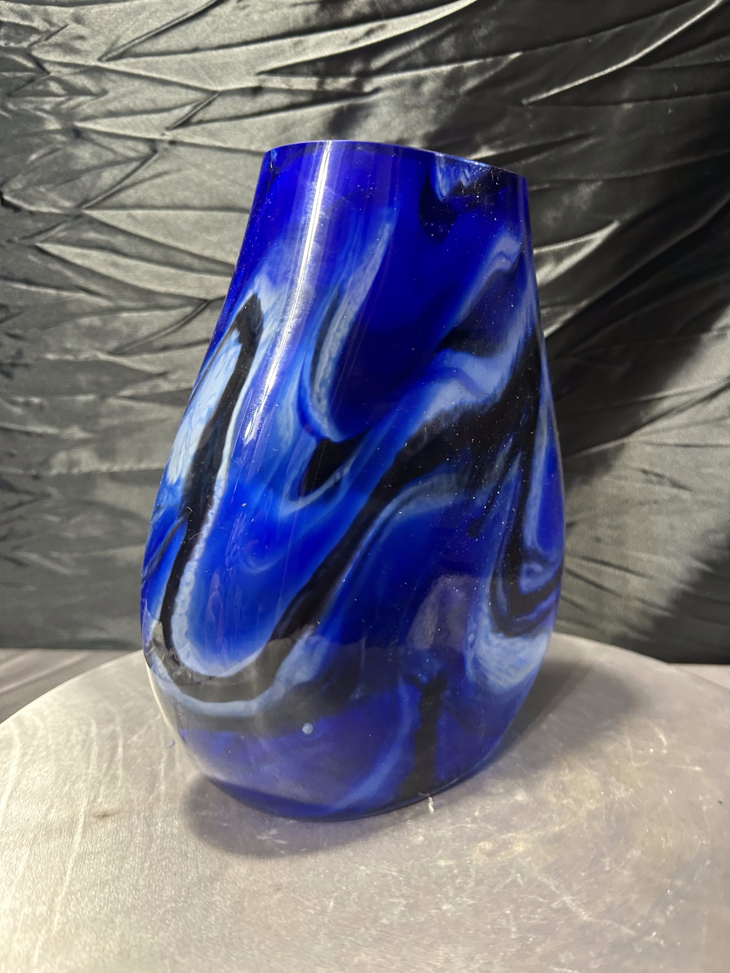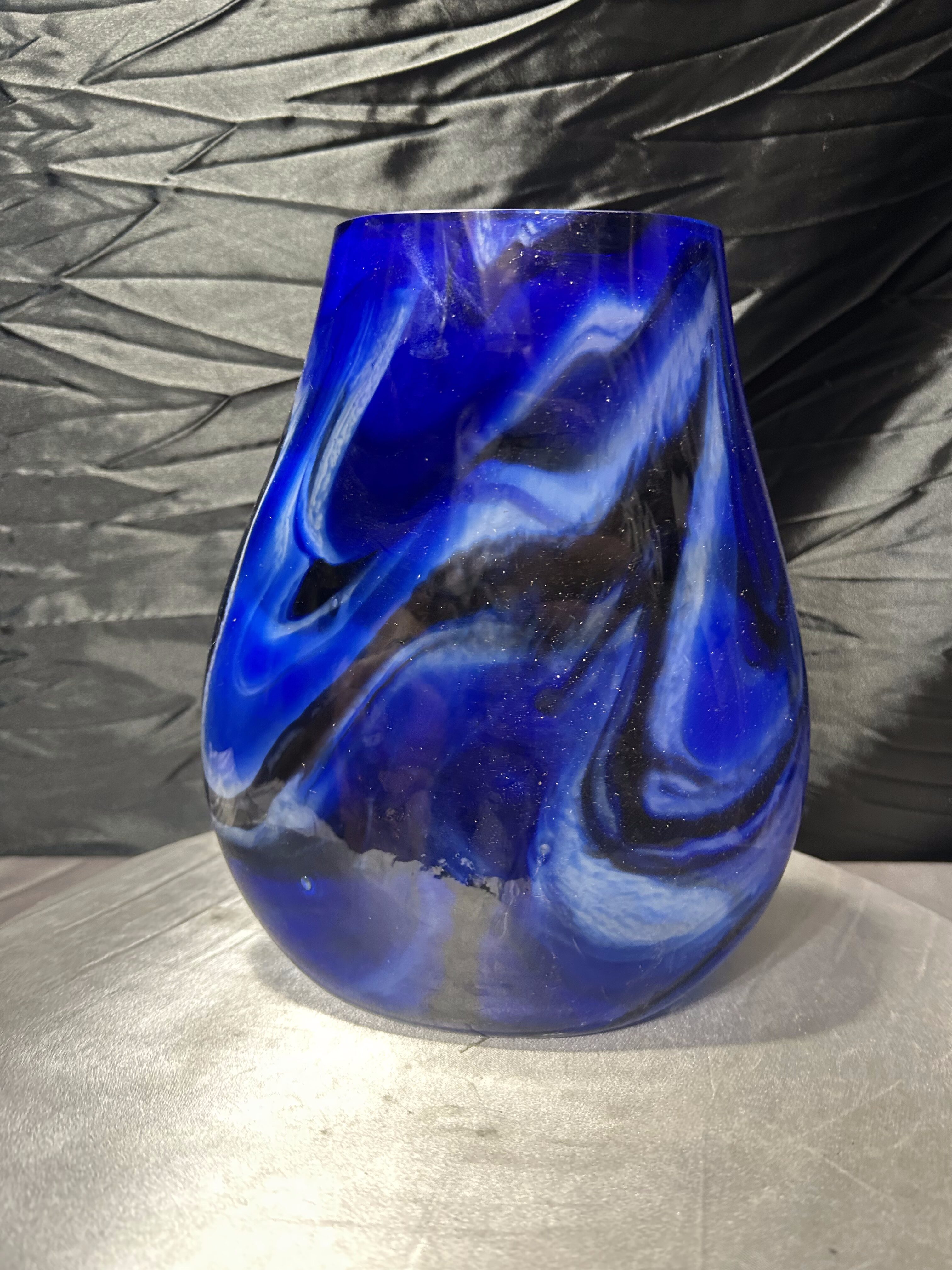 Efektowny flakon–wazon wykonany ze szkła artystycznego w intensywnym, głębokim odcieniu kobaltu z dynamicznymi, mleczno-czarnymi smugami. Forma miękka, organiczna, o wyraźnie rzeźbiarskim charakterze – każdy egzemplarz tego typu jest niepowtarzalny. Przedmiot przyciąga uwagę zarówno kolorem, jak i grą światła w masie szkła.