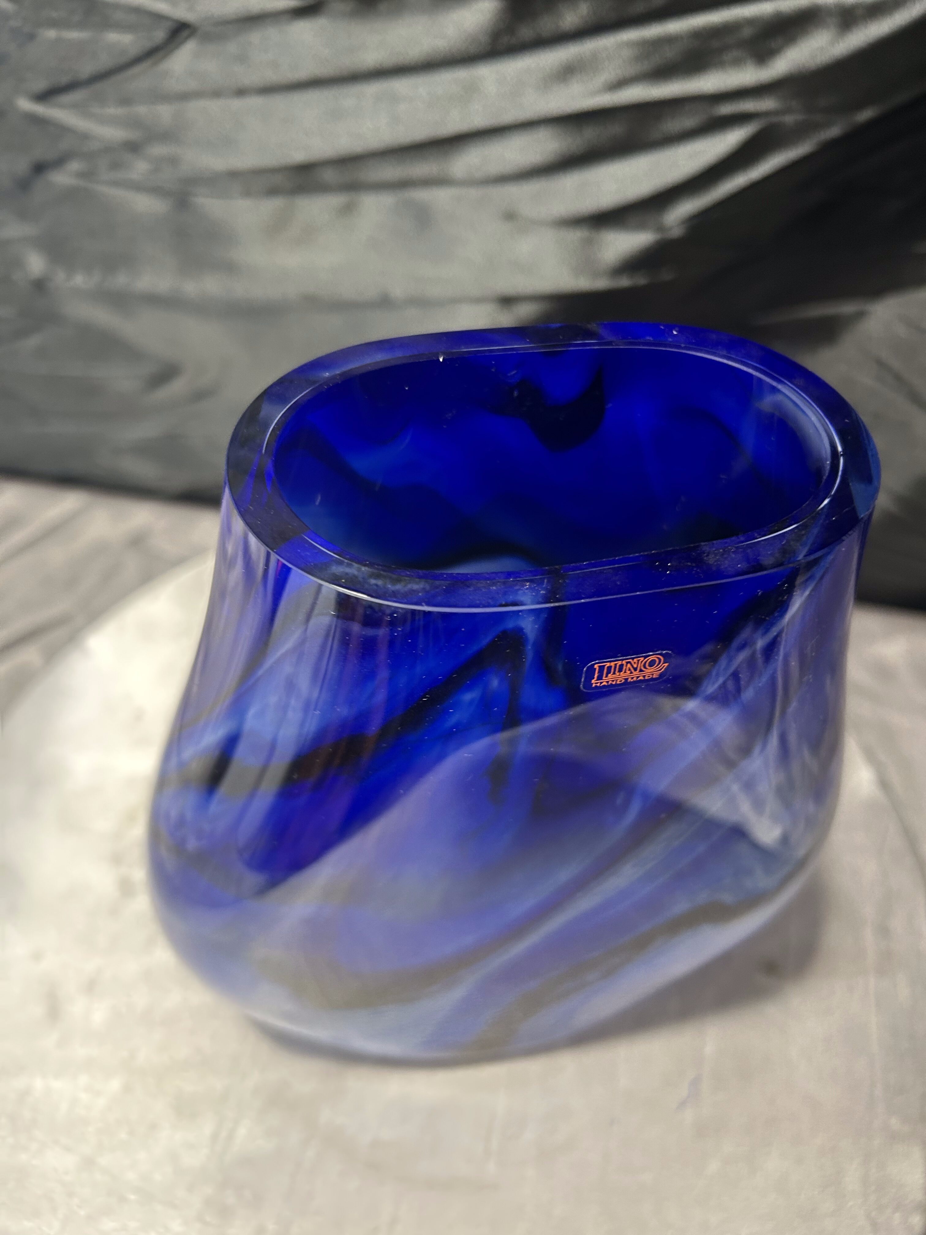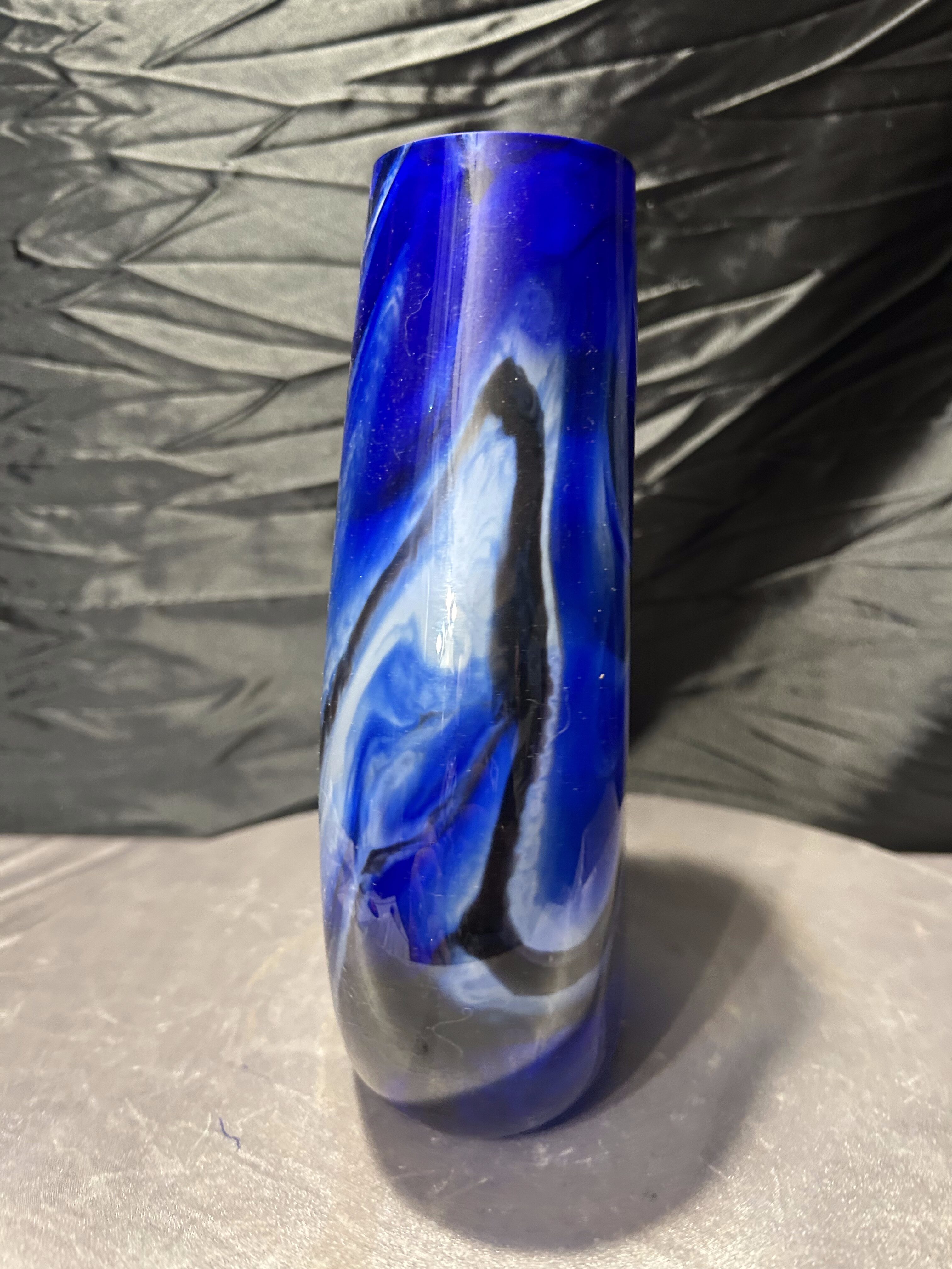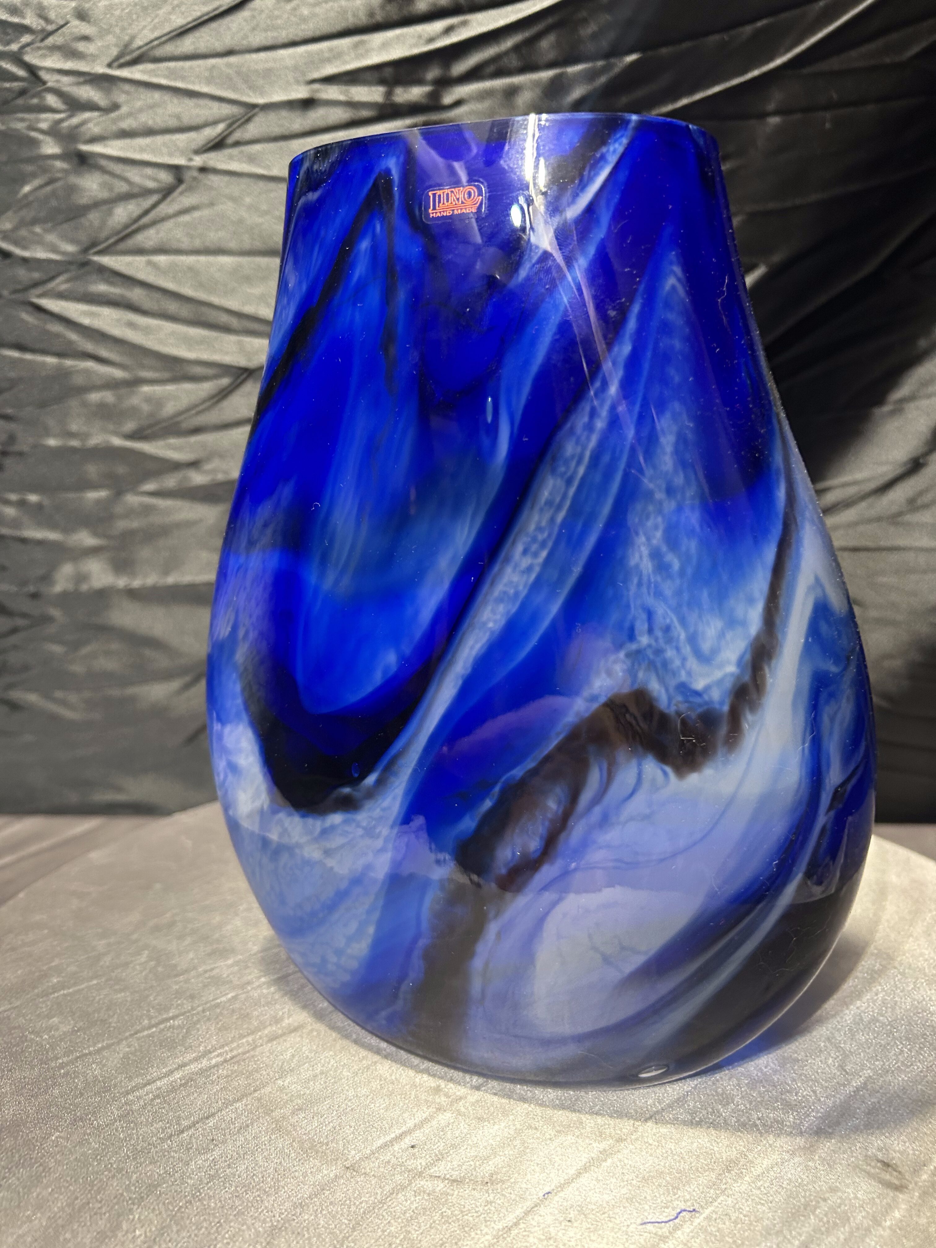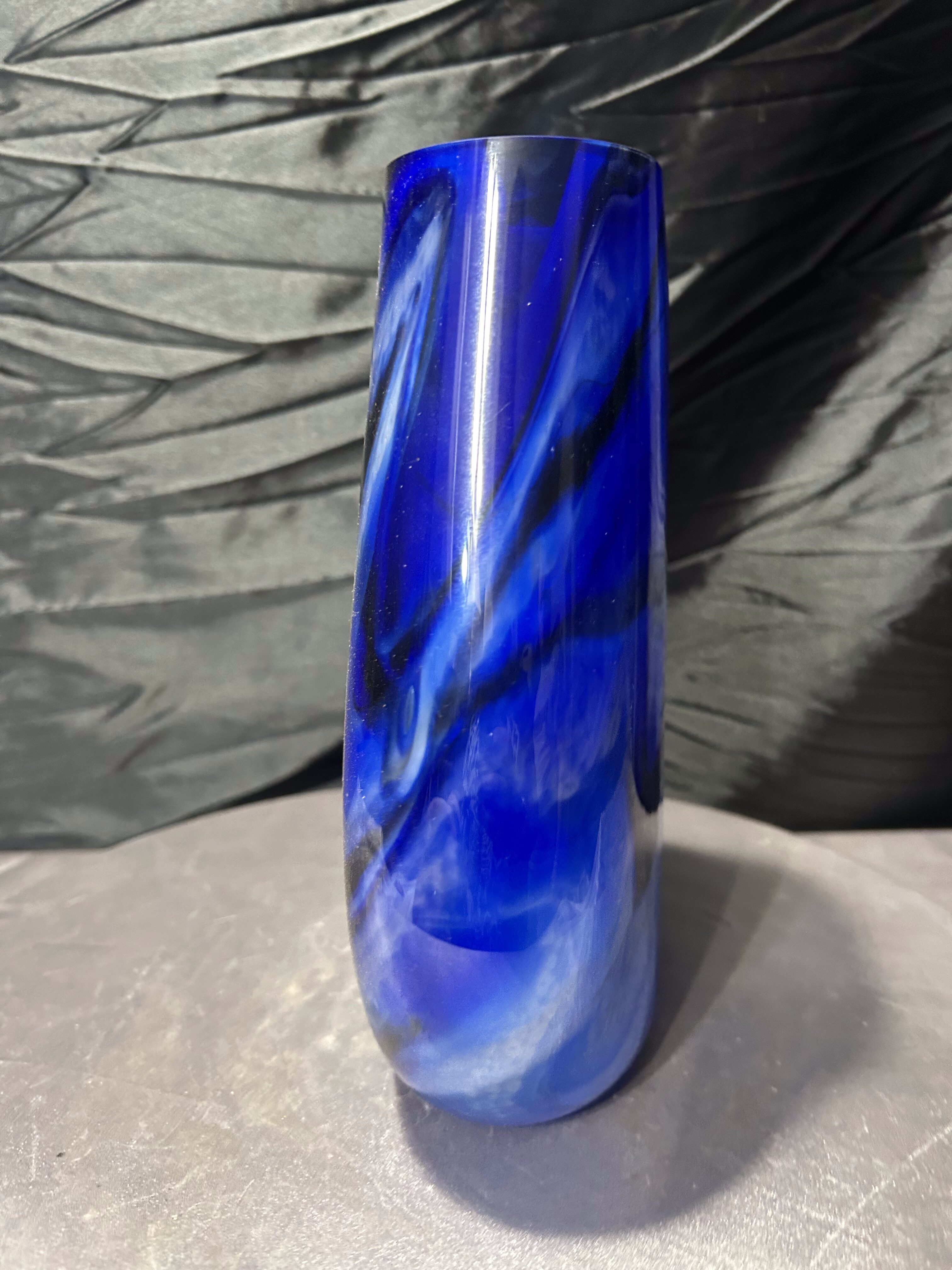 Efektowny flakon–wazon wykonany ze szkła artystycznego w intensywnym, głębokim odcieniu kobaltu z dynamicznymi, mleczno-czarnymi smugami. Forma miękka, organiczna, o wyraźnie rzeźbiarskim charakterze – każdy egzemplarz tego typu jest niepowtarzalny. Przedmiot przyciąga uwagę zarówno kolorem, jak i grą światła w masie szkła.