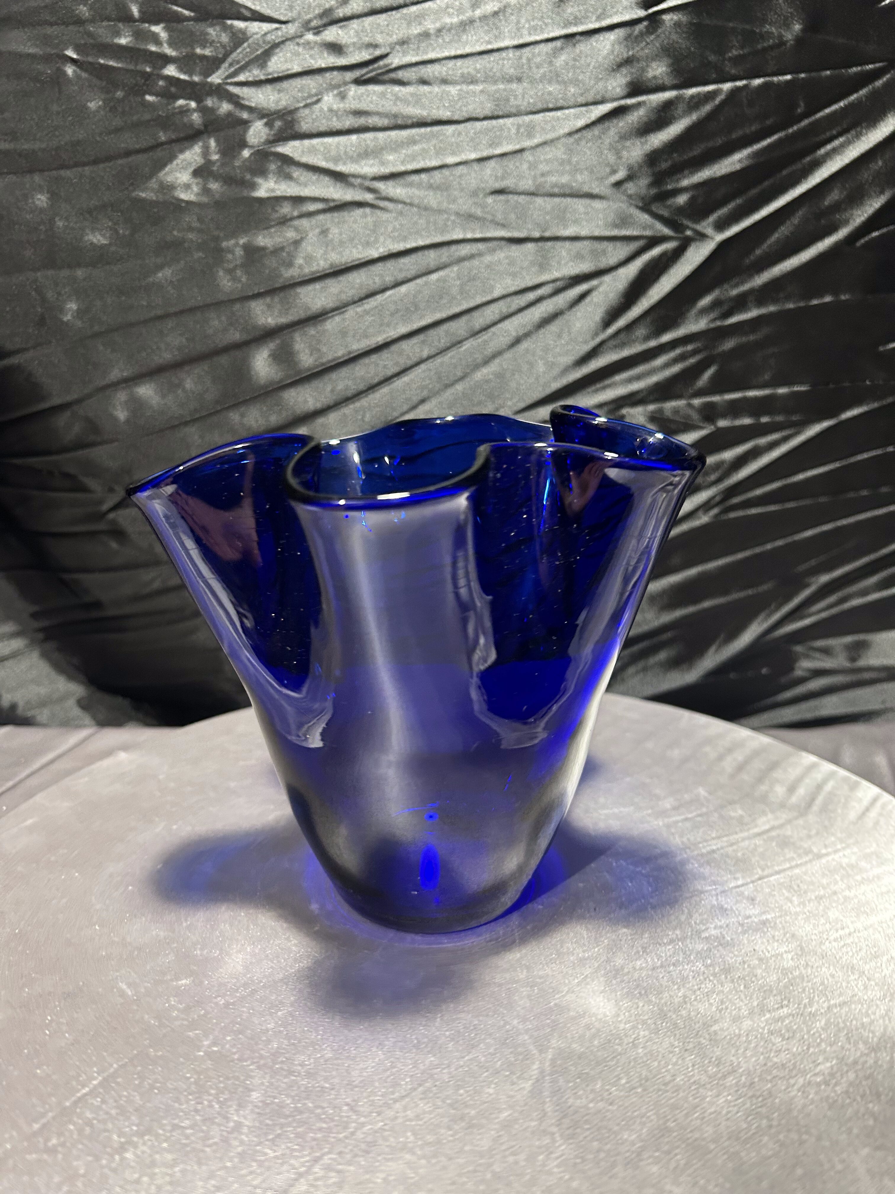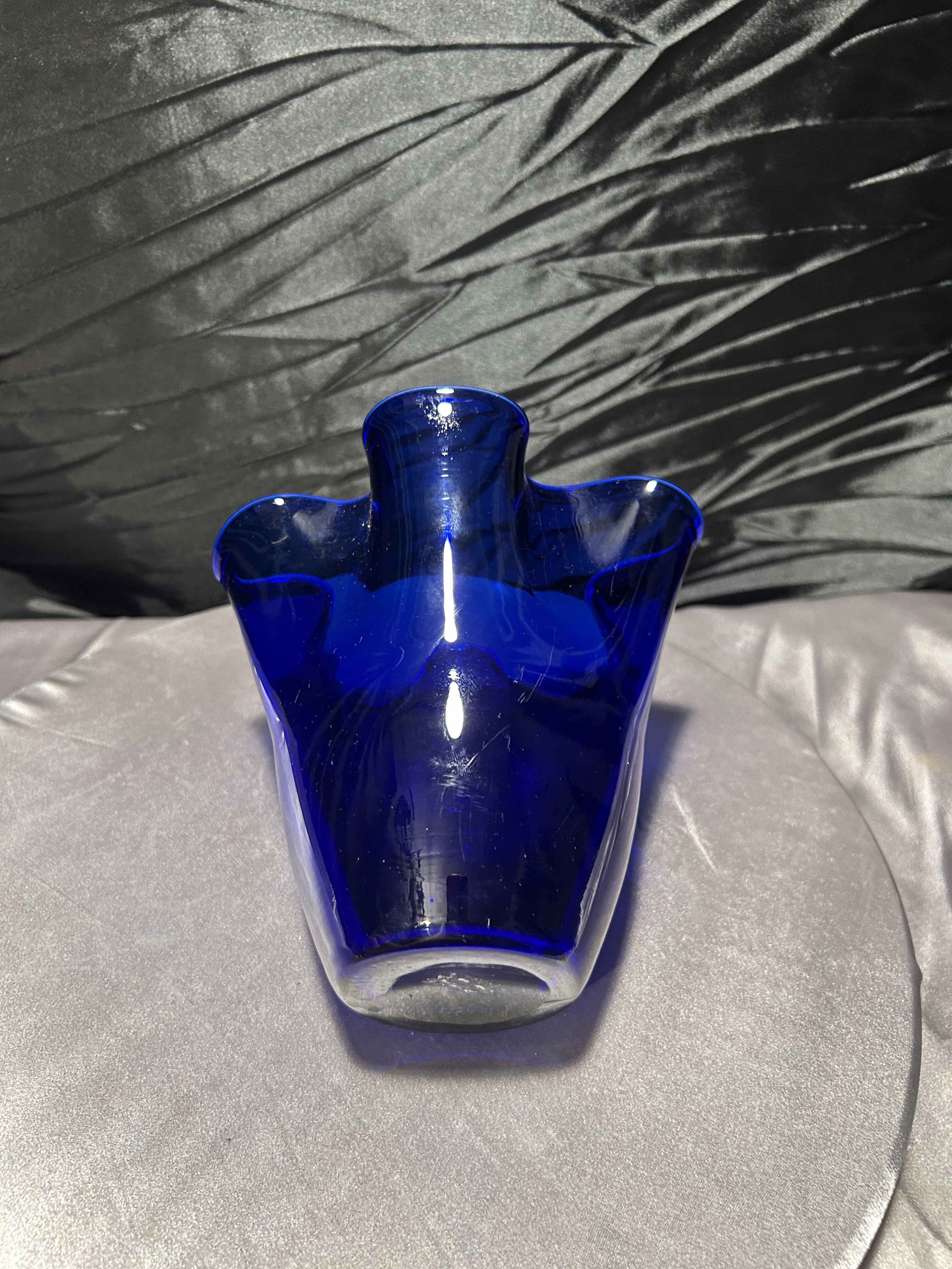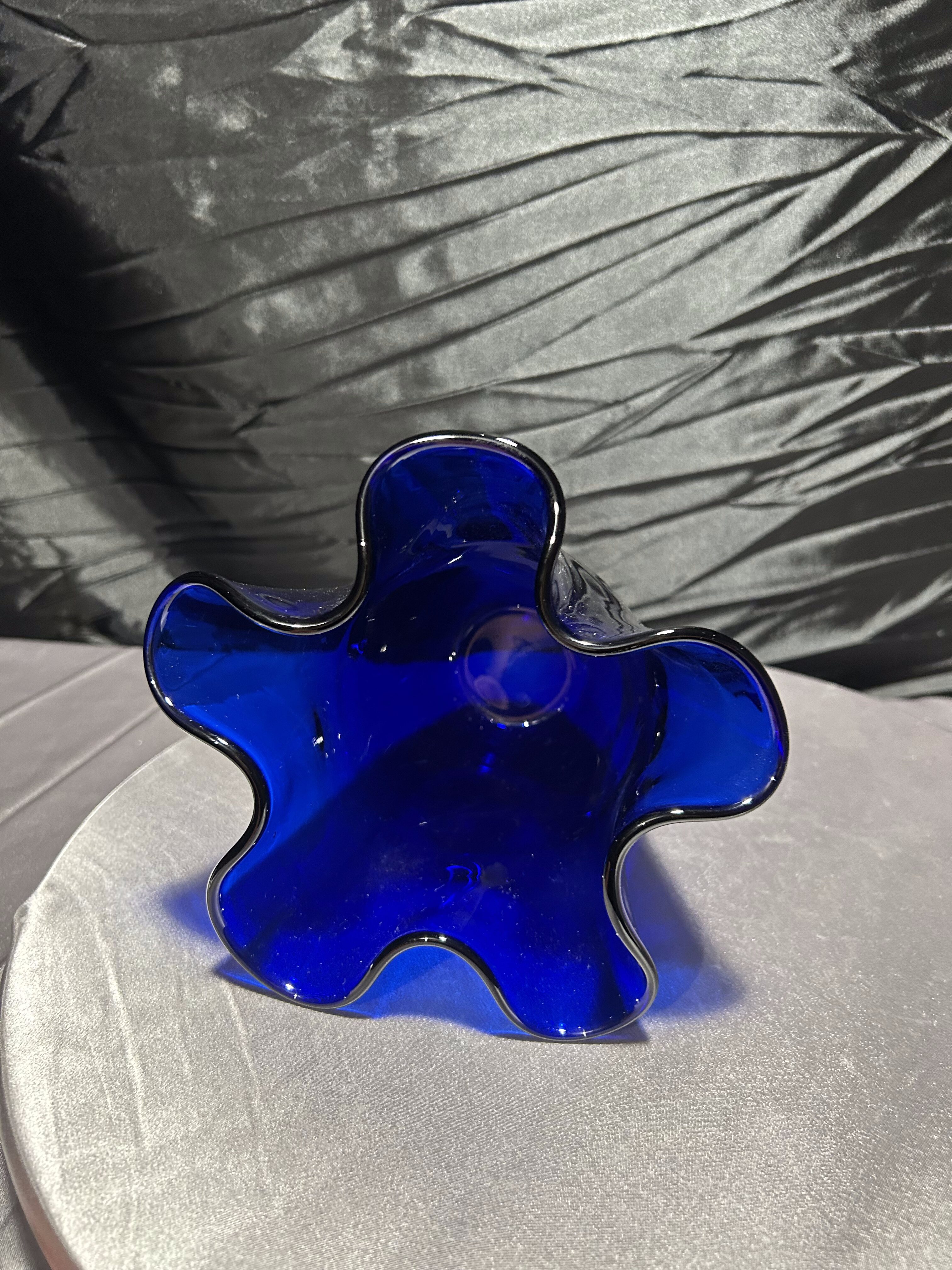 Elegancki flakon ze szkła artystycznego w intensywnym, kobaltowym kolorze. Wykonany techniką ręcznego formowania, z nieregularną falującą krawędzią i delikatnie pogrubionym szkłem przy podstawie. Jego organiczna forma i głęboki, nasycony odcień niebieskiego sprawiają, że jest to przedmiot o wyjątkowym charakterze – zarówno dekoracyjny, jak i kolekcjonerski.