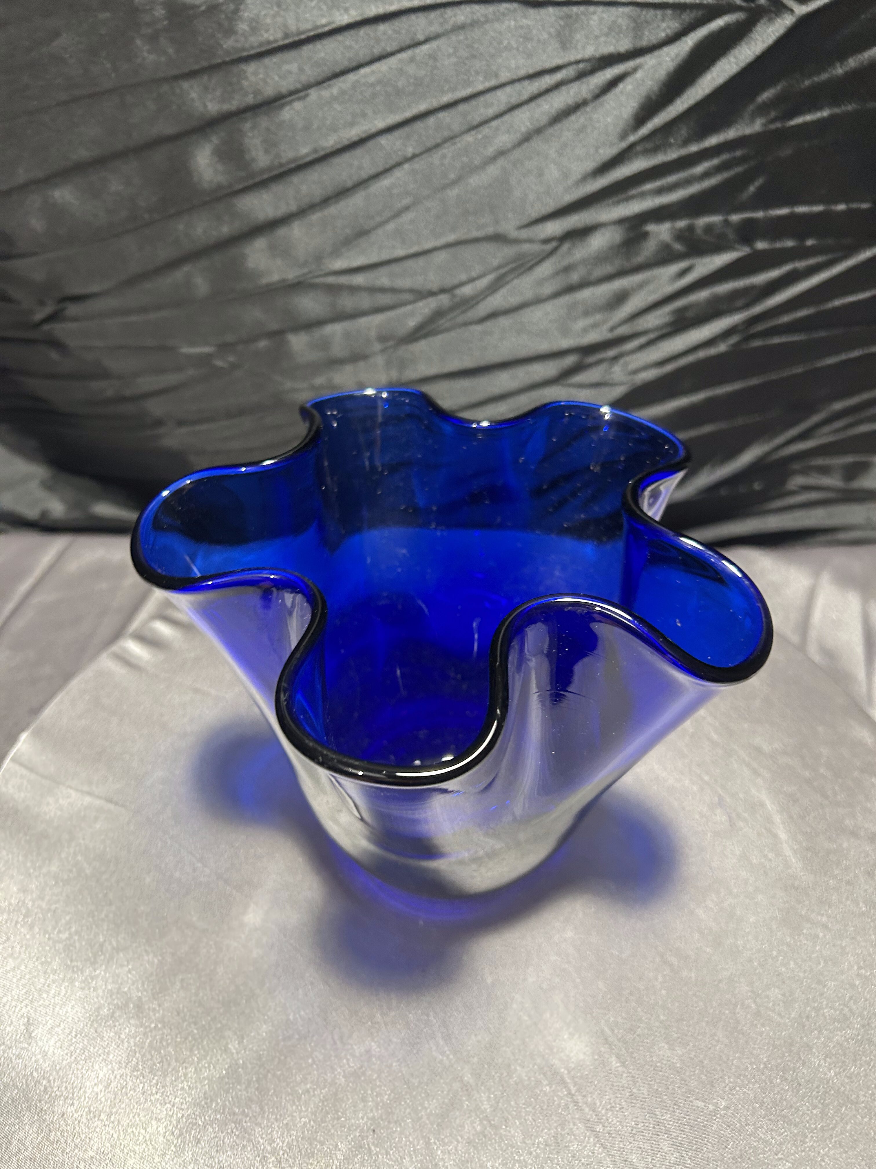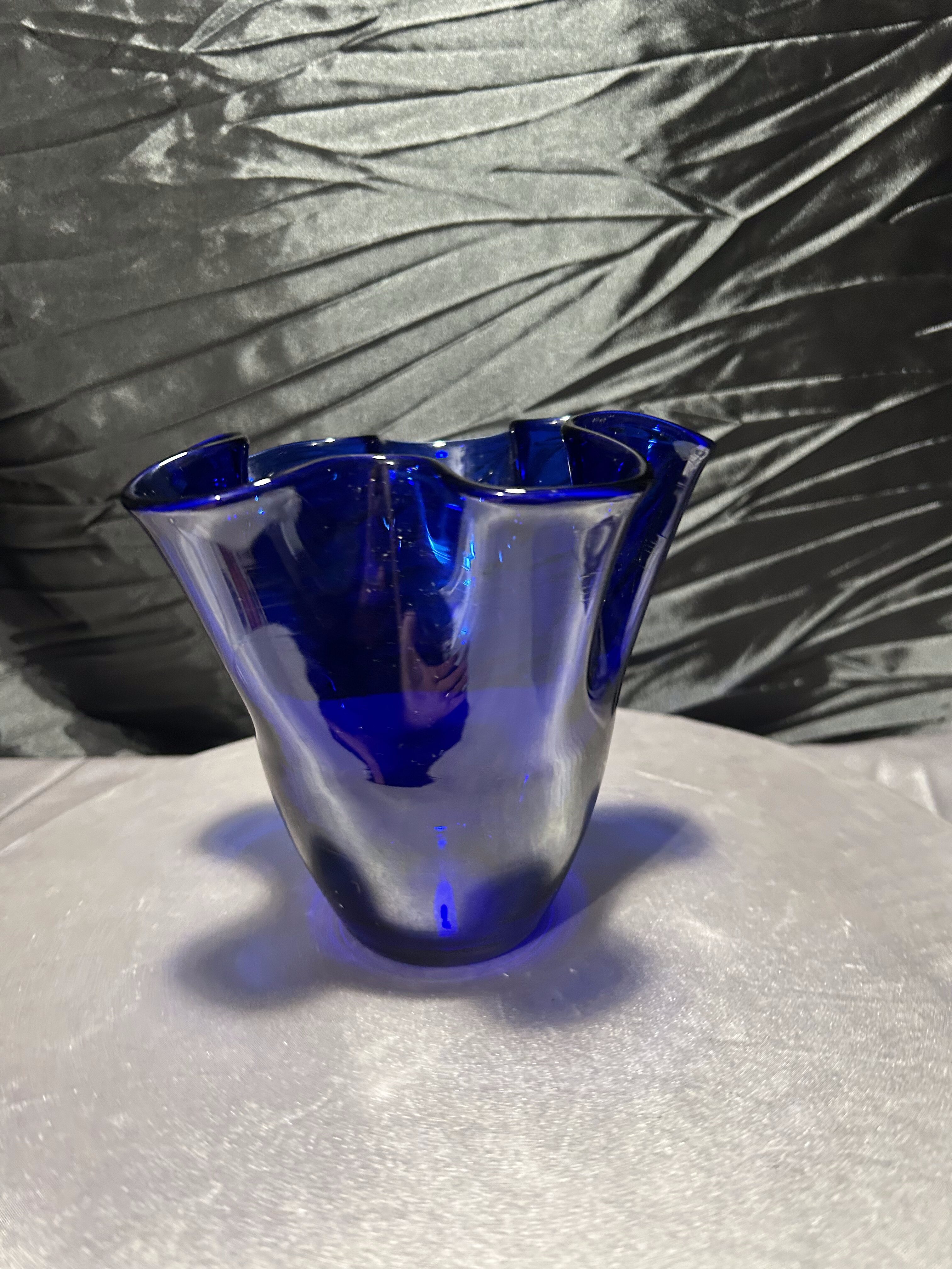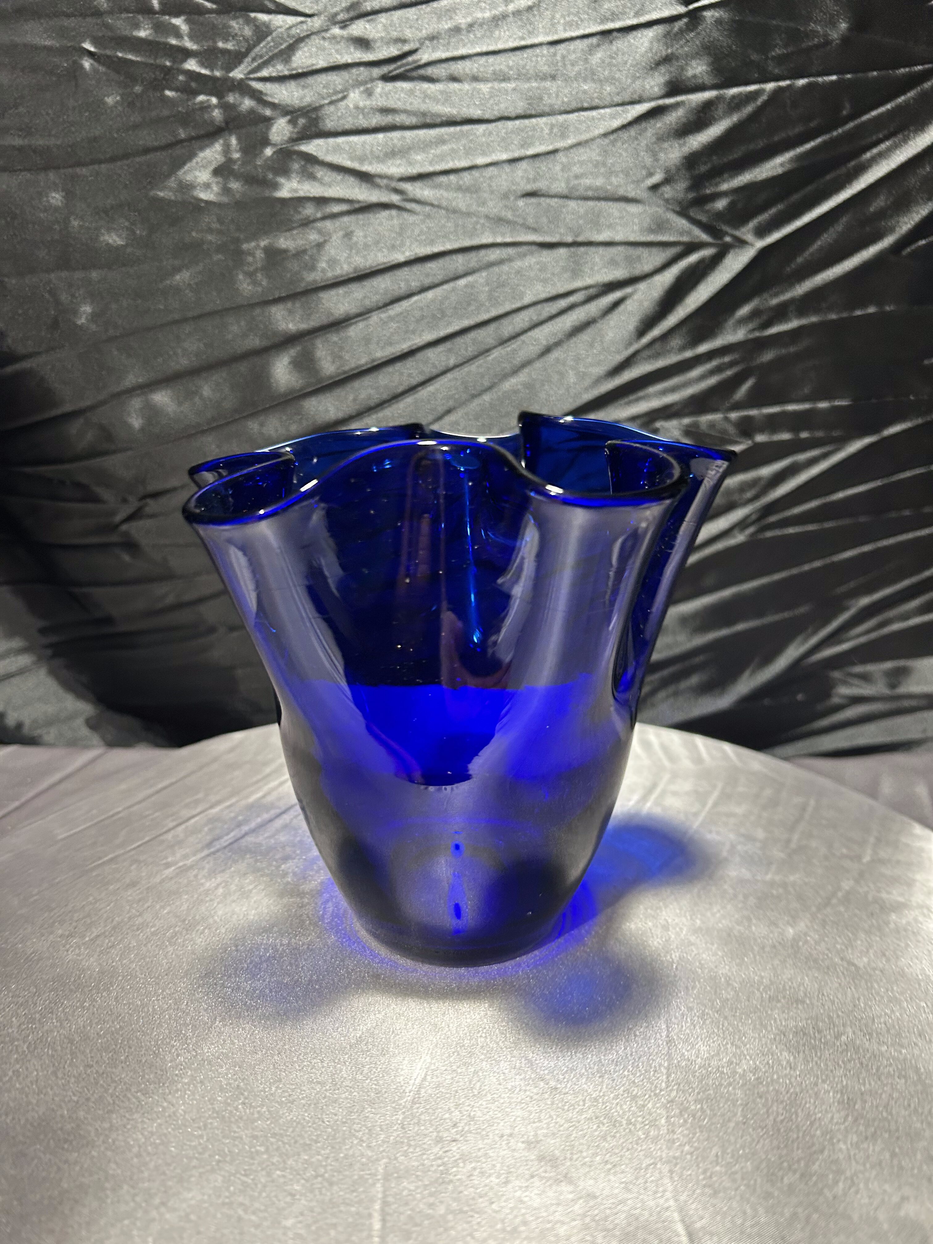 Elegancki flakon ze szkła artystycznego w intensywnym, kobaltowym kolorze. Wykonany techniką ręcznego formowania, z nieregularną falującą krawędzią i delikatnie pogrubionym szkłem przy podstawie. Jego organiczna forma i głęboki, nasycony odcień niebieskiego sprawiają, że jest to przedmiot o wyjątkowym charakterze – zarówno dekoracyjny, jak i kolekcjonerski.