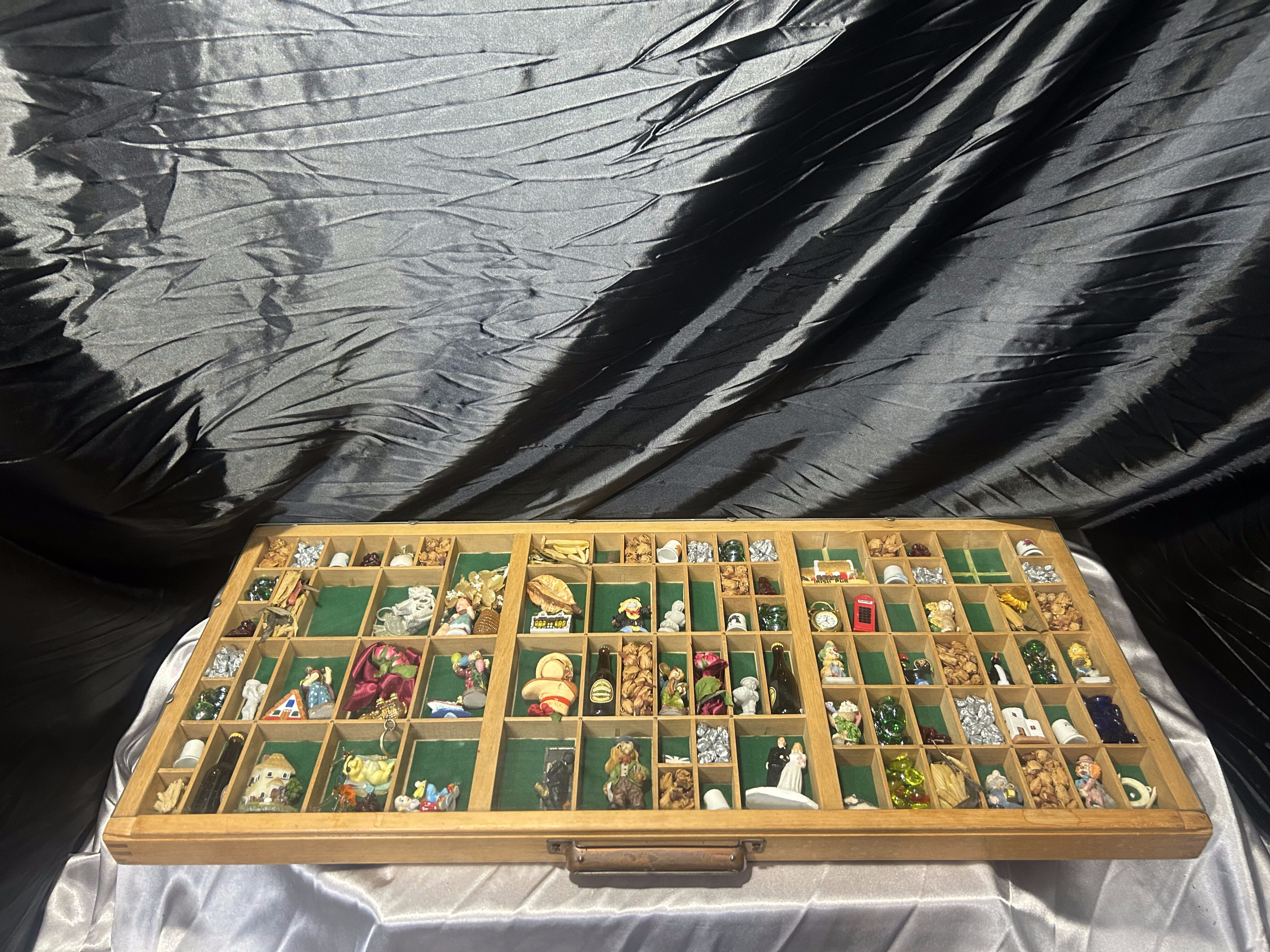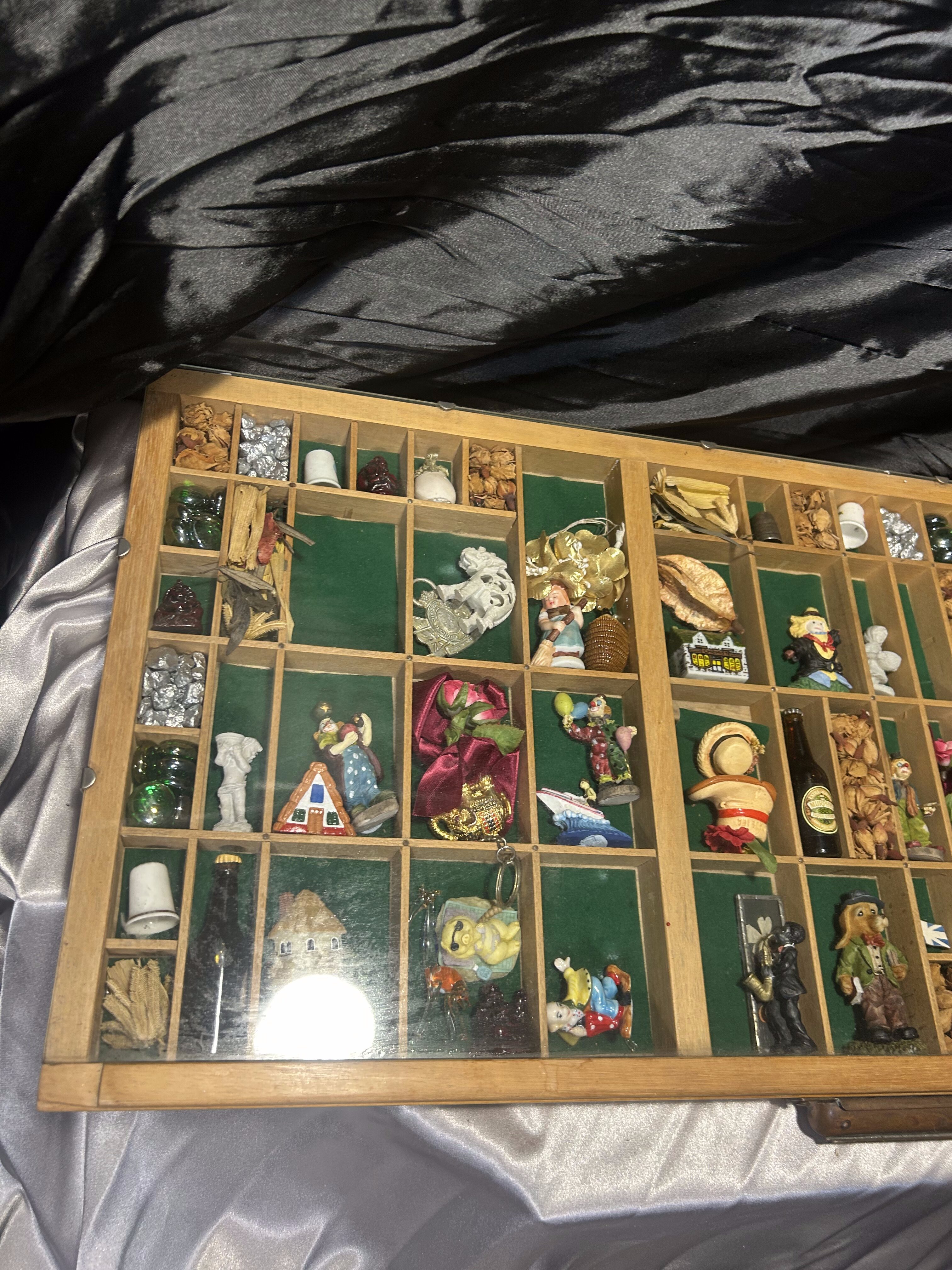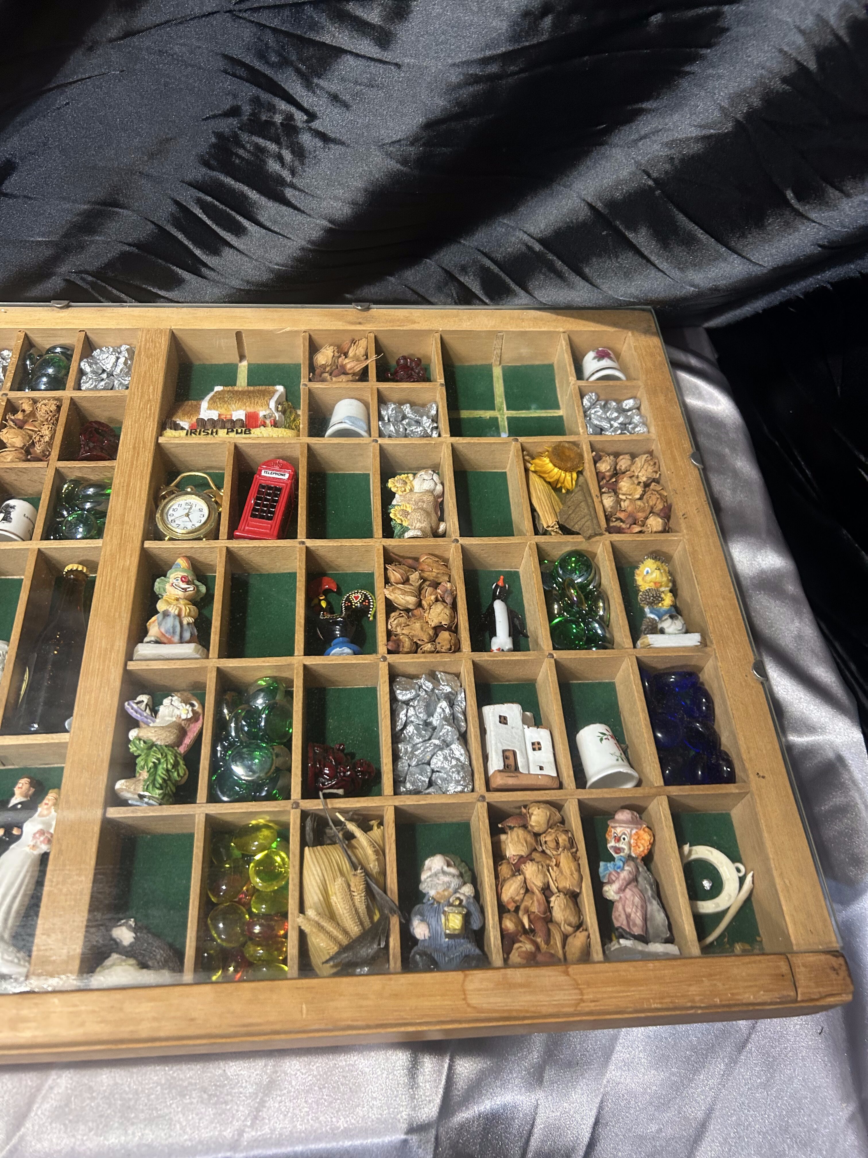 Oferuję wyjątkową gablotkę kolekcjonerską wykonaną z drewna, z licznymi przegródkami wyściełanymi materiałem, zabezpieczoną od góry szklaną szybą. W każdej przegródce znajdują się drobne pamiątki z różnych zakątków świata – figurki, miniatury, kamienie dekoracyjne, symbole kulturowe, drobne upominki podróżnicze. To idealna forma prezentacji wspomnień, kolekcji lub małych przedmiotów o wartości sentymentalnej.