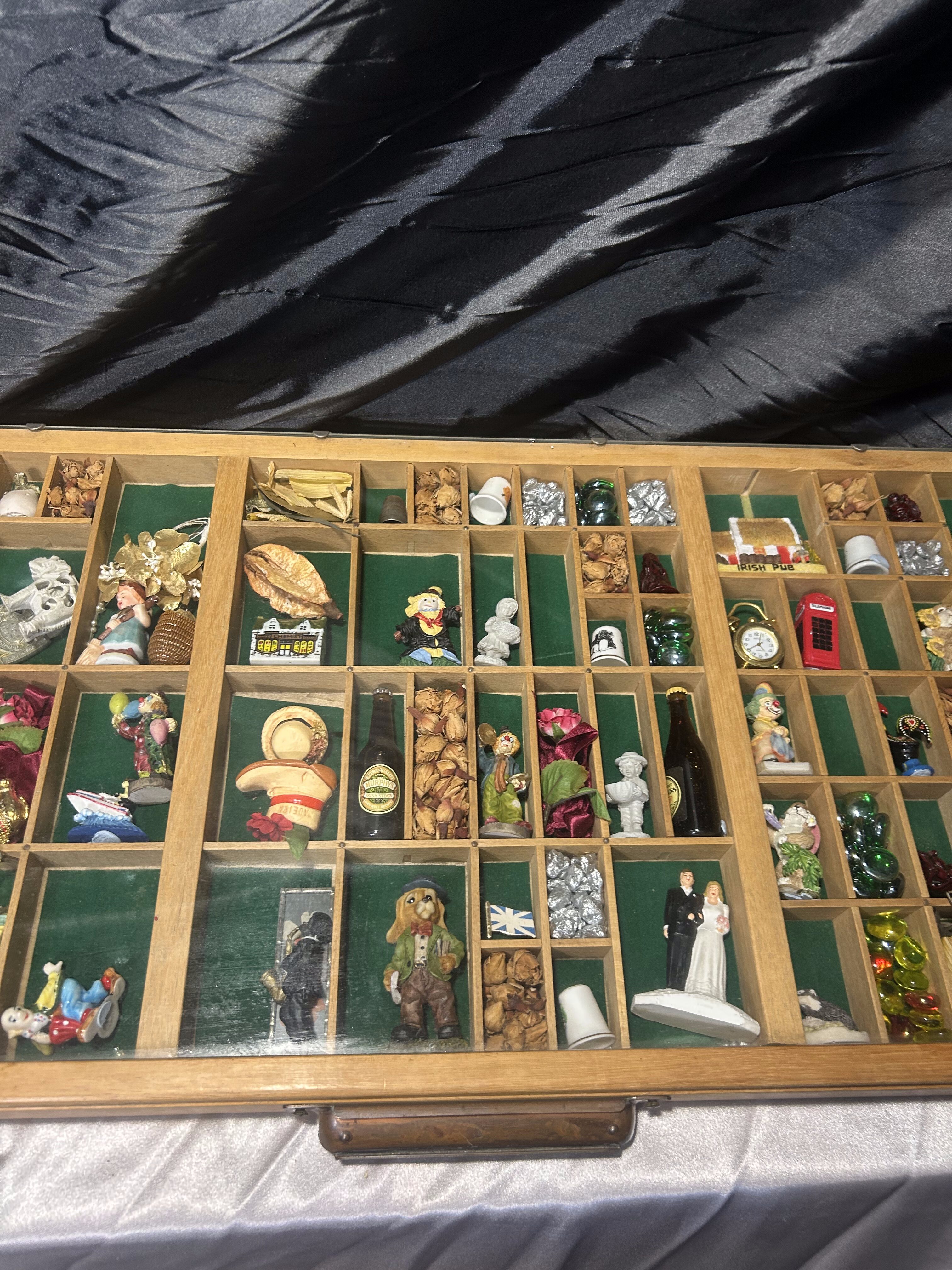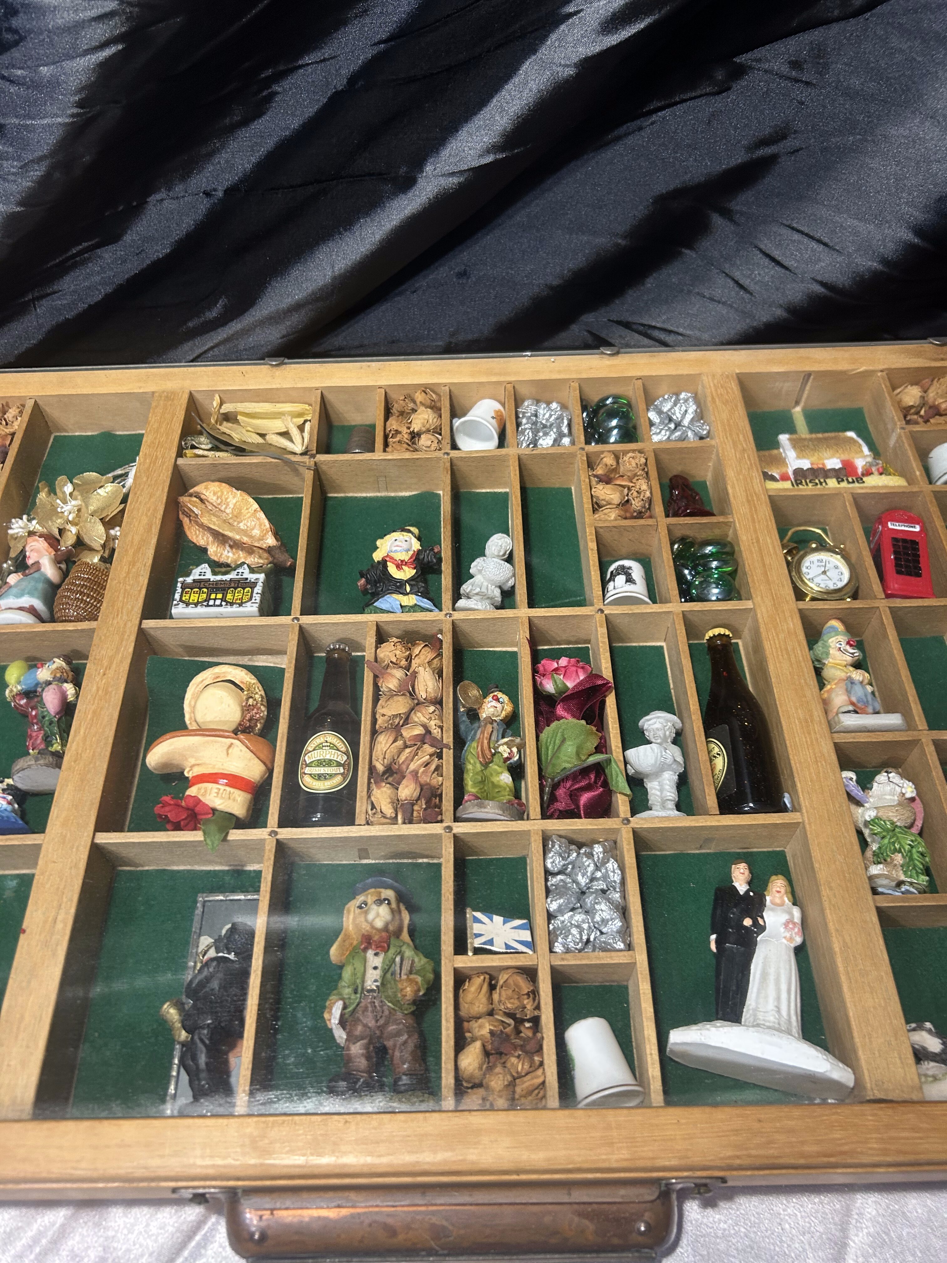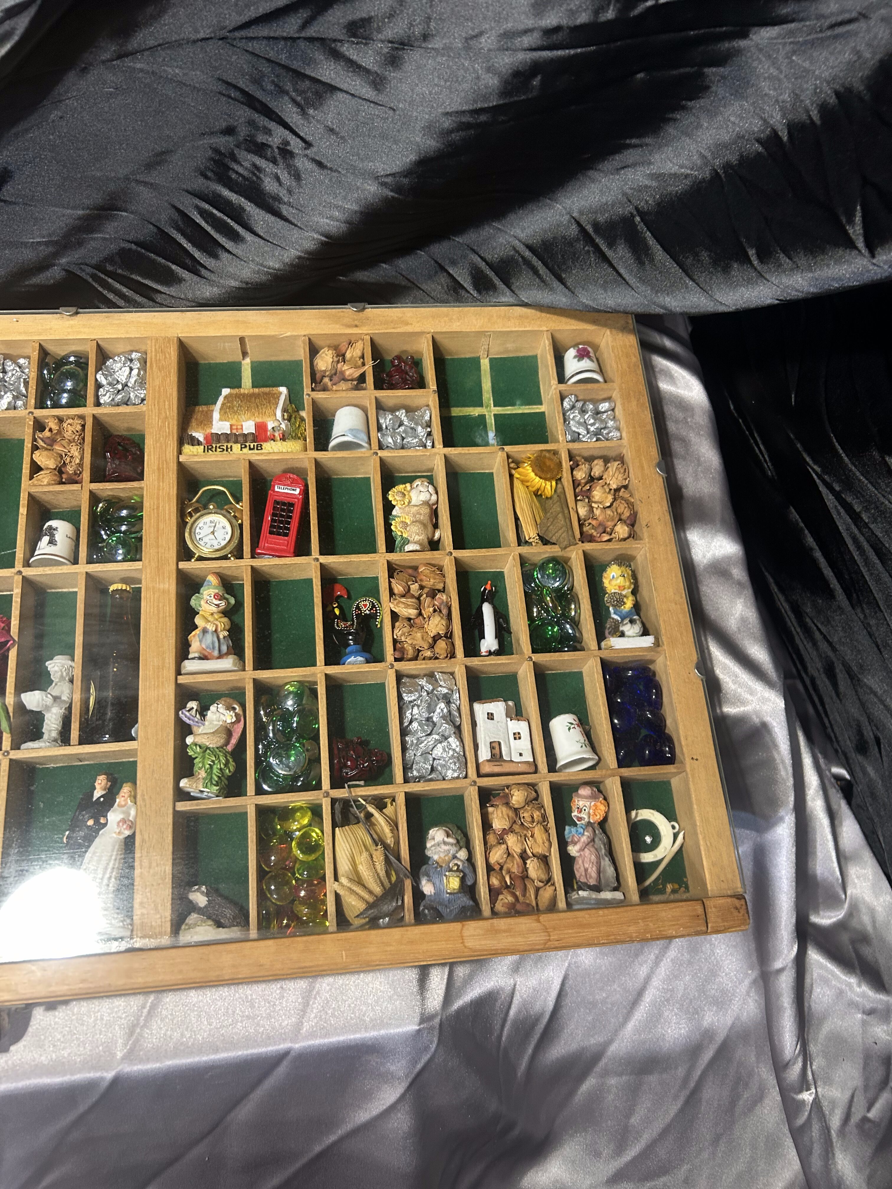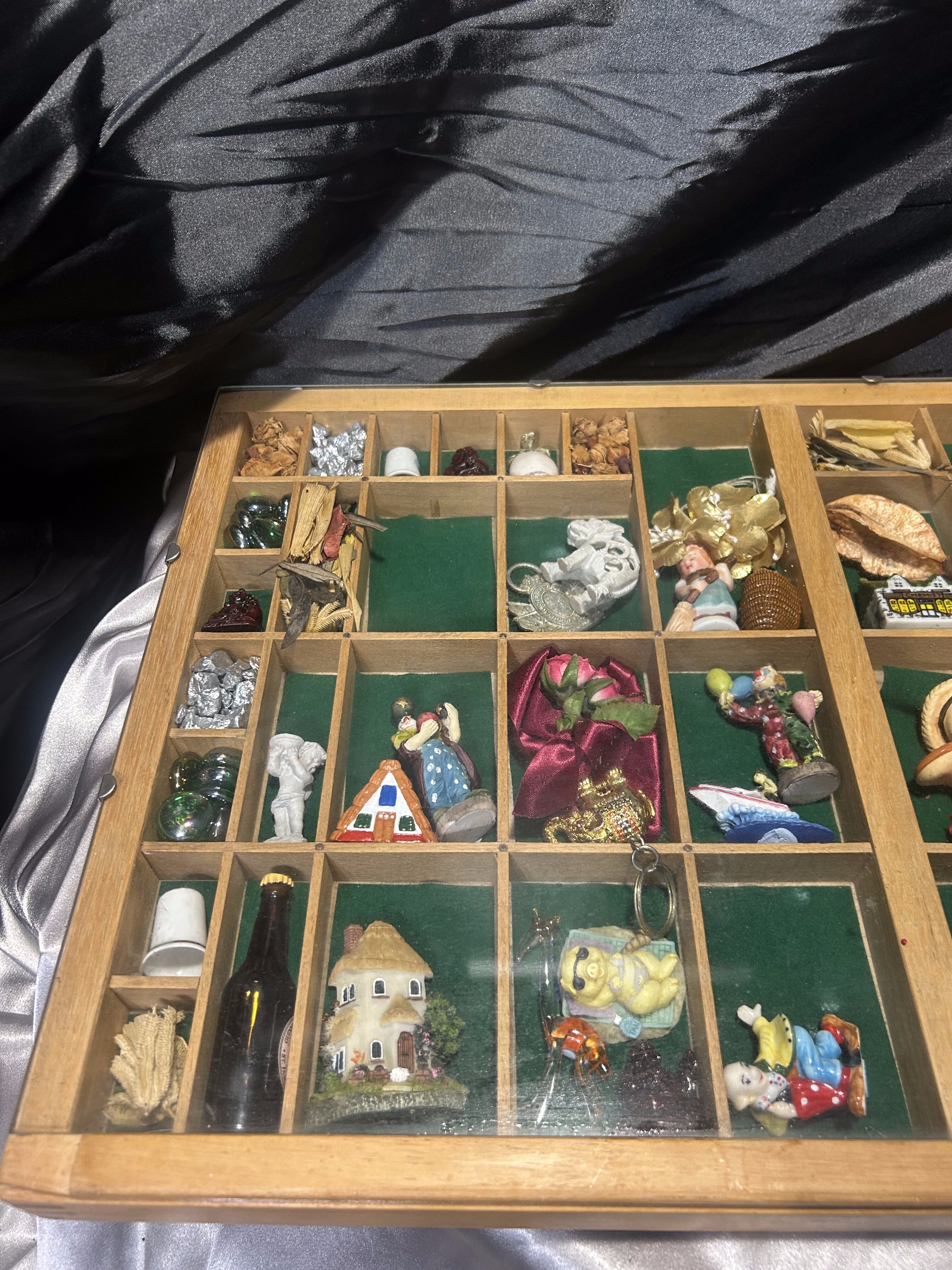 Oferuję wyjątkową gablotkę kolekcjonerską wykonaną z drewna, z licznymi przegródkami wyściełanymi materiałem, zabezpieczoną od góry szklaną szybą. W każdej przegródce znajdują się drobne pamiątki z różnych zakątków świata – figurki, miniatury, kamienie dekoracyjne, symbole kulturowe, drobne upominki podróżnicze. To idealna forma prezentacji wspomnień, kolekcji lub małych przedmiotów o wartości sentymentalnej.