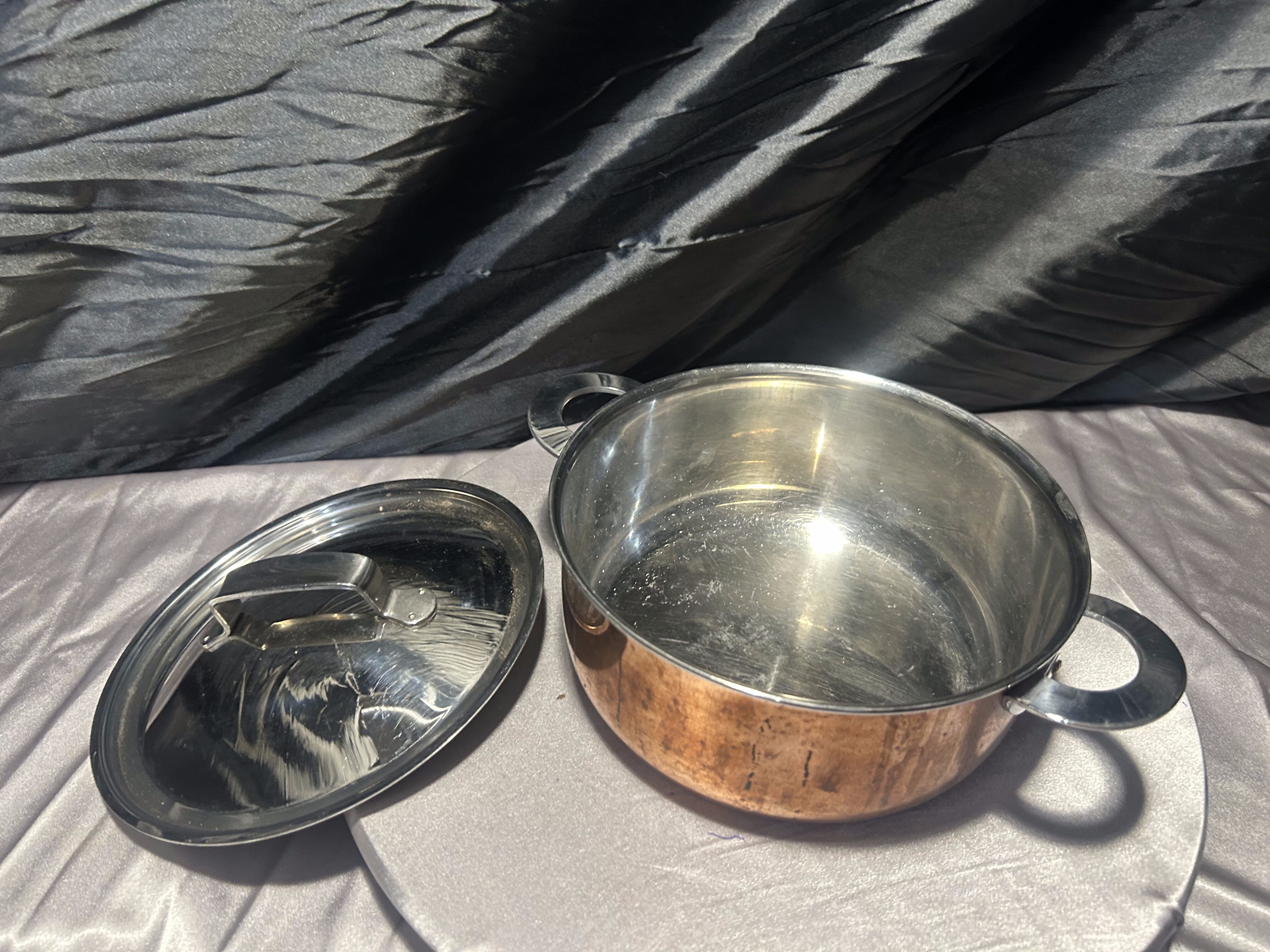 Model ten posiada klasyczną, polerowaną powierzchnię z naturalnymi śladami patyny, która dodaje mu charakteru i podkreśla autentyczność materiału. Wyposażony jest w wygodne uchwyty oraz dopasowaną pokrywkę ze stali, dzięki czemu cały komplet prezentuje się profesjonalnie i stylowo. To doskonała propozycja dla miłośników kuchni, kolekcjonerów miedzi oraz osób ceniących wyjątkowe przedmioty użytkowe z duszą.