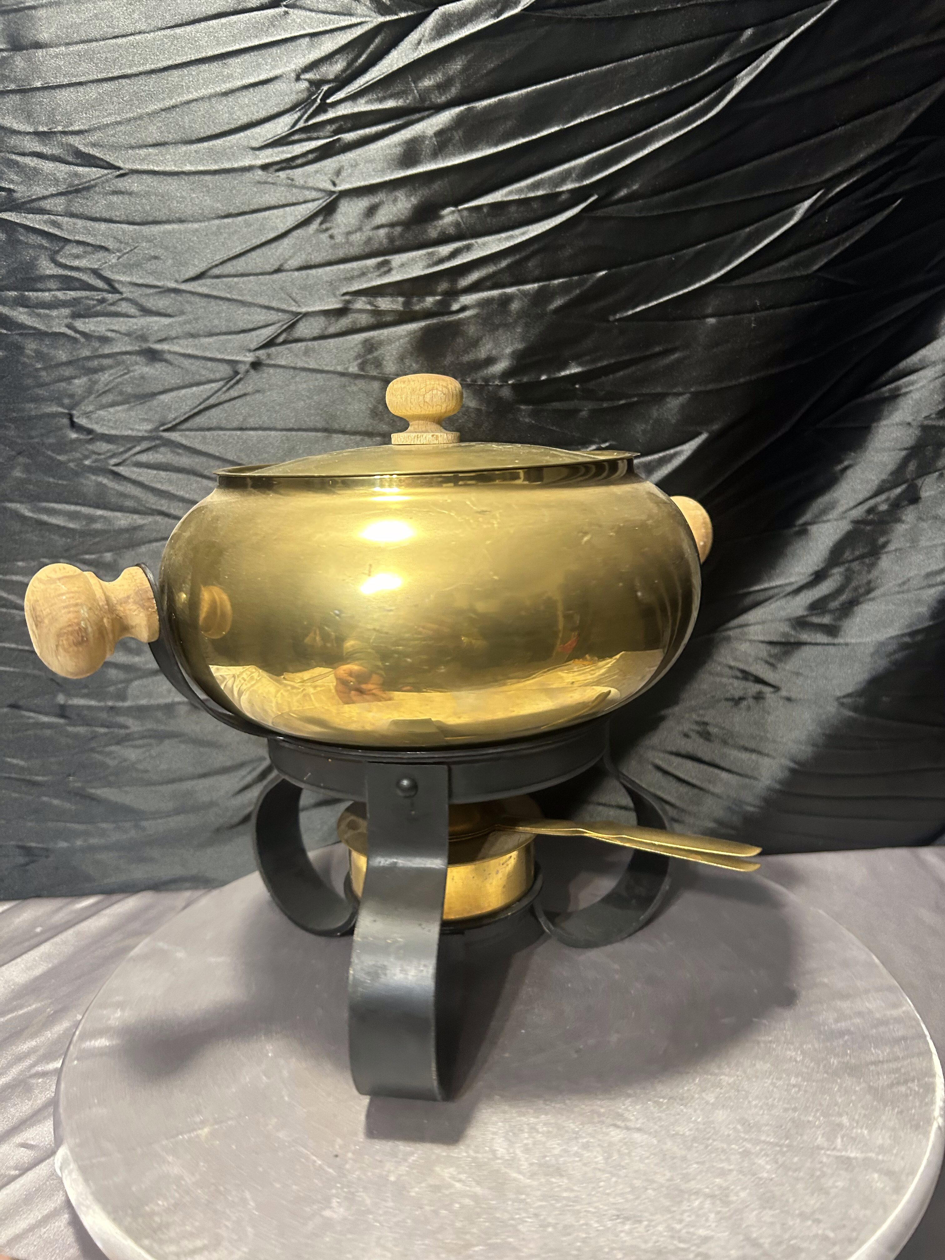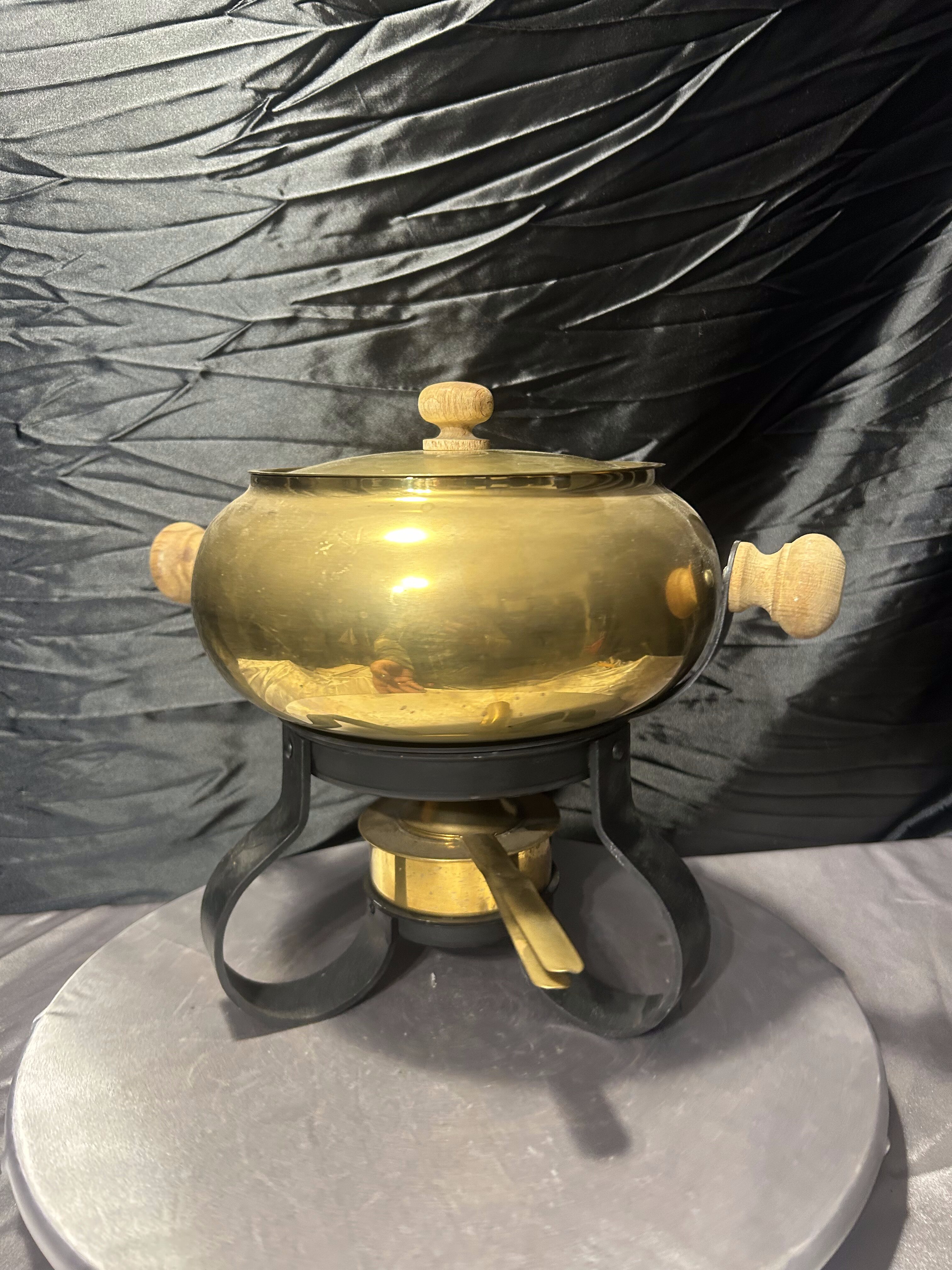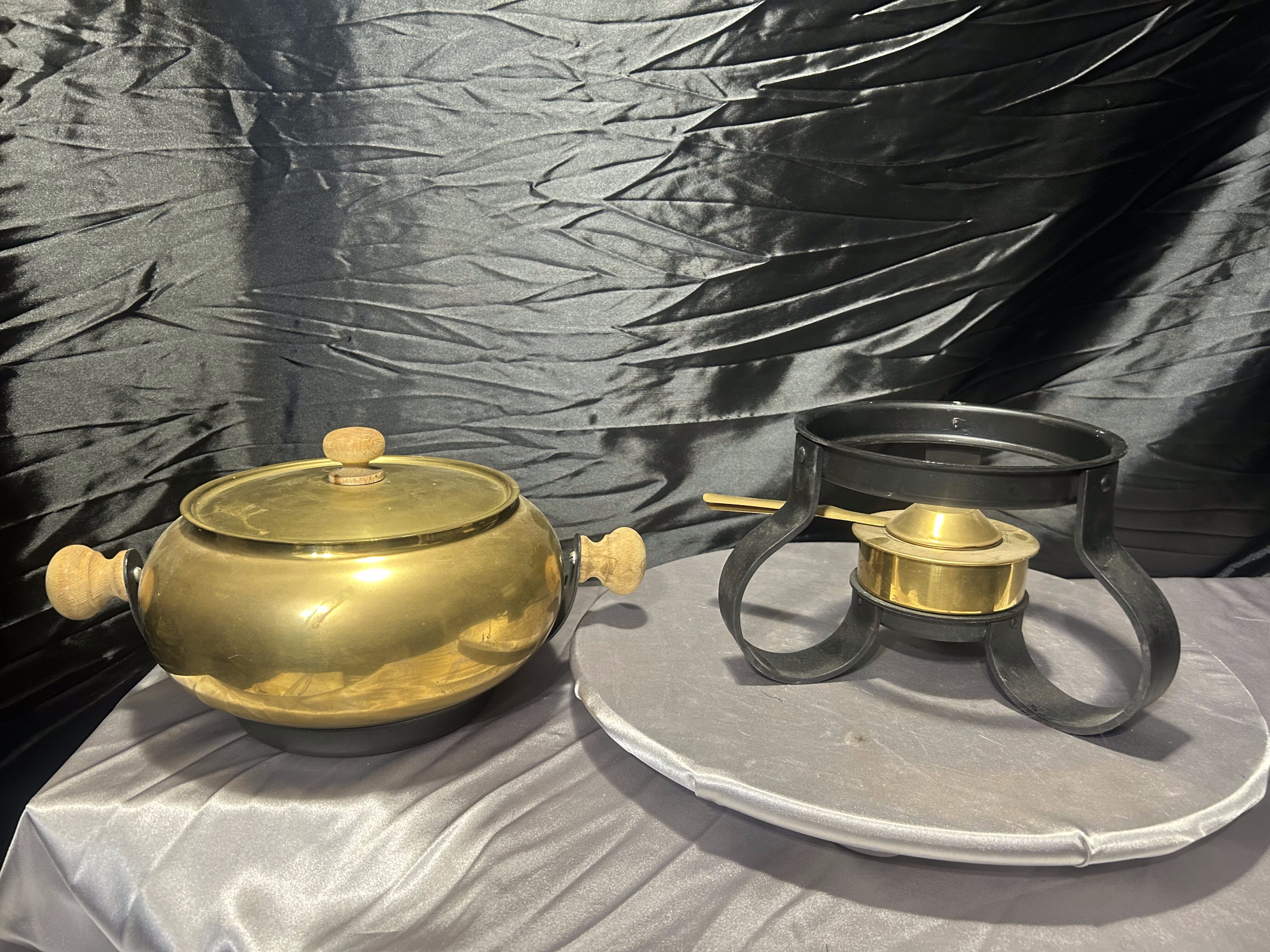 Mosiężny Garnek do Fondue – Na Kutej Podstawie, Zestaw z Podgrzewaczem i Szczypcami, 3,1 kg