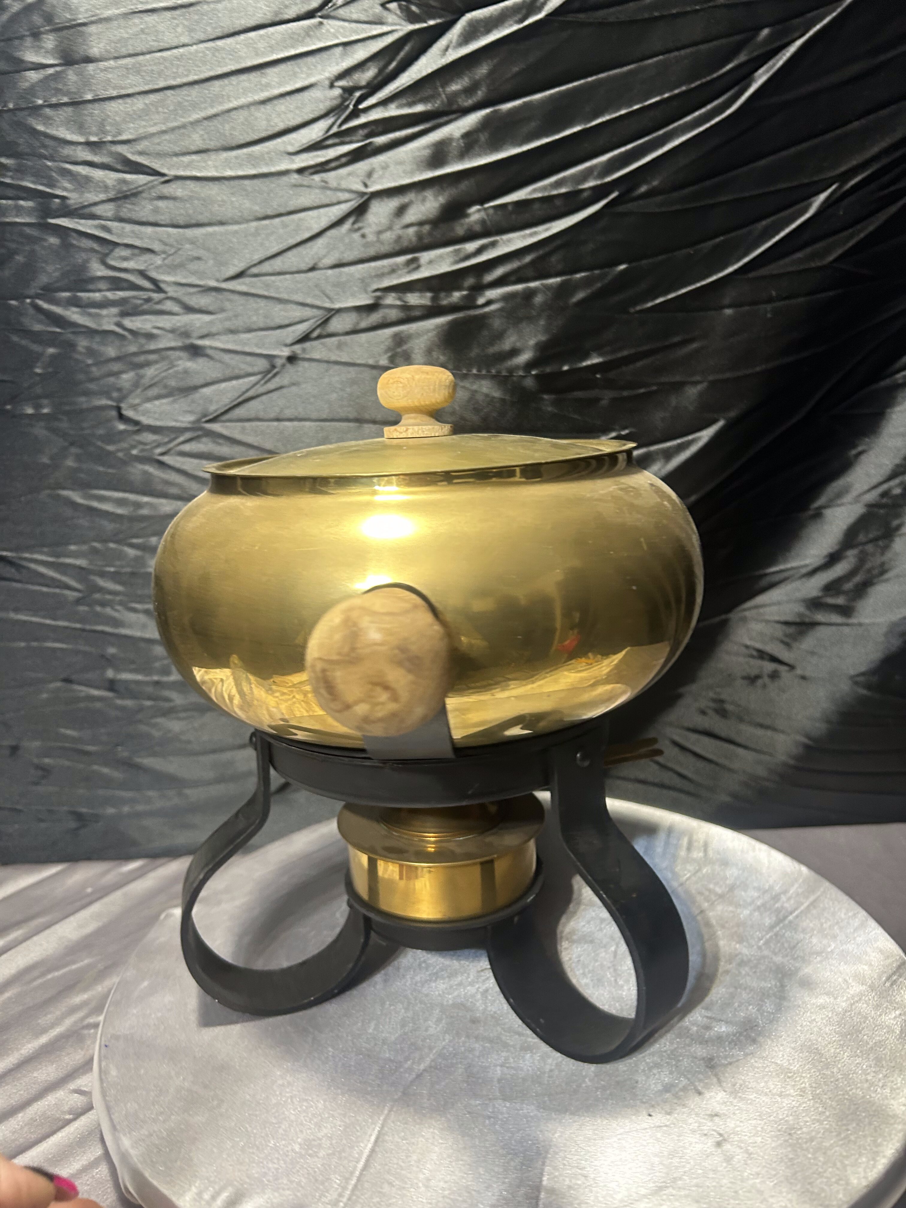 Garnek mosiężny z podstawką do podgrzewania i pokrywką – styl vintage
