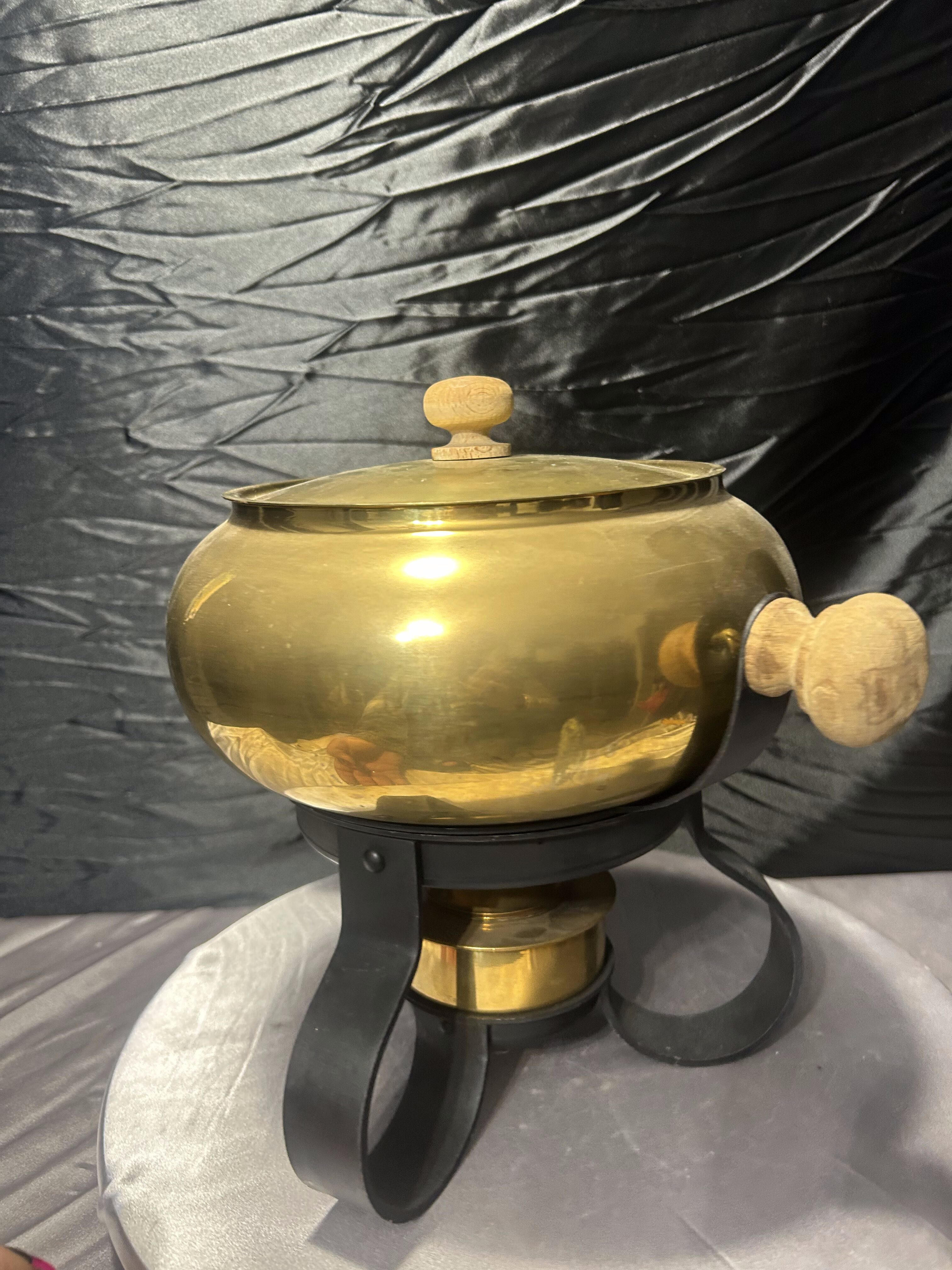 Elegancki garnek wykonany z mosiądzu, osadzony na solidnej metalowej podstawie umożliwiającej podgrzewanie potraw. Wyposażony w pokrywkę z drewnianym uchwytem oraz drewniane boczne rączki, które chronią dłonie przed oparzeniem. Przedmiot łączy w sobie funkcję użytkową i dekoracyjną – idealny do serwowania dań na stół lub jako efektowny element wystroju kuchni lub jadalni.