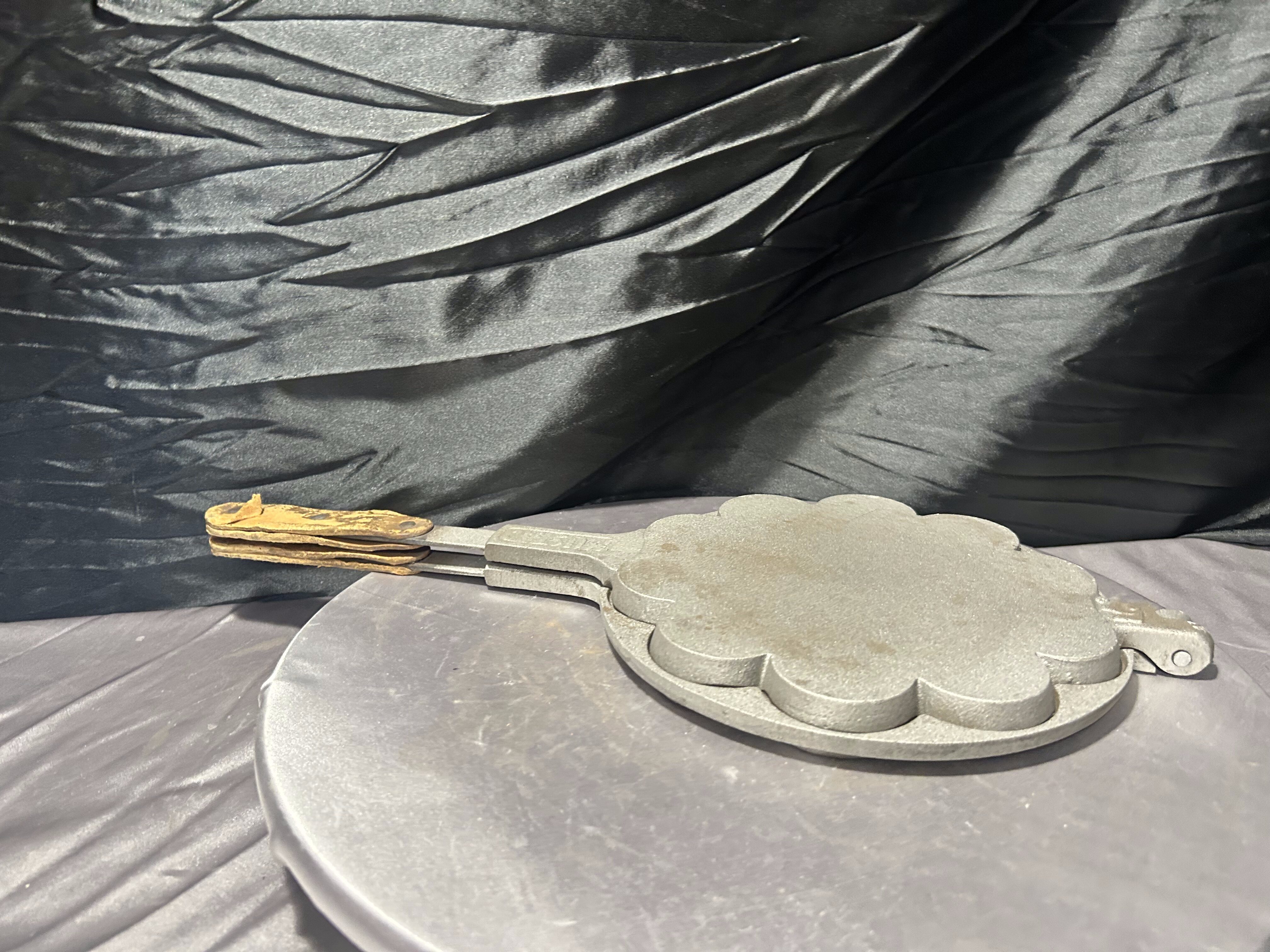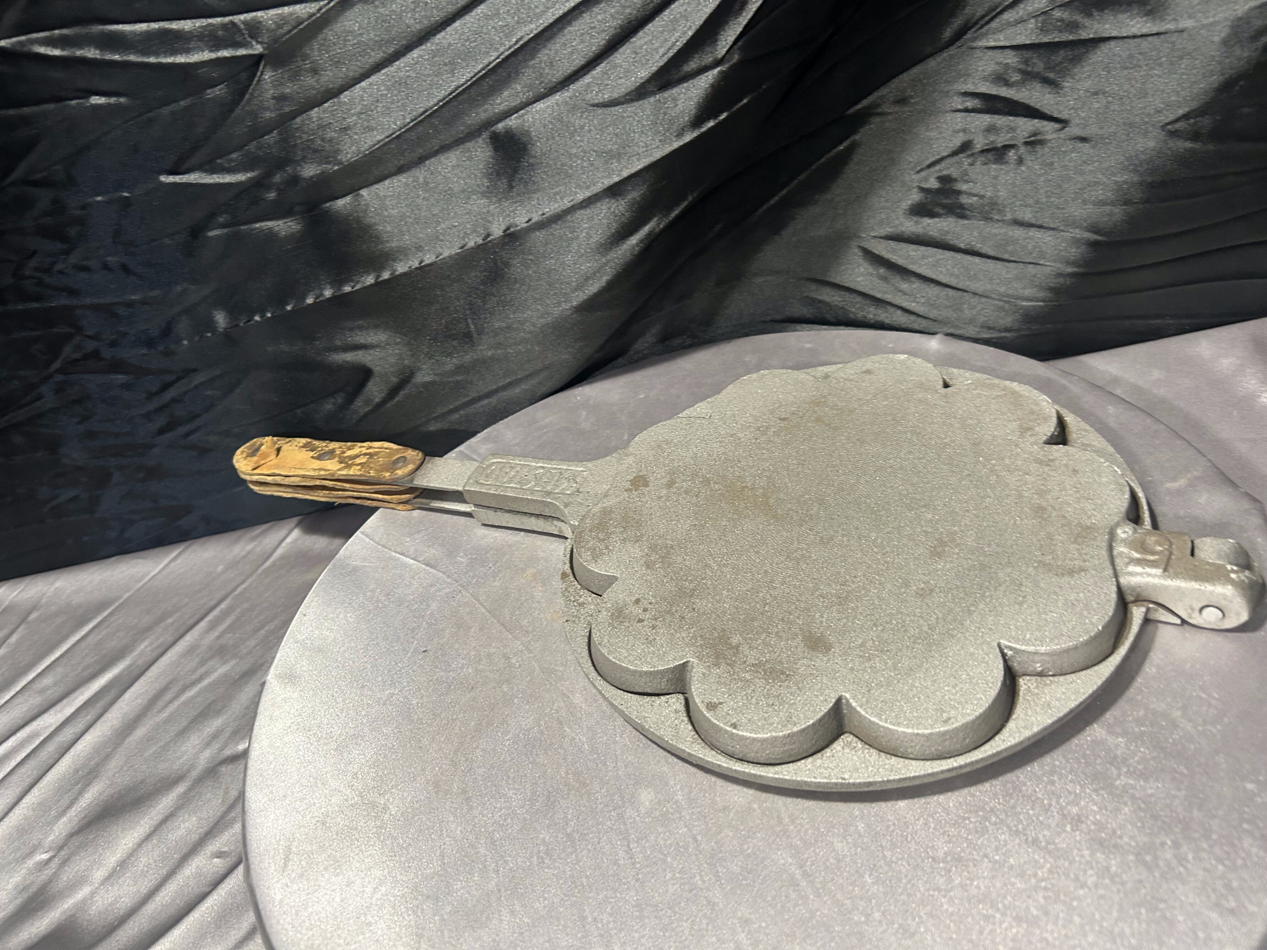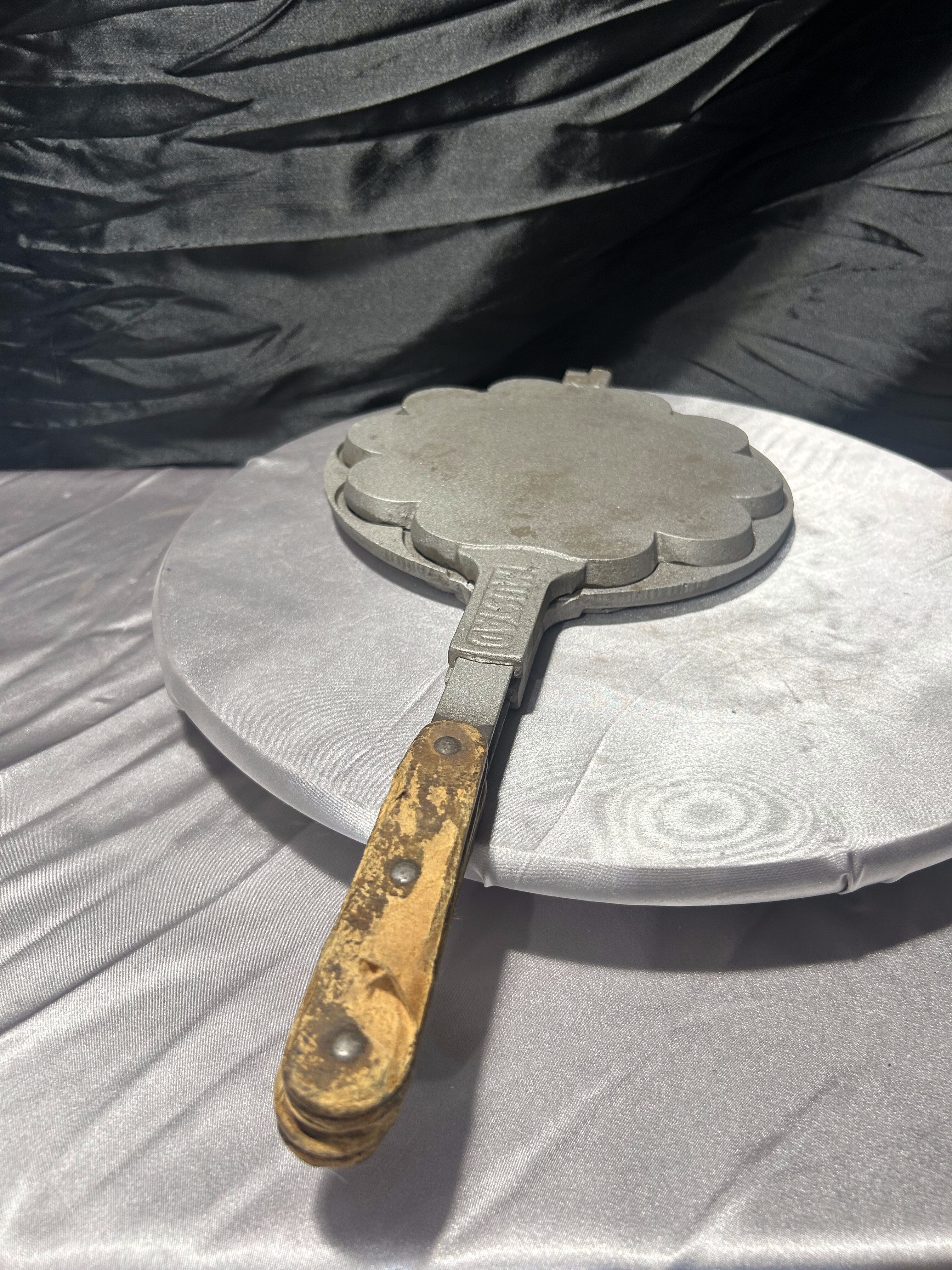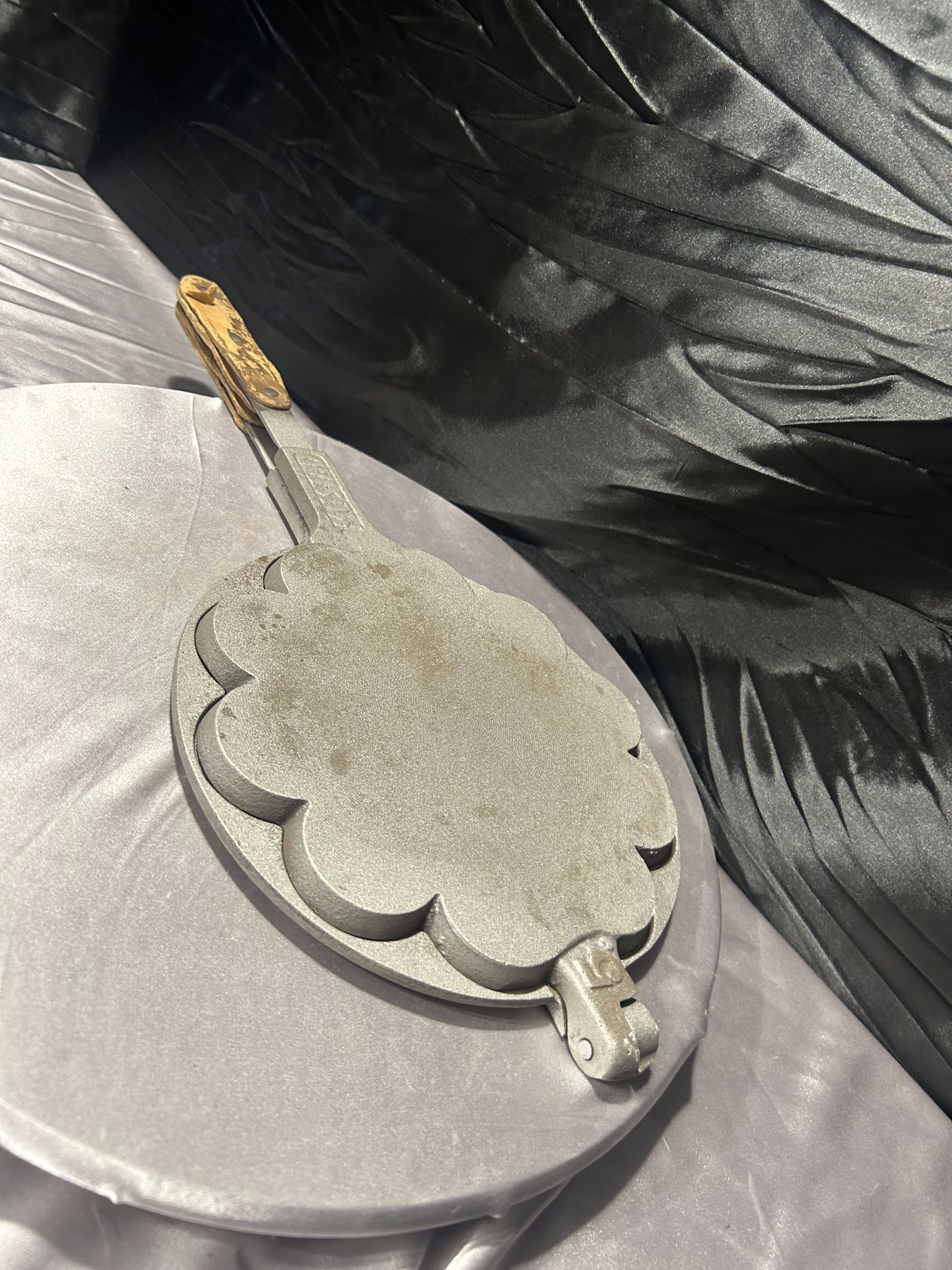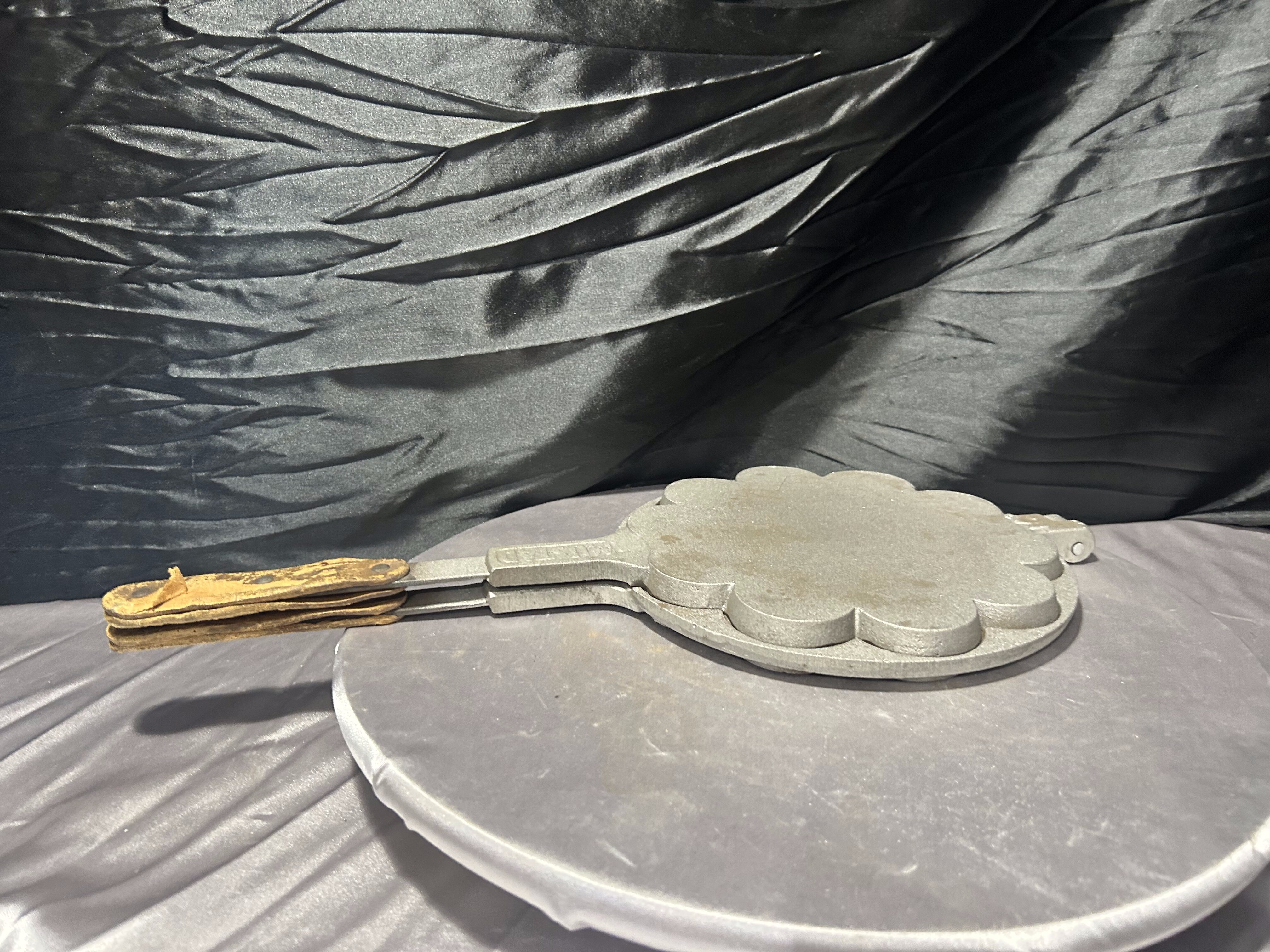 Tradycyjna gofrownica wykonana z litego żeliwa, produkcji norweskiej firmy Mustad. Egzemplarz został starannie wypiaskowany, dzięki czemu zachował surowy, autentyczny charakter oraz jest przygotowany do dalszego użytkowania. Klasyczny wzór gofra oraz solidna konstrukcja świadczą o wysokiej jakości dawnego rzemiosła użytkowego.