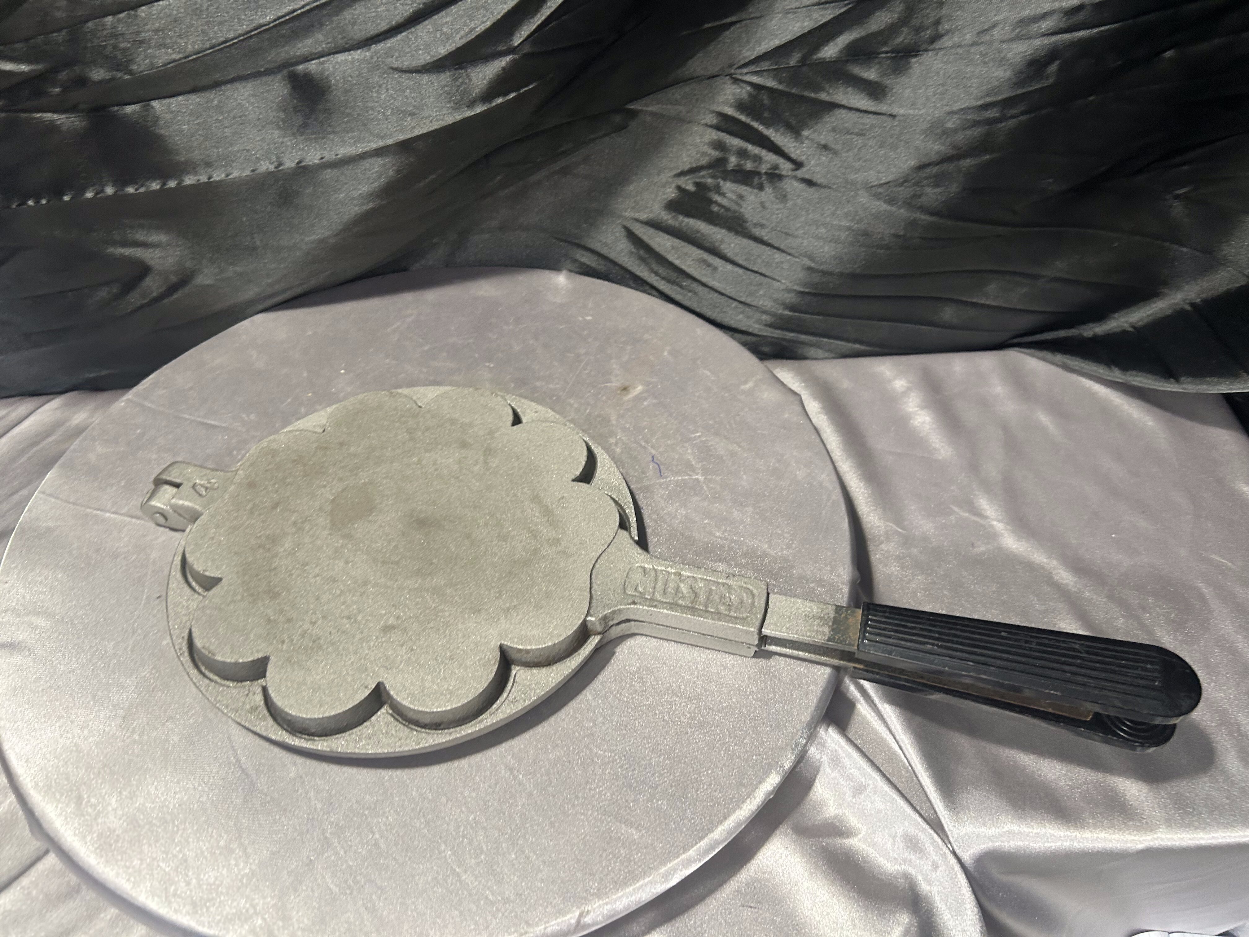 Solidna, klasyczna gofrownica żeliwna renomowanej norweskiej firmy MUSTAD. Egzemplarz został wypiaskowany, dzięki czemu zachował autentyczny charakter, a jednocześnie prezentuje się bardzo estetycznie. Tradycyjna forma i wyraźny, geometryczny wzór sprawiają, że jest to zarówno funkcjonalne narzędzie kuchenne, jak i wyjątkowy przedmiot kolekcjonerski.
