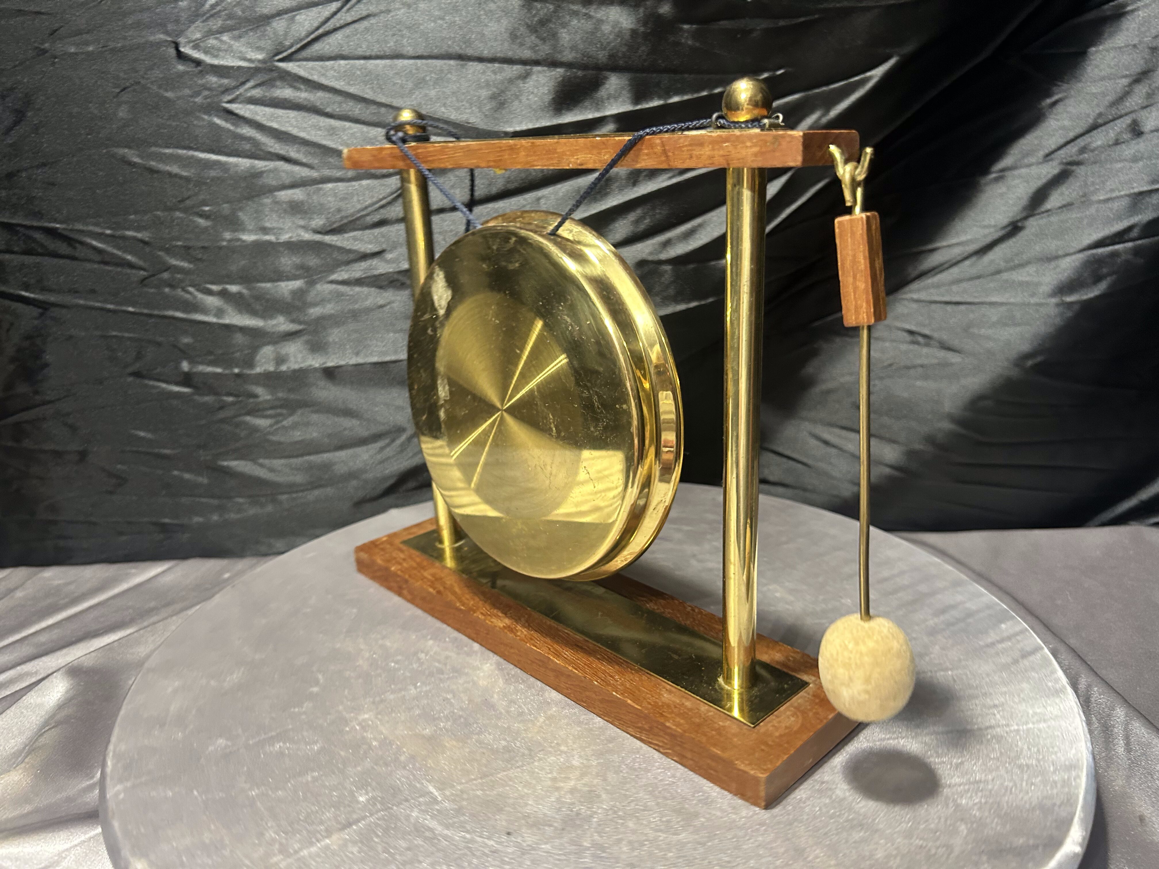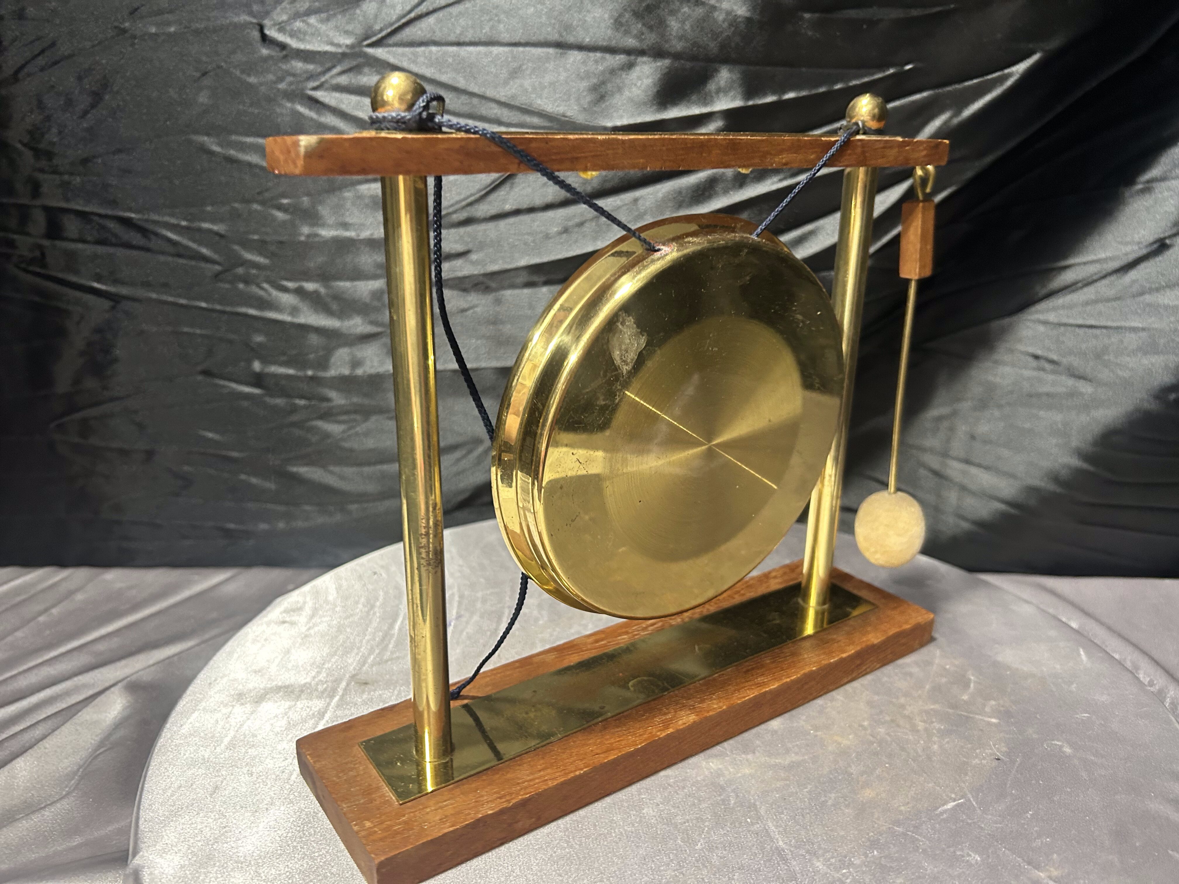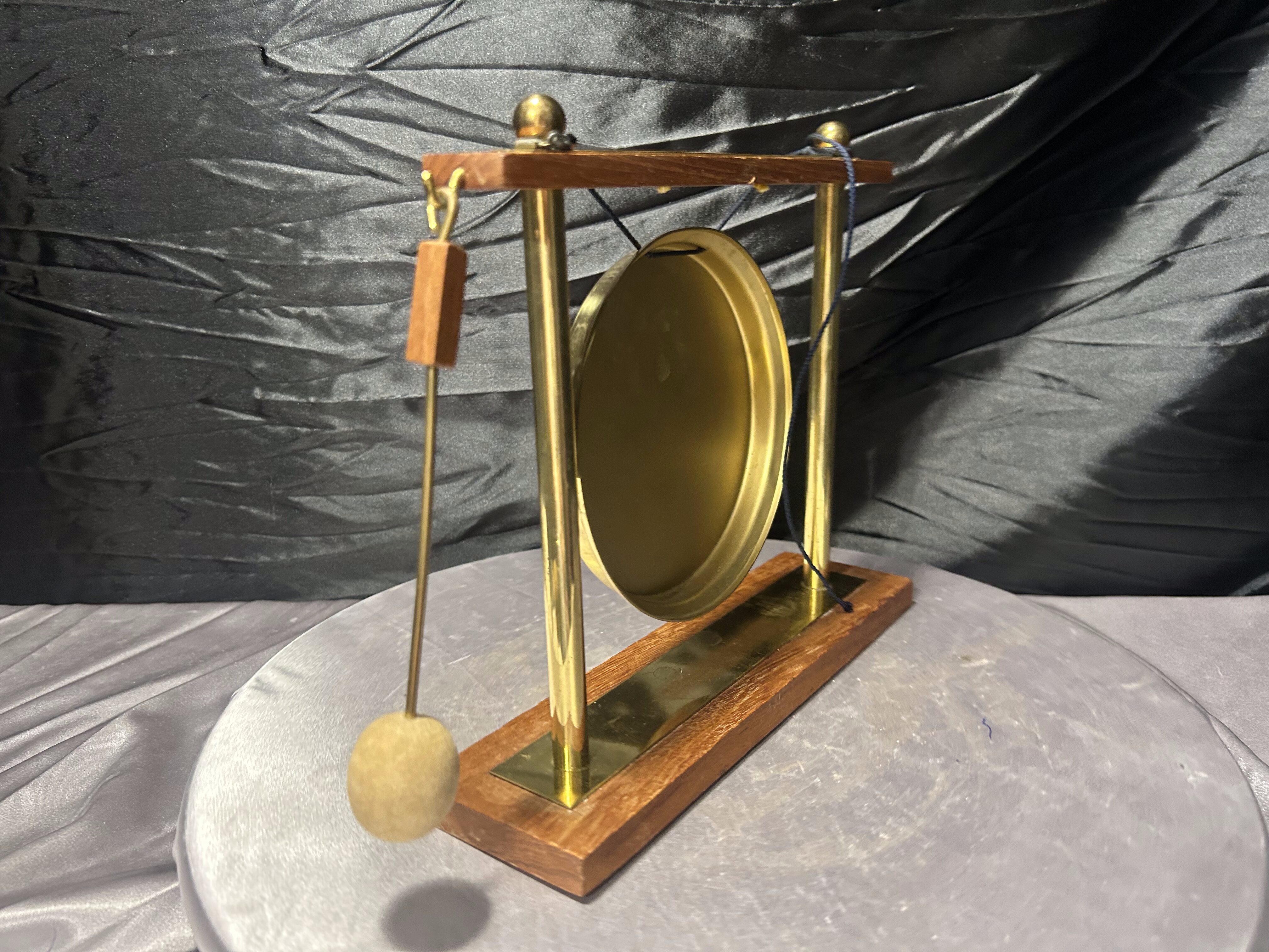 Dekoracyjny gong wykonany z mosiądzu, osadzony w stabilnej, drewnianej ramie z mosiężnymi elementami. Prosta, harmonijna forma łączy funkcję użytkową z estetyką klasycznego przedmiotu dekoracyjnego. Gong charakteryzuje się bardzo przyjemnym, czystym brzmieniem oraz naturalnymi wibracjami, które nadają mu wyjątkowy, uspokajający charakter.