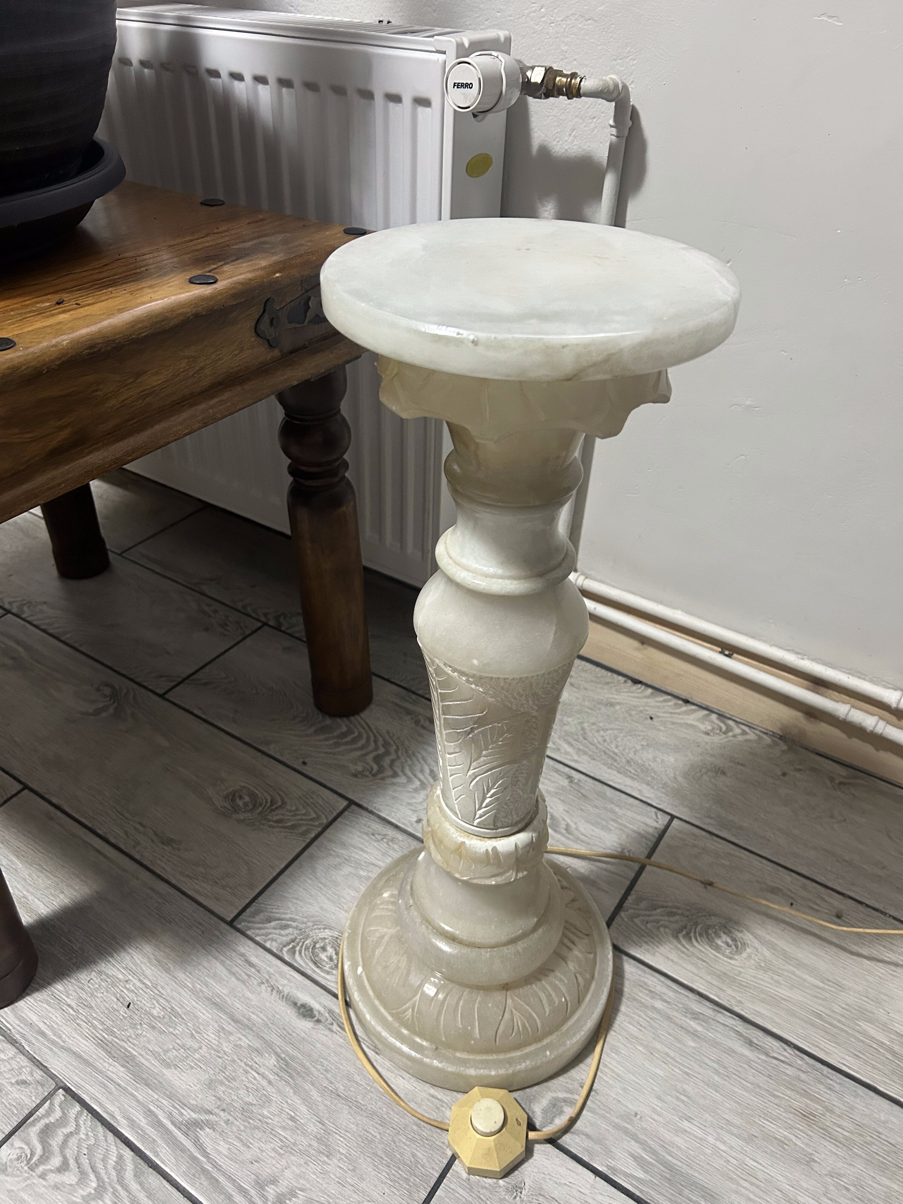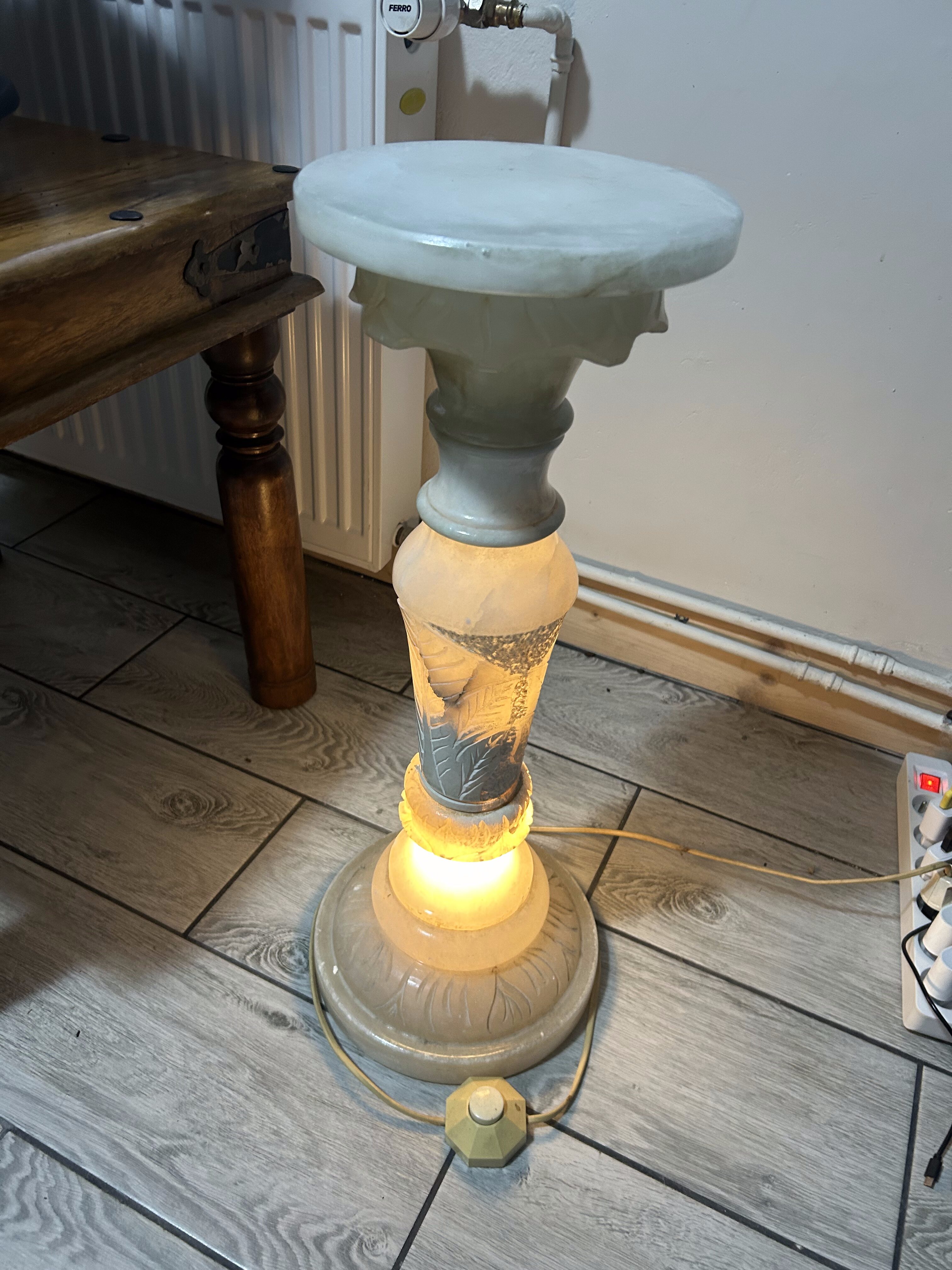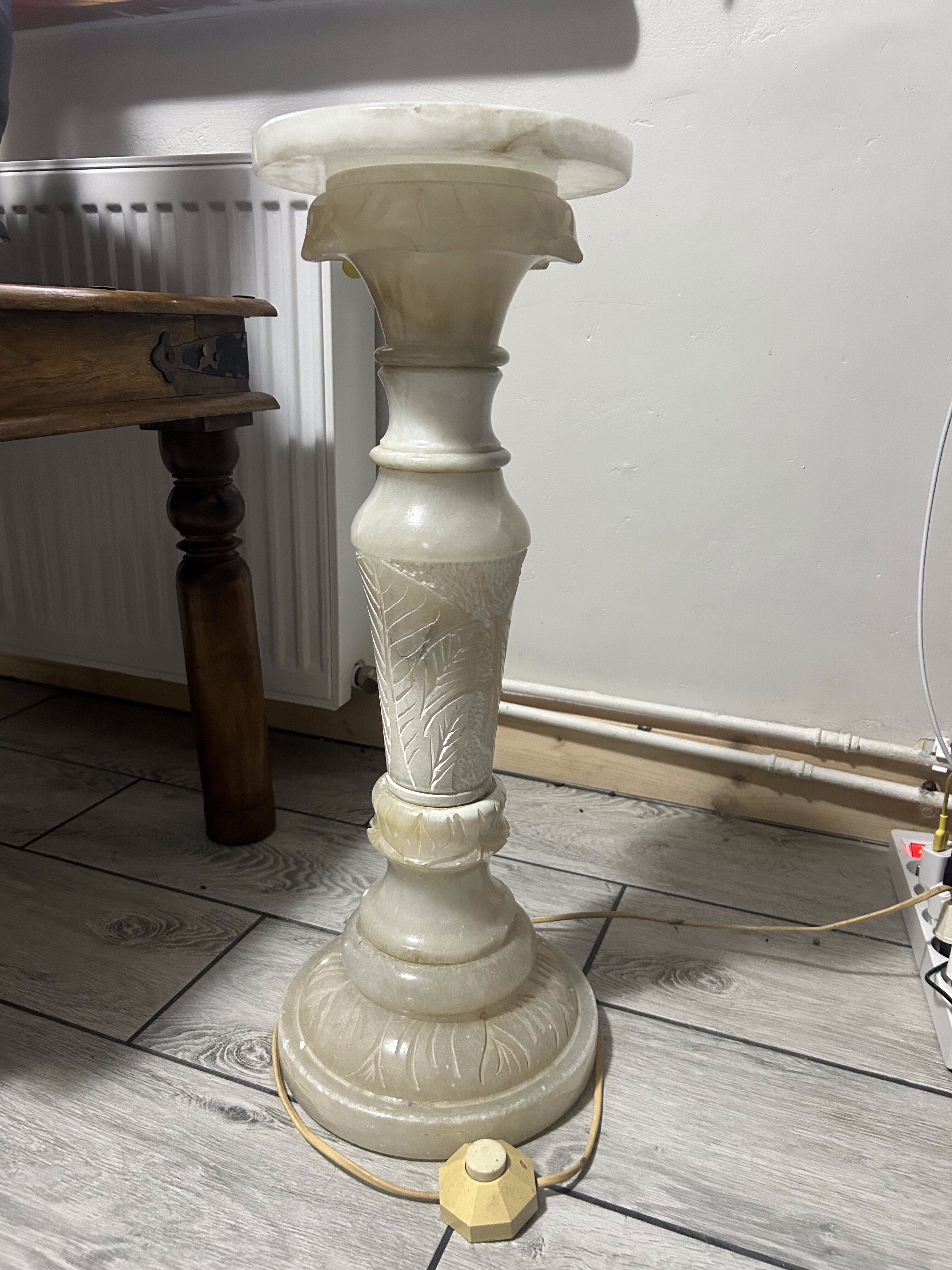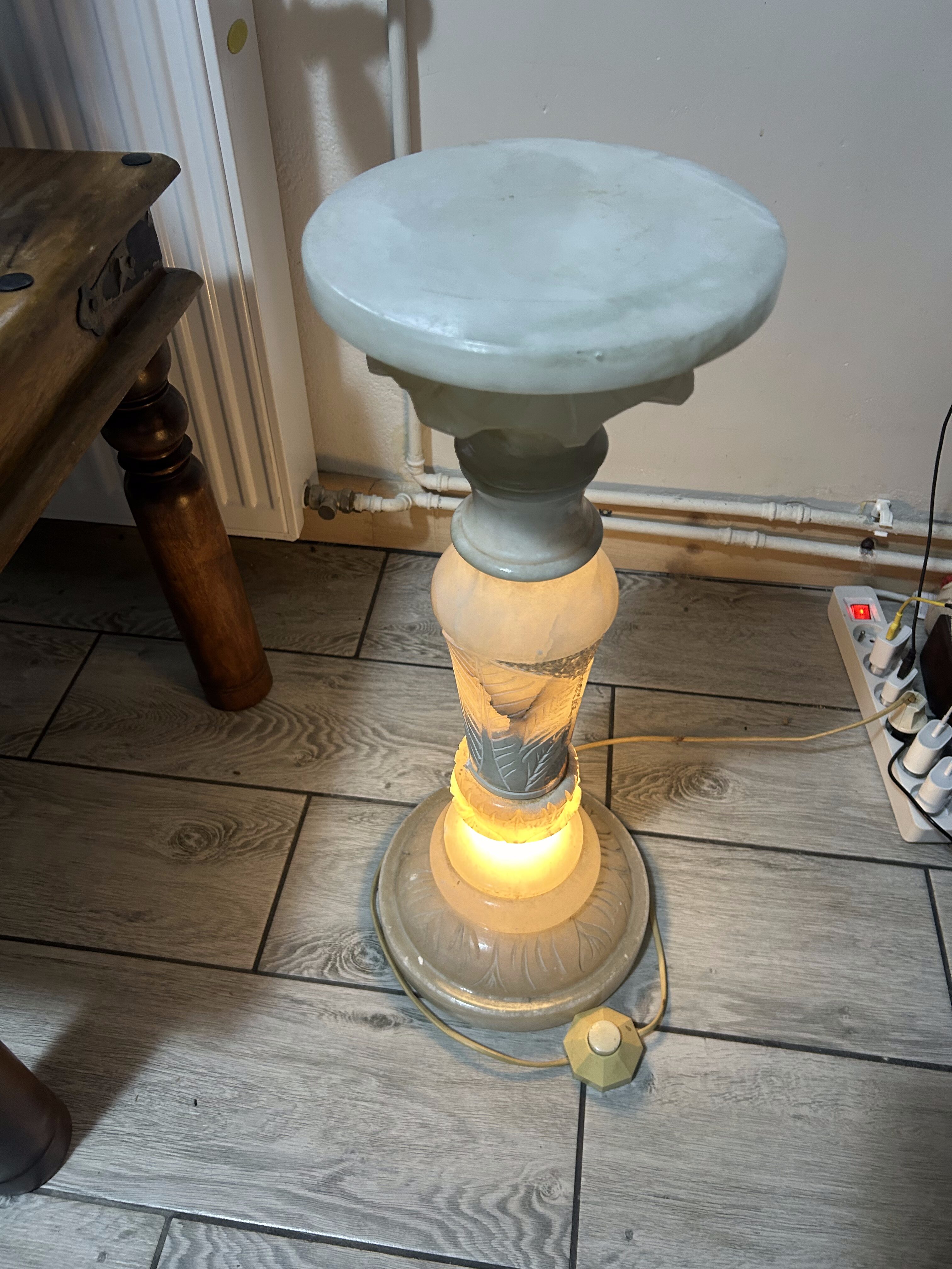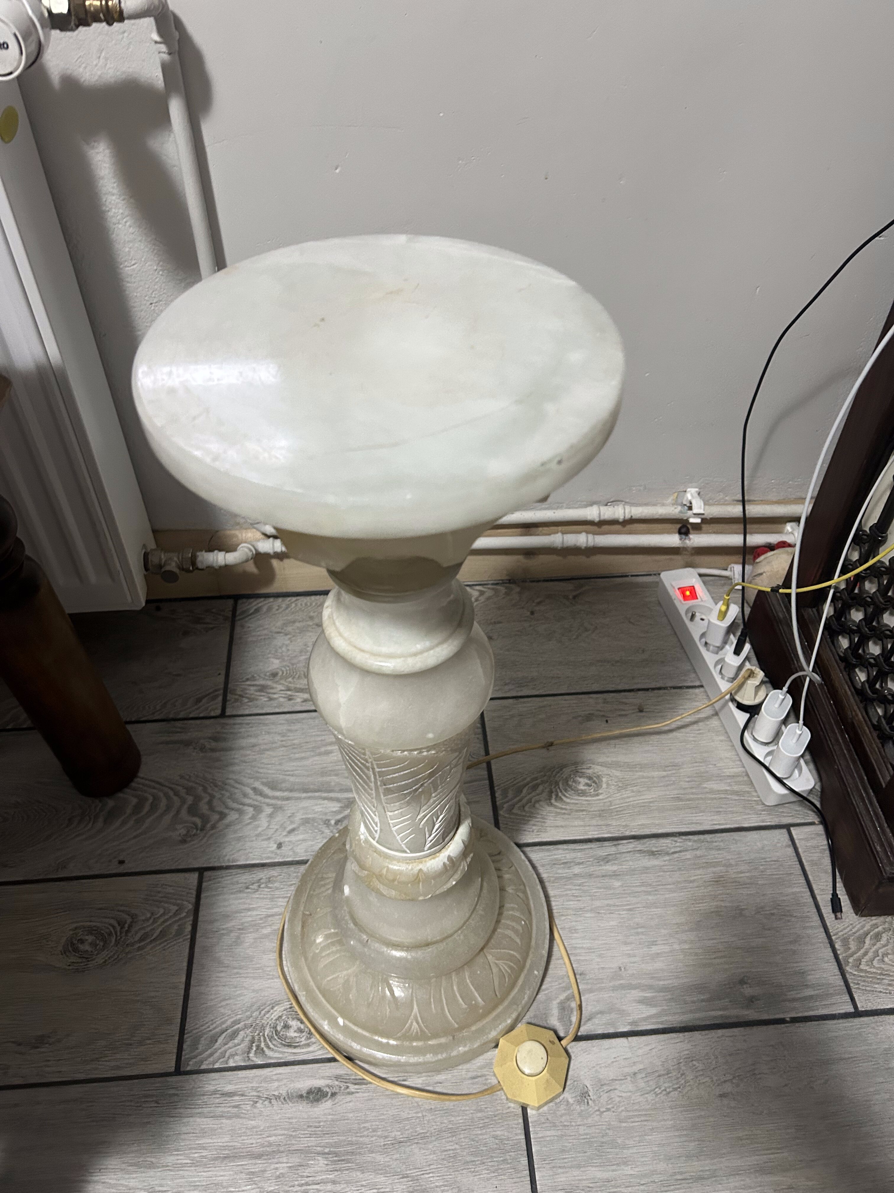 Imponująca lampa z alabastru, która doskonale odnajdzie się w eleganckim salonie, holu lub gabinecie. To przedmiot o wyraźnym charakterze, łączący funkcję użytkową z ponadczasową estetyką.