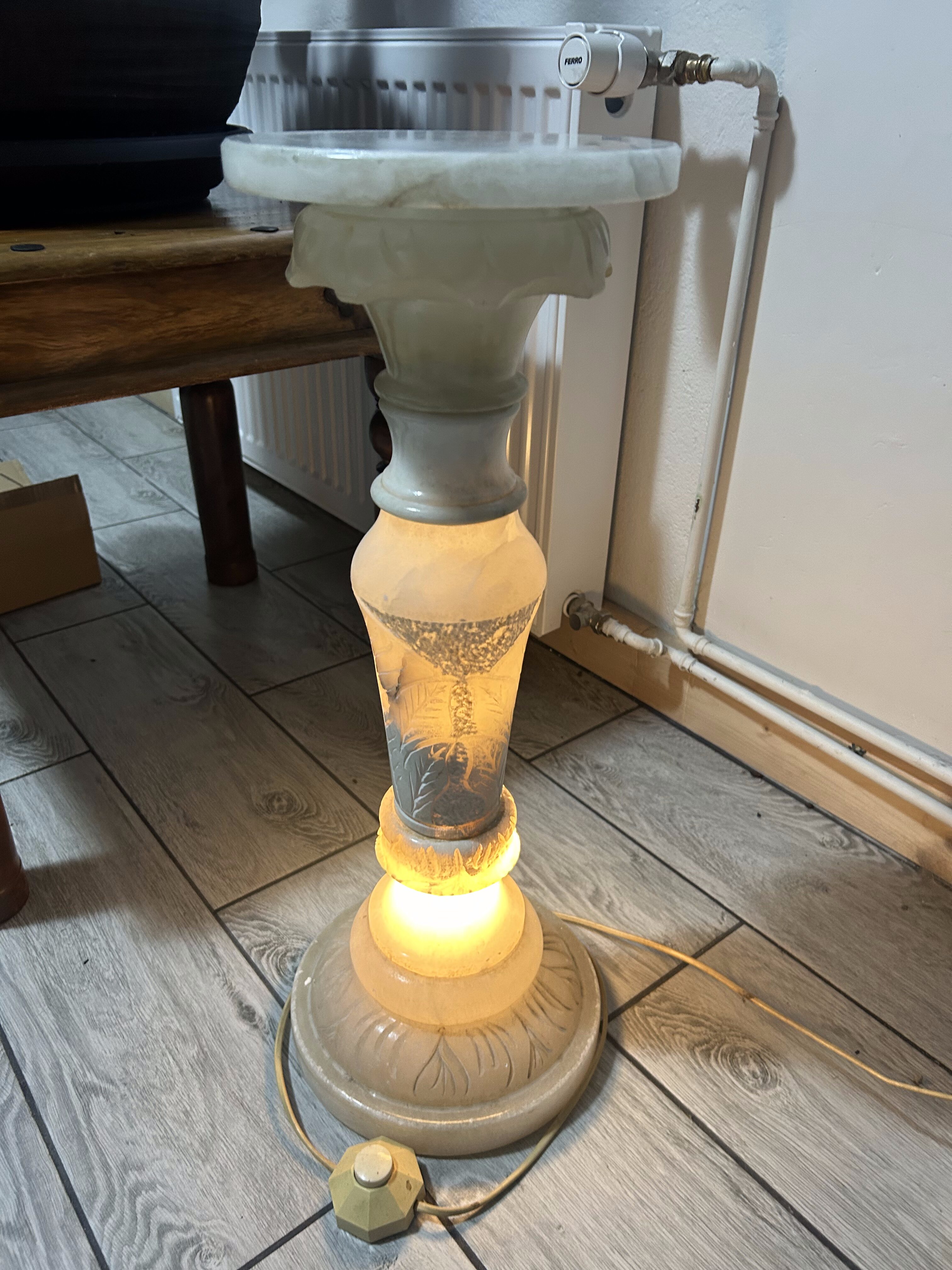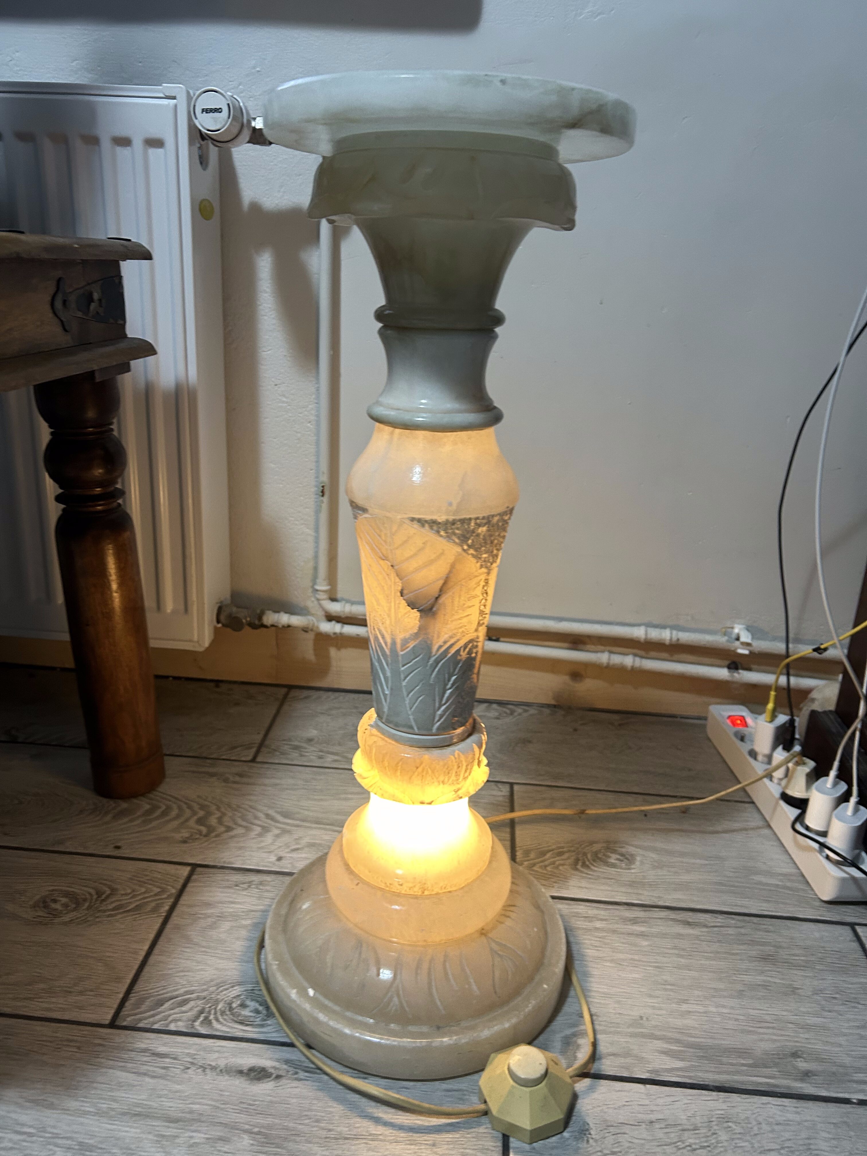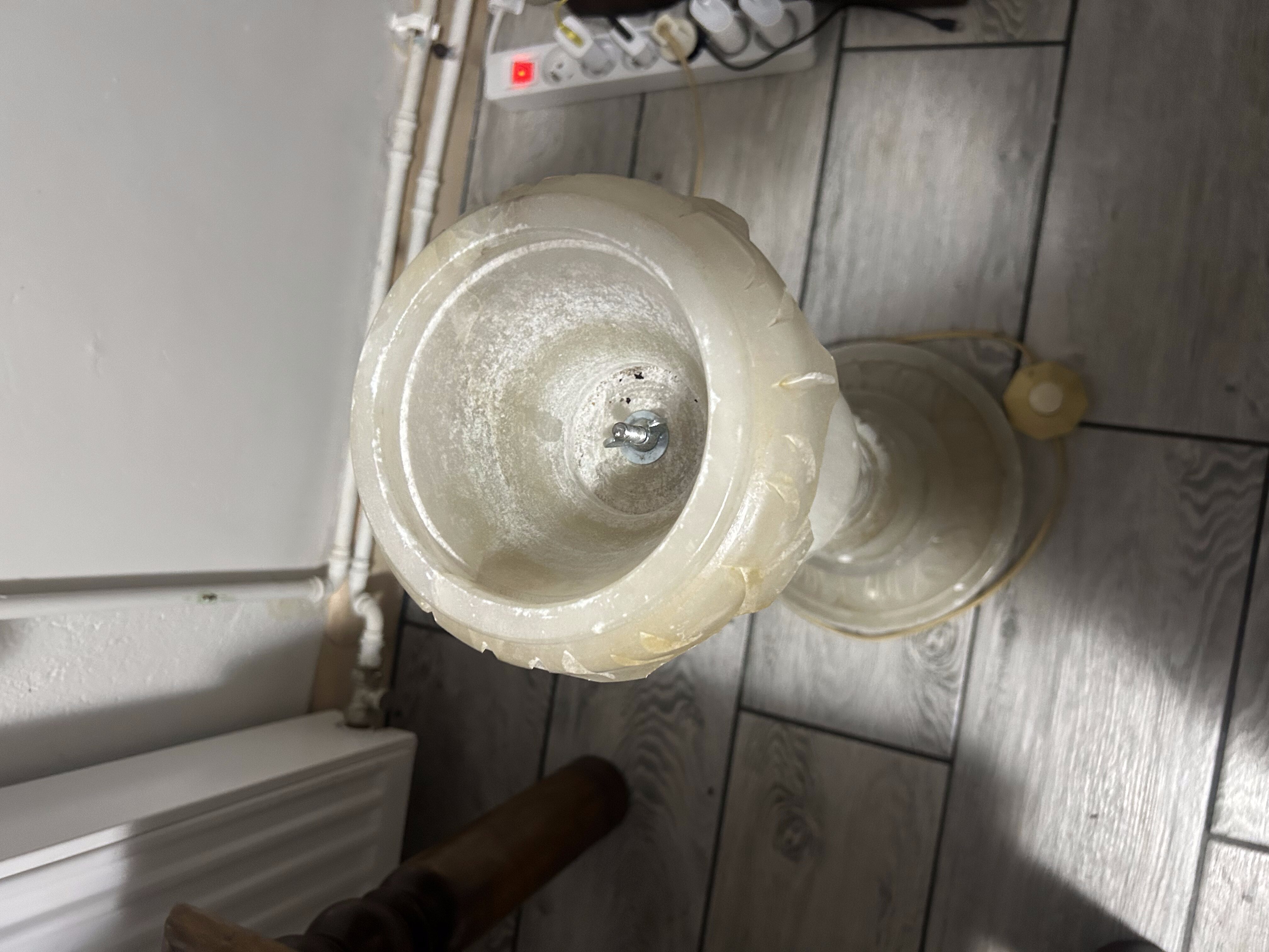 Alabaster pięknie rozprasza światło, tworząc ciepłą, nastrojową poświatę. Lampa stanowi nie tylko funkcjonalne źródło światła, ale również wyrazisty element dekoracyjny wnętrza. Widoczne jest drobne uszkodzenie alabastru – niewielkie ubytki są mało zauważalne i nie wpływają na stabilność ani użytkowanie lampy.
