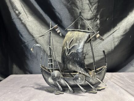 Metalowy statek – łódź wikinga z tarczami i żaglami