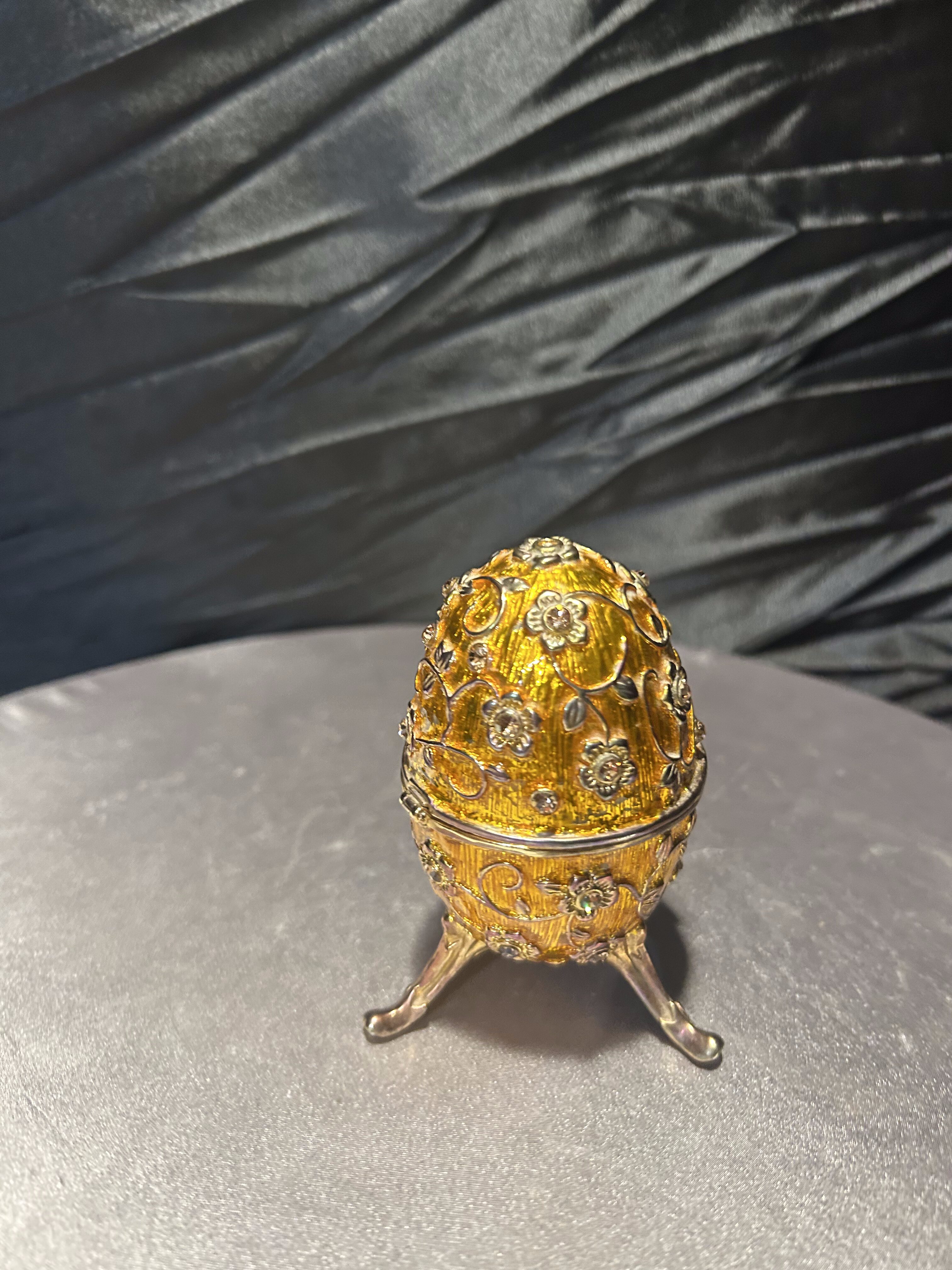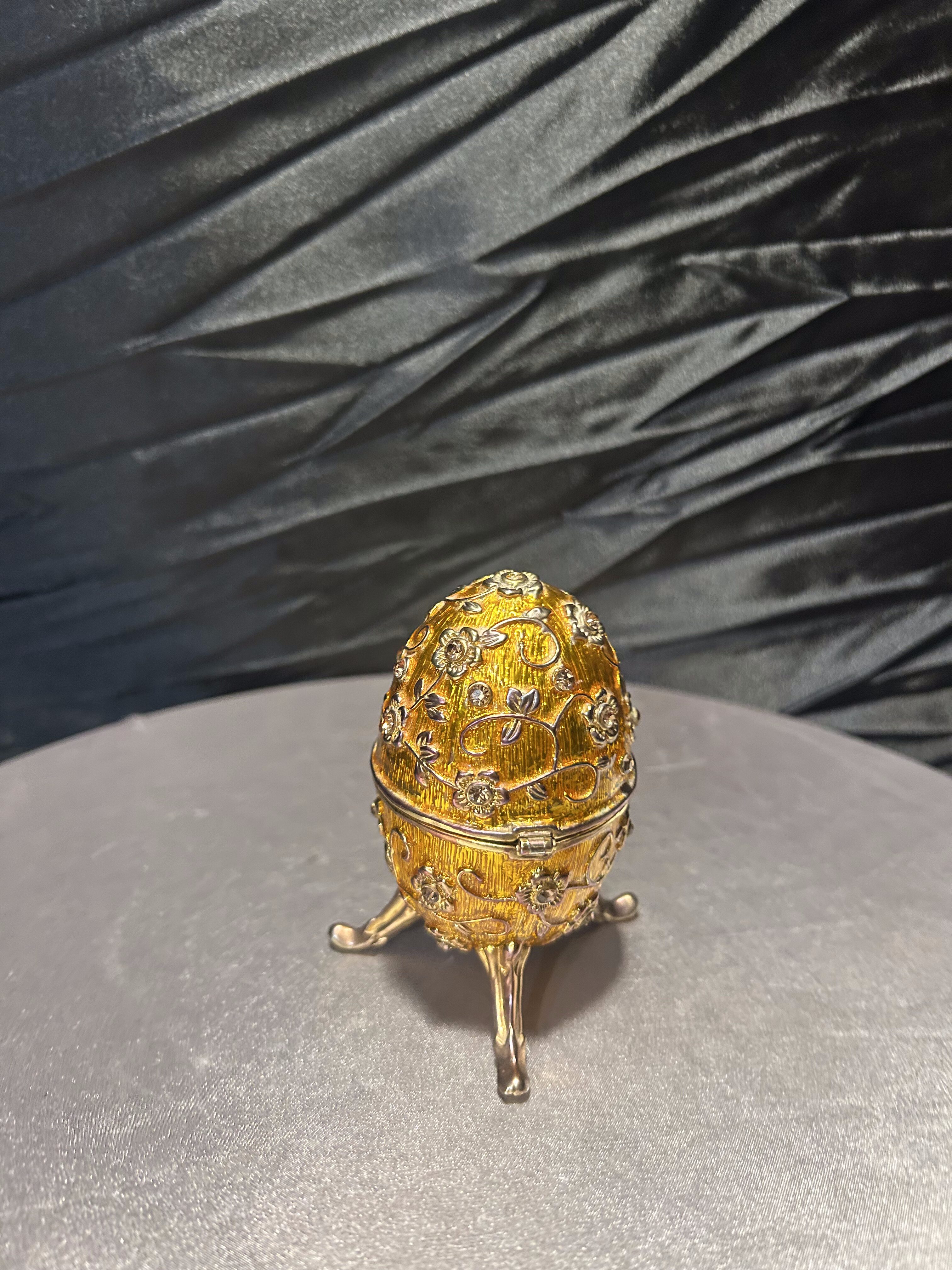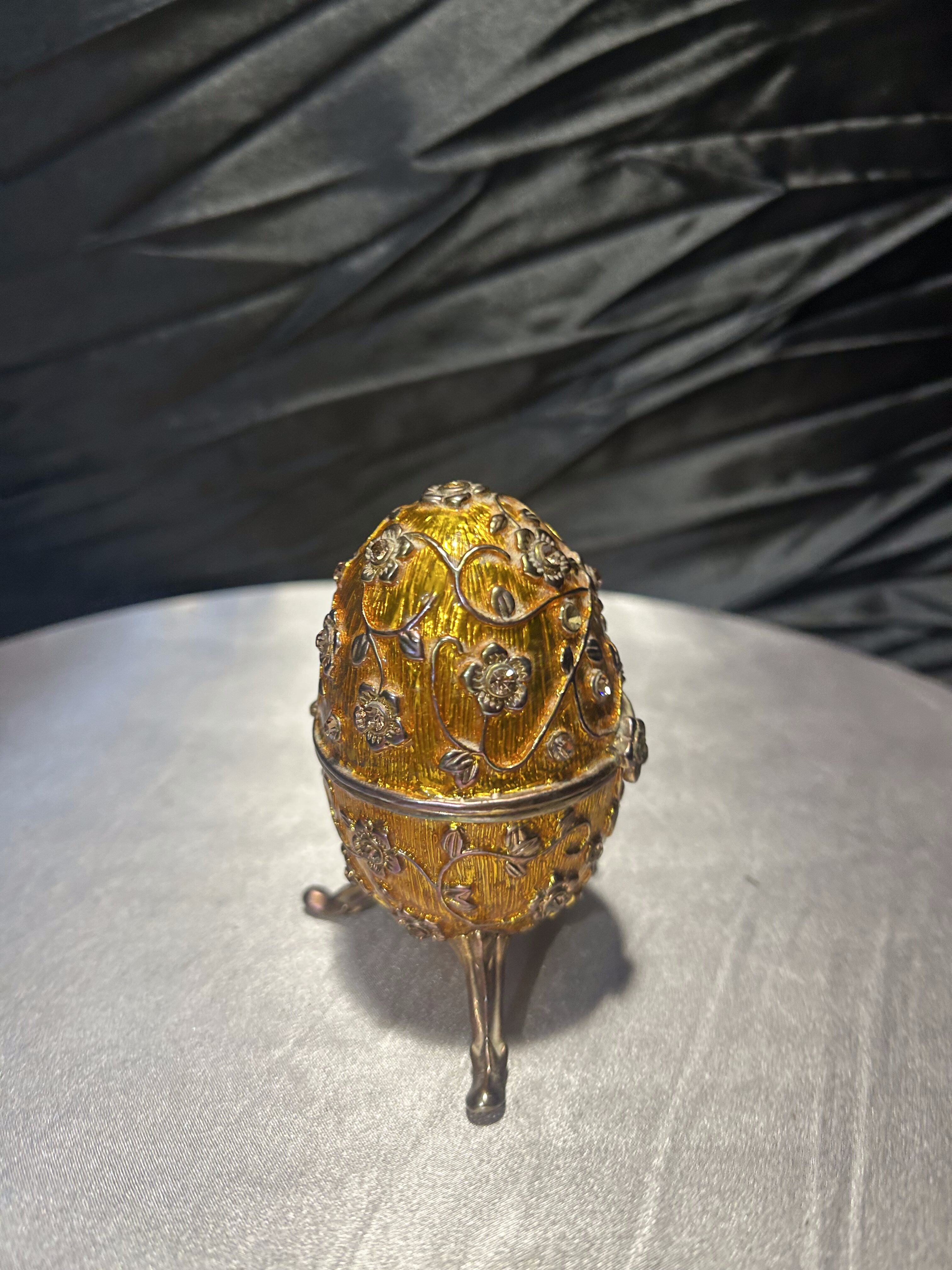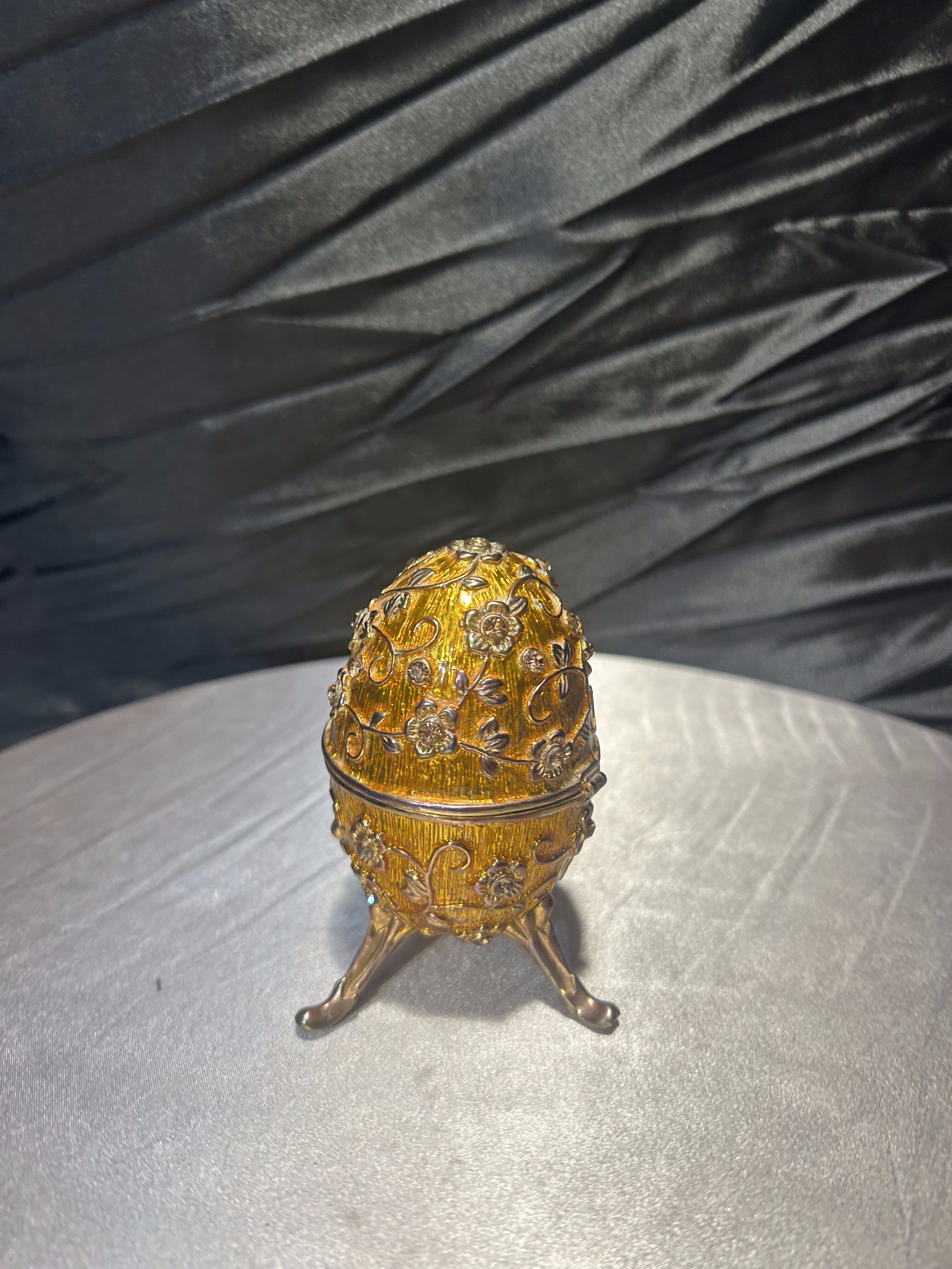 Ozdobne jajko w stylu Fabergé, wykonane z dbałością o detale, to wyjątkowy element dekoracyjny, który podkreśli elegancję każdego wnętrza. Utrzymane w złocistym odcieniu, bogato zdobione motywami kwiatowymi i osadzone na finezyjnej, trójnożnej podstawie. Jajko posiada otwierane wieczko, dzięki czemu może służyć jako elegancki schowek na drobiazgi czy biżuterię. Doskonały przedmiot kolekcjonerski, jak i luksusowa dekoracja inspirowana słynnymi carskimi klejnotami.