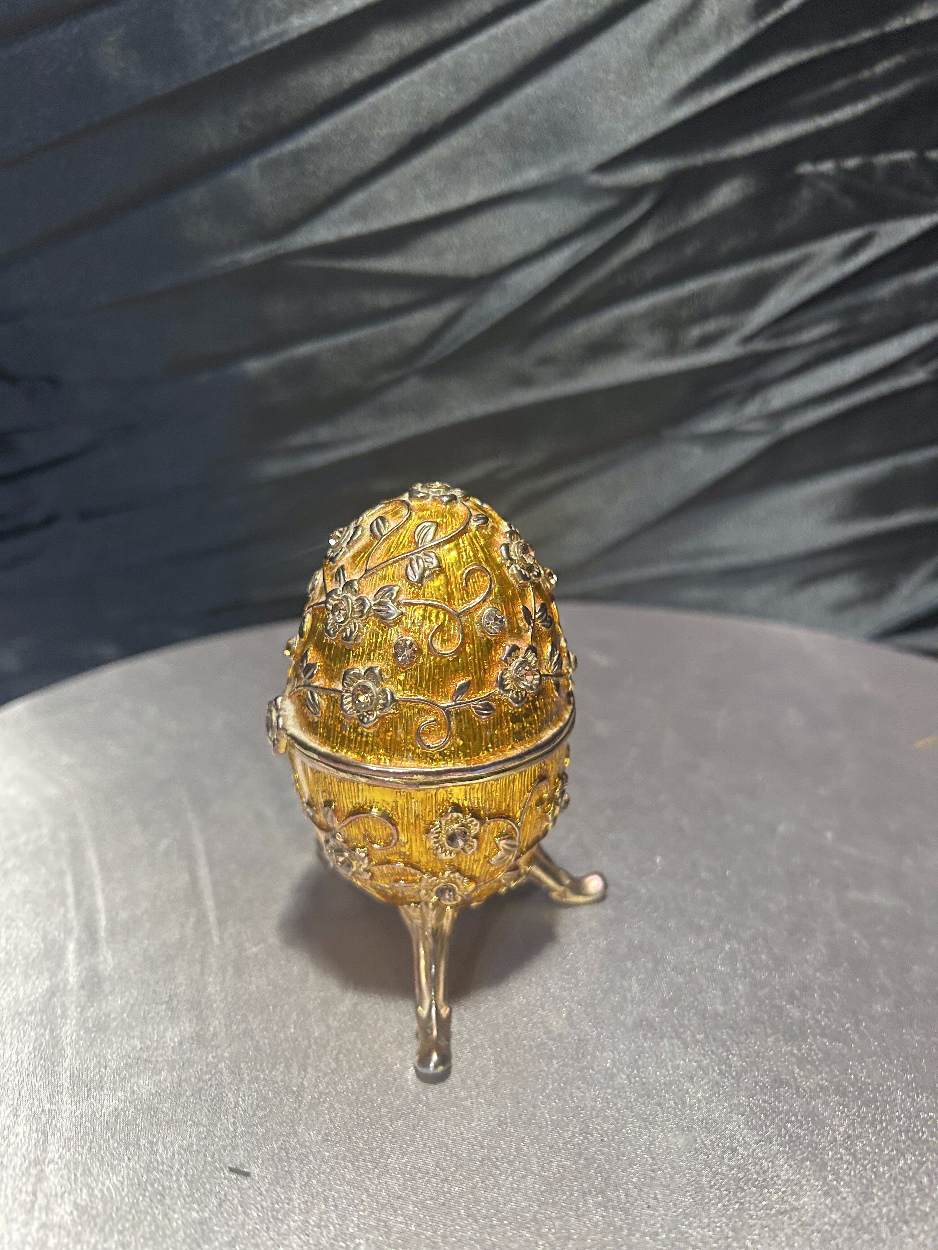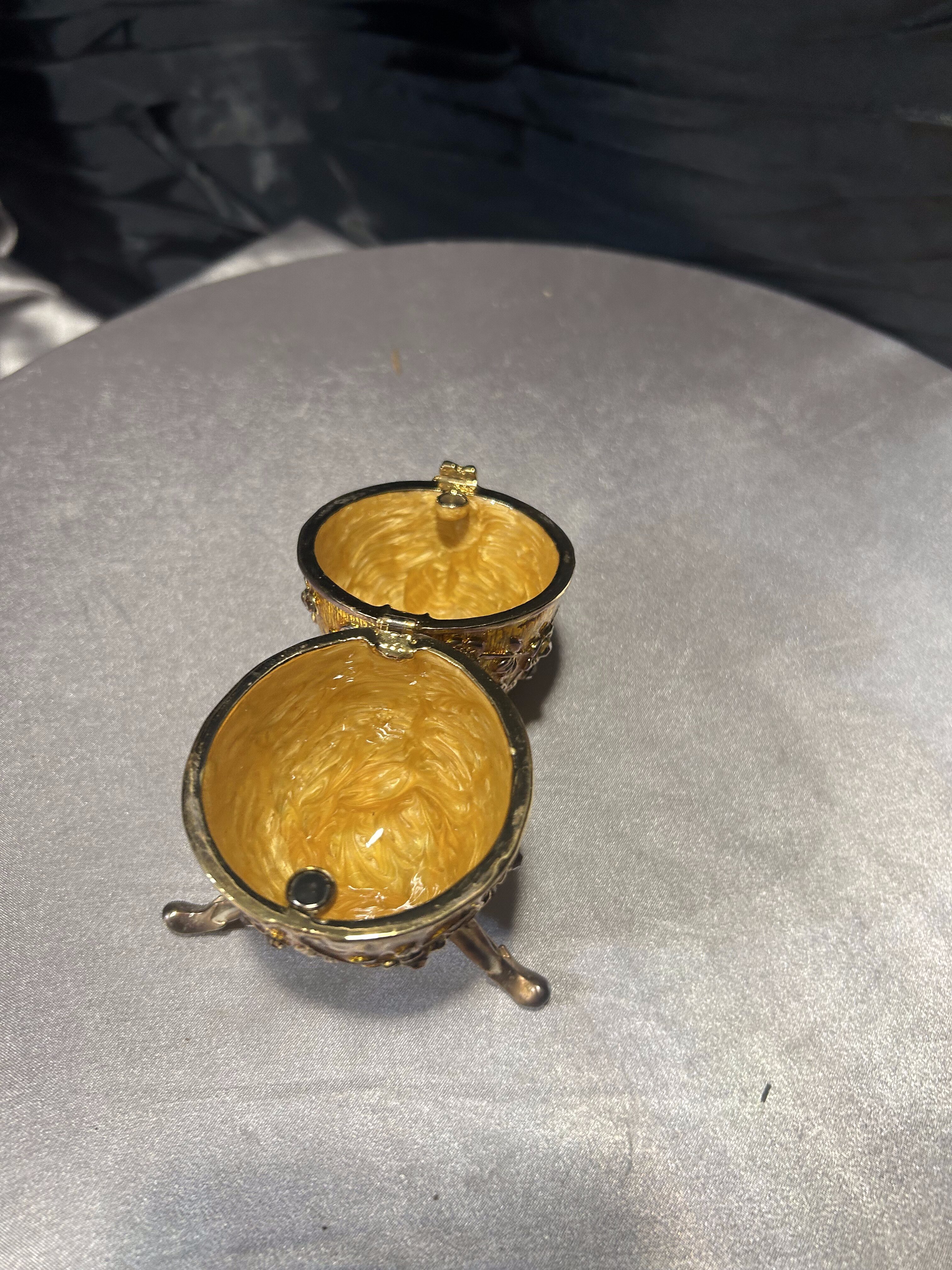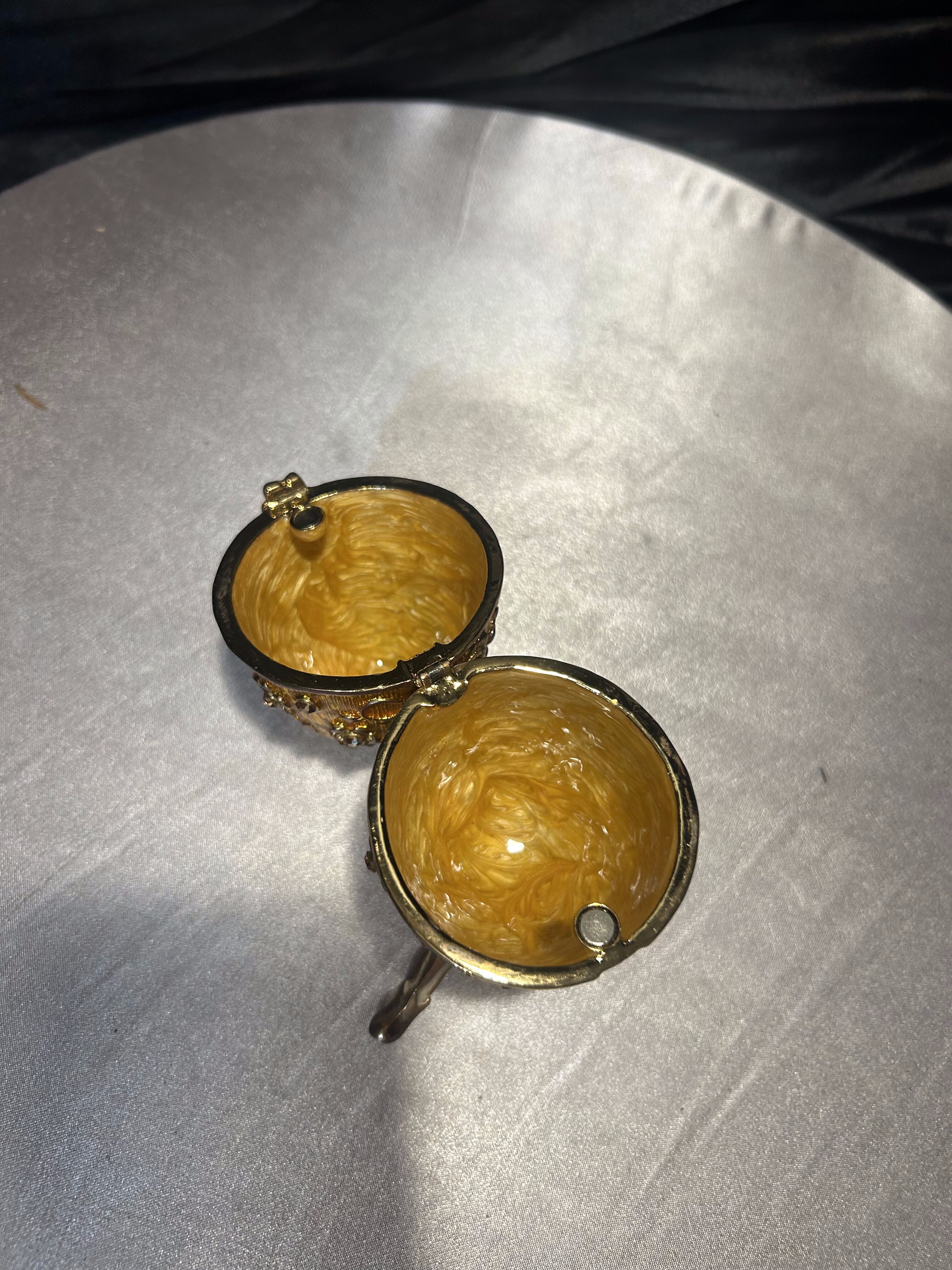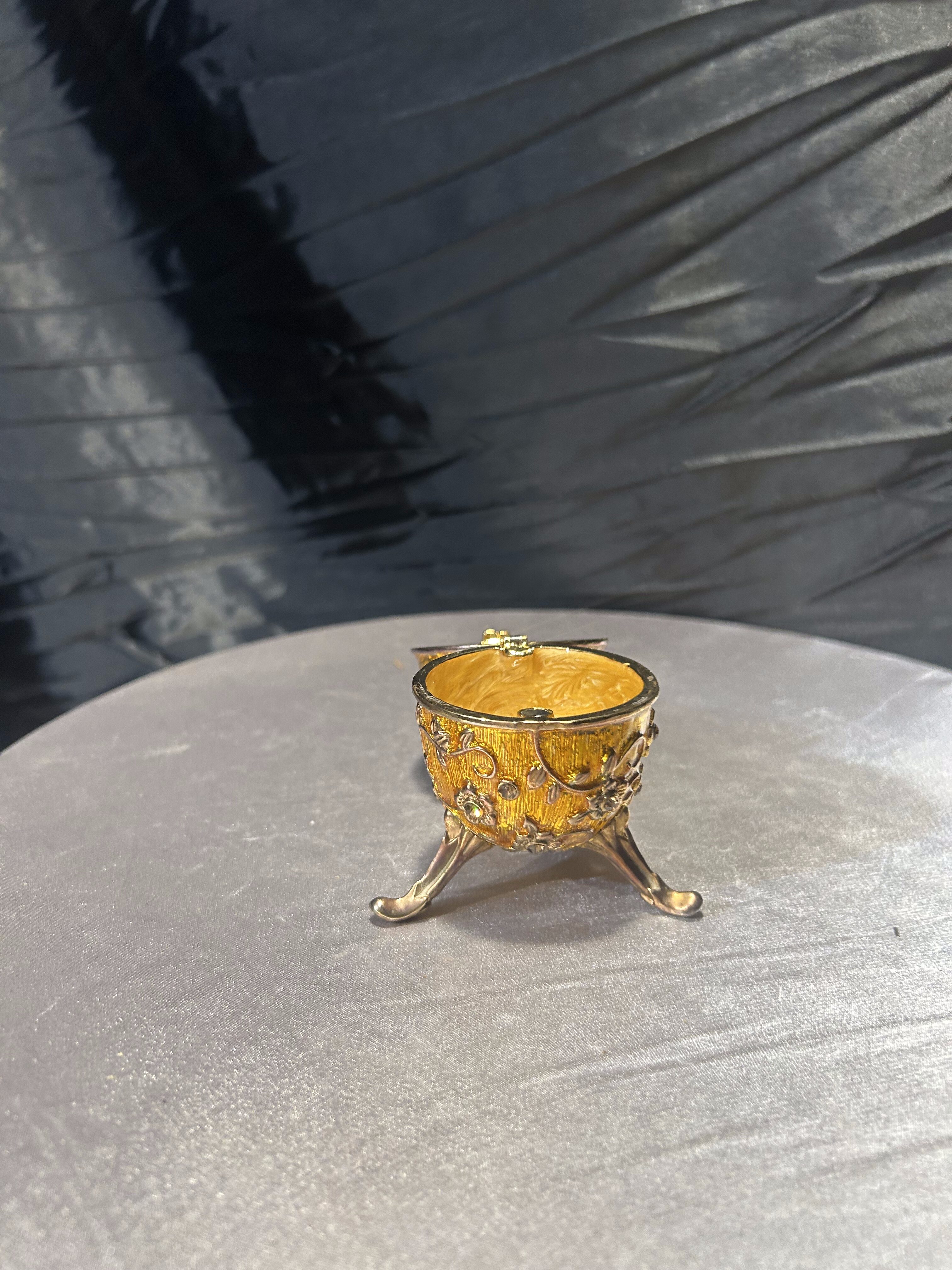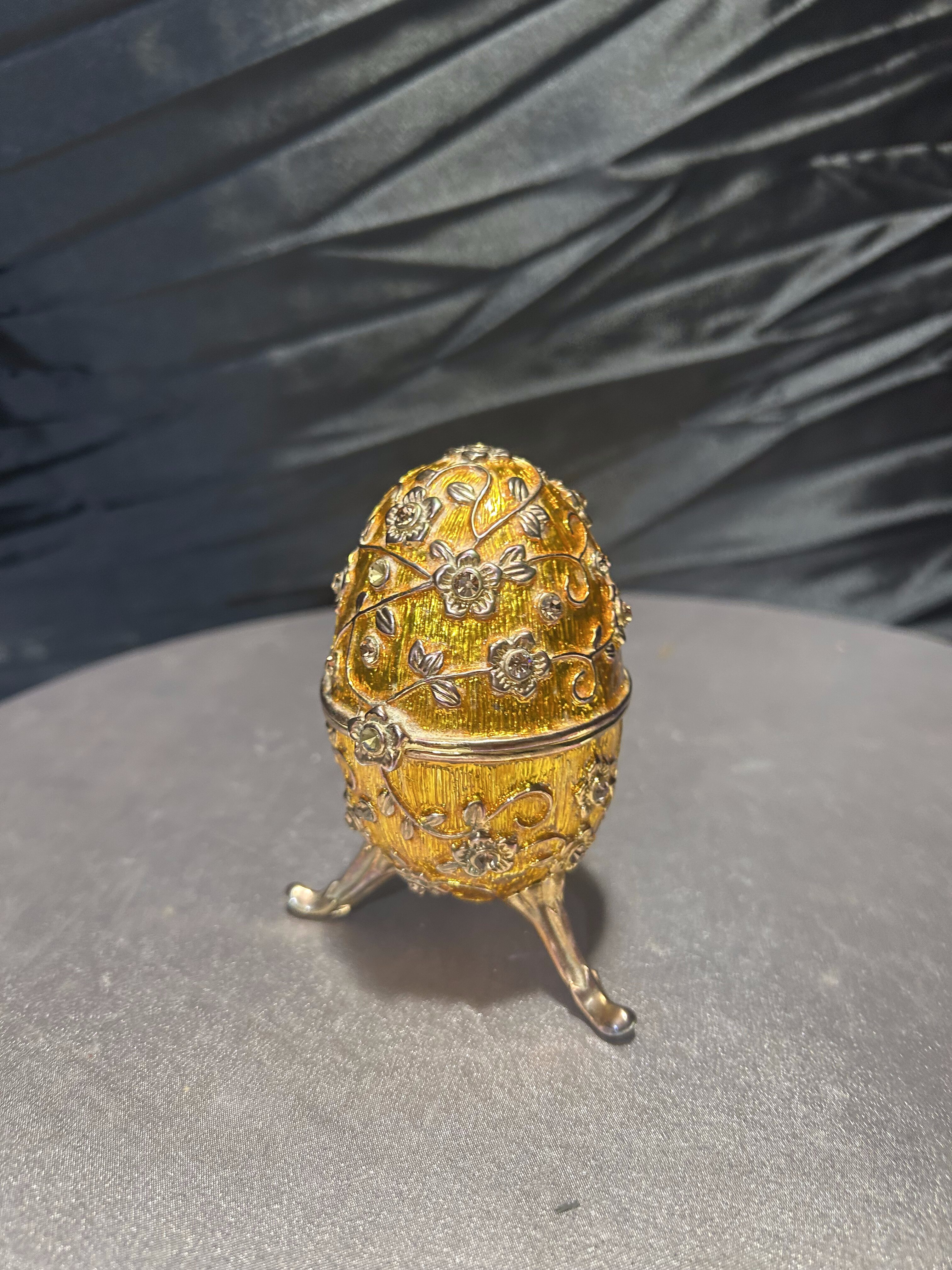 Ozdobne jajko w stylu Fabergé, wykonane z dbałością o detale, to wyjątkowy element dekoracyjny, który podkreśli elegancję każdego wnętrza. Utrzymane w złocistym odcieniu, bogato zdobione motywami kwiatowymi i osadzone na finezyjnej, trójnożnej podstawie. Jajko posiada otwierane wieczko, dzięki czemu może służyć jako elegancki schowek na drobiazgi czy biżuterię. Doskonały przedmiot kolekcjonerski, jak i luksusowa dekoracja inspirowana słynnymi carskimi klejnotami.