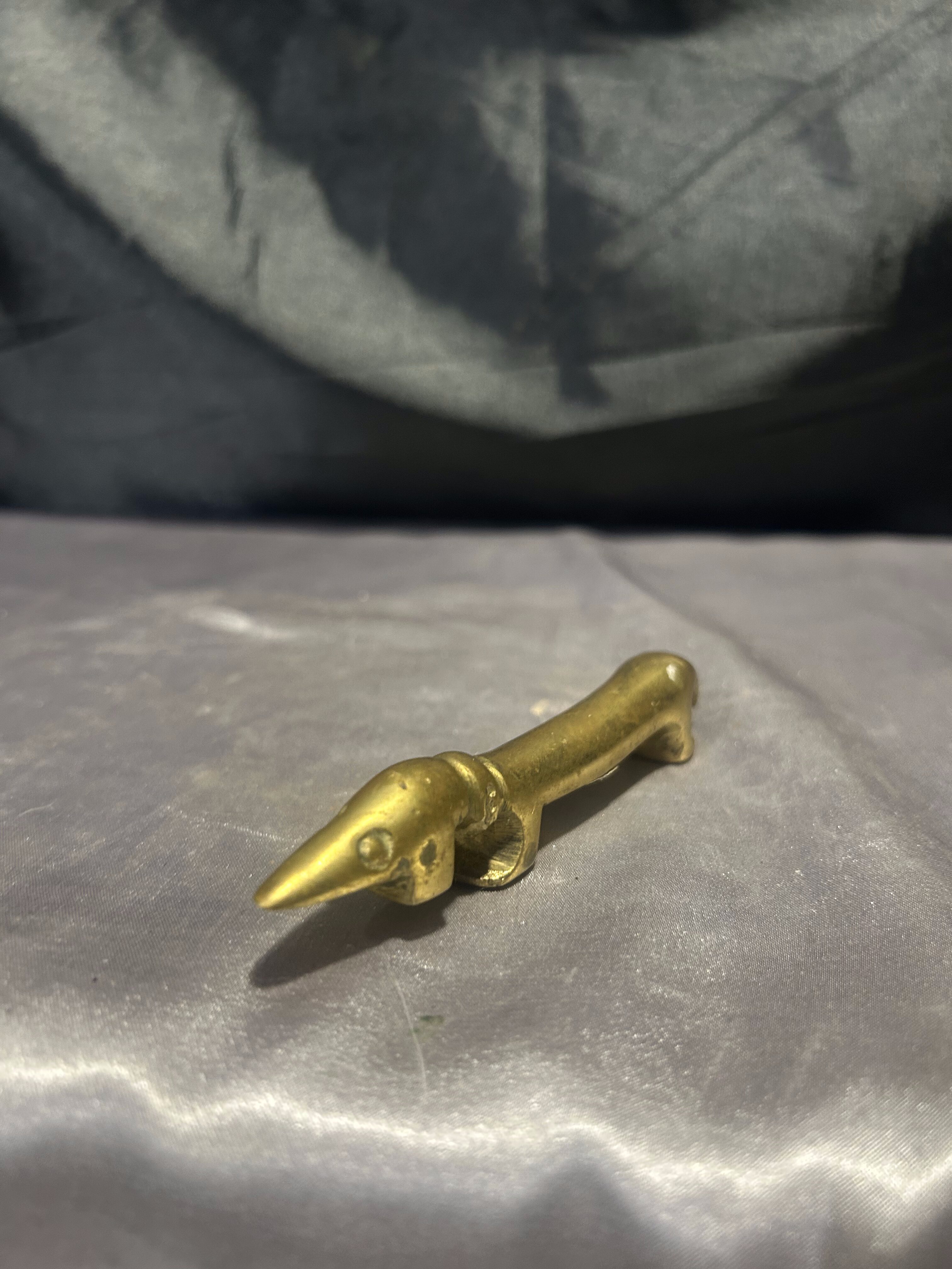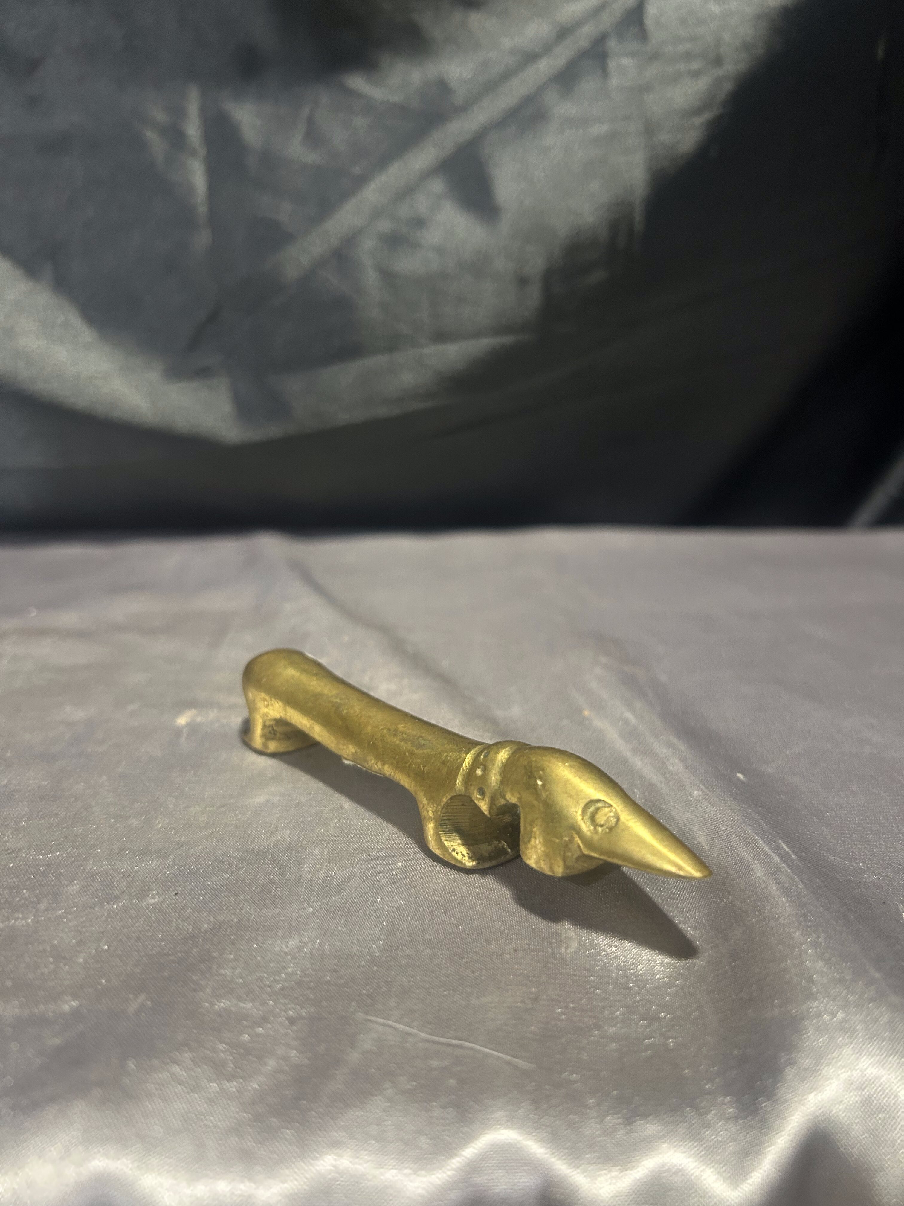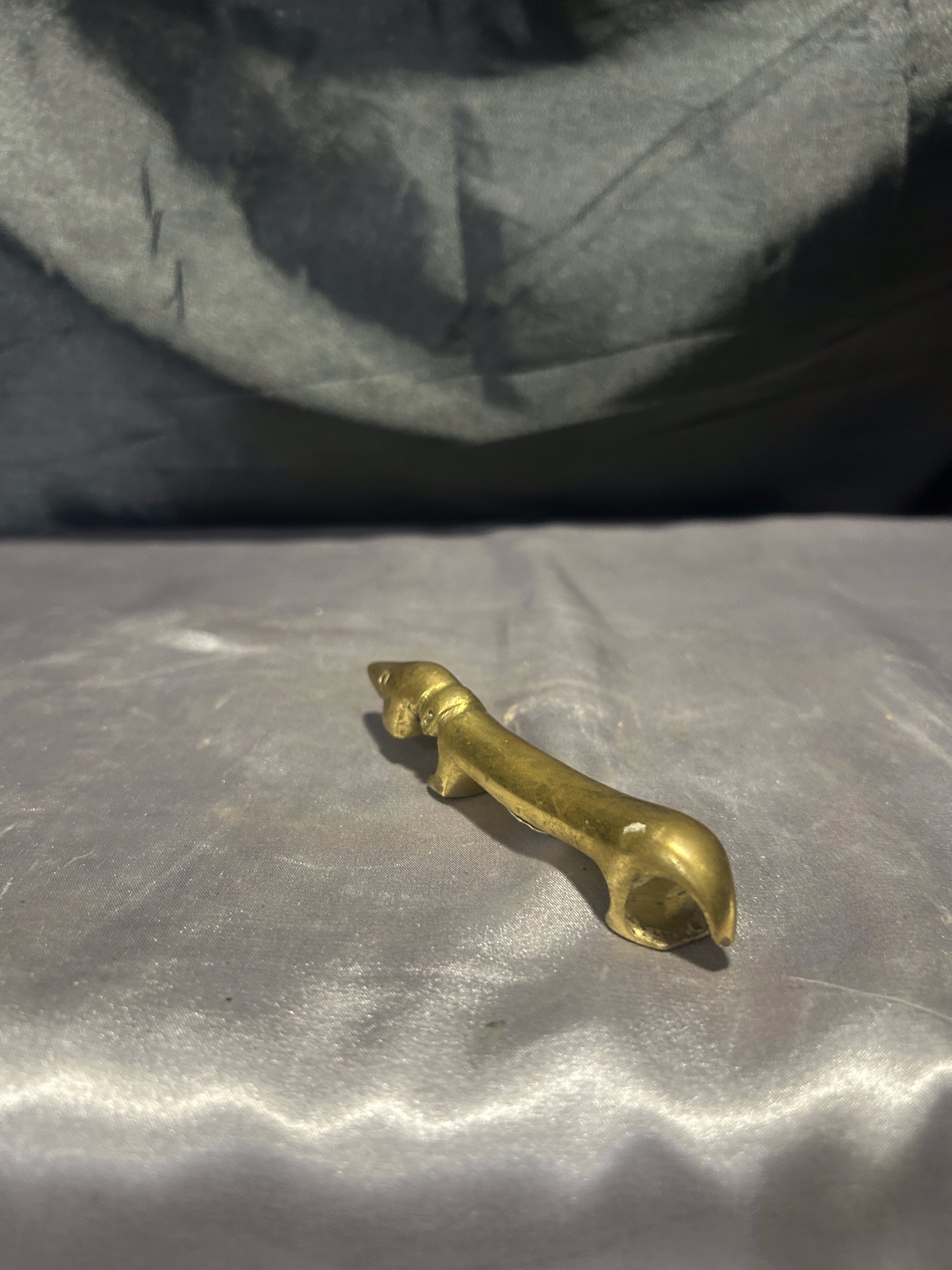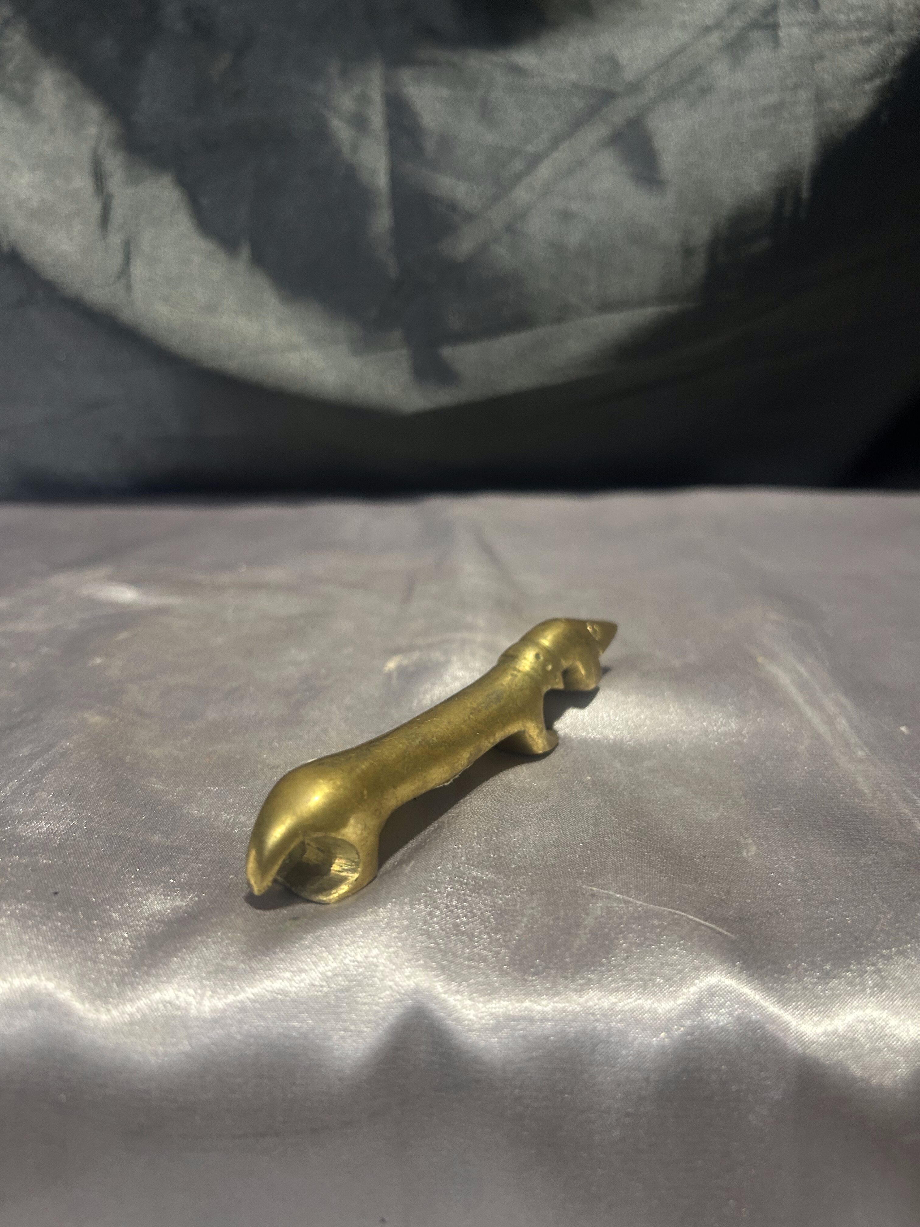 Uroczy otwieracz do butelek w formie jamnika, wykonany z litego mosiądzu. Figurka łączy funkcję praktyczną z ozdobną – pełni rolę zarówno stylowego narzędzia barowego, jak i dekoracyjnego drobiazgu z charakterem.