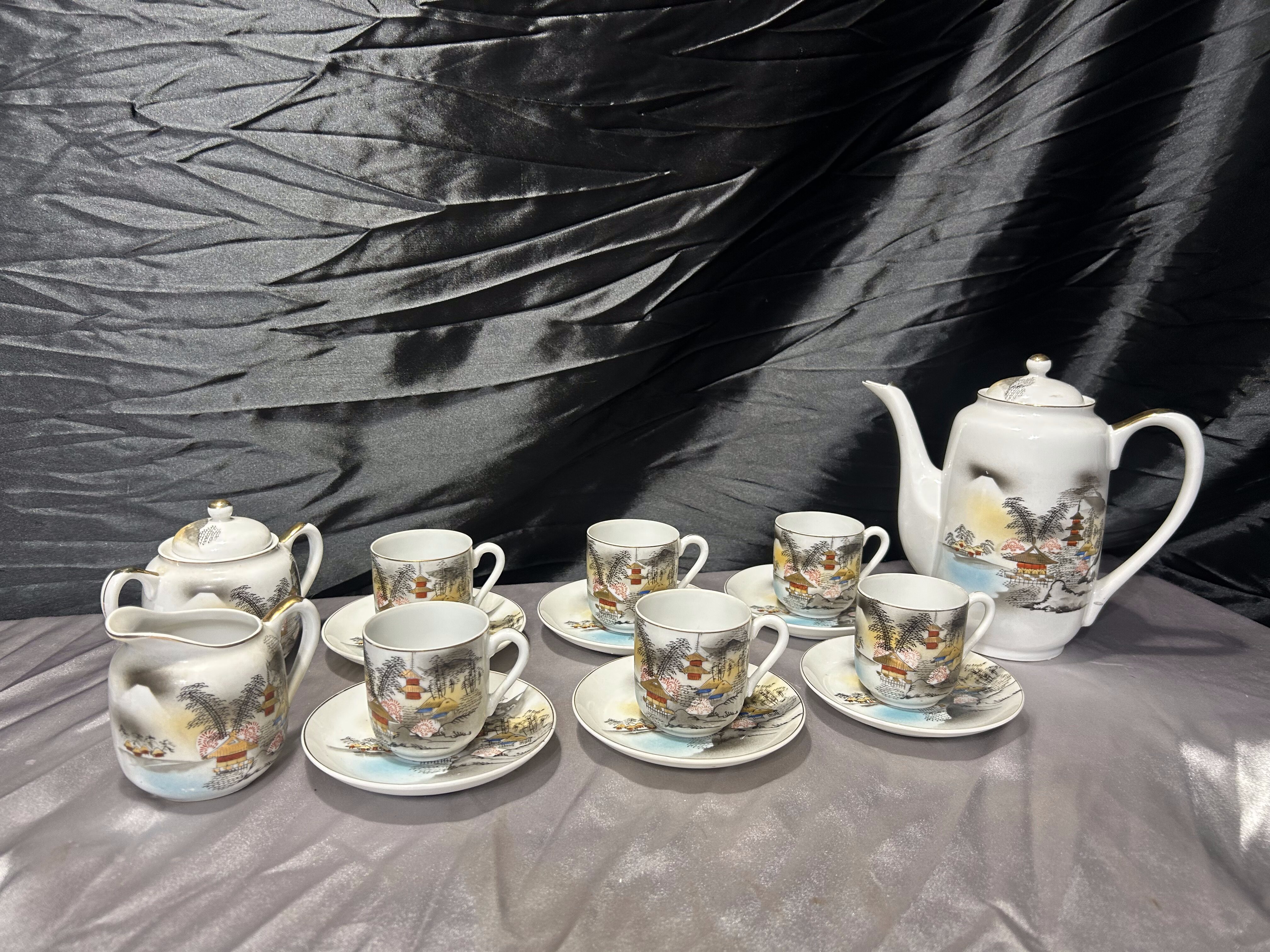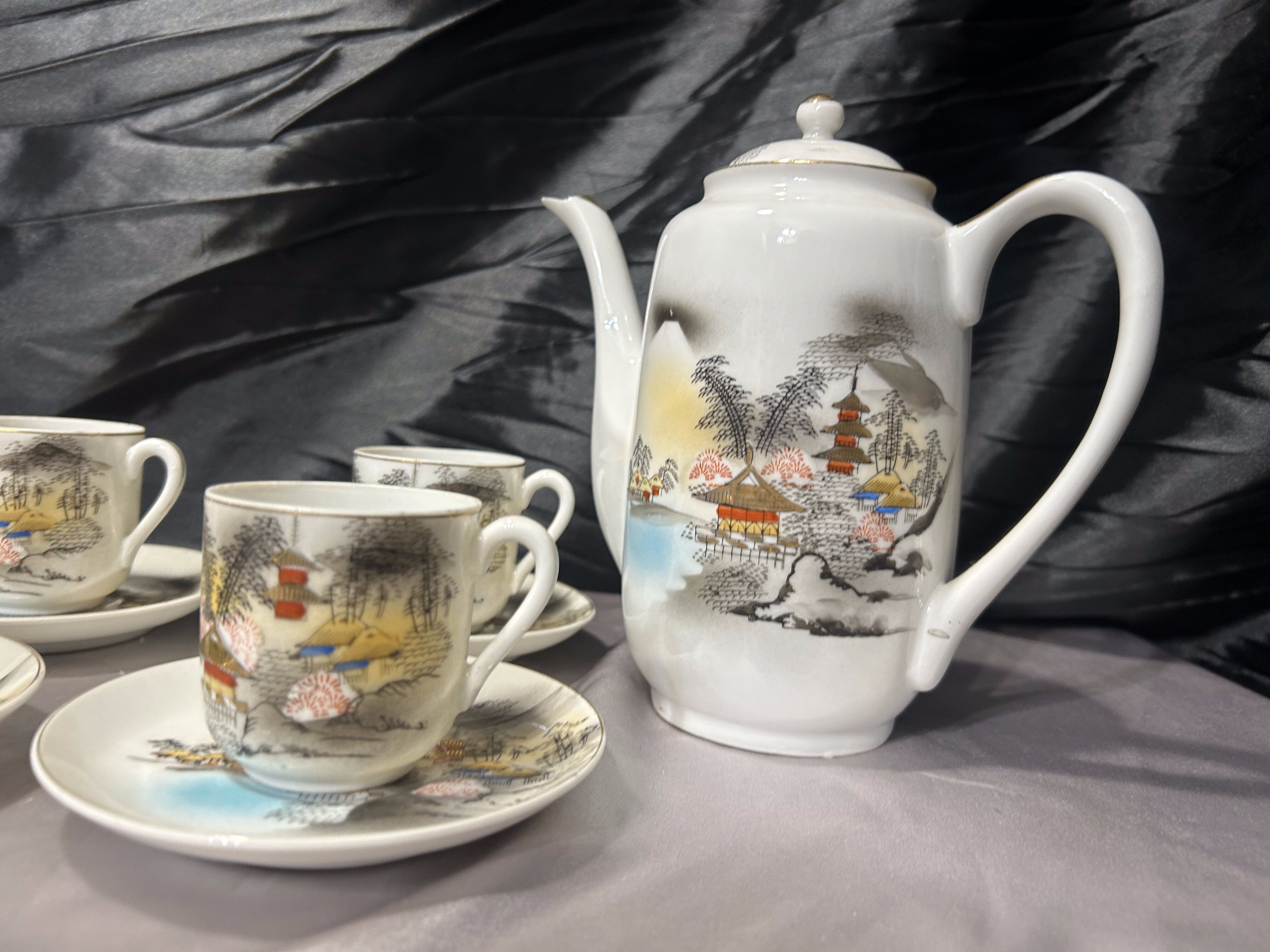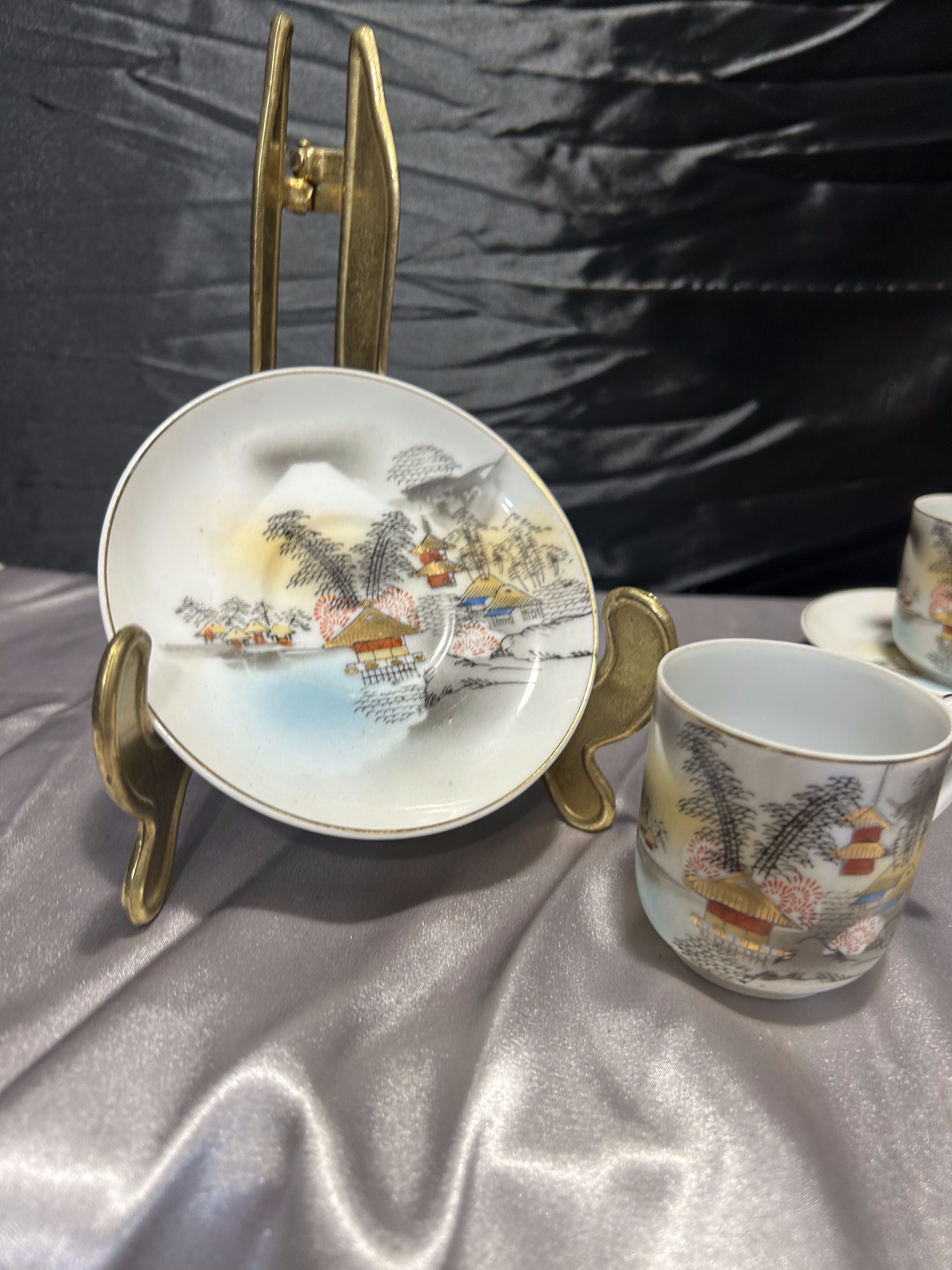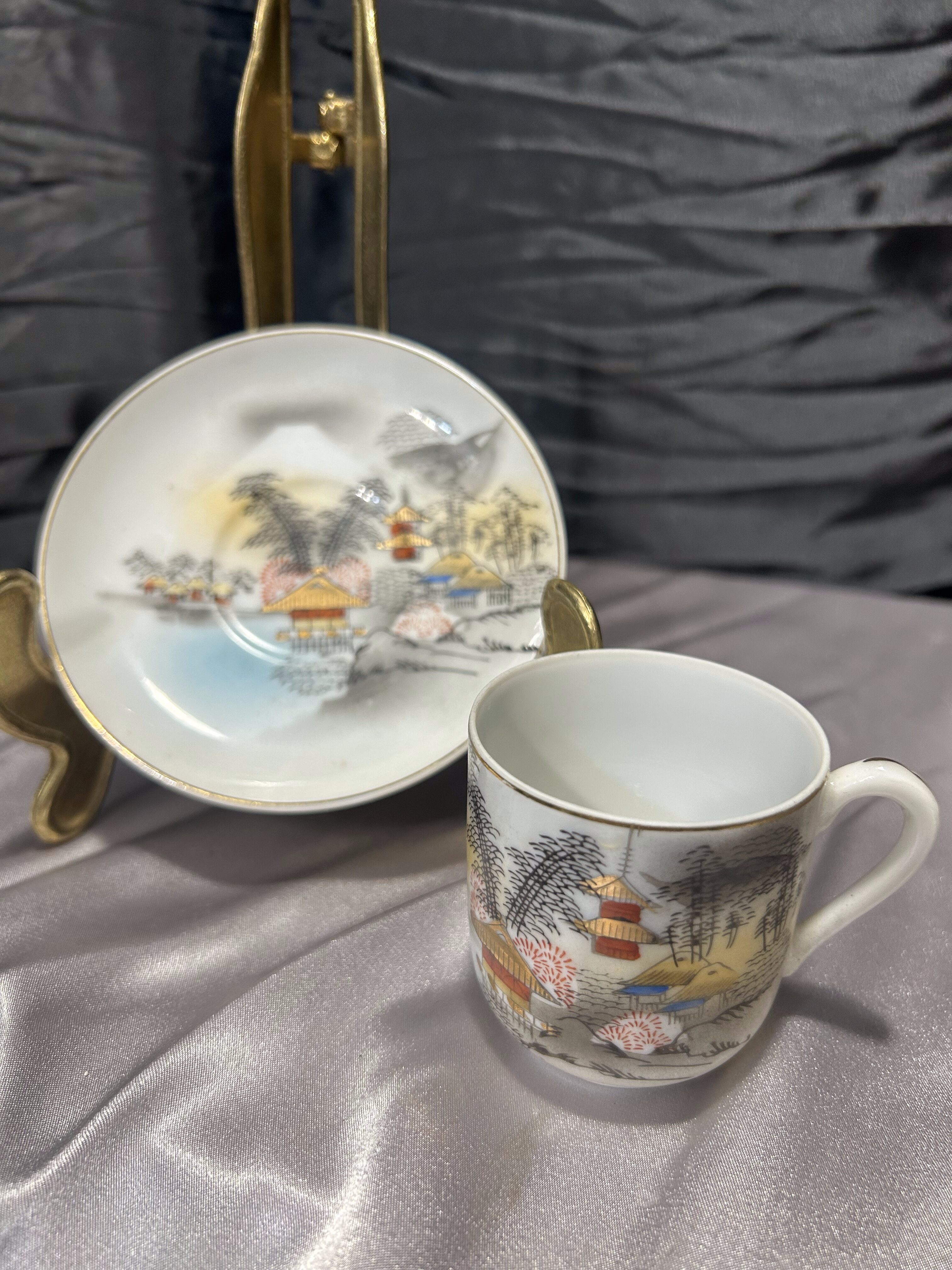 Wyjątkowy, dekoracyjny zestaw porcelany w stylu Kutani, pochodzący z Japonii. Klasyczne filiżanki z podstawkami oraz uzupełniające naczynia zdobione są ręcznie malowanymi pejzażami inspirowanymi japońską estetyką – pagody, drzewa, architektura i delikatne przejścia kolorystyczne.