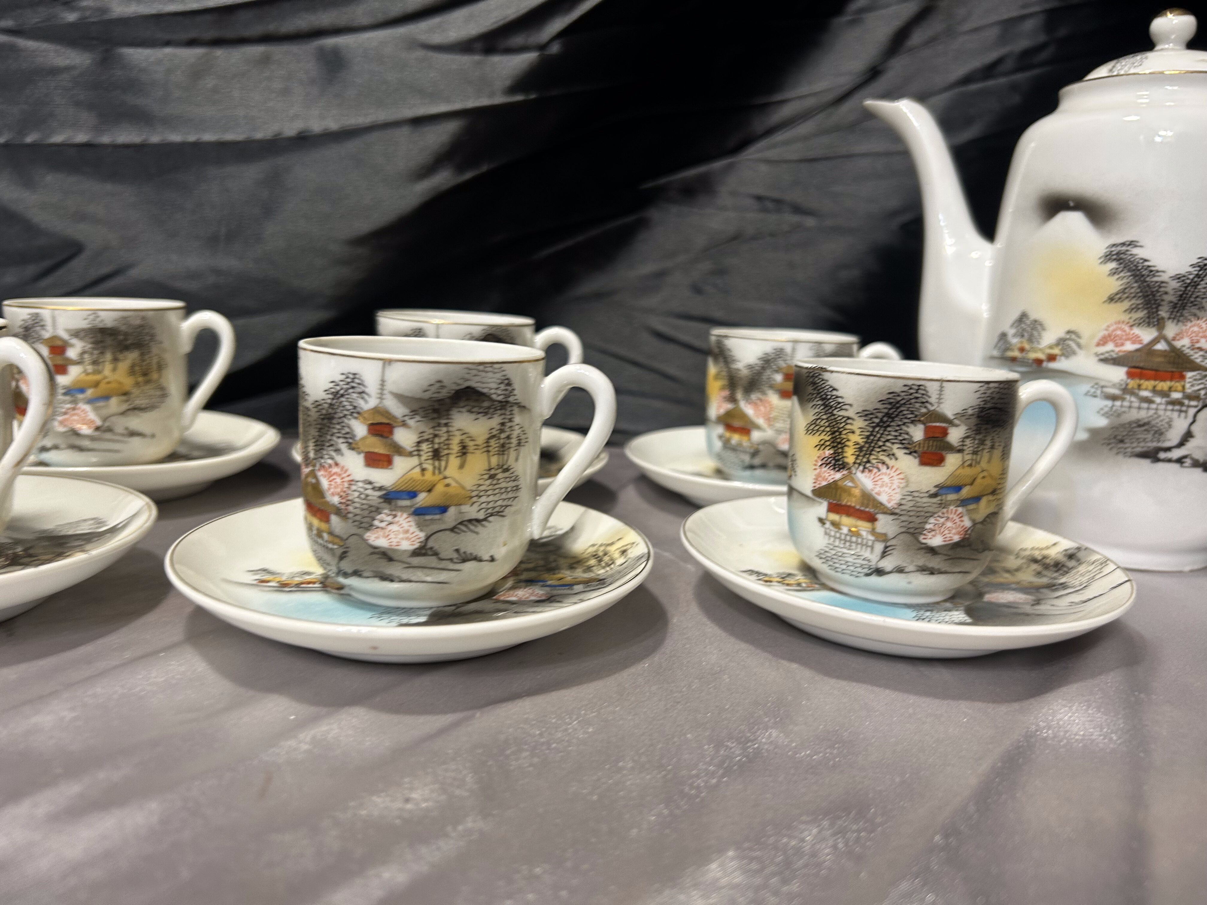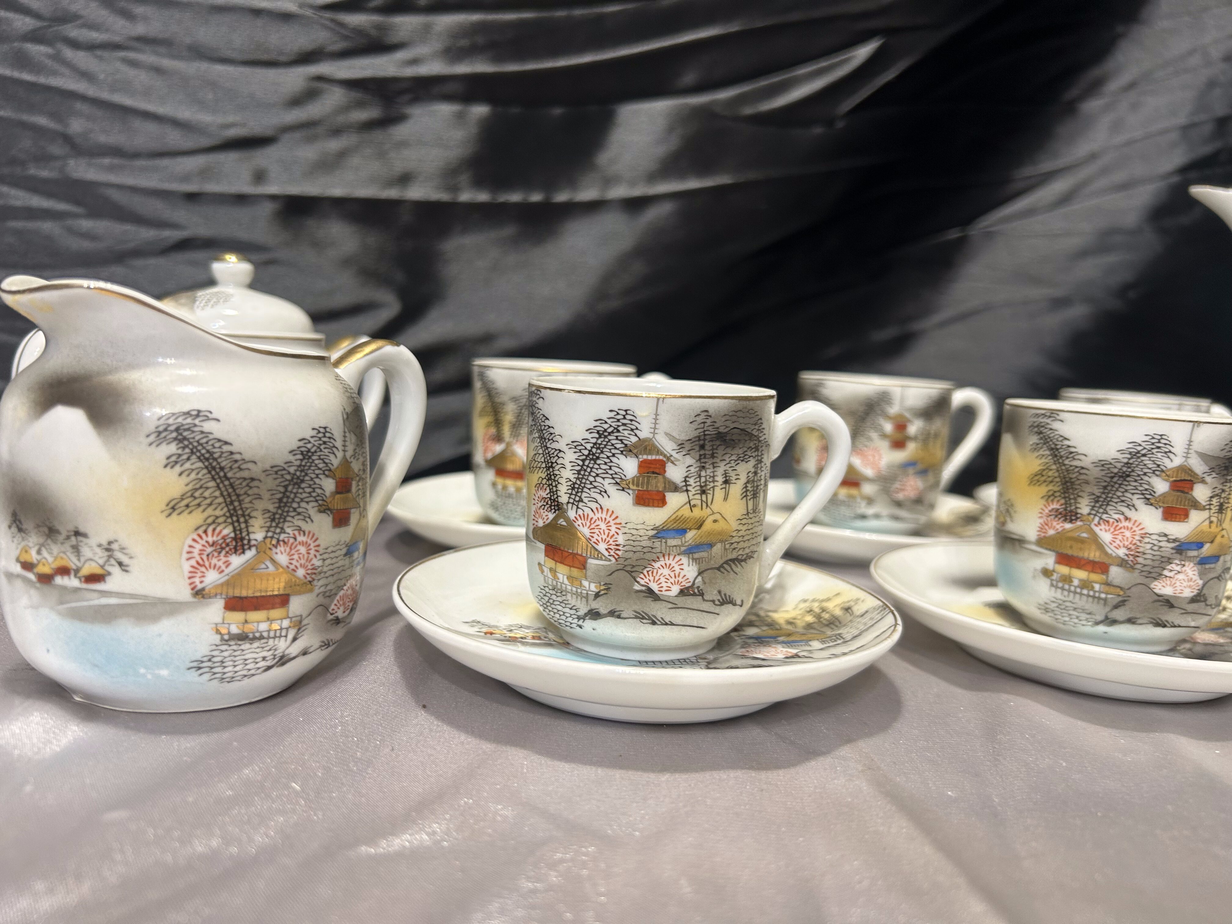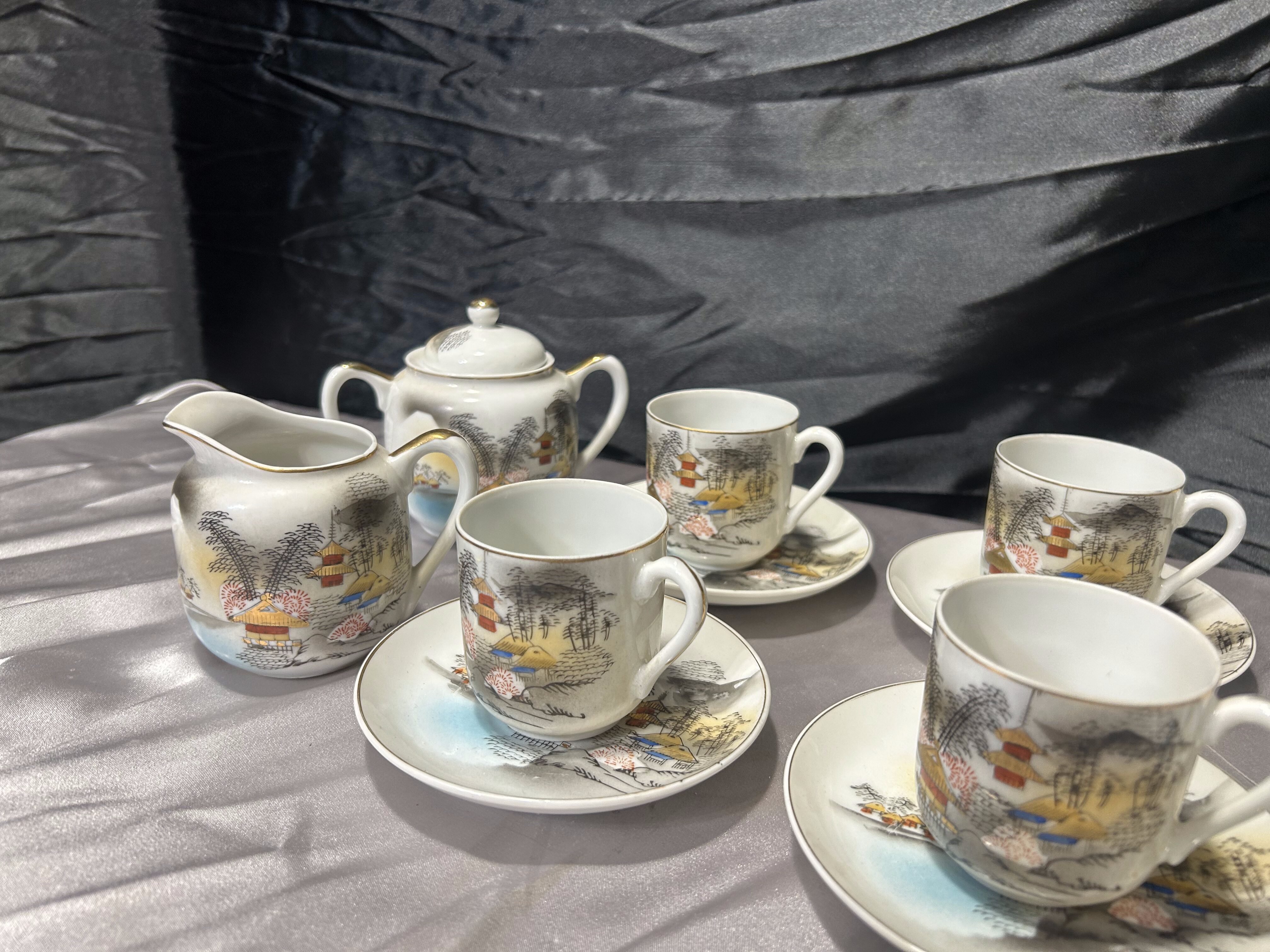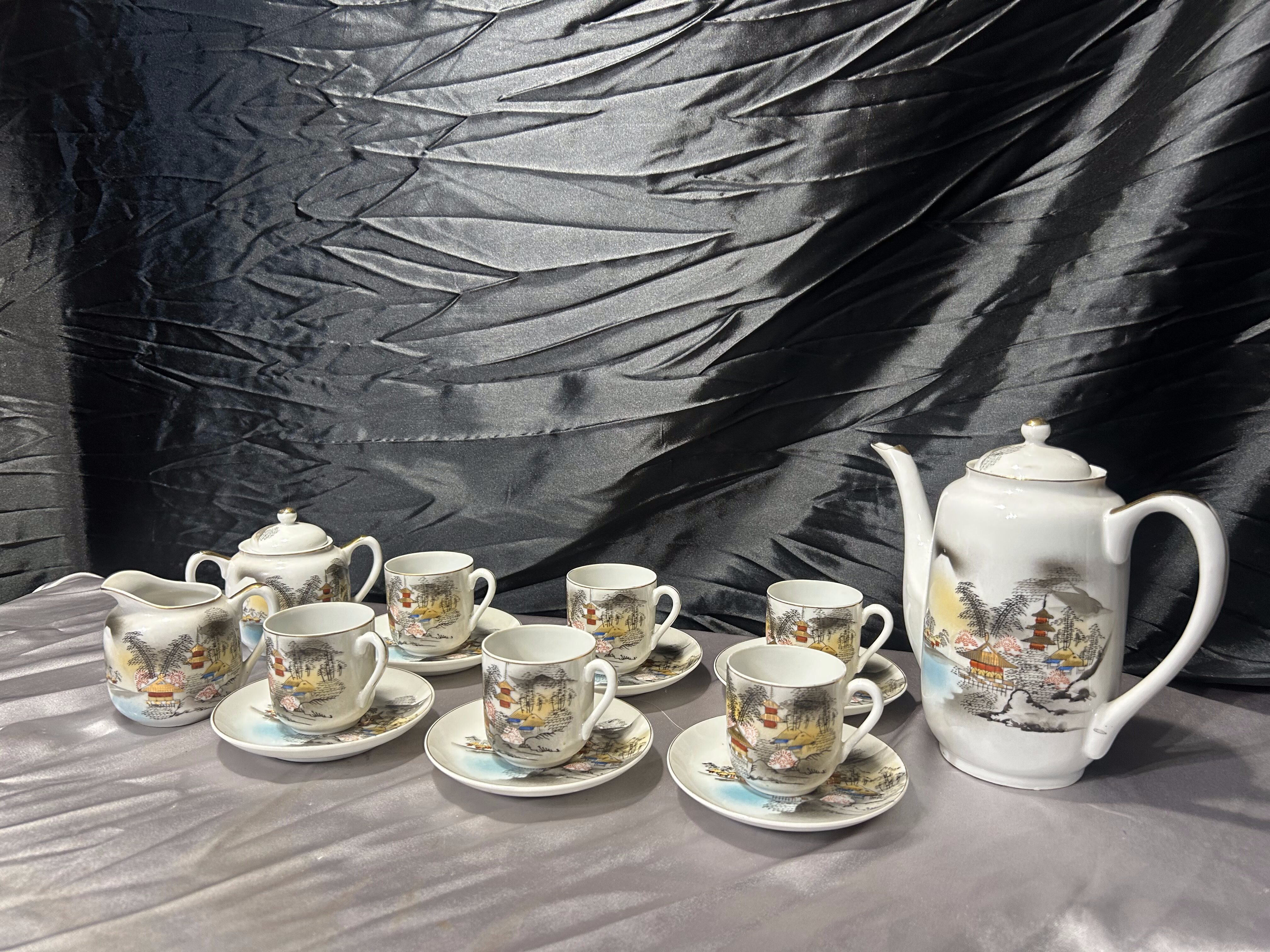 Wyjątkowy, dekoracyjny zestaw porcelany w stylu Kutani, pochodzący z Japonii. Klasyczne filiżanki z podstawkami oraz uzupełniające naczynia zdobione są ręcznie malowanymi pejzażami inspirowanymi japońską estetyką – pagody, drzewa, architektura i delikatne przejścia kolorystyczne.
