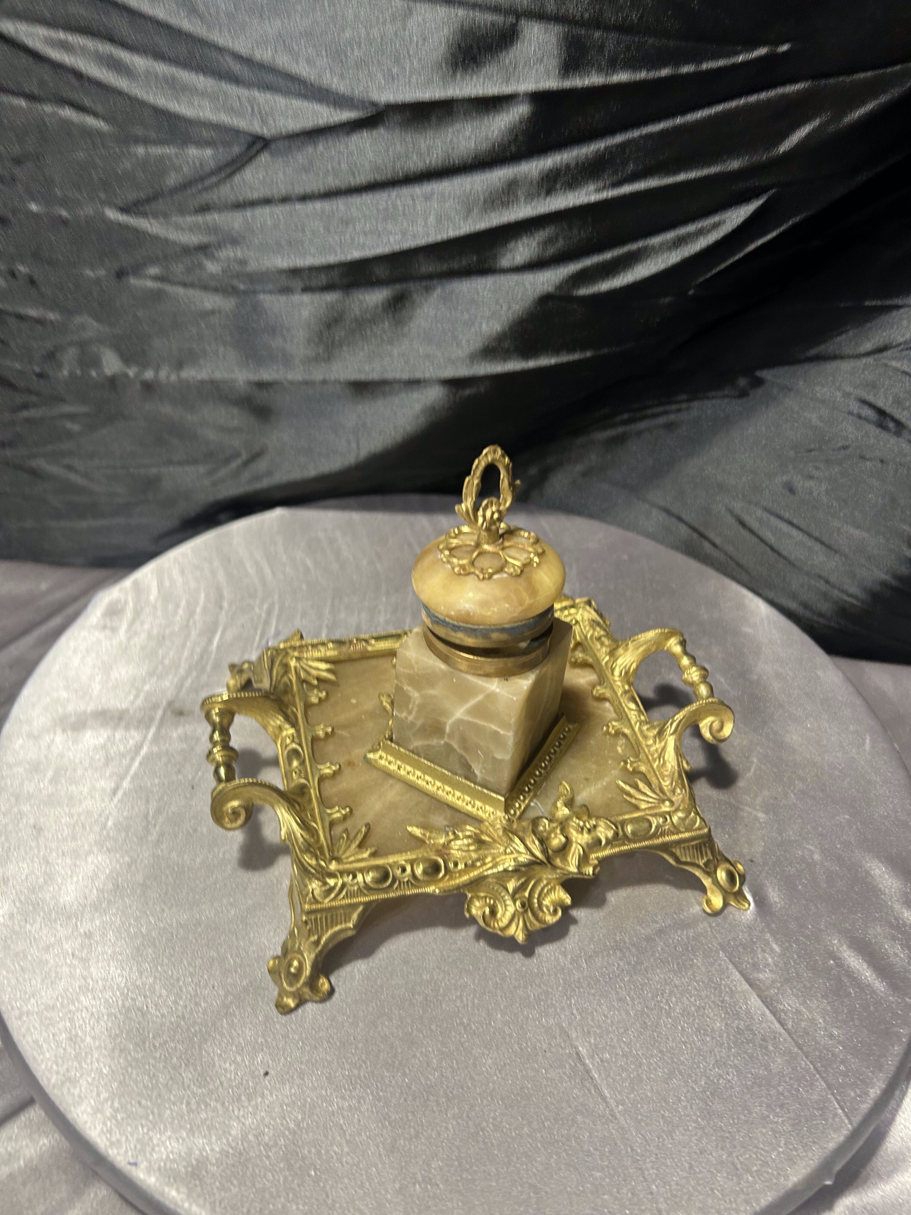 Elegancki, dekoracyjny kałamarz wykonany z mosiądzu oraz onyksu, utrzymany w klasycznym, reprezentacyjnym stylu. Bogato zdobiona podstawa z finezyjnymi ornamentami oraz kamienny zbiornik nadają całości szlachetny, gabinetowy charakter. Przedmiot idealnie wpisuje się w estetykę dawnych biurek, bibliotek i wnętrz w stylu vintage lub klasycznym.