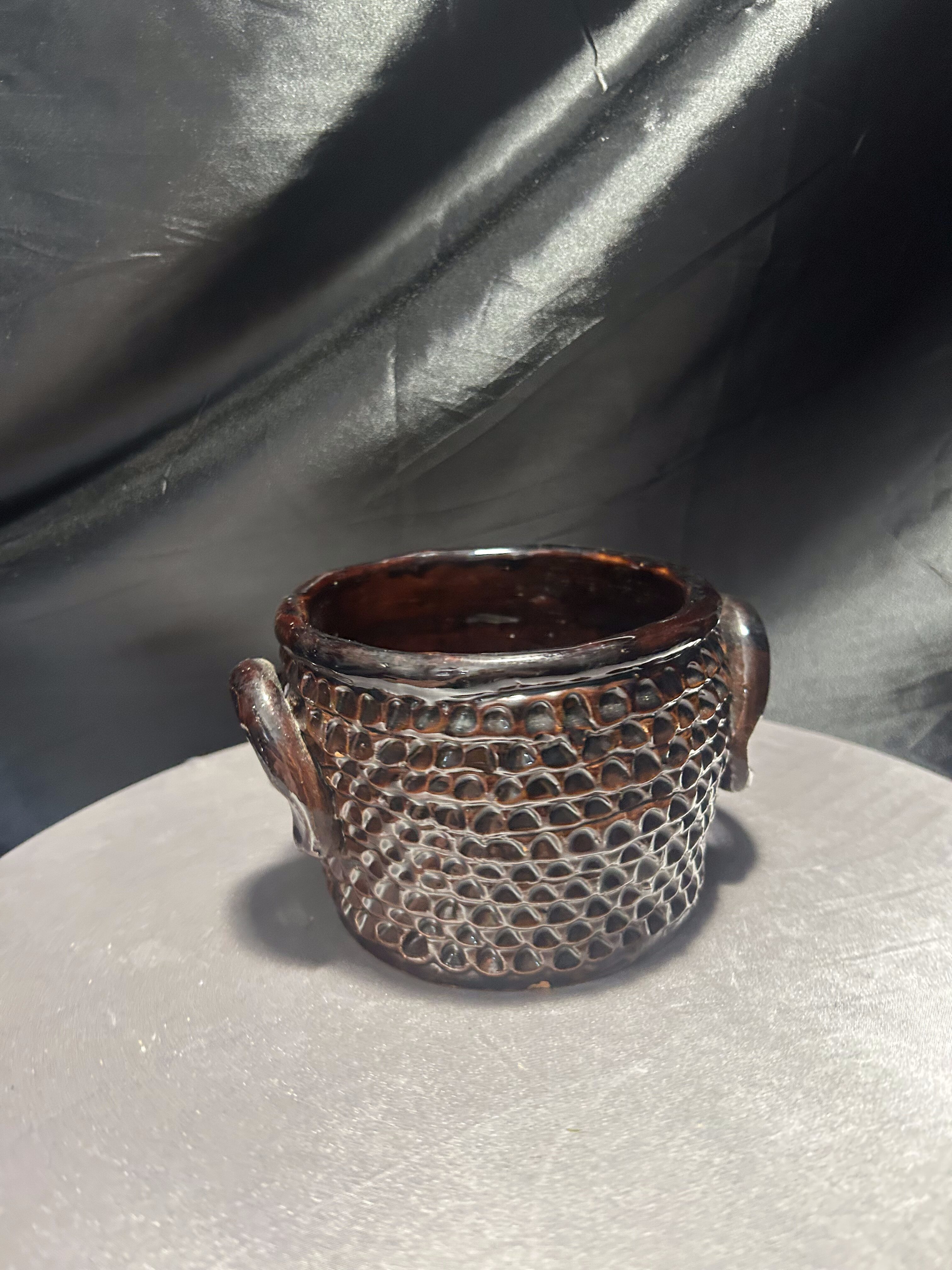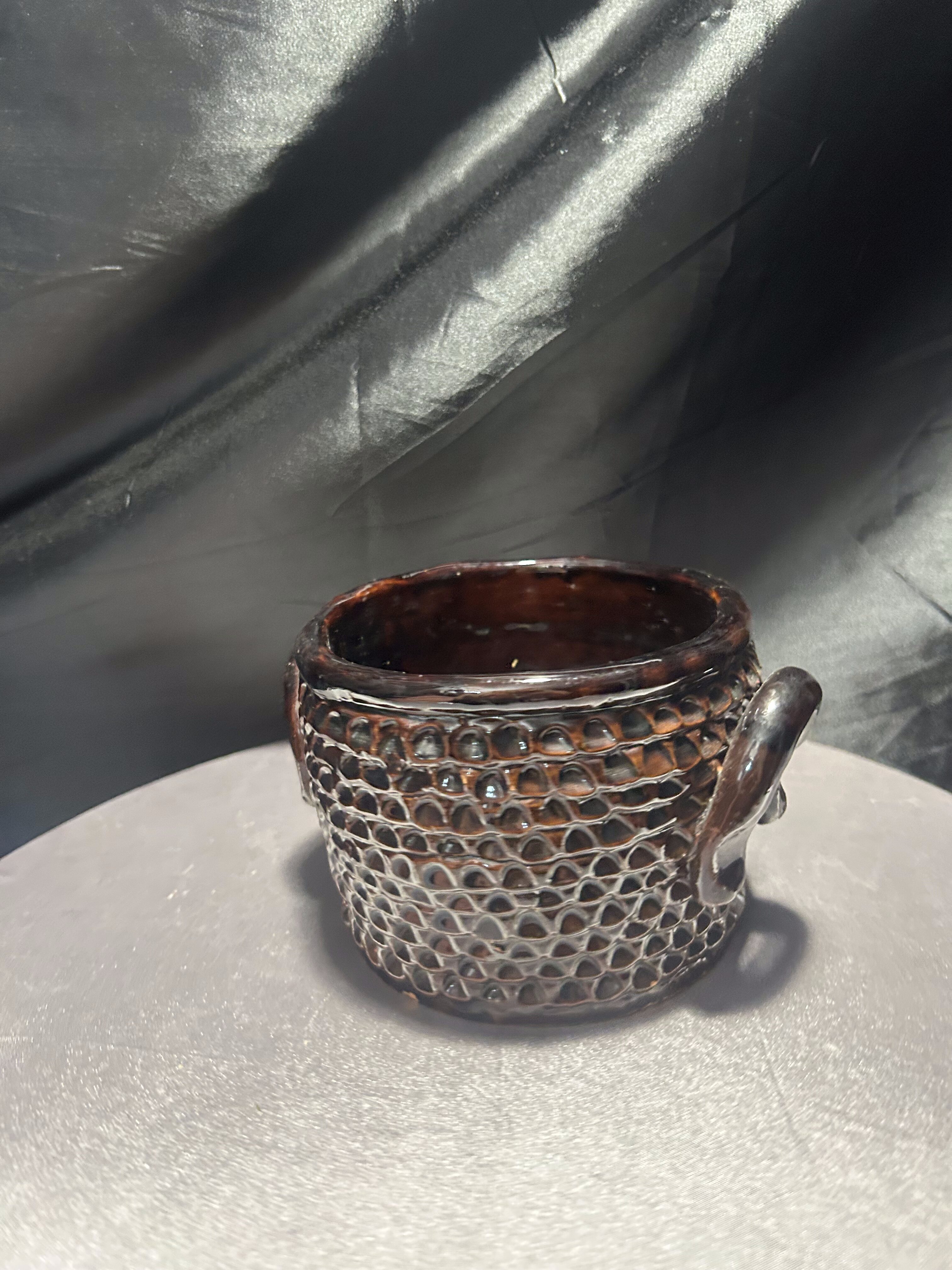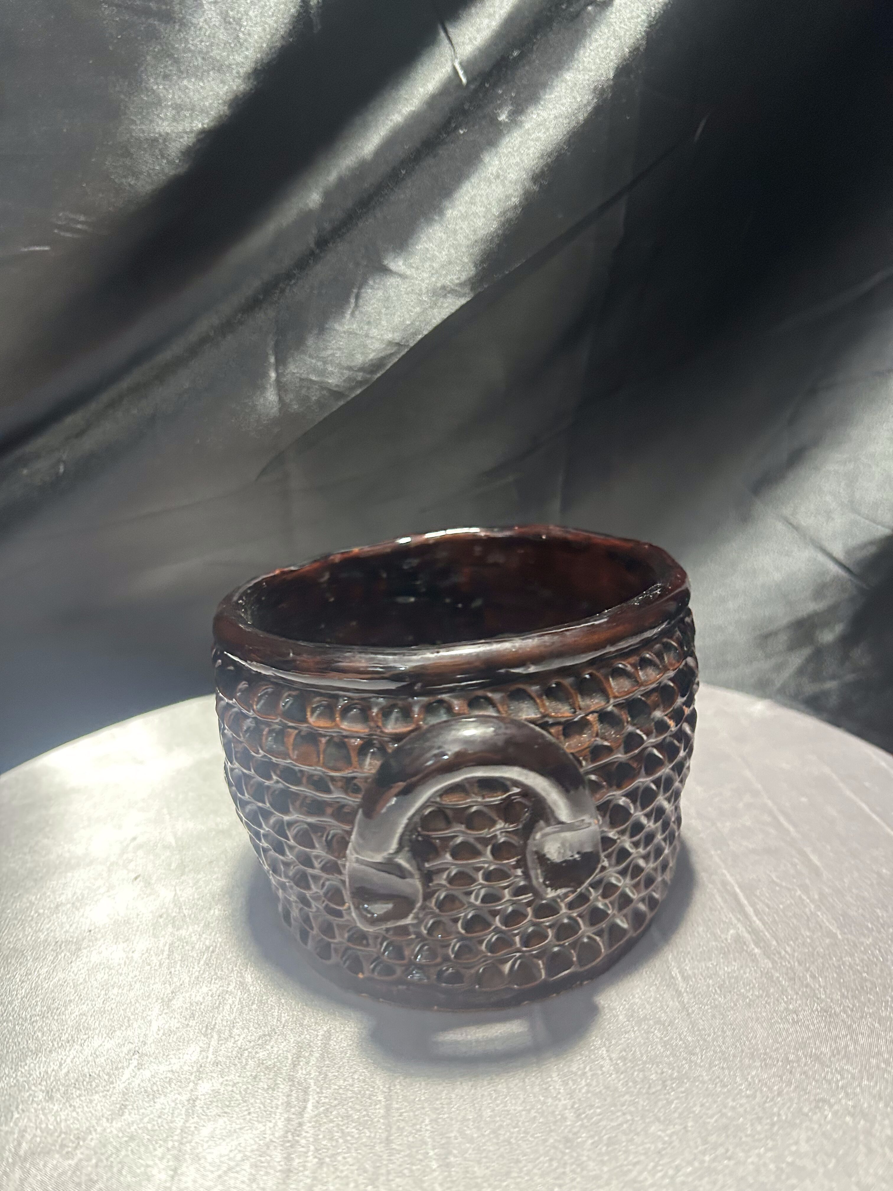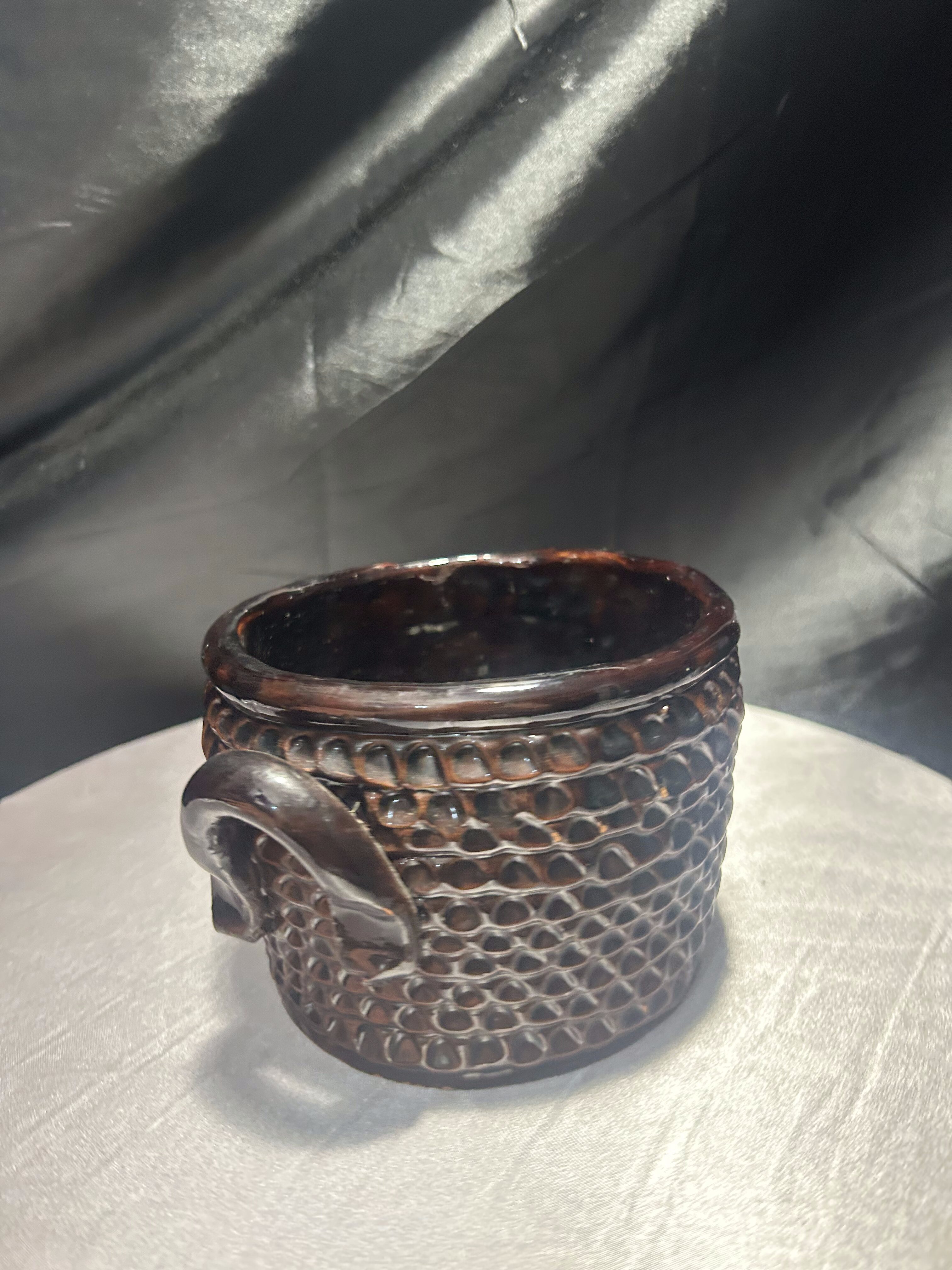 Urokliwy, ręcznie wykonany kamionkowy garnek, pełniący rolę dekoracyjnego kwietnika. Bogate tłoczenia na powierzchni nadają mu unikalnego charakteru, podkreślonego głęboko brązową, błyszczącą glazurą. Solidne wykonanie i naturalny materiał czynią go odporna propozycją do wnętrz w stylu rustykalnym, boho czy skandynawskim.