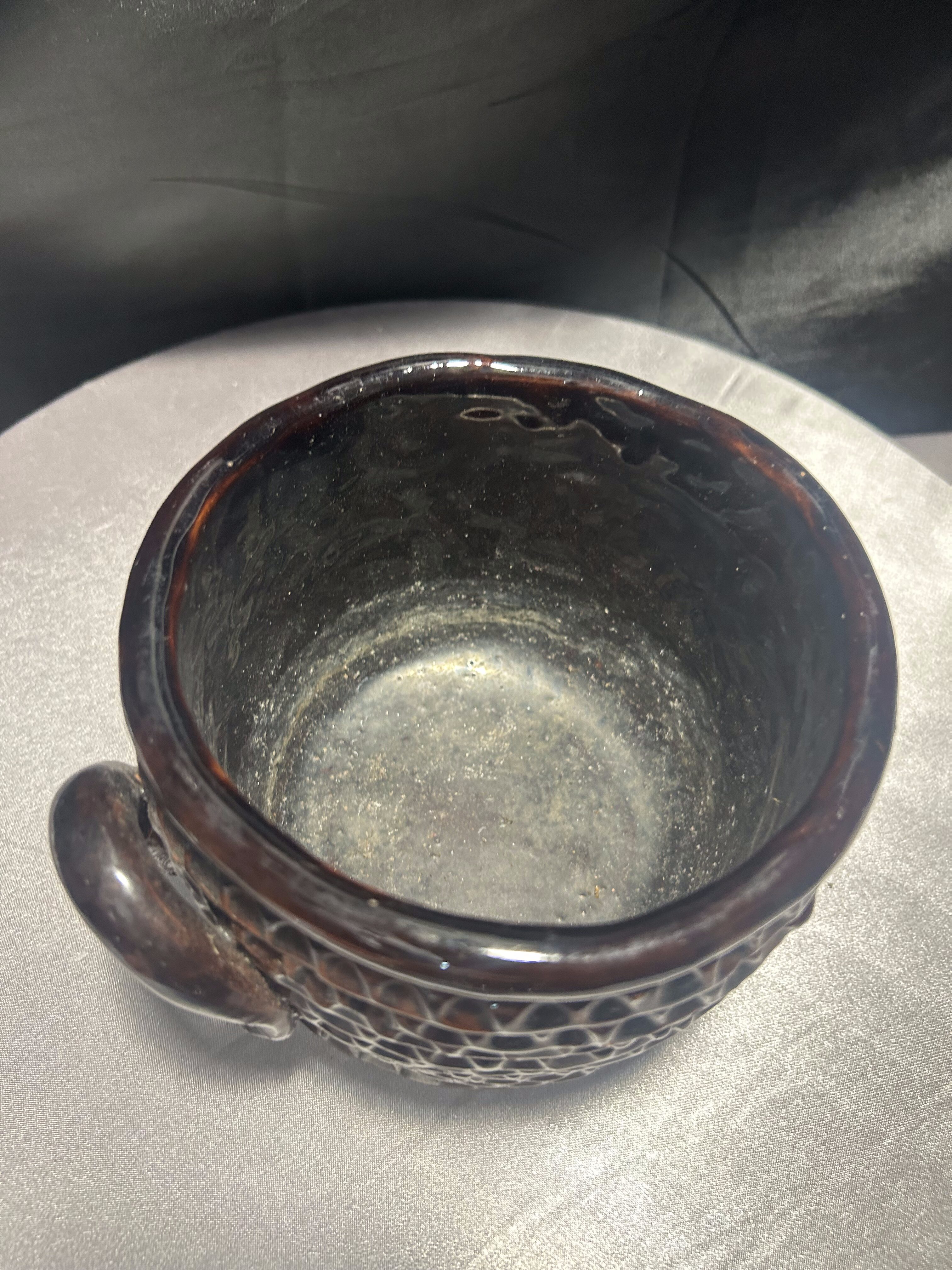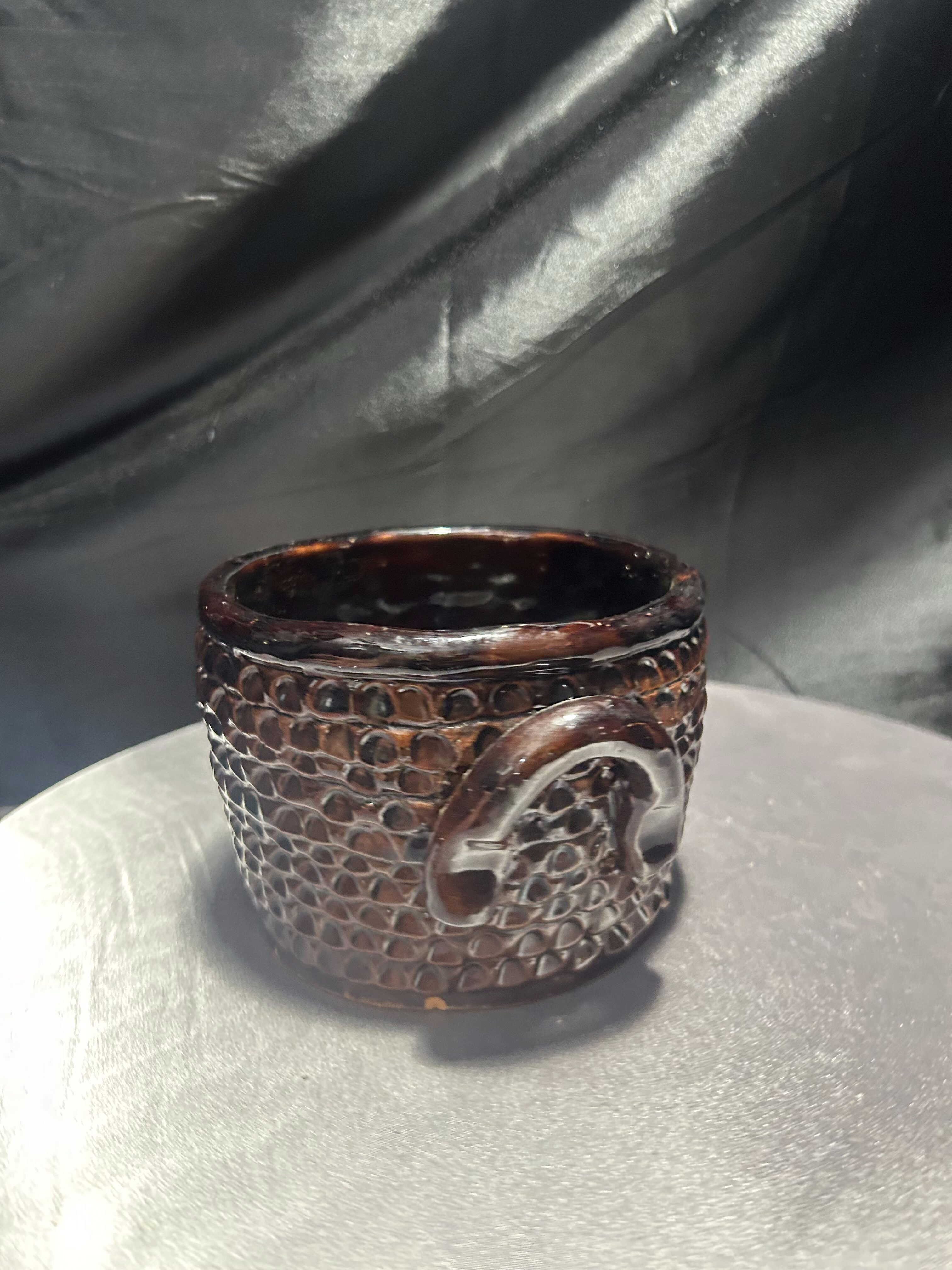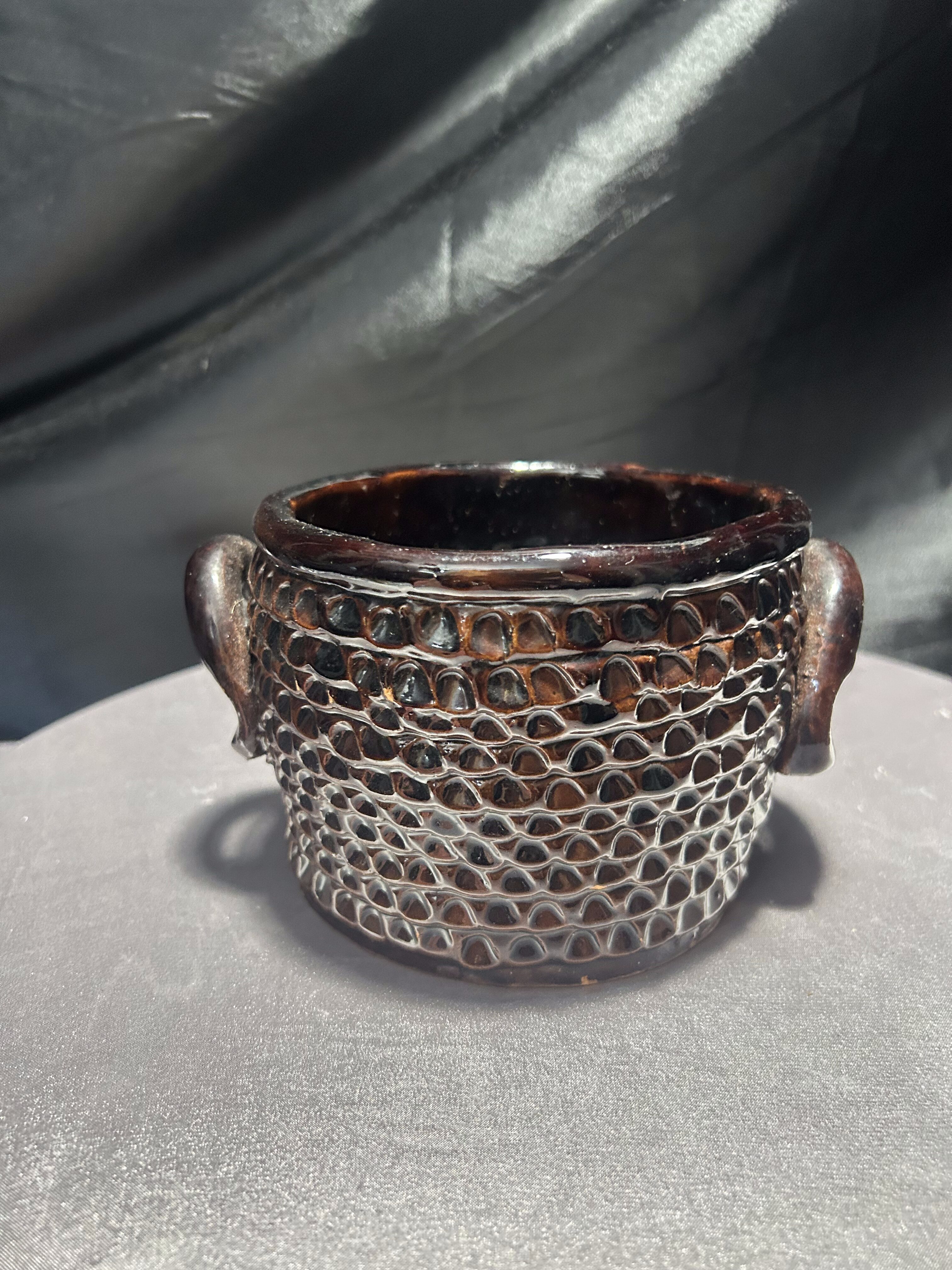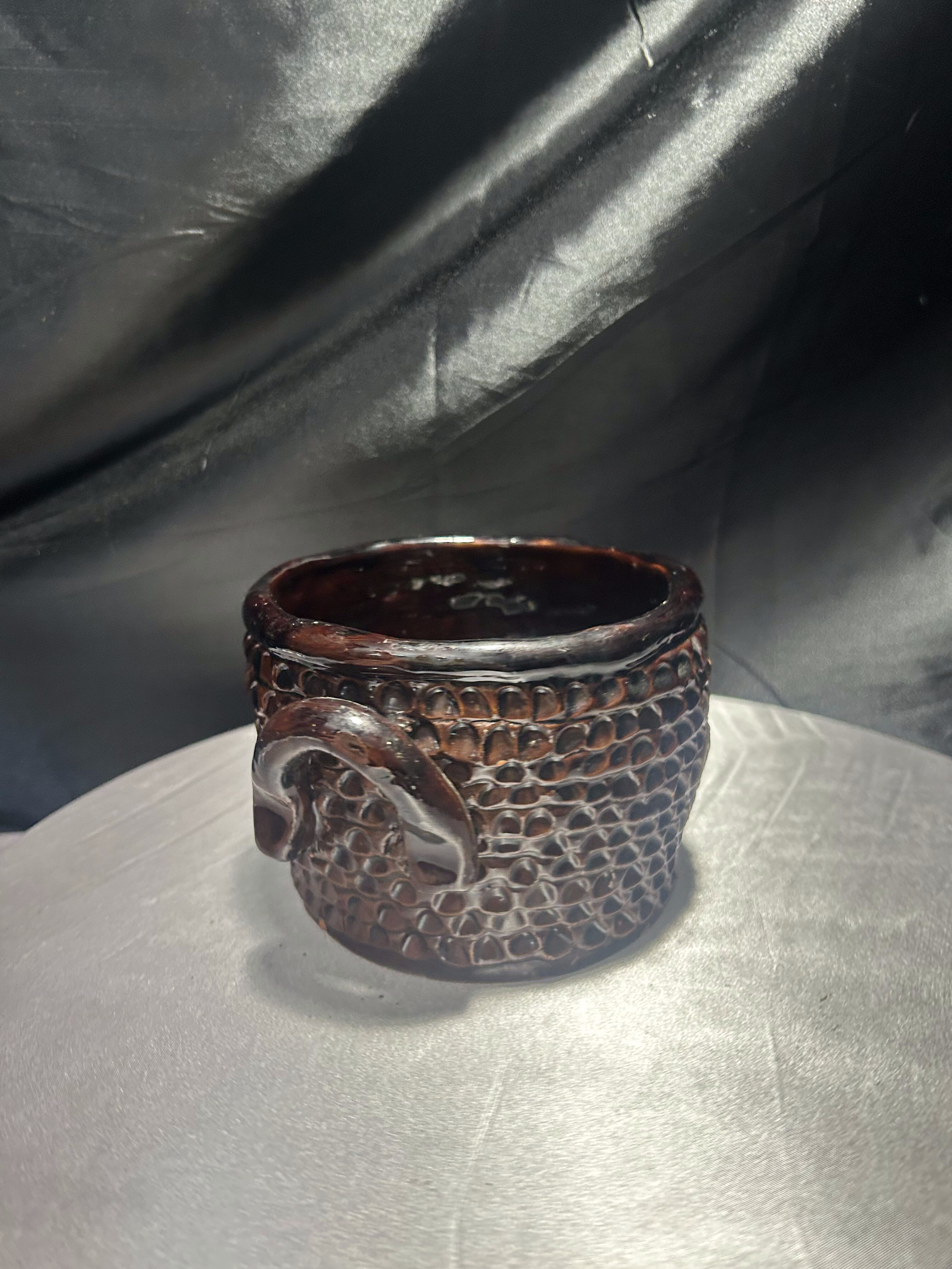 Urokliwy, ręcznie wykonany kamionkowy garnek, pełniący rolę dekoracyjnego kwietnika. Bogate tłoczenia na powierzchni nadają mu unikalnego charakteru, podkreślonego głęboko brązową, błyszczącą glazurą. Solidne wykonanie i naturalny materiał czynią go odporna propozycją do wnętrz w stylu rustykalnym, boho czy skandynawskim.