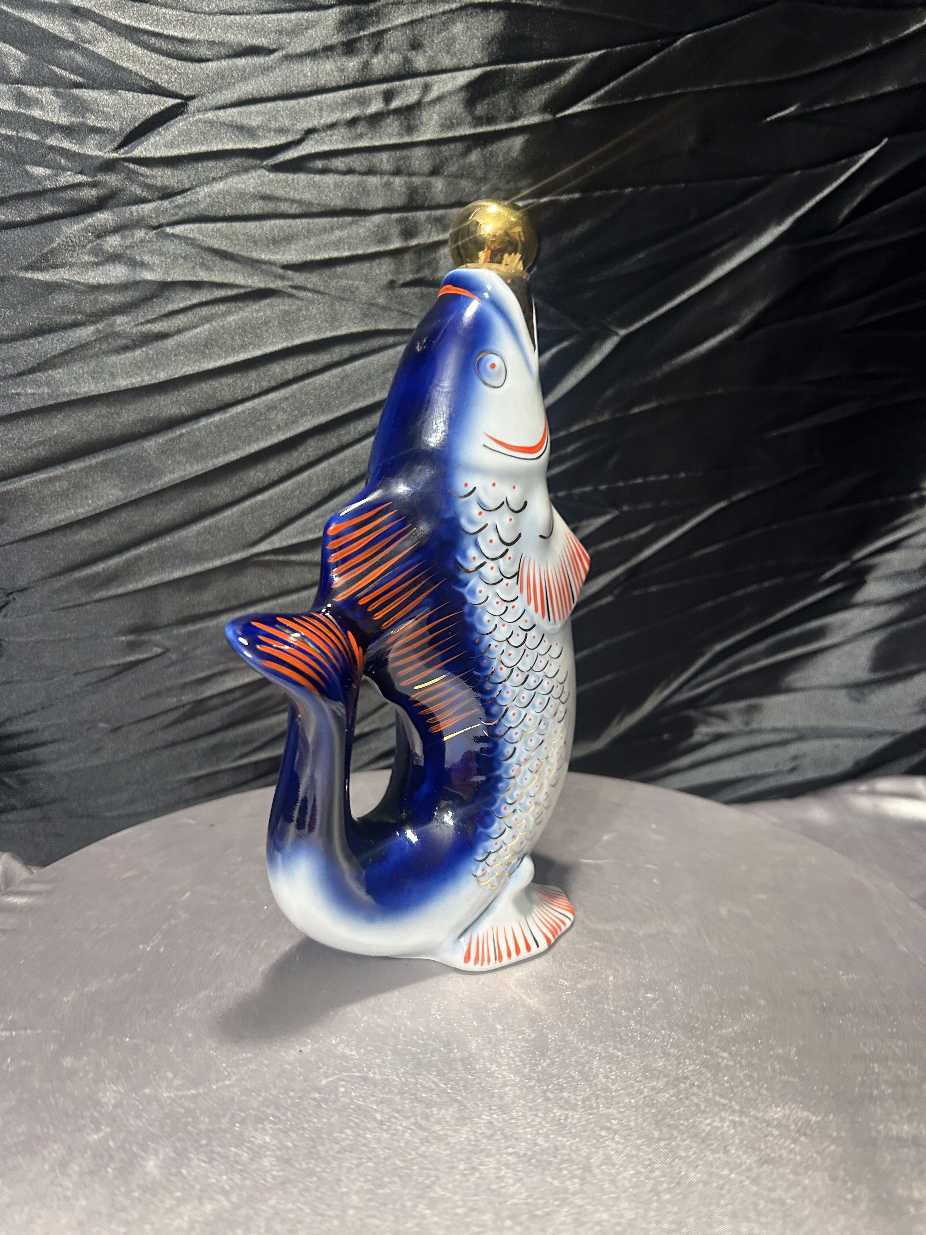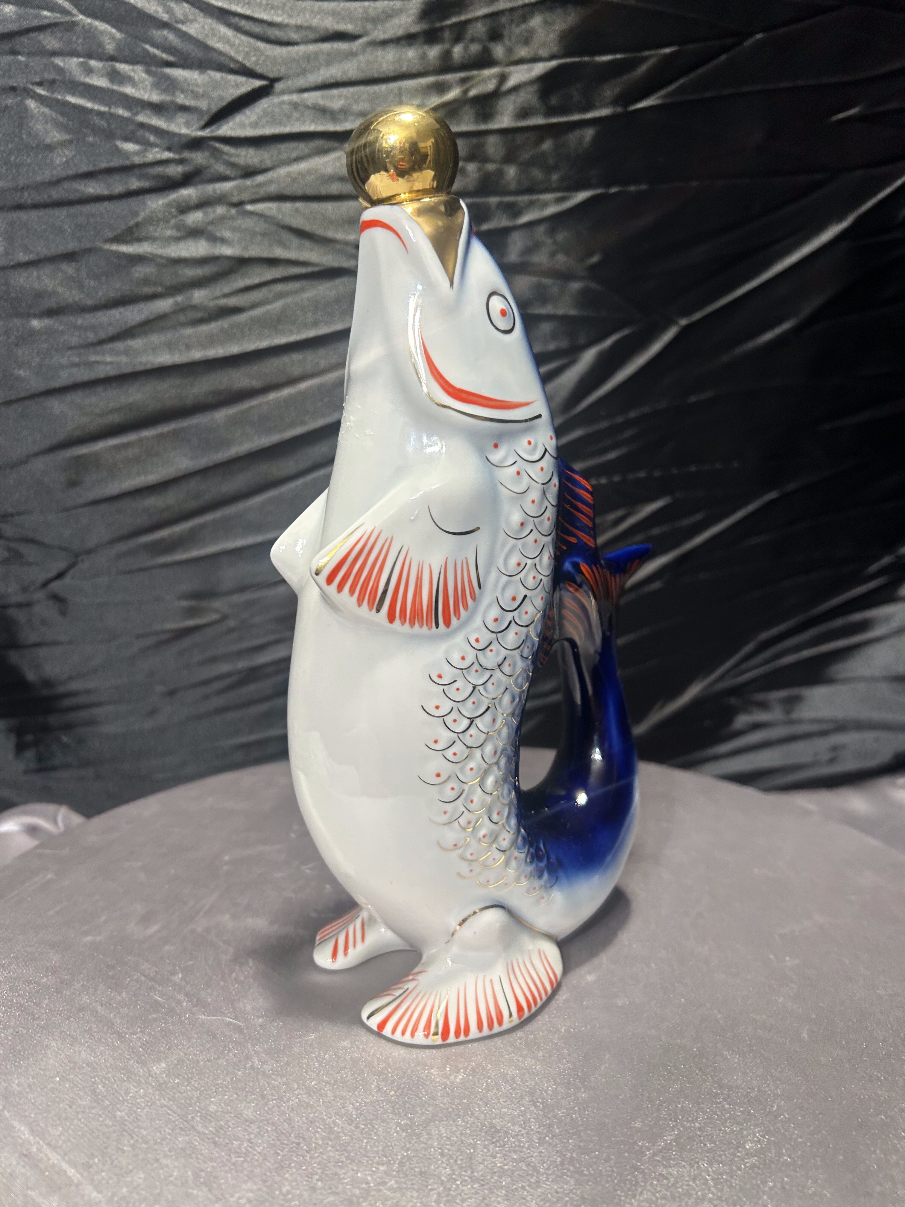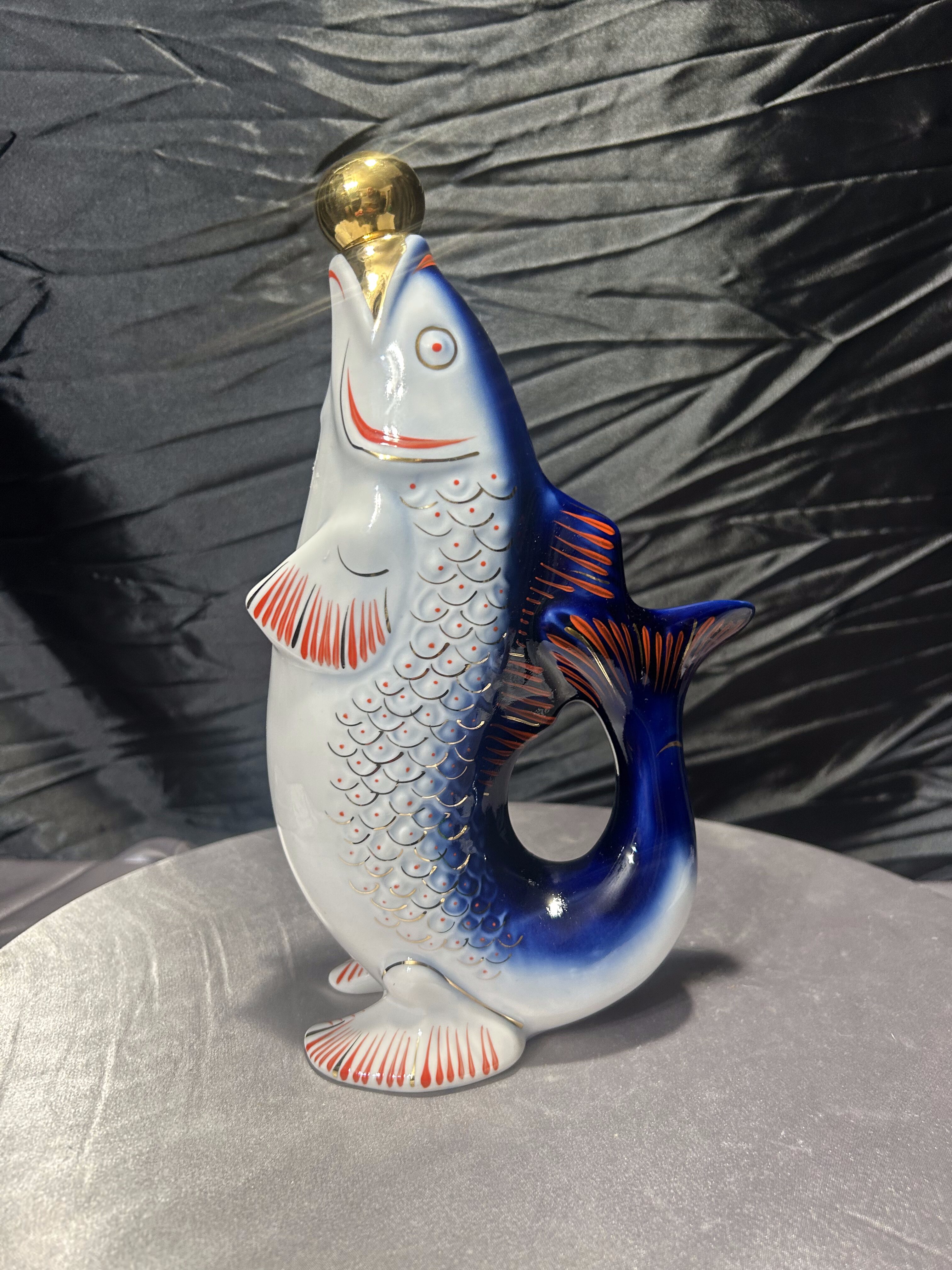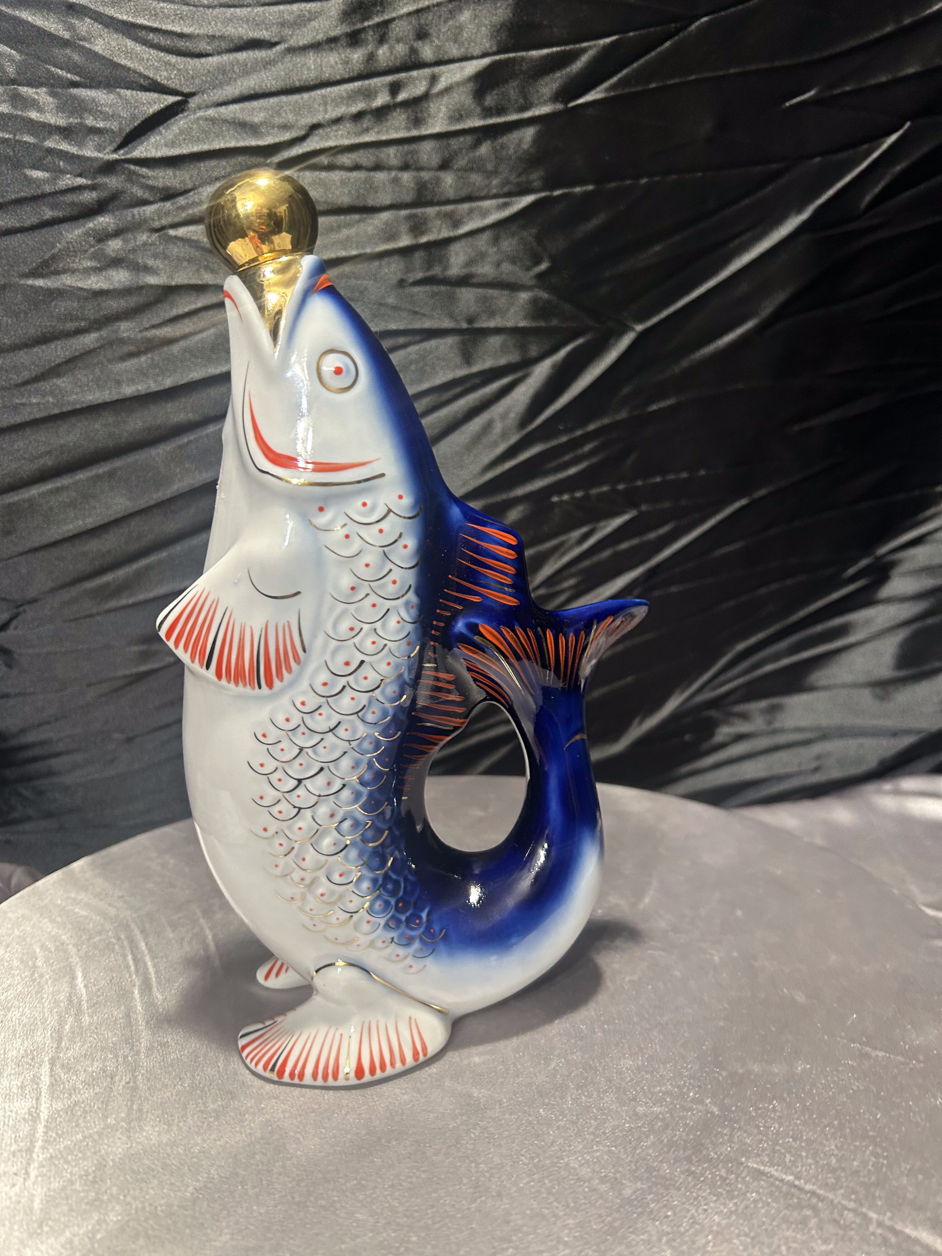 Karafka o klasycznej, dynamicznej formie ryby z otwartym pyskiem, w którym umieszczony jest złocony korek w kształcie kuli. Wykonana z wysokiej jakości porcelany, ręcznie malowana kobaltem, czerwienią i złotem, co nadaje jej niepowtarzalny blask i głębię barw. Dekoracja utrzymana jest w typowym dla lat 50.–70. stylu radzieckiego realizmu z nutą art deco.