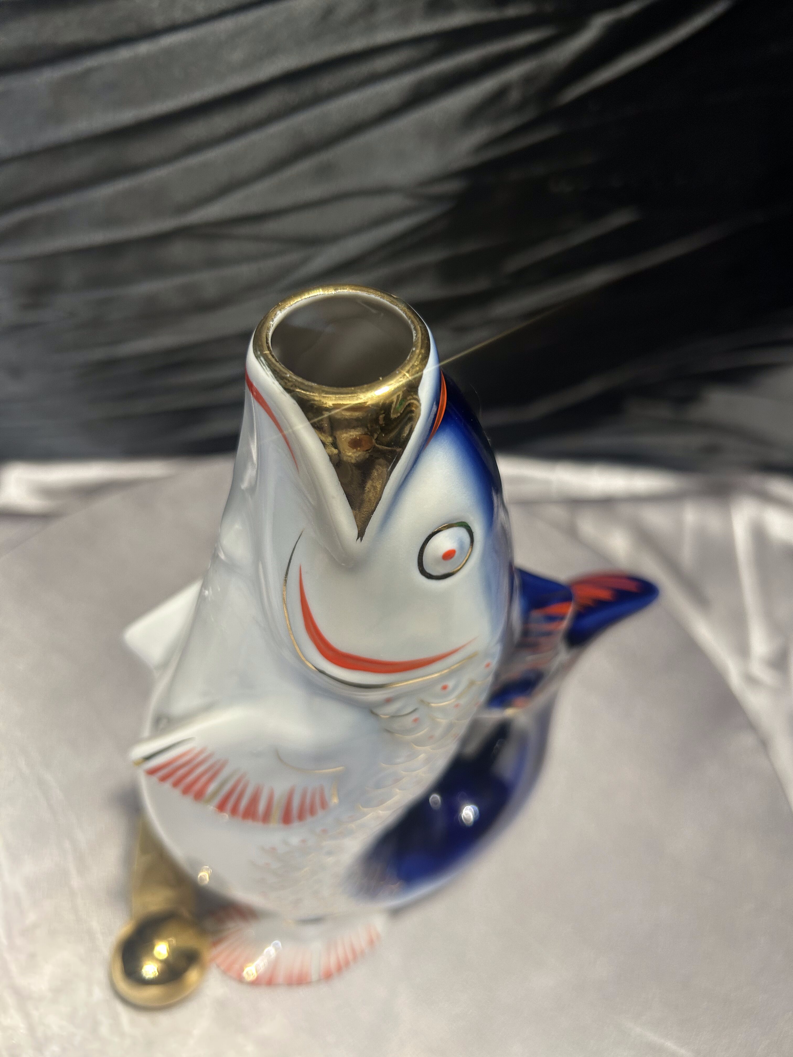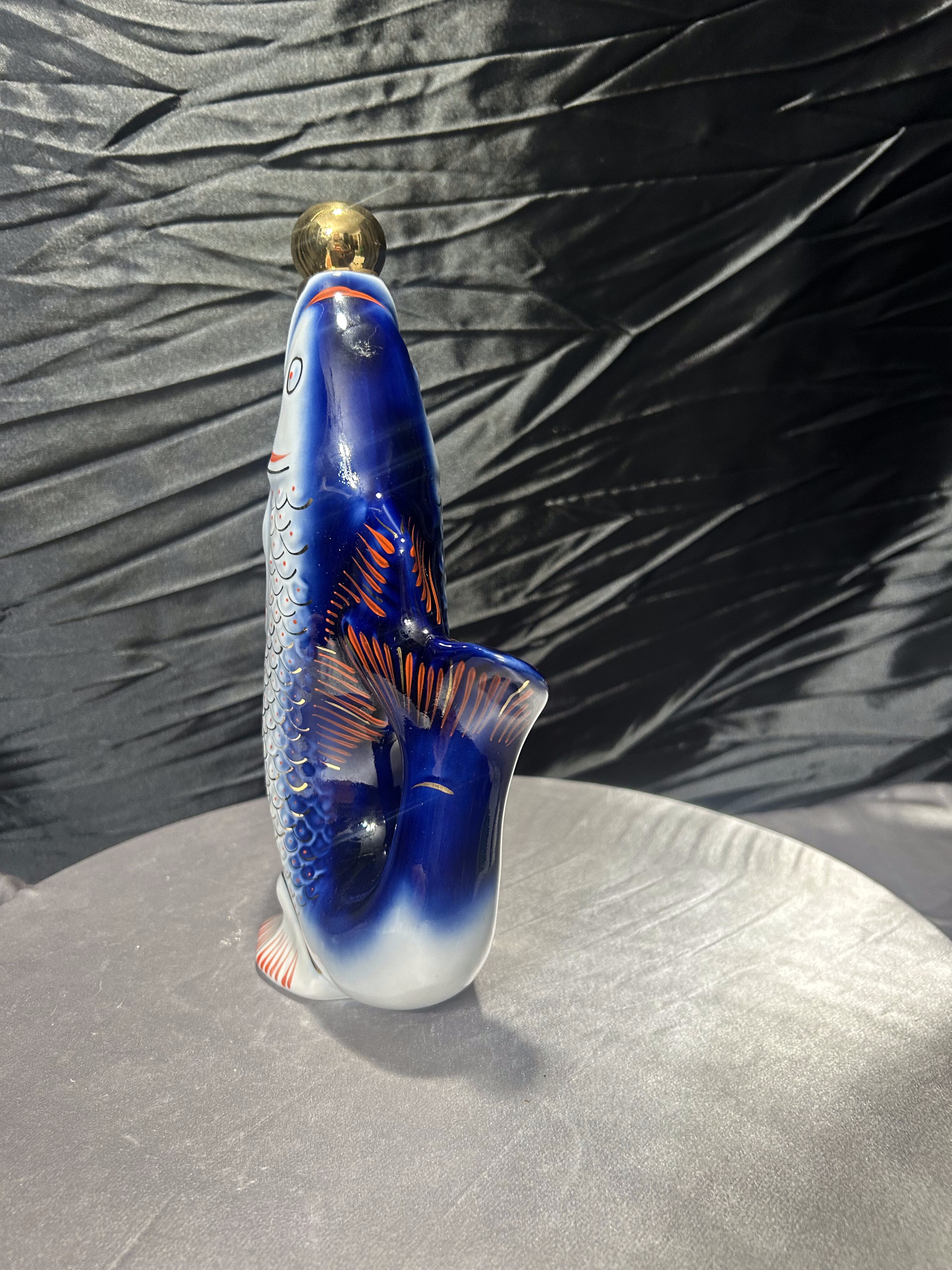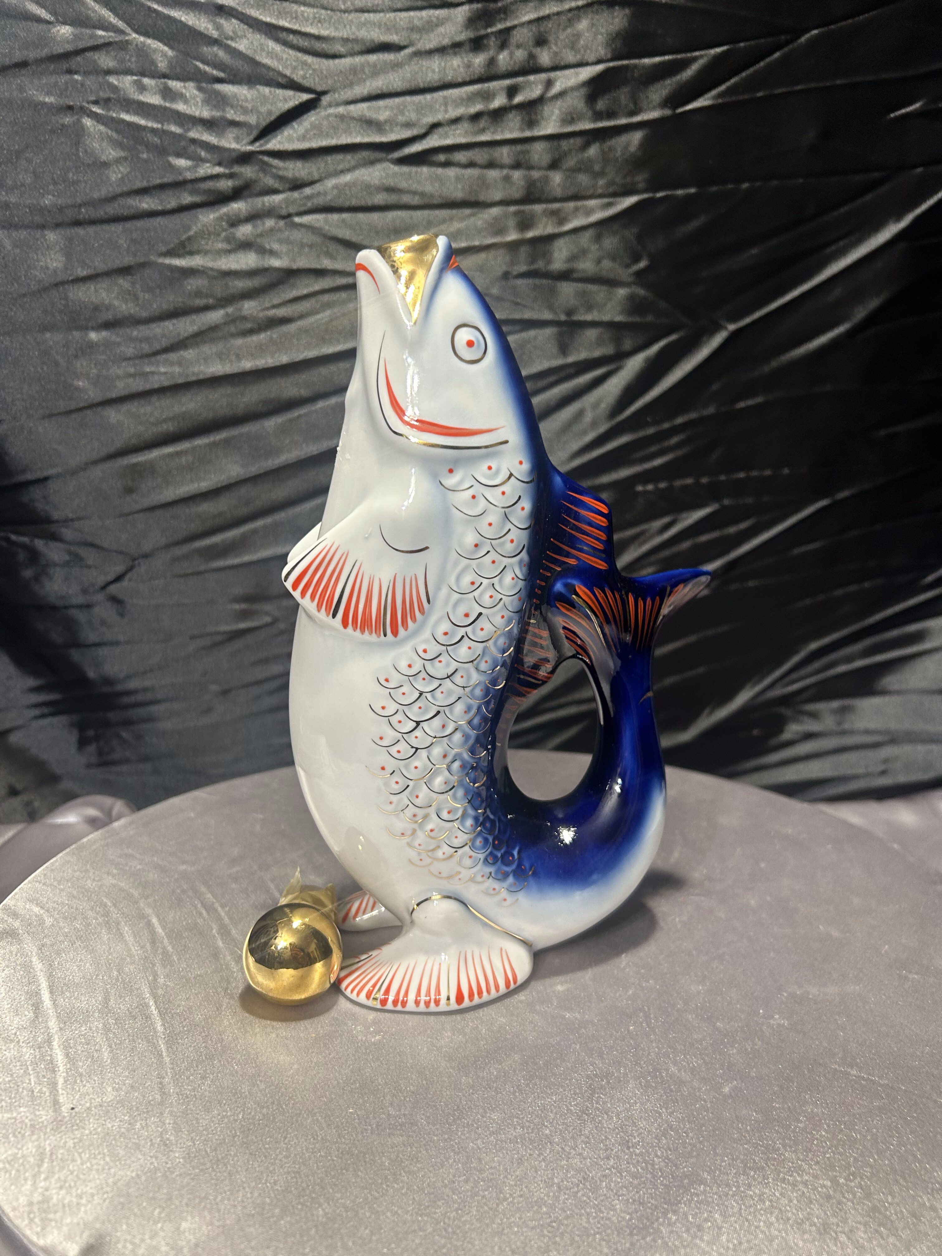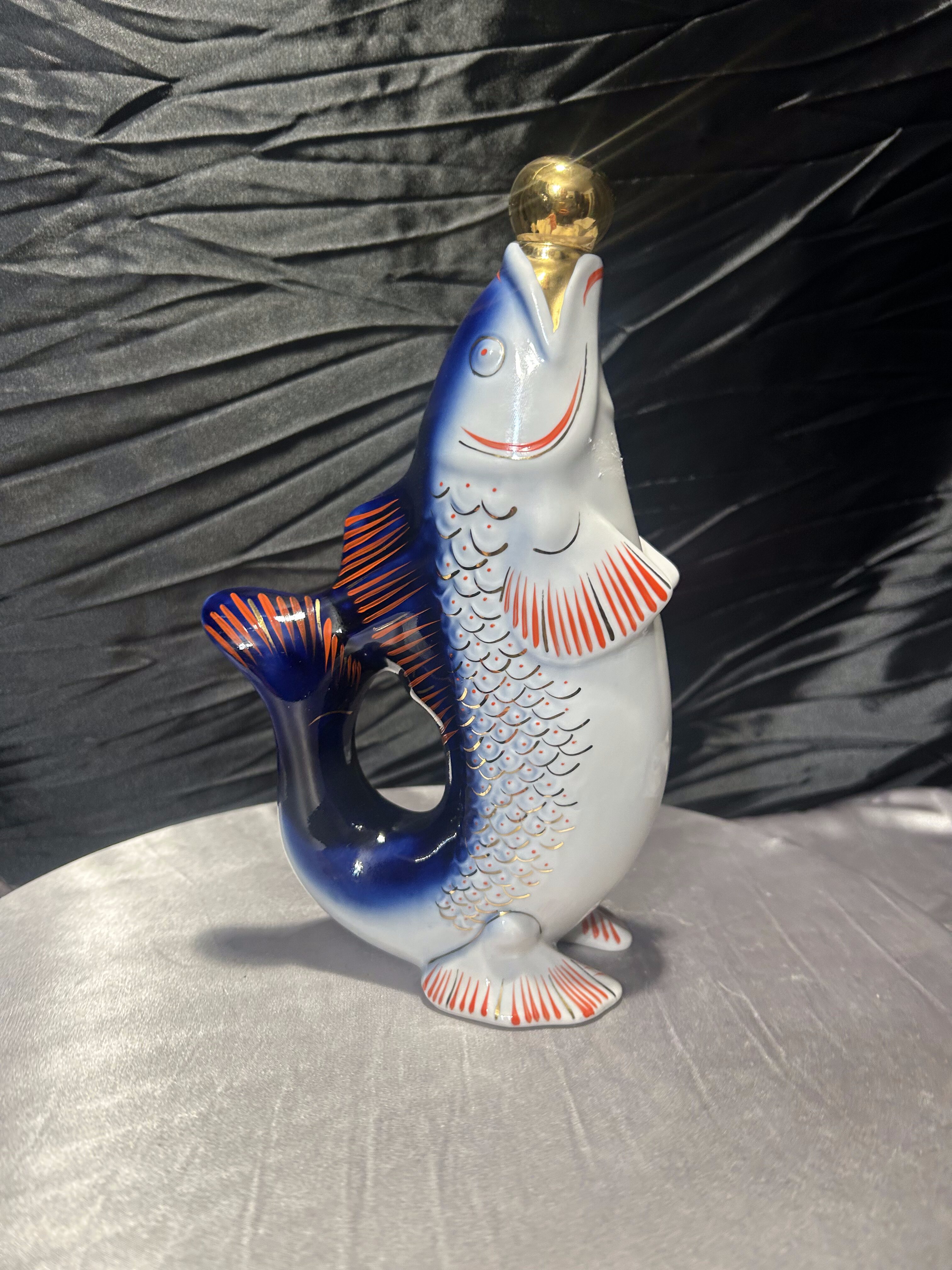 Karafka o klasycznej, dynamicznej formie ryby z otwartym pyskiem, w którym umieszczony jest złocony korek w kształcie kuli. Wykonana z wysokiej jakości porcelany, ręcznie malowana kobaltem, czerwienią i złotem, co nadaje jej niepowtarzalny blask i głębię barw. Dekoracja utrzymana jest w typowym dla lat 50.–70. stylu radzieckiego realizmu z nutą art deco.