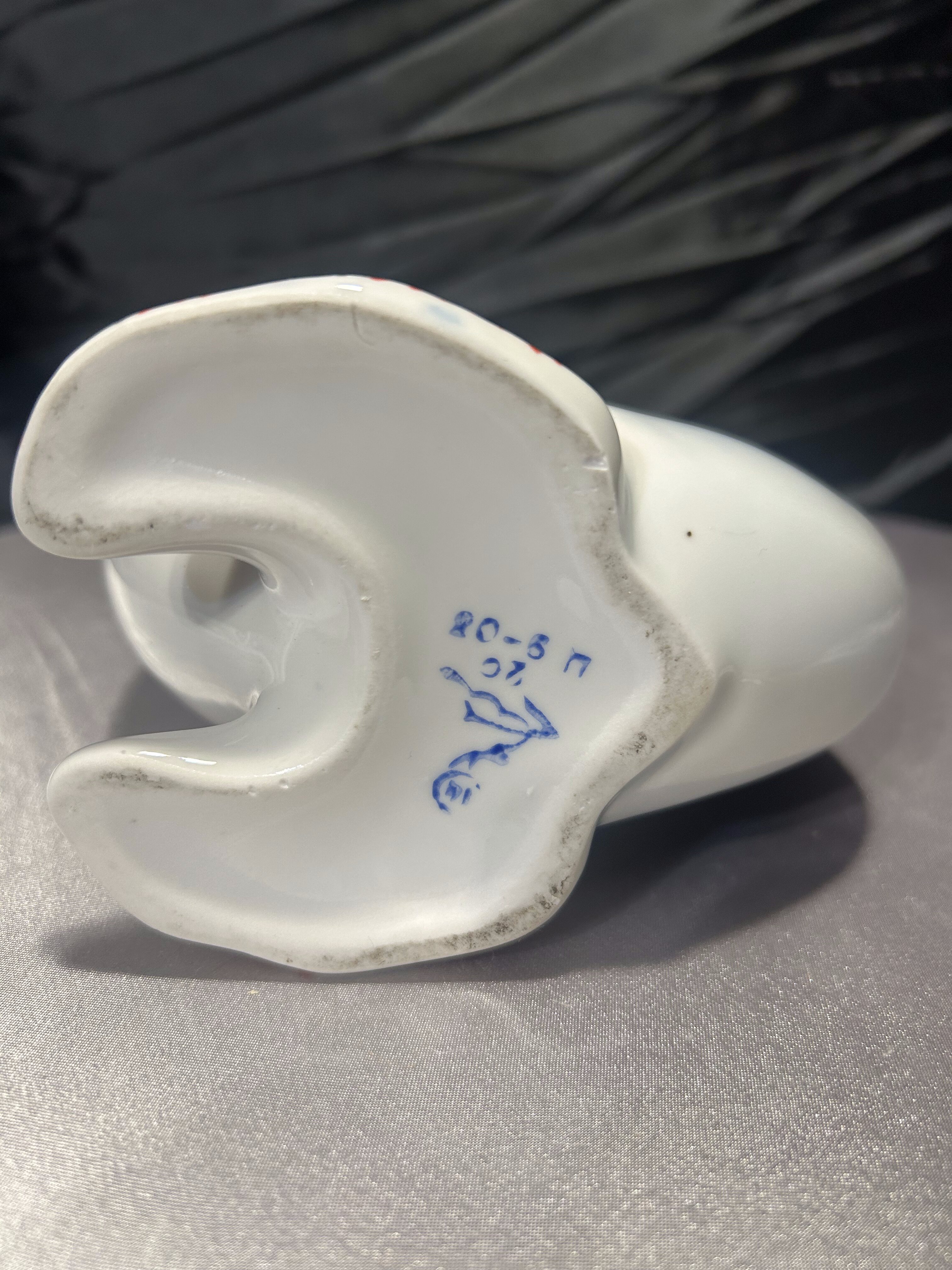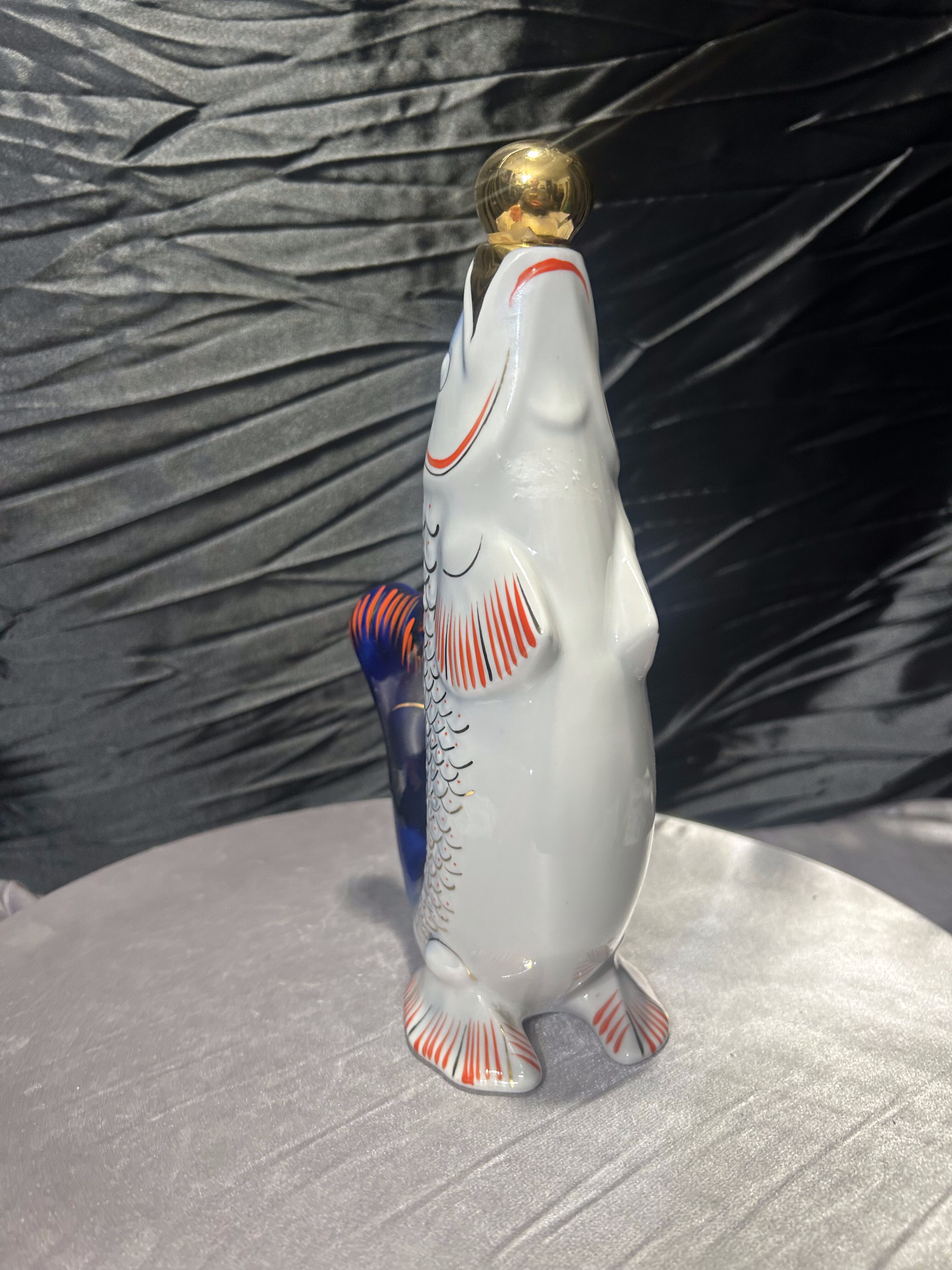Porcelanowa karafka w kształcie ryby to ikona wzornictwa ZSRR, symbol elegancji i humoru tamtych czasów. Złocony korek oraz ręczne malowanie nadają jej wyjątkowego charakteru. Idealna do kolekcji porcelany retro lub jako efektowna ozdoba wnętrza w stylu vintage.