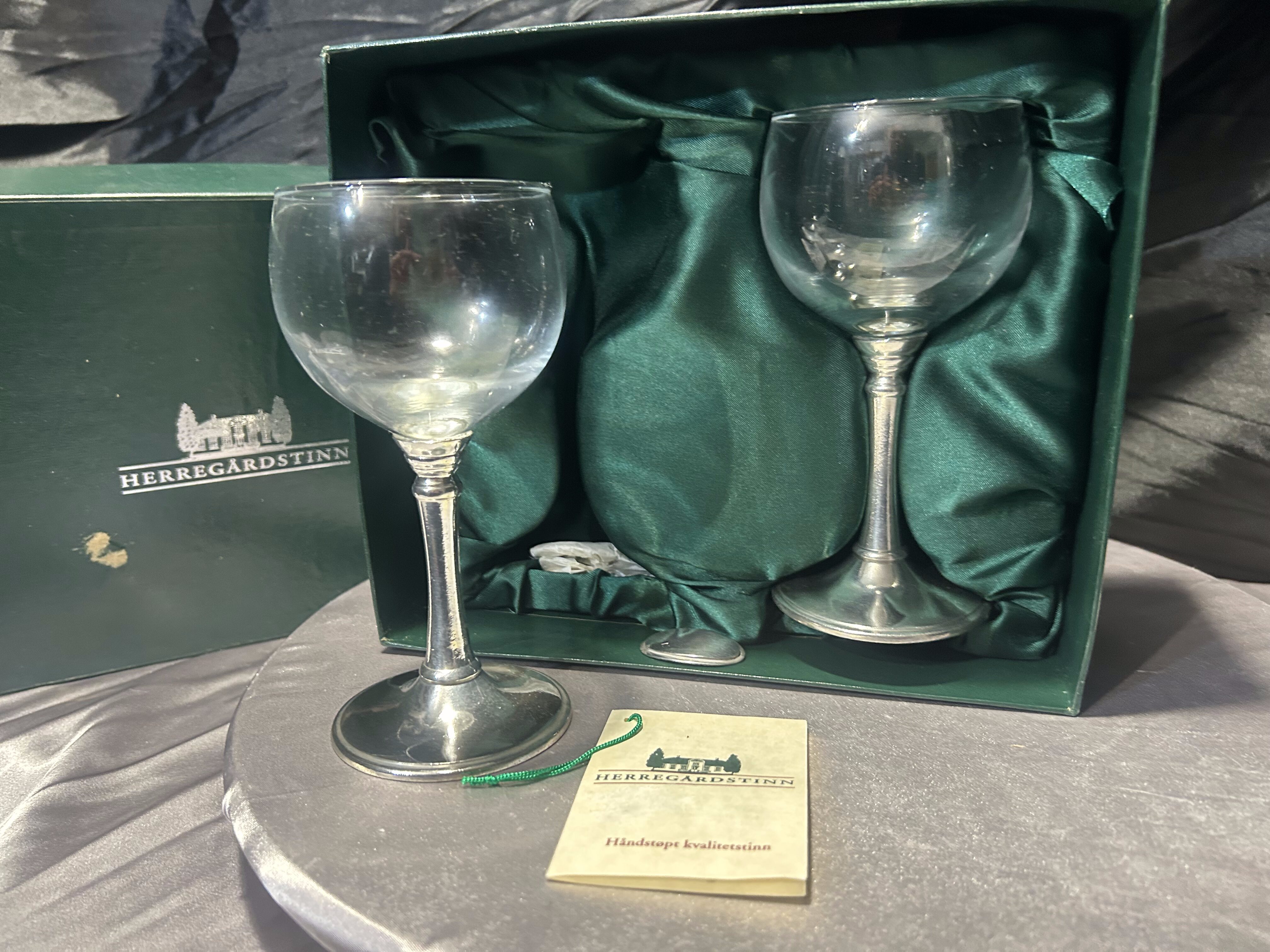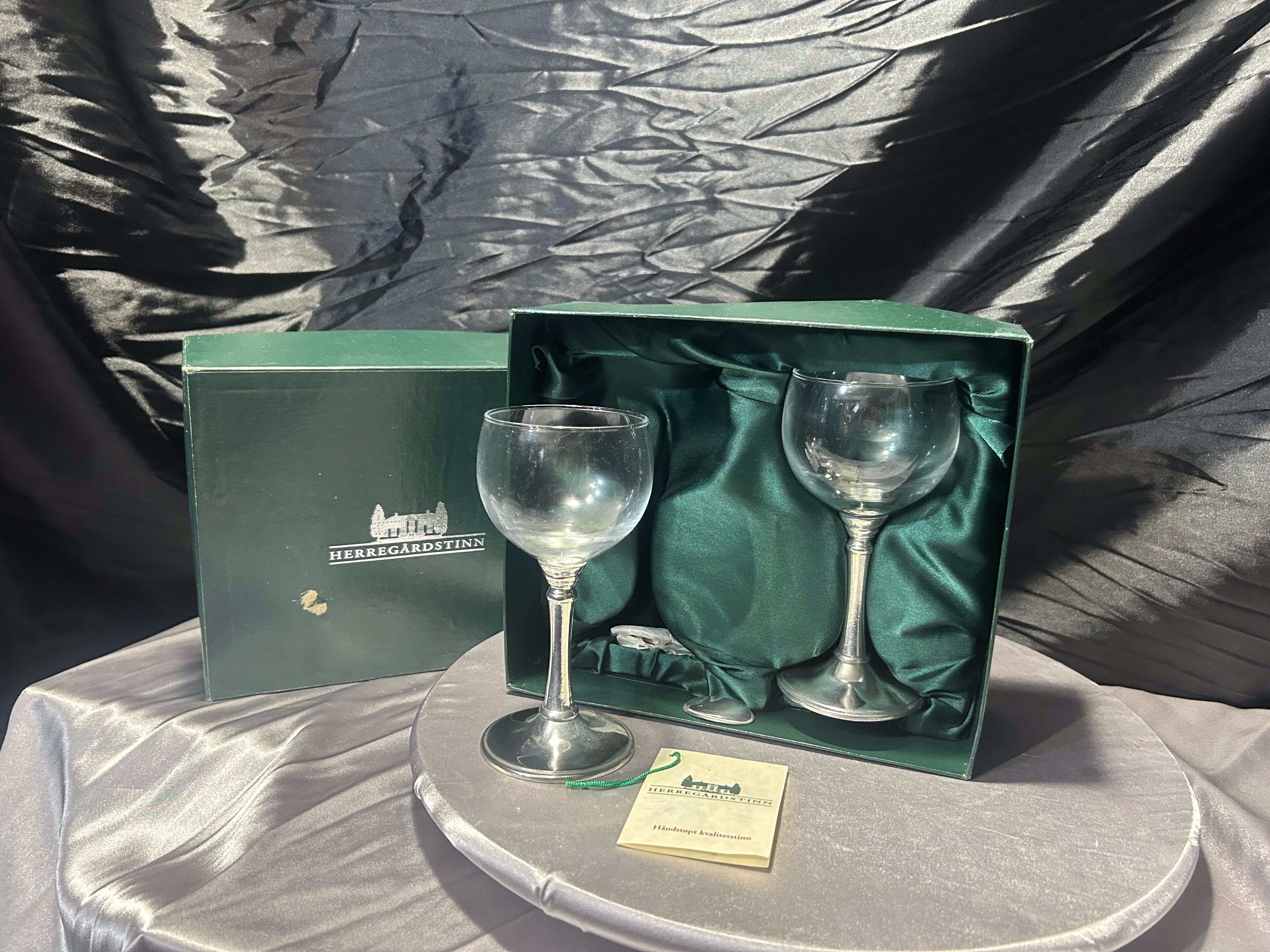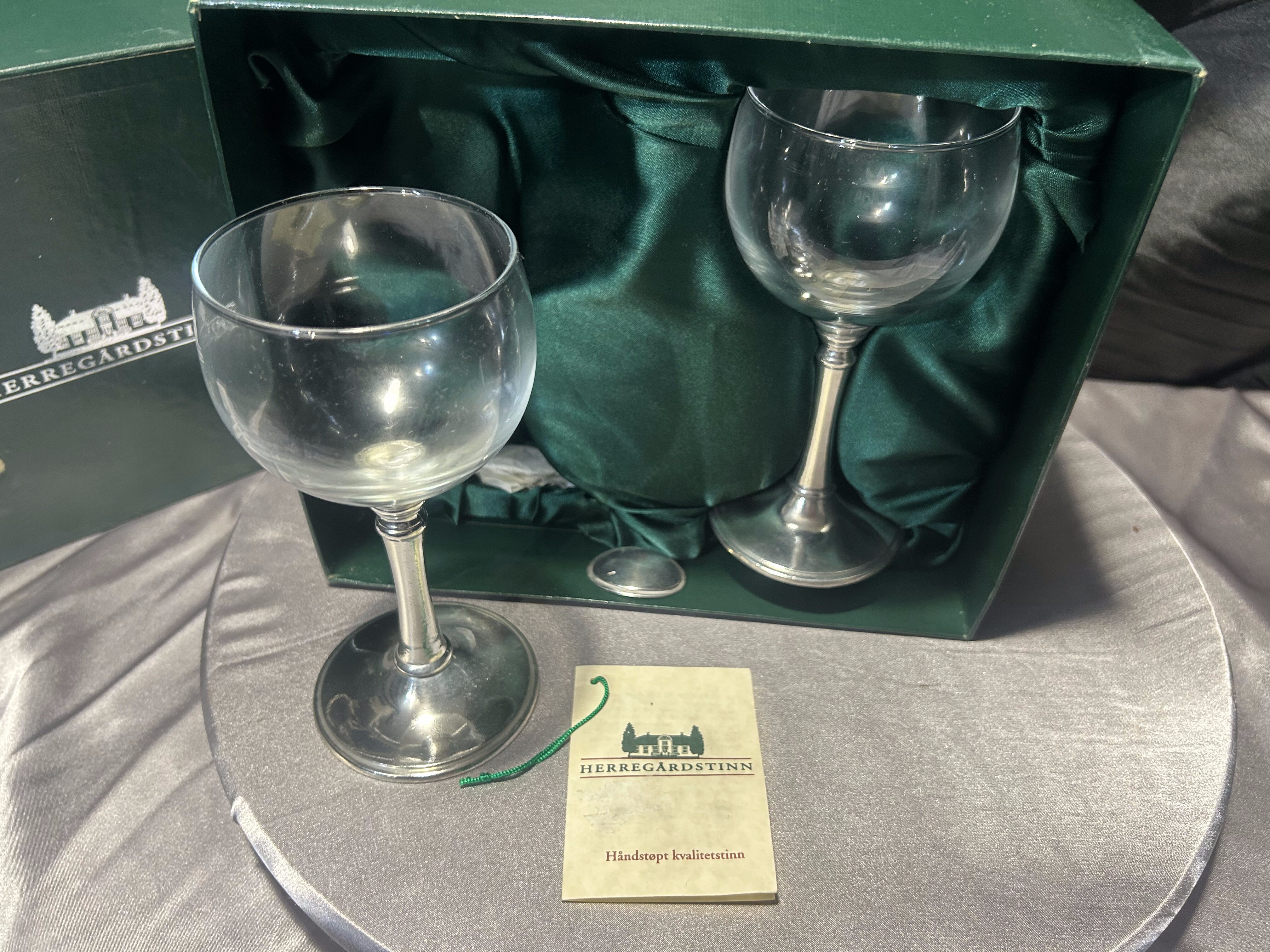 Elegancki komplet dwóch kieliszków renomowanej norweskiej marki Herregårdstinn, znanej z produkcji wysokiej jakości wyrobów w tradycyjnym stylu skandynawskim. To połączenie ręcznie odlewanego, solidnego metalu (typowego dla norweskich wyrobów tinnowych) z prostą, klasyczną formą szkła. Kieliszki prezentują się niezwykle stylowo – mają cięższą, stabilną podstawę oraz delikatnie profilowaną czarkę ze szkła, co tworzy elegancki kontrast materiałów.