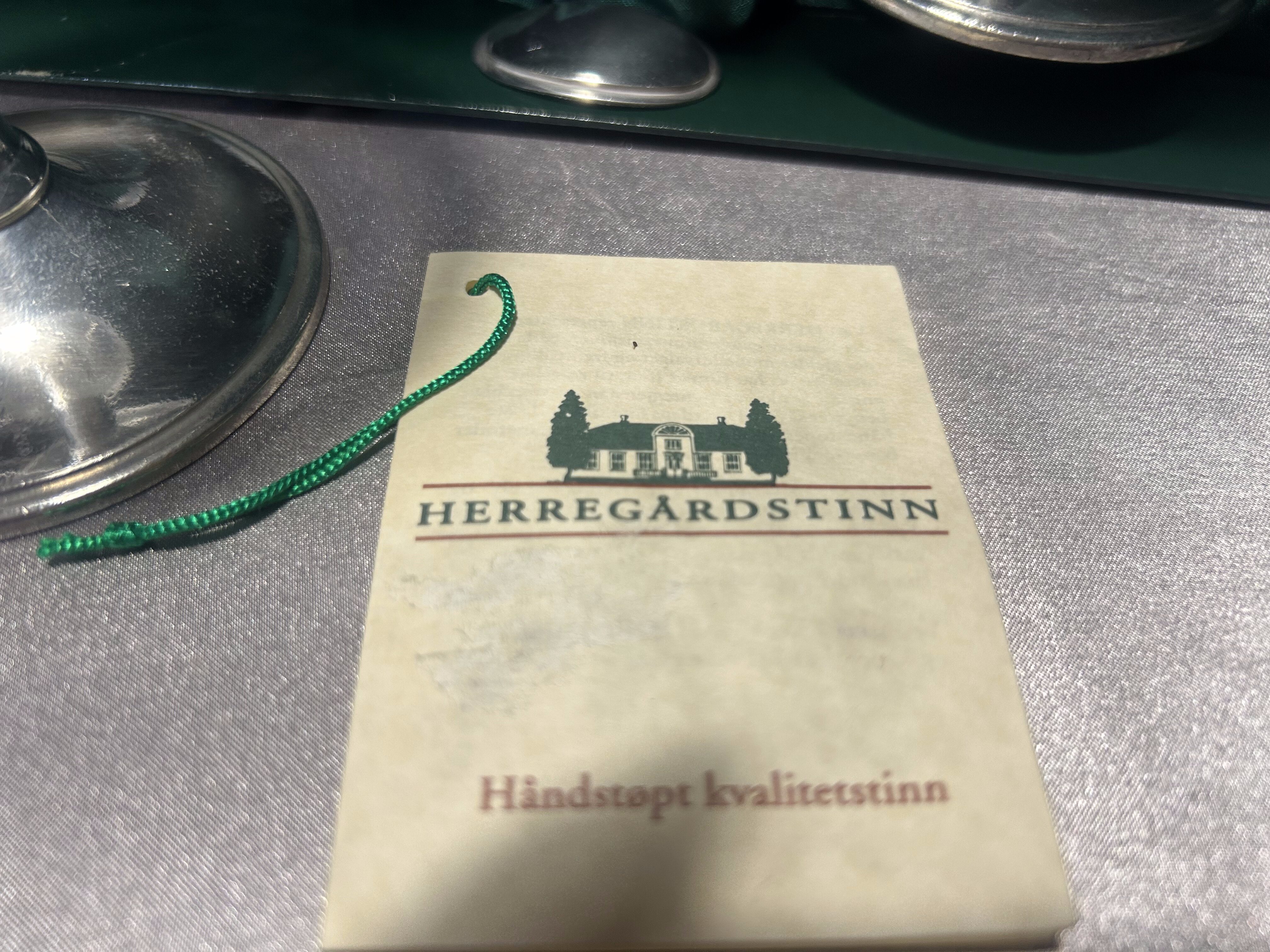 Marka Herregårdstinn specjalizuje się w ręcznie odlewanych wyrobach („Håndstøpt kvalitetstinn”) inspirowanych norweską tradycją dworską i rzemieślniczą. Jej produkty są cenione za trwałość, jakość oraz ponadczasowy styl – często sprzedawane w ekskluzywnych opakowaniach prezentowych, tak jak w tym przypadku. Komplet jest idealny jako prezent, element kolekcji lub dekoracyjny akcent w domu.