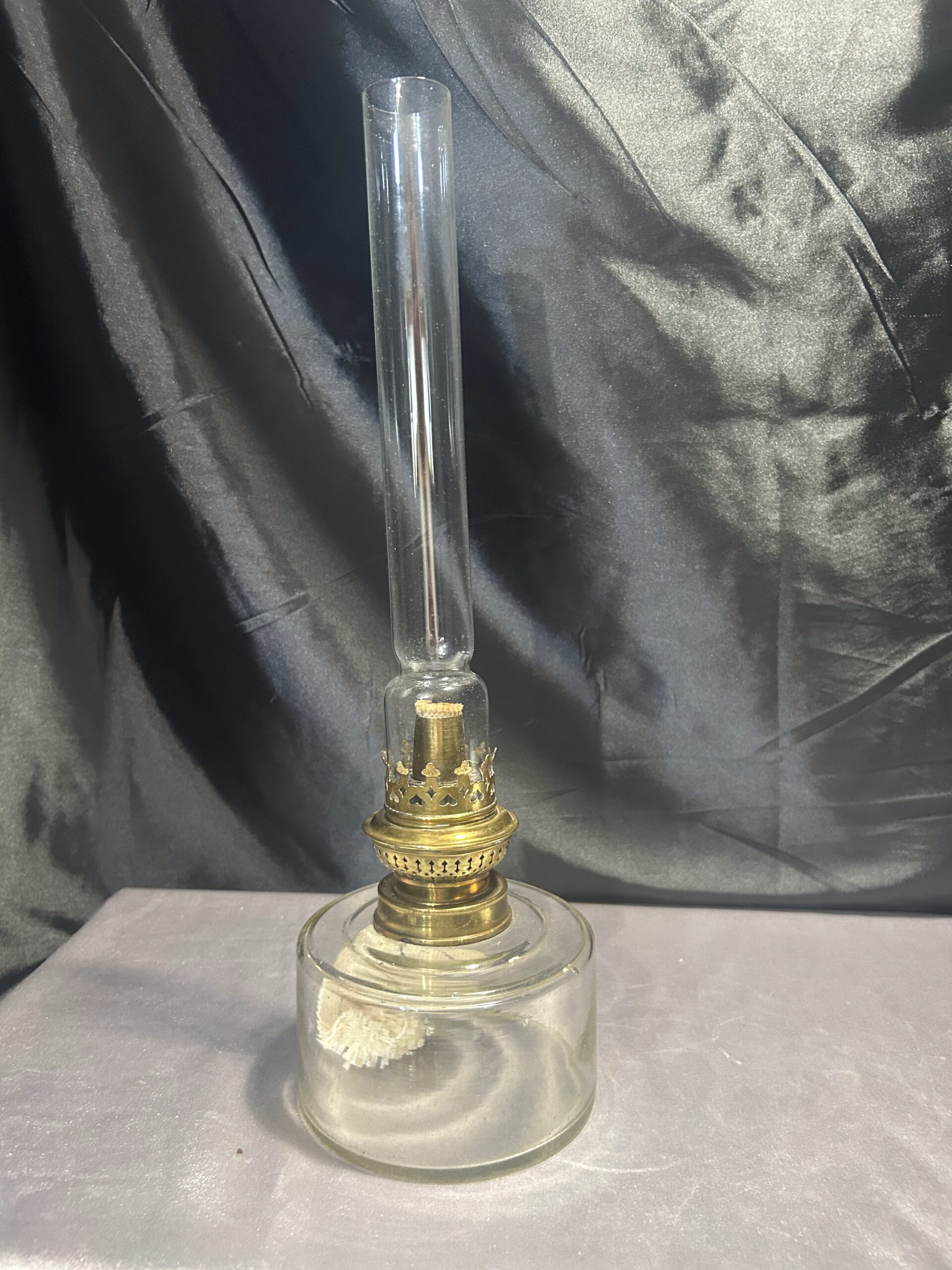 Piękna klasyczna lampa naftowa wykonana z przezroczystego szkła. Posiada duży zbiornik na naftę, co zapewnia długi czas palenia. Jest w pełni sprawna i wyposażona w nowy knot, dzięki czemu jest gotowa do użytku. Doskonała do wnętrz w stylu retro, klasycznym lub rustykalnym.