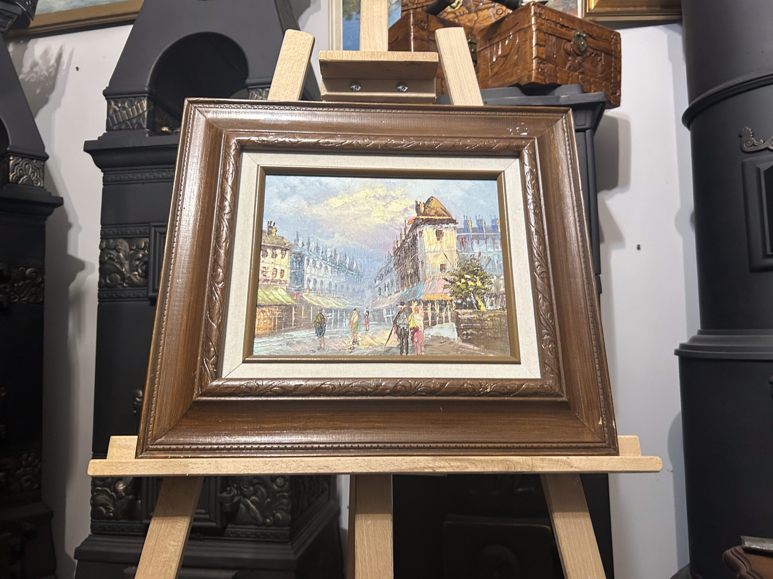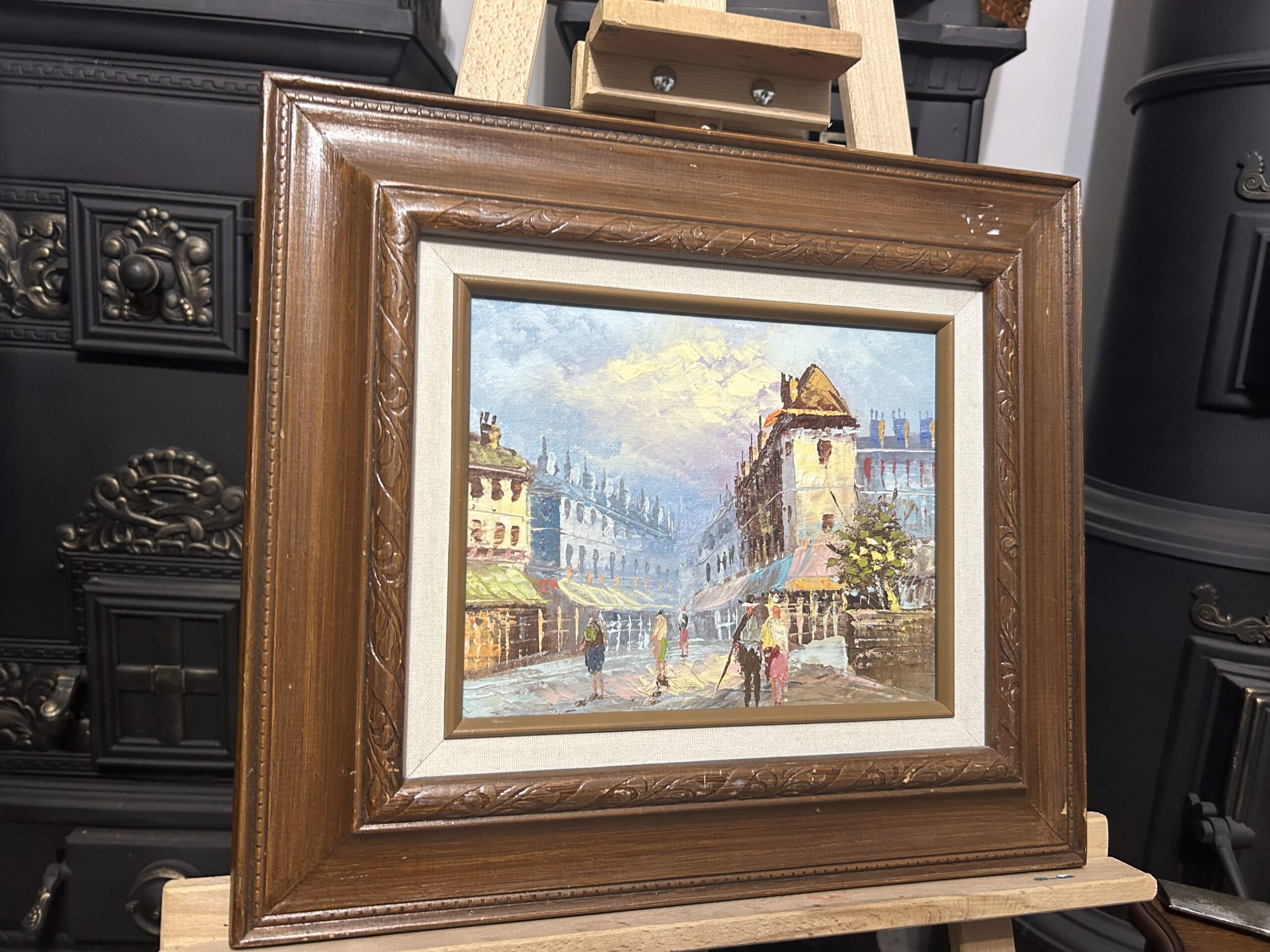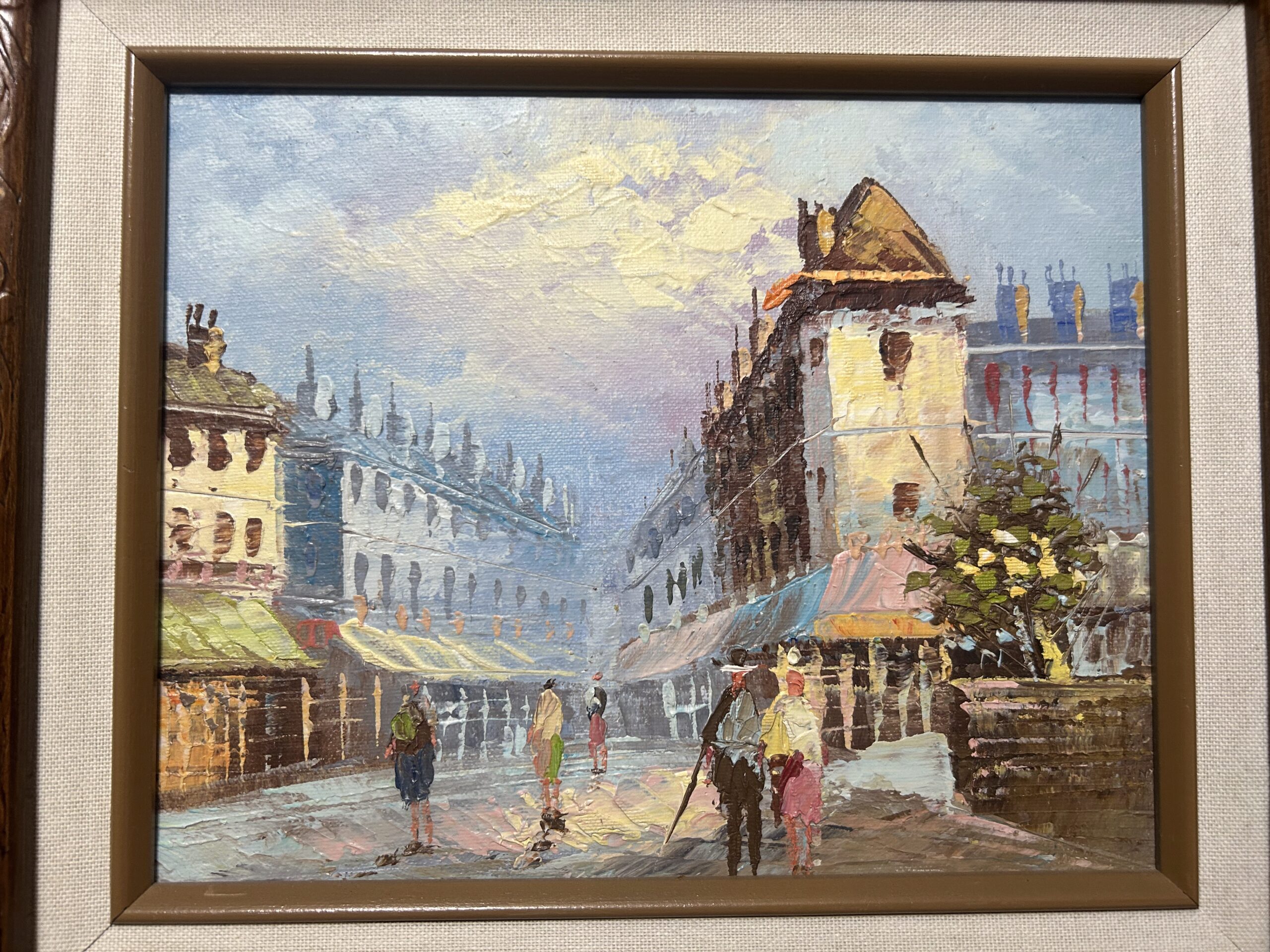 Przepiękny, nastrojowy obraz przedstawiający urokliwe uliczki starego miasta. Dzieło wykonane techniką oleju na desce, co podkreśla głębię i strukturę kolorów. Subtelne pastelowe odcienie nieba kontrastują z architekturą o bogatych detalach i klimatycznym zarysie budynków. W centralnej części obrazu znajdują się postacie przechodniów, dodające scenie życia i autentyczności.