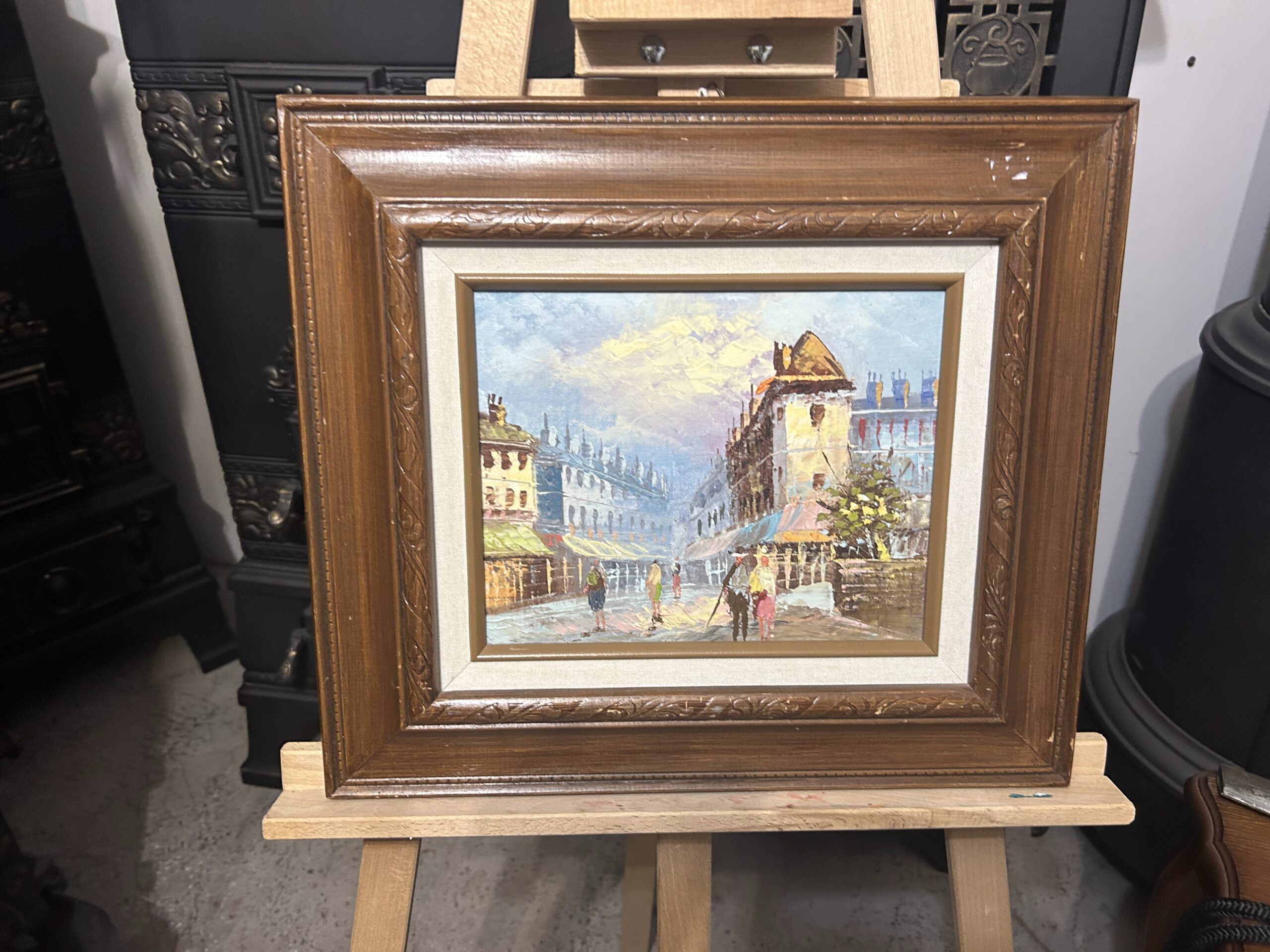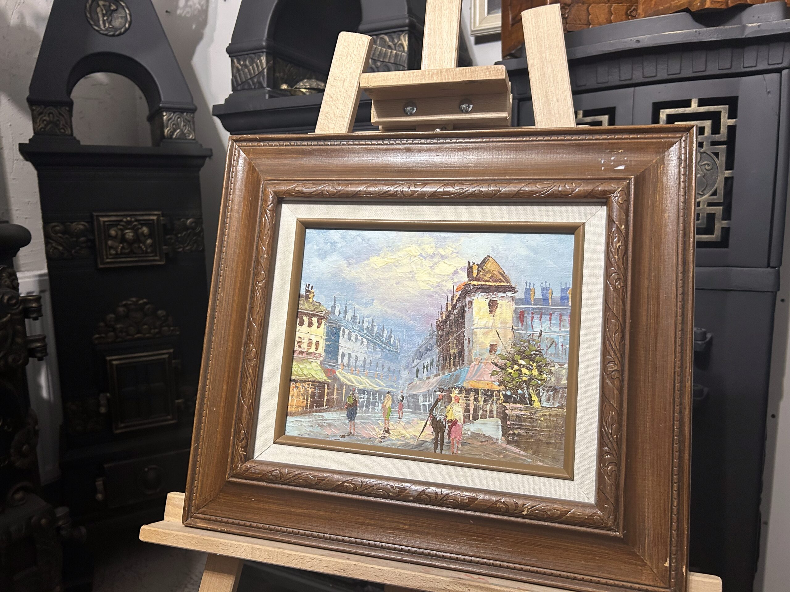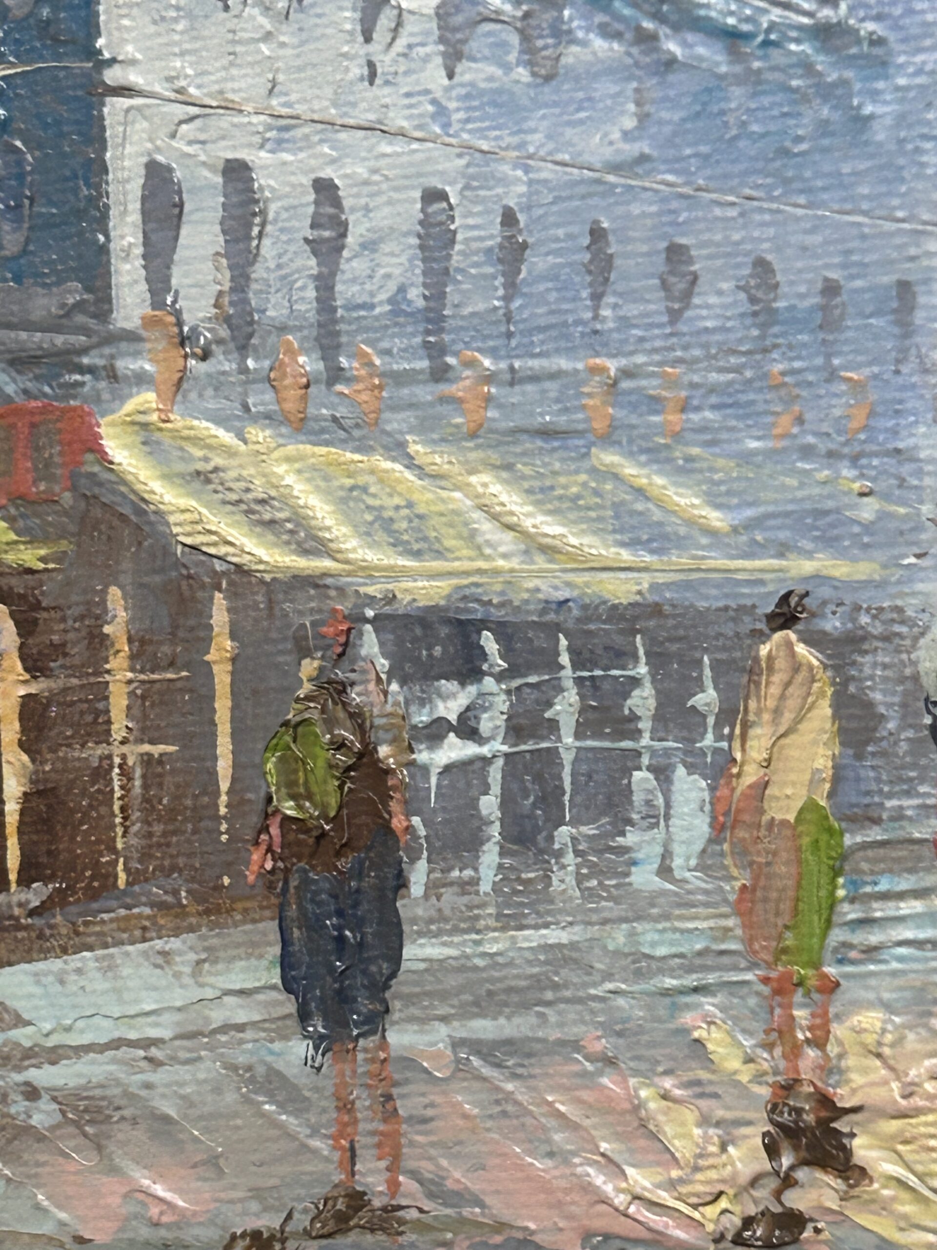 Przepiękny, nastrojowy obraz przedstawiający urokliwe uliczki starego miasta. Dzieło wykonane techniką oleju na desce, co podkreśla głębię i strukturę kolorów. Subtelne pastelowe odcienie nieba kontrastują z architekturą o bogatych detalach i klimatycznym zarysie budynków. W centralnej części obrazu znajdują się postacie przechodniów, dodające scenie życia i autentyczności.